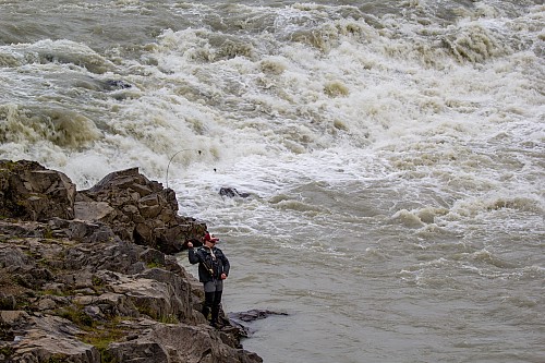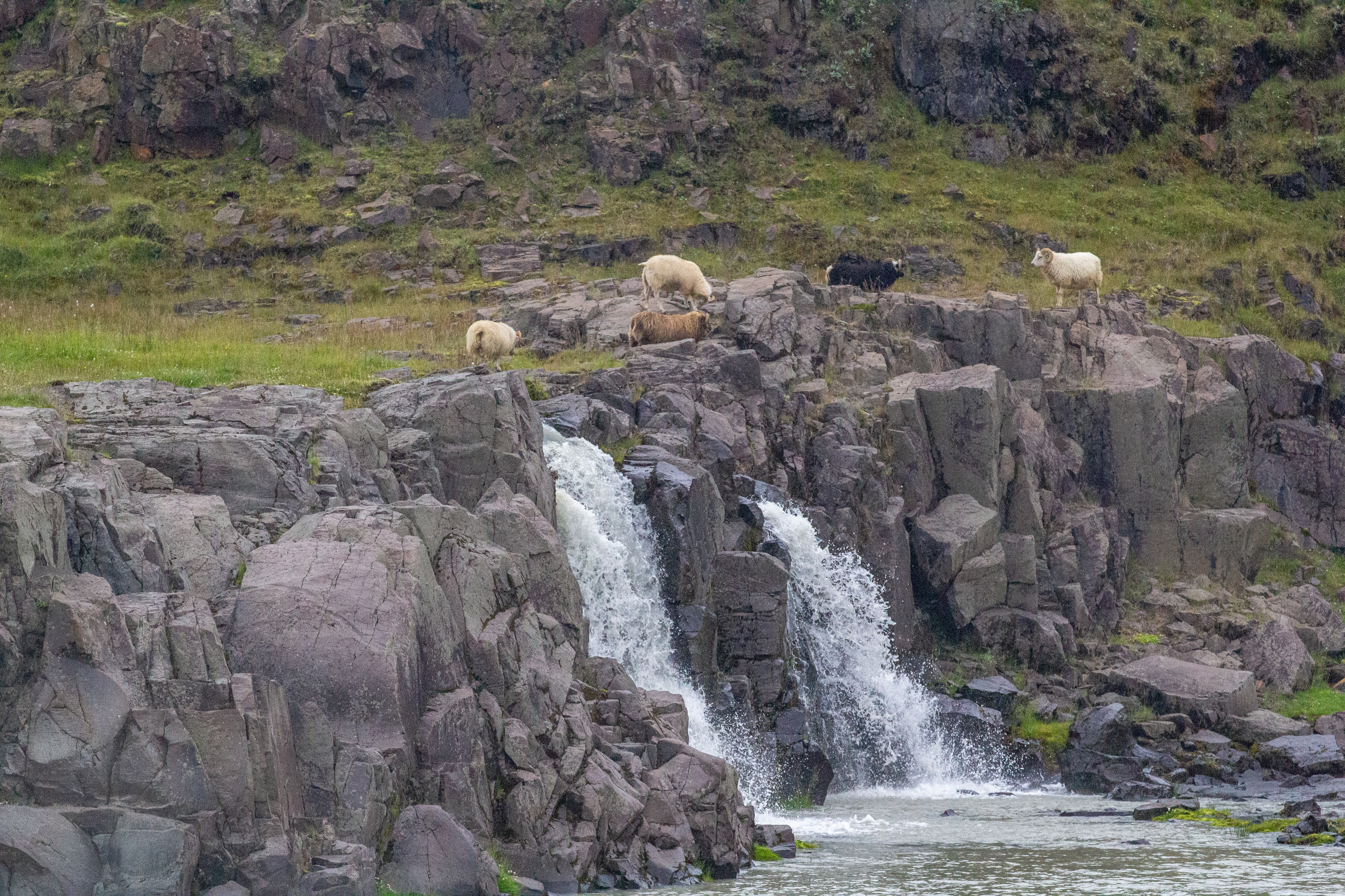 Our first stop was at a waterfall just a few minutes from the hotel, Urriðafoss. On the banks of the river there were some local men fishing, and during our short time there, Crystal saw one guy catch something. There was a falls in the middle of the river that looked like a horseshoe, and we couldn’t really get a good glimpse because of all the mist, but it didn’t look like the part of the river you’d want to be in if you were in a canoe. There were some sheep on the far bank, just above one of the smaller falls.