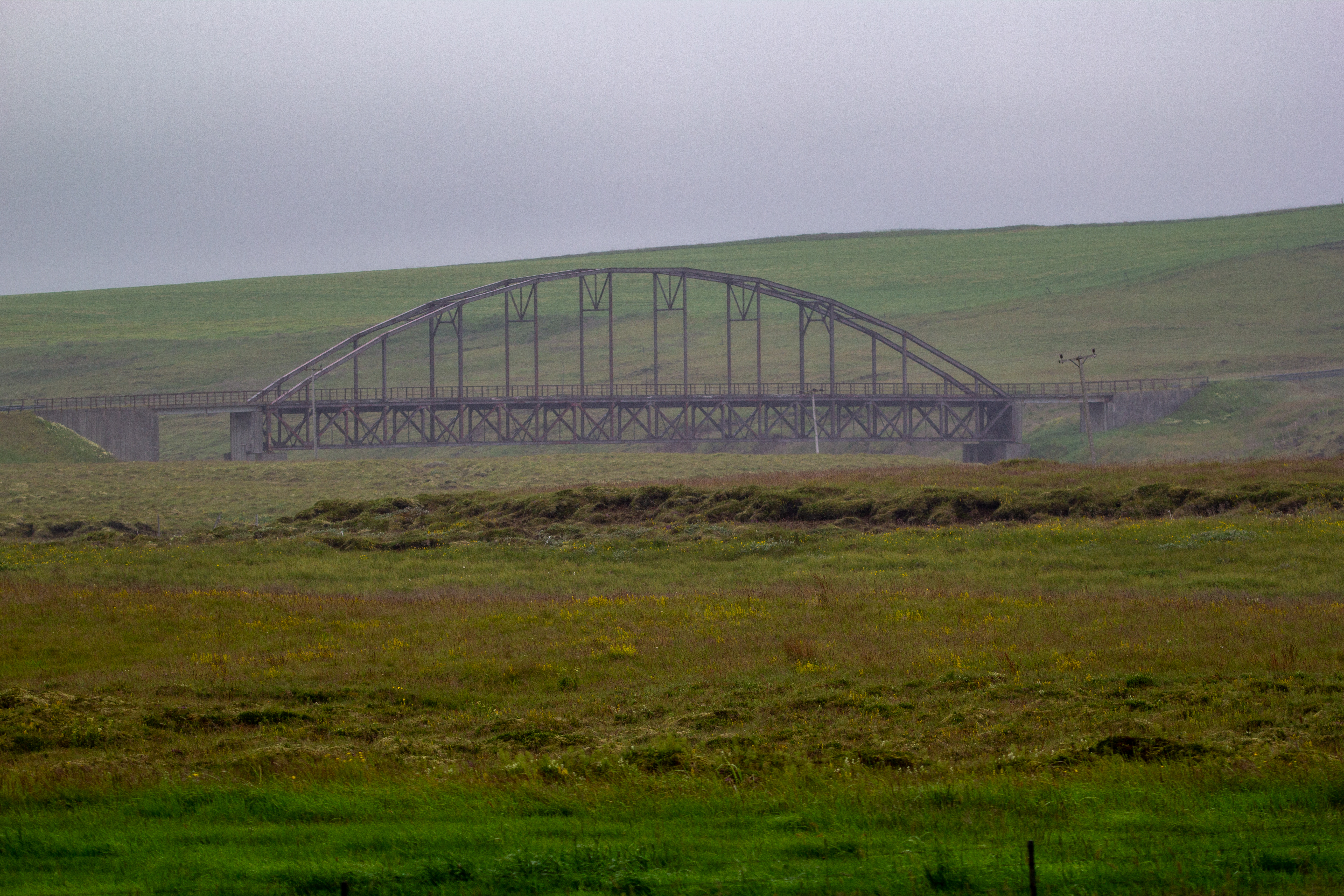 Nearby, we spotted the Walter Mitty Bridge just north of the Ring Road, crossing the same river, so just before we got back on the Ring Road (to backtrack a bit) we took a couple photos with the zoom lens. The Secret Life of Walter Mitty is one of Justin's favorite movies, for reasons described here, and a good chunk of it was filmed in Iceland, so wherever it wasn't too out of the way, we had plans to see some of the filming locations. Like yesterday morning, it was foggy and misting a bit, but nothing too bad, especially for Iceland standards. On the road inland (Road 30 and then Road 32), there were lots of horses, and lots of fluorescent green grass (or something) that was being used to make hay. Crystal asked aloud what all the horses were used for. Presumably it was neither food nor milk, so what then?