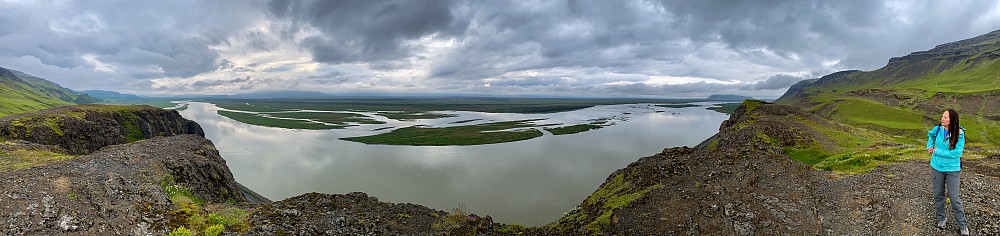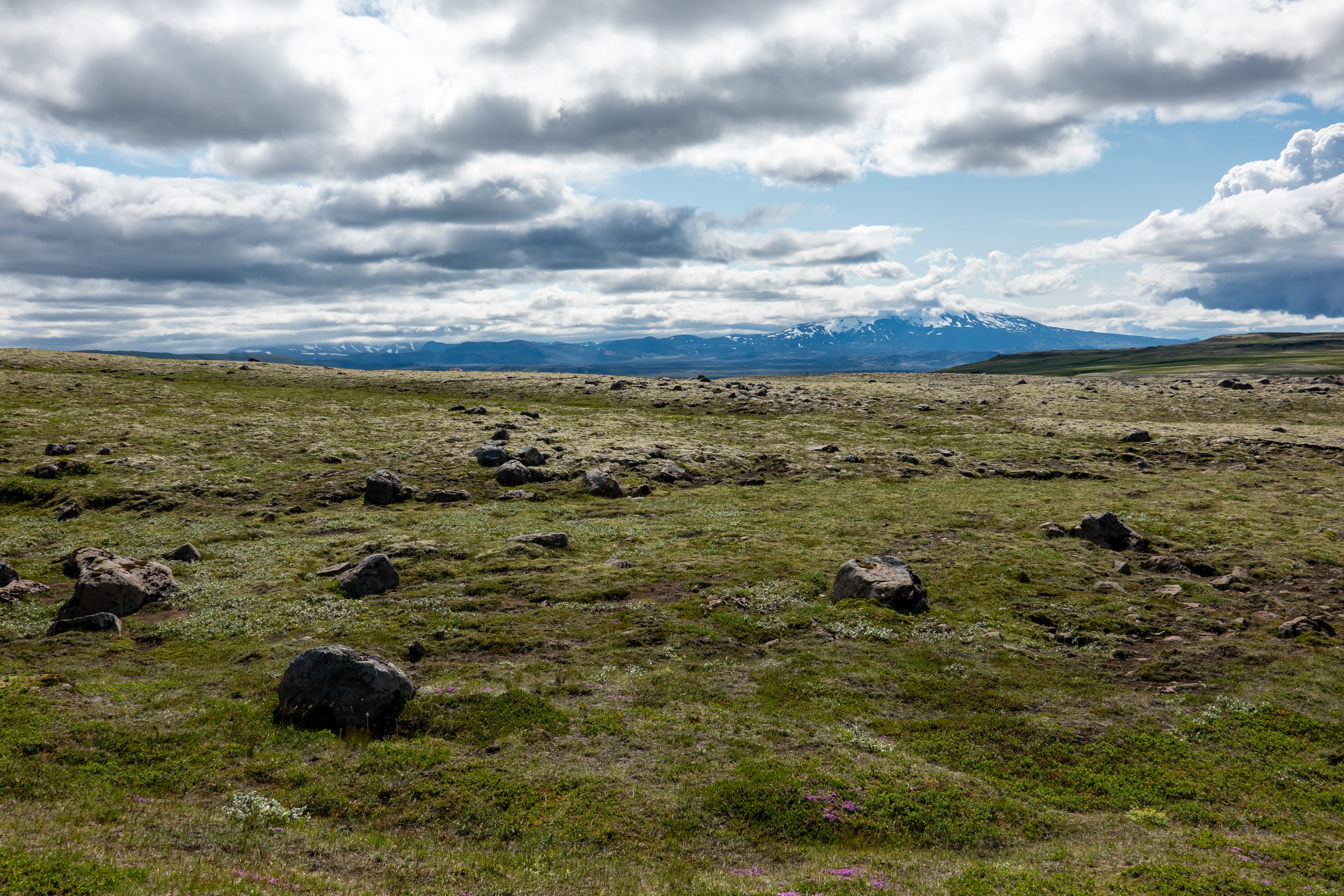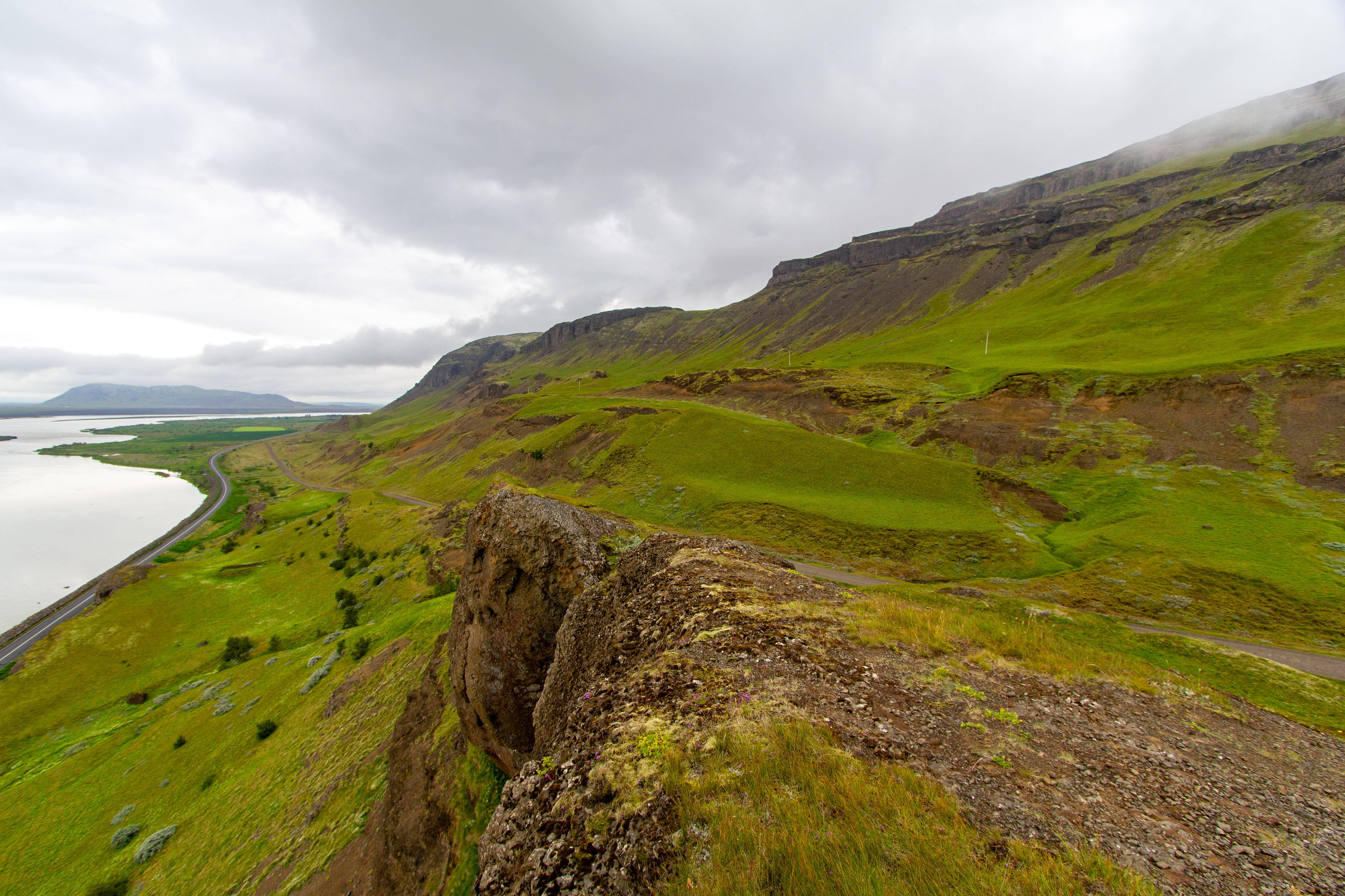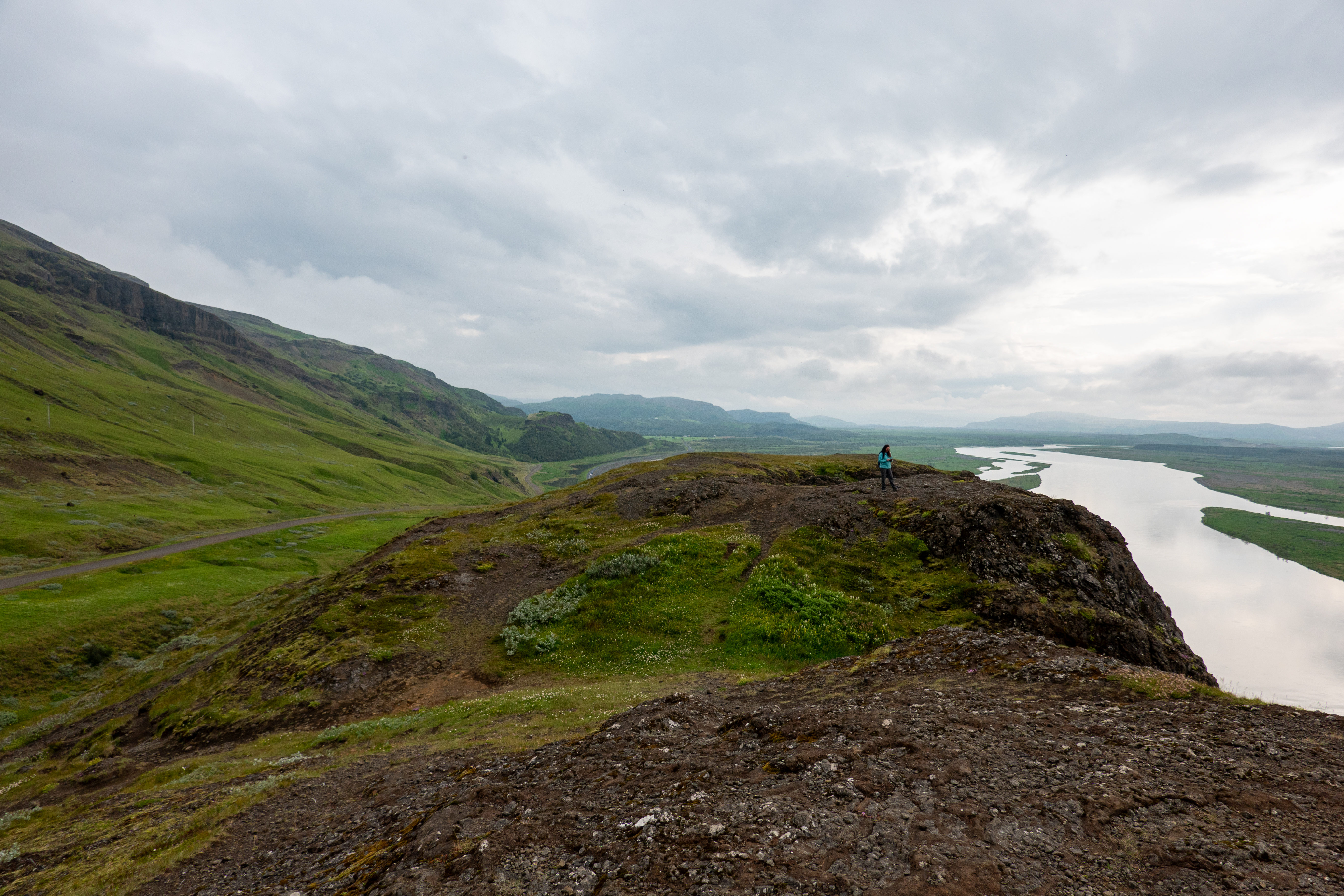 After about 35 minutes we stopped at Gaukshöfði, which we’d read about at the hotel the night before. It was basically right off the road, so not adding on much time. Well, technically it was right off the road, but up a steep incline, and after maybe 5 minutes we parked next to a camper van that had probably been there overnight. It had Austrian plates, which is a bit like seeing a Nebraska plate on a car on the Big Island. We took a 2-3 minute walk from the parking area to a cliff above the main road we’d been driving, with panoramic views out over the south. It was definitely worth the minor detour.