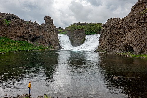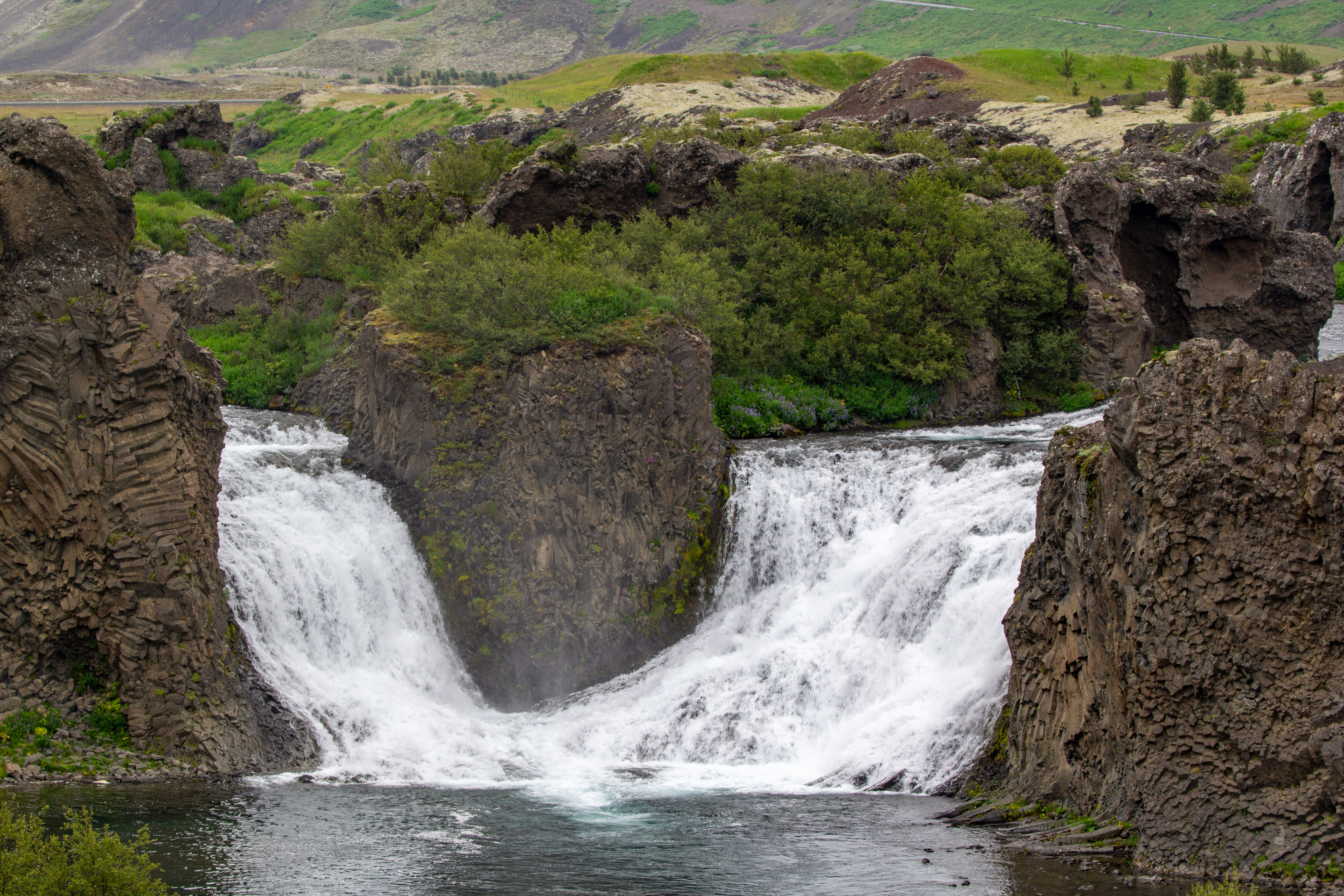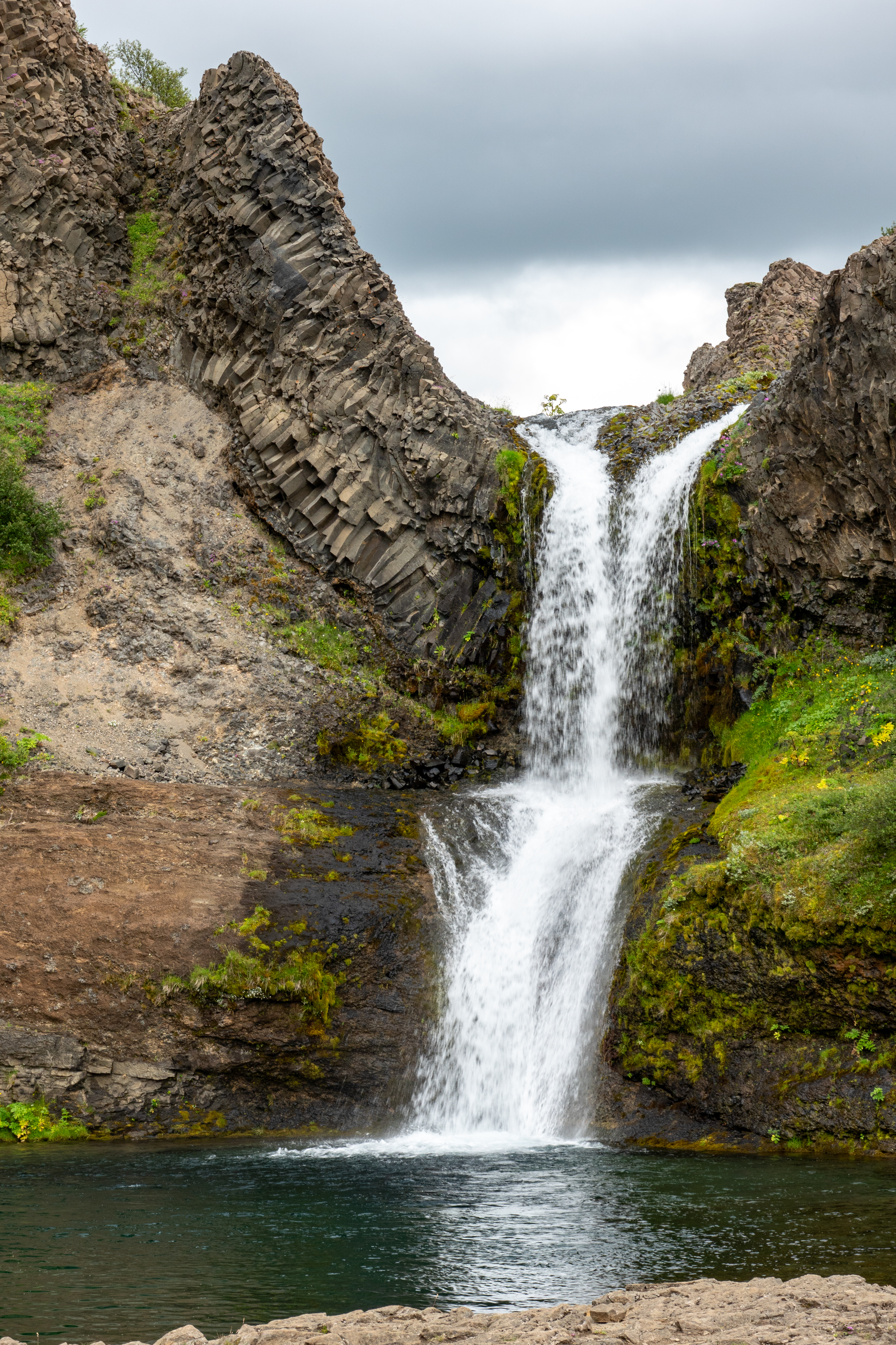 Next up was Hjalparfoss, also just off Road 32. The waterfall wasn’t that big, but it had an interesting shape, vaguely reminiscent of the Wu-Tang W. Speaking of Wu-Tang, Crystal was having a hell of a time with the Connections for today, as there were 8 words left including Wu-Tang, Pac, Glue, Cape Cod, Drums and Bass, and Mario World. The falls were fine, but what was more interesting were the basalt column rock formations on either side of the falls. We knew we’d see this in several places around the island, and apparently this was the first.