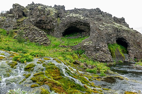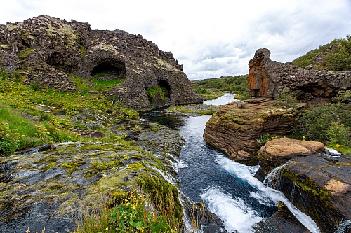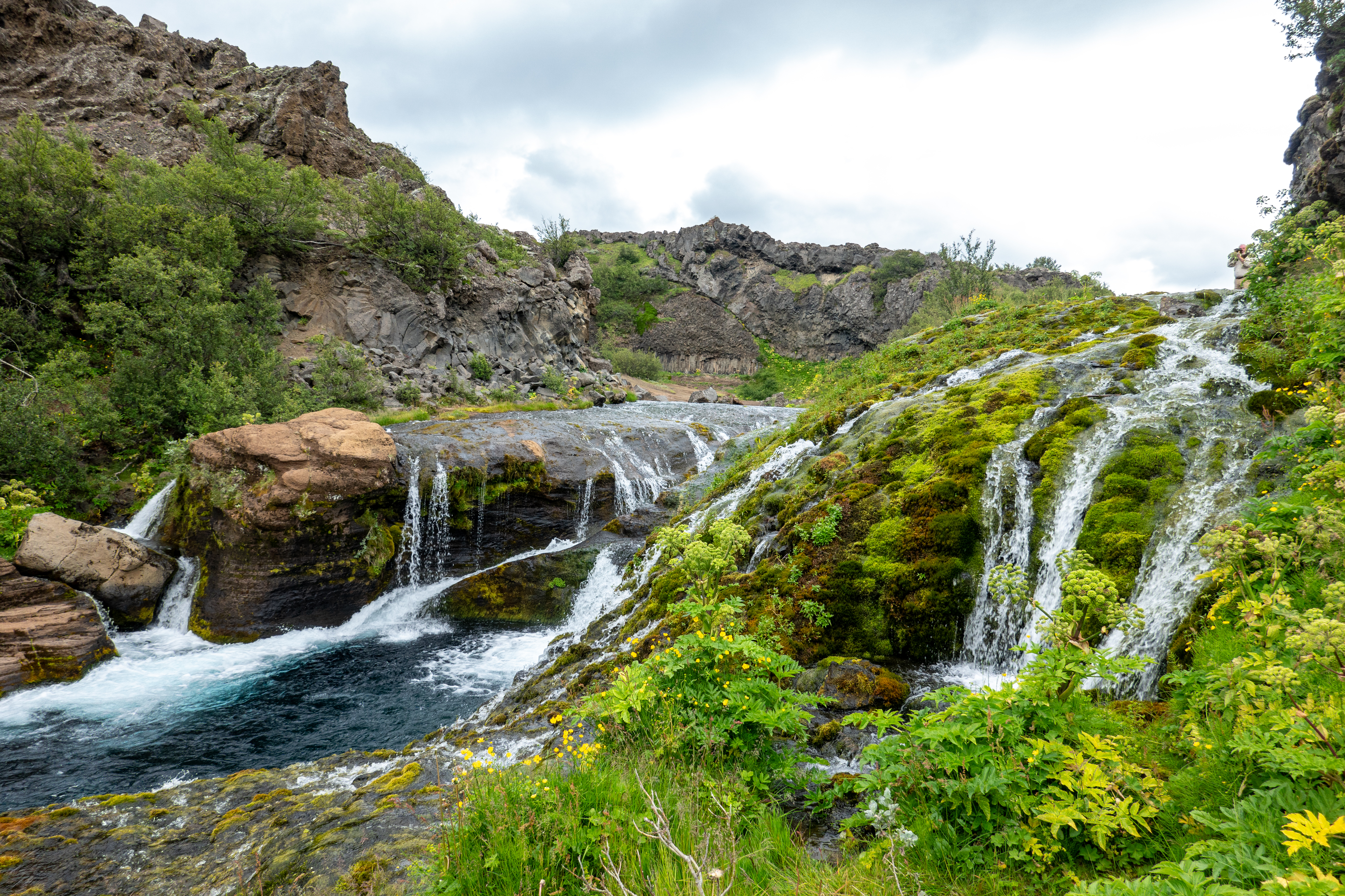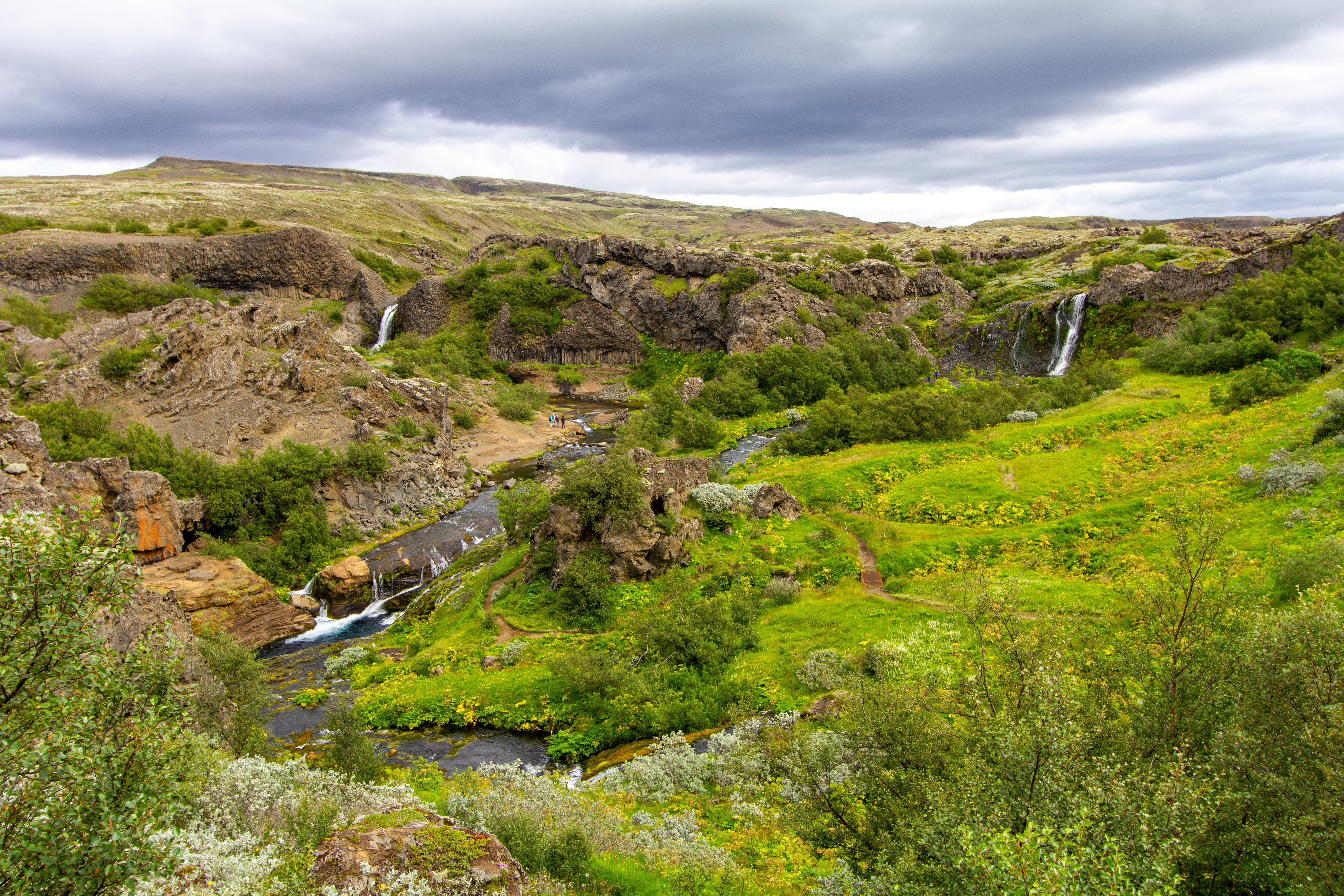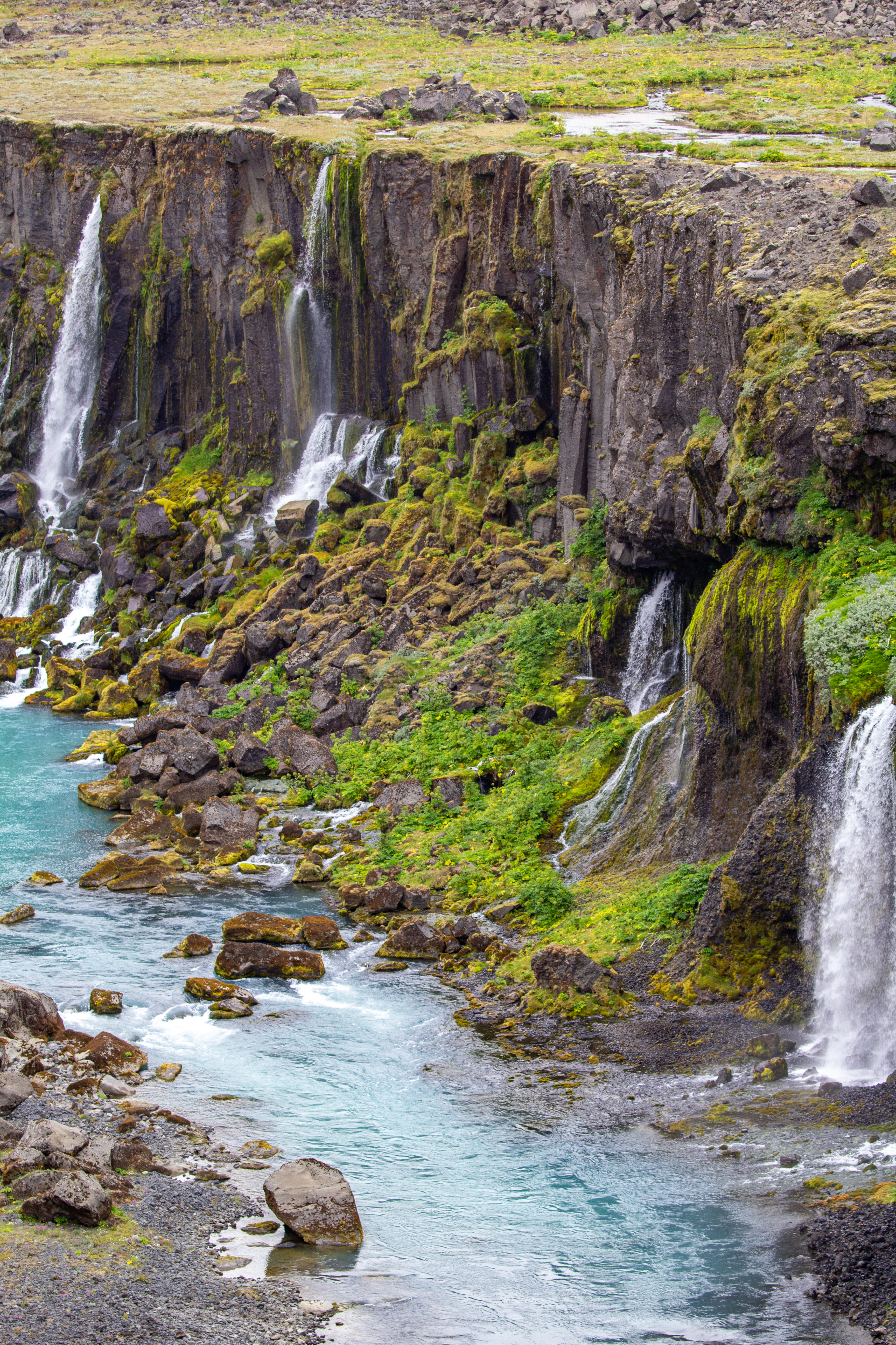 Despite all his research, Justin had never seen or heard of it prior to seeing something in the book at Lambastadir the night before. So apparently staying there was worth it just for suggesting this place to us for today. We meandered around, up and down, to several of the falls and to some rock formations that looked like a face. Crystal went back to the car before Justin went to the furthest falls, which was across a narrow stream that she had no interest in traversing. The views from the very top, a bit away from the car park, were also amazing. So Gjáin ended up being a really nice unexpected surprise.
