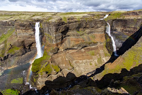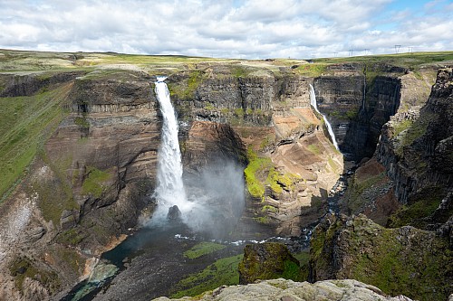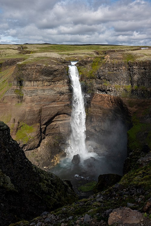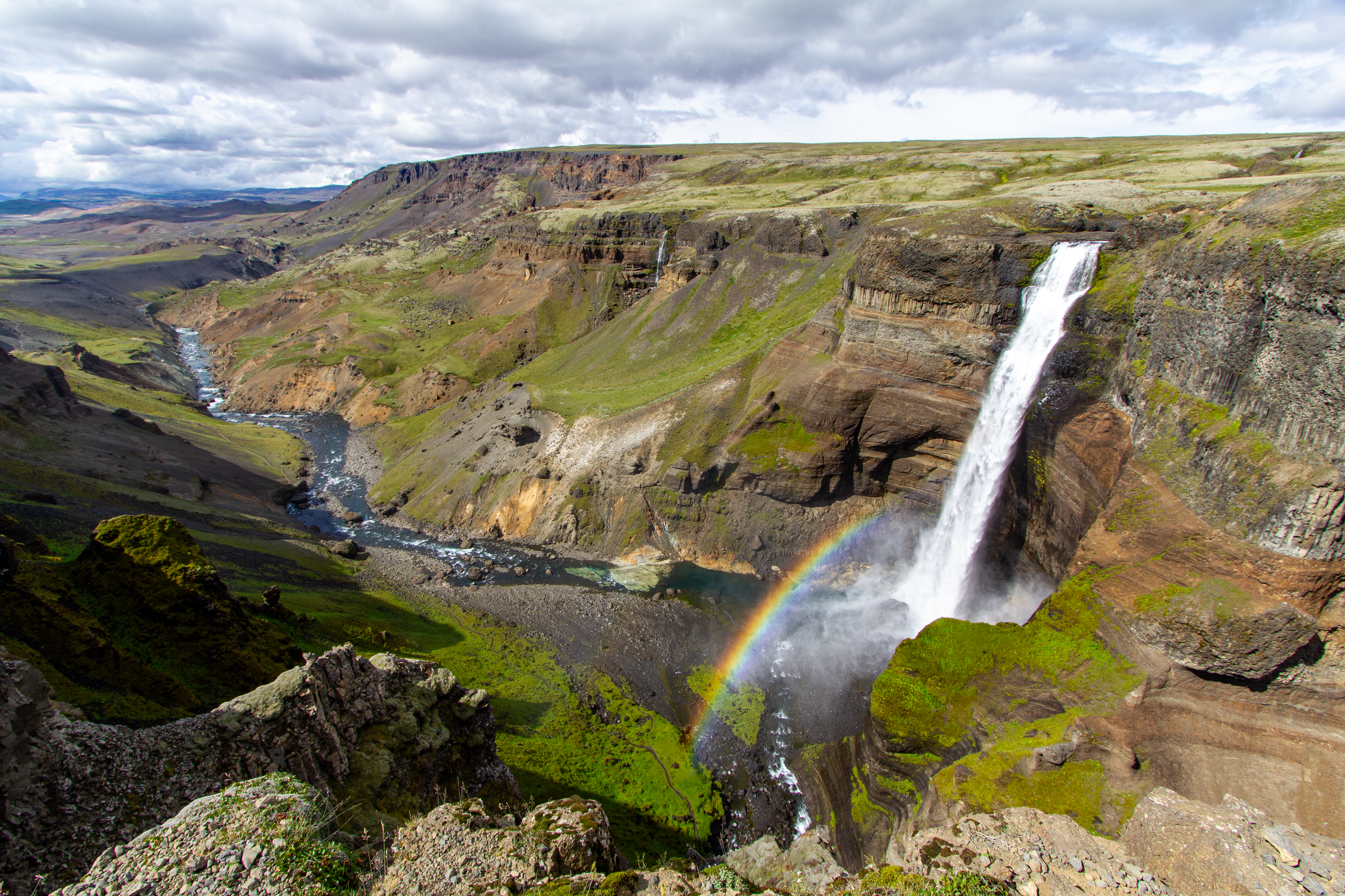 We got back on Road 32 headed east, but only briefly before we were off it again, onto more gravel roads, to head north to Háifoss. This was theoretically one of the tallest waterfalls in Iceland, the third highest. The Alltrails reviews of the trail there didn’t give us warm fuzzies, with descriptions of rockfalls and “disintegration.” So we figured we’d just walk until we could see the falls, then call it a day and head back. As it turns out, we had to walk just a few minutes. There were actually two falls, one a little bit more tucked in, another more prominent. It was sunny, the sun was behind us, and accordingly there were rainbows. The cliffs were impressive in their own right. A couple of people were flying drones, as apparently this one of the few areas in Iceland where this was still allowed. We enjoyed the view, but the drive to and from the falls was longer than our time there.
