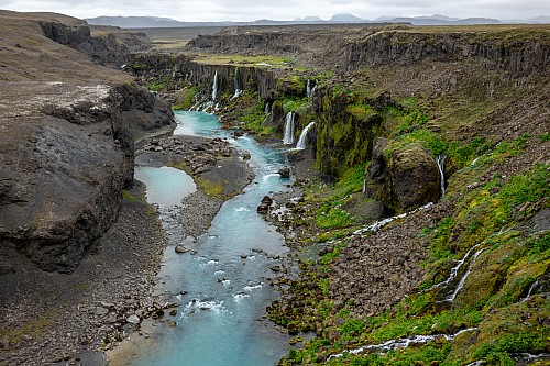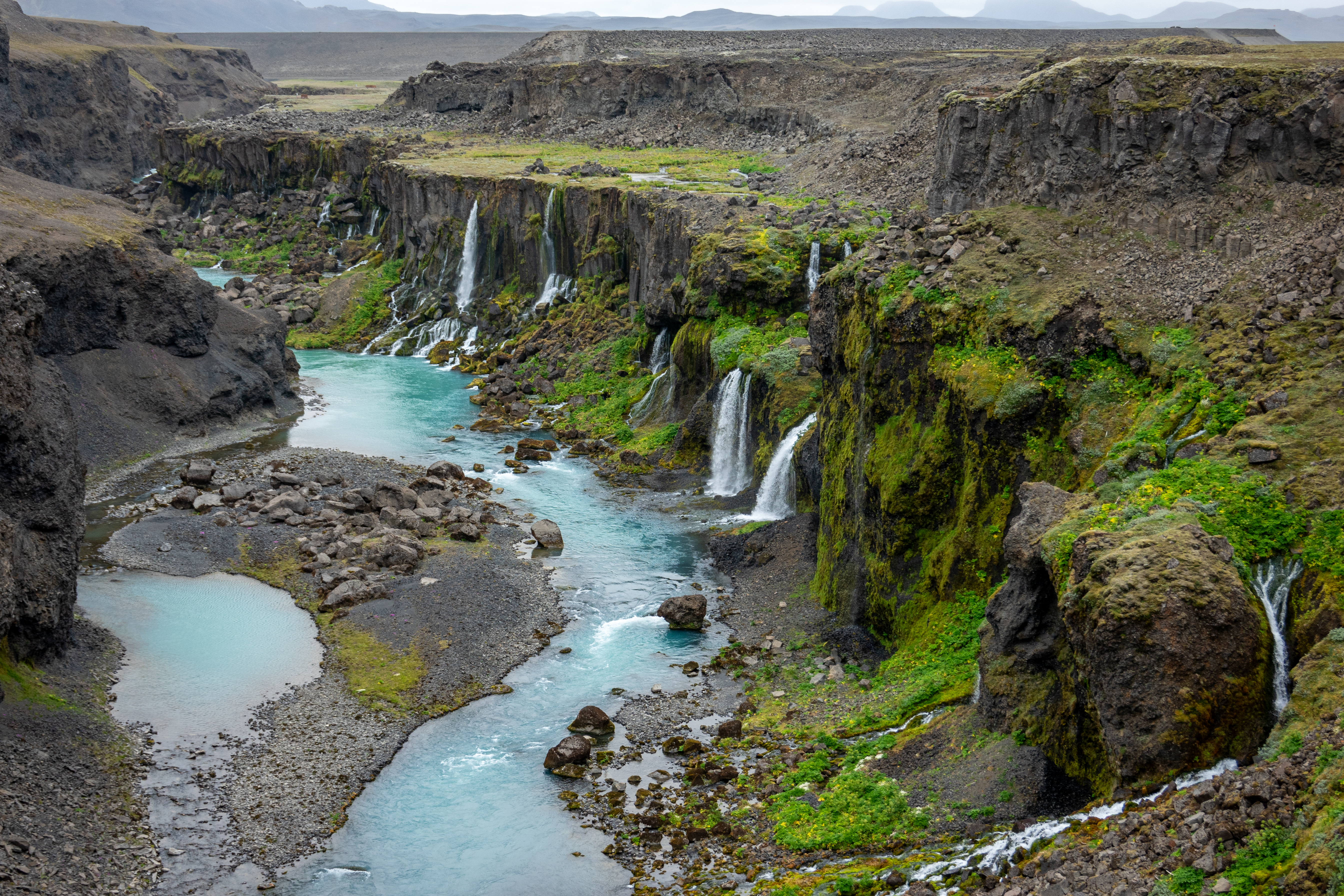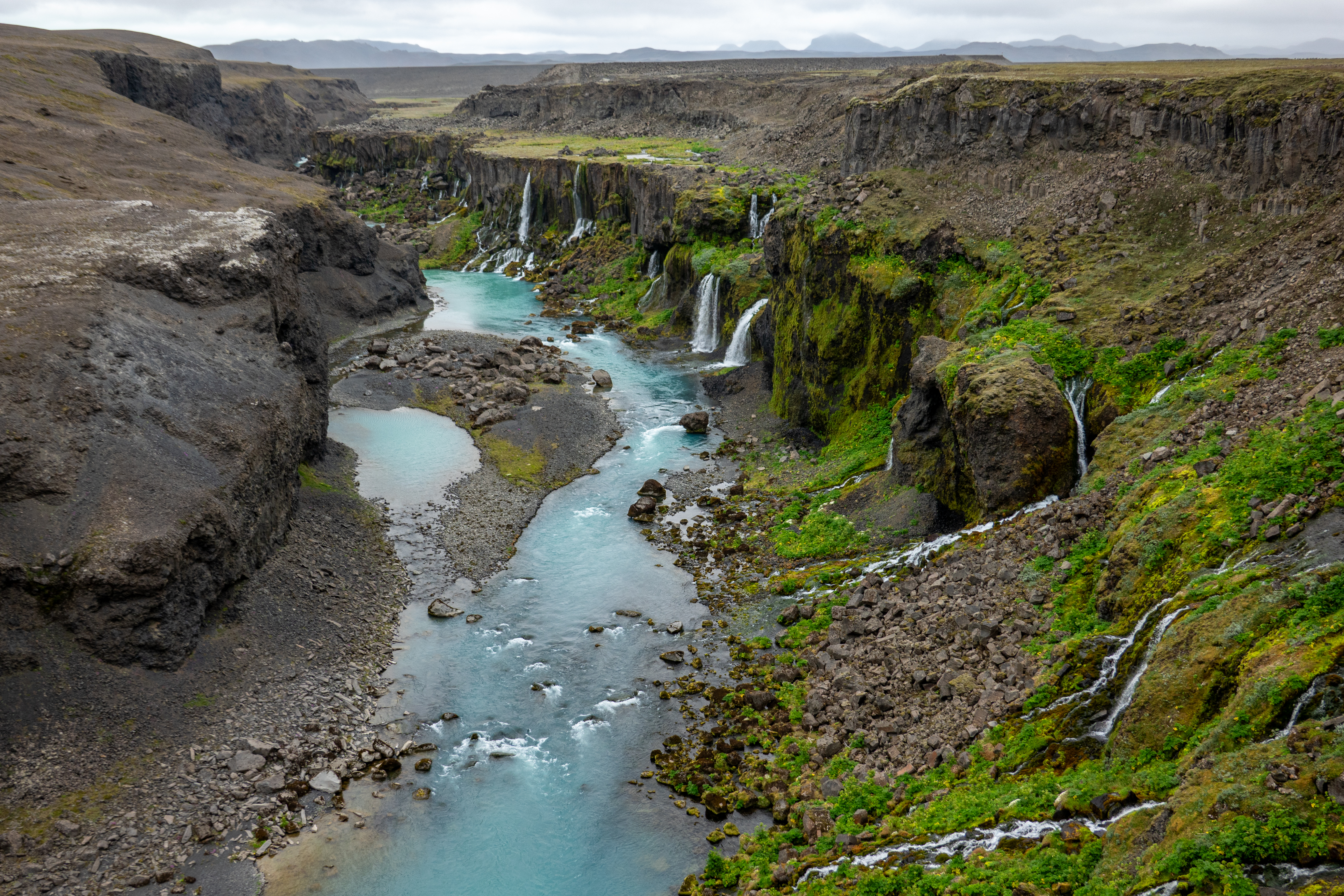 We went over a bridge where we could see turquoise water mixing with brown water, which was not something we saw every day. Right around there we turned off towards Sigöldugljúfur, which according to our notes had a canyon, waterfalls, and greenery. The spot where Gina (the Google Maps Navigation lady) told us to park was in an odd spot, at least seemingly, with no obvious parking lot nearby. We looked at Alltrails, and we were right near the halfway portion of the hike already. So we just parked at a spot that seemed most like a parking lot, and just went for it. A minute or two after we parked, another car parked next to us, so either we were in the right spot or we just created a parking lot.