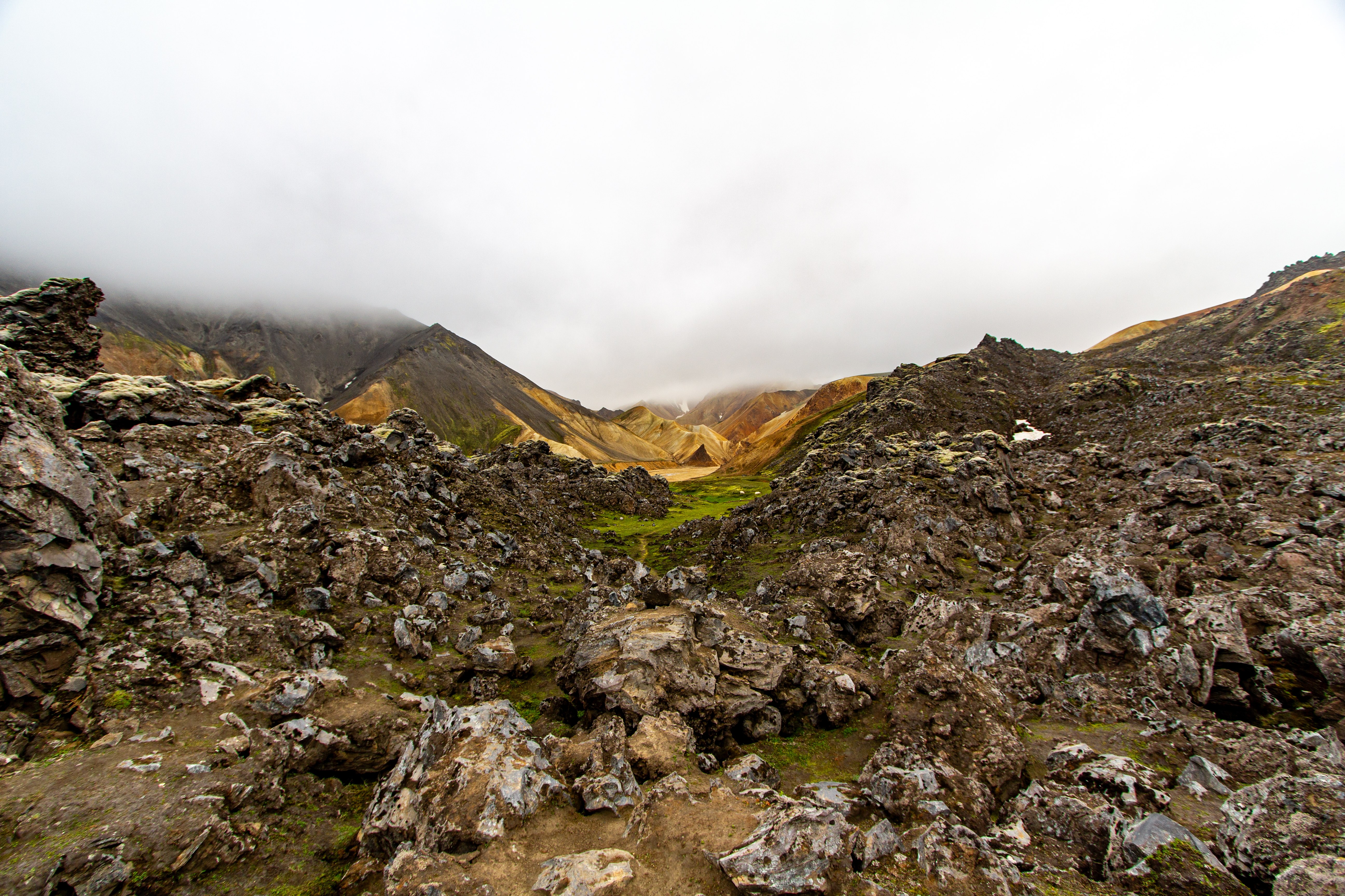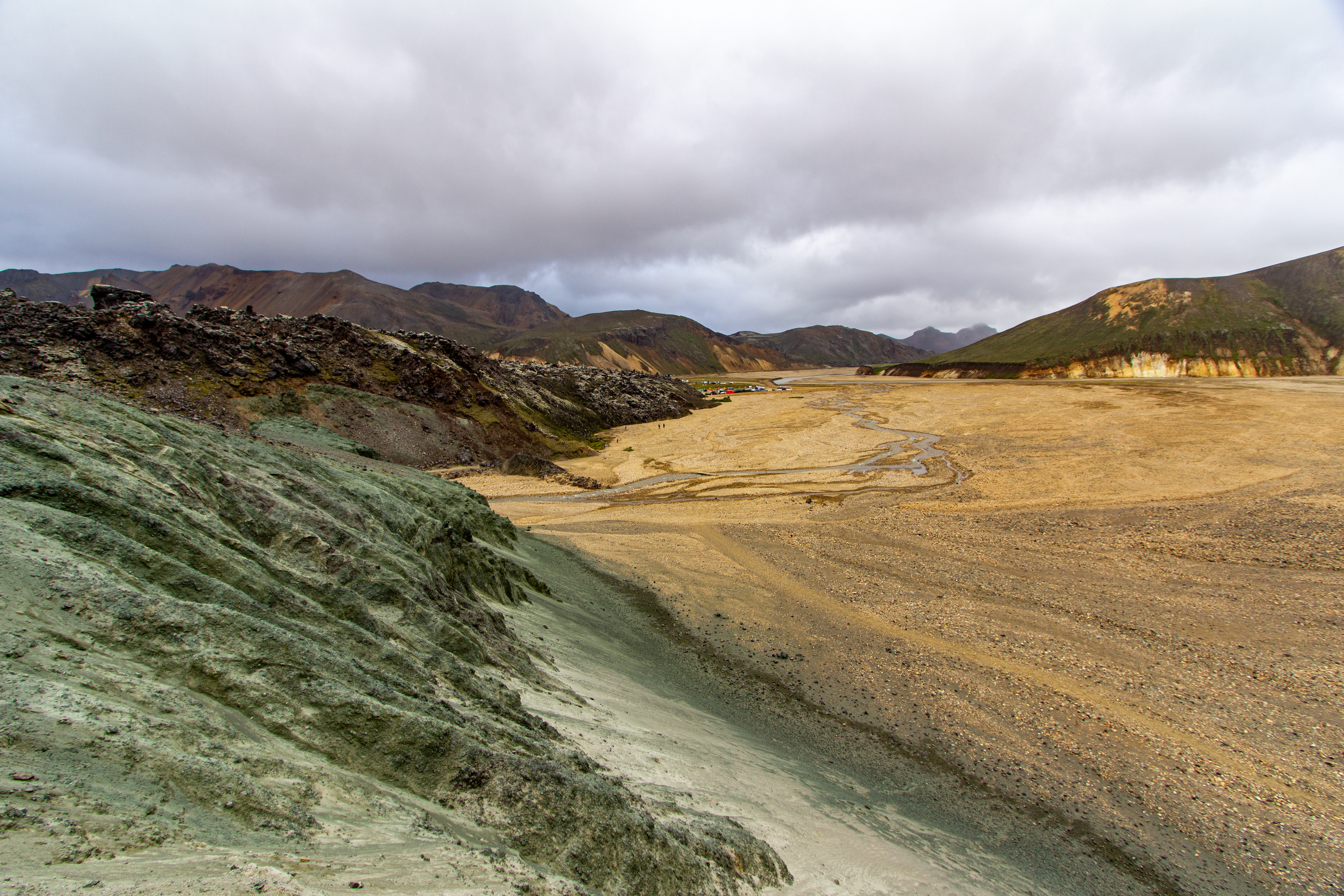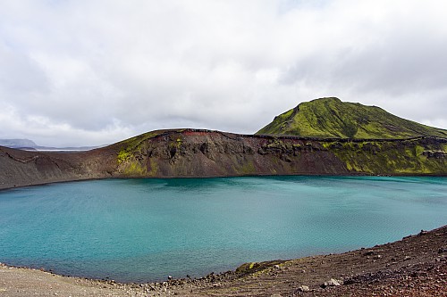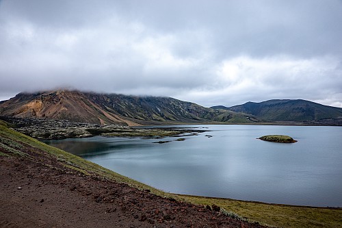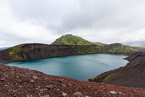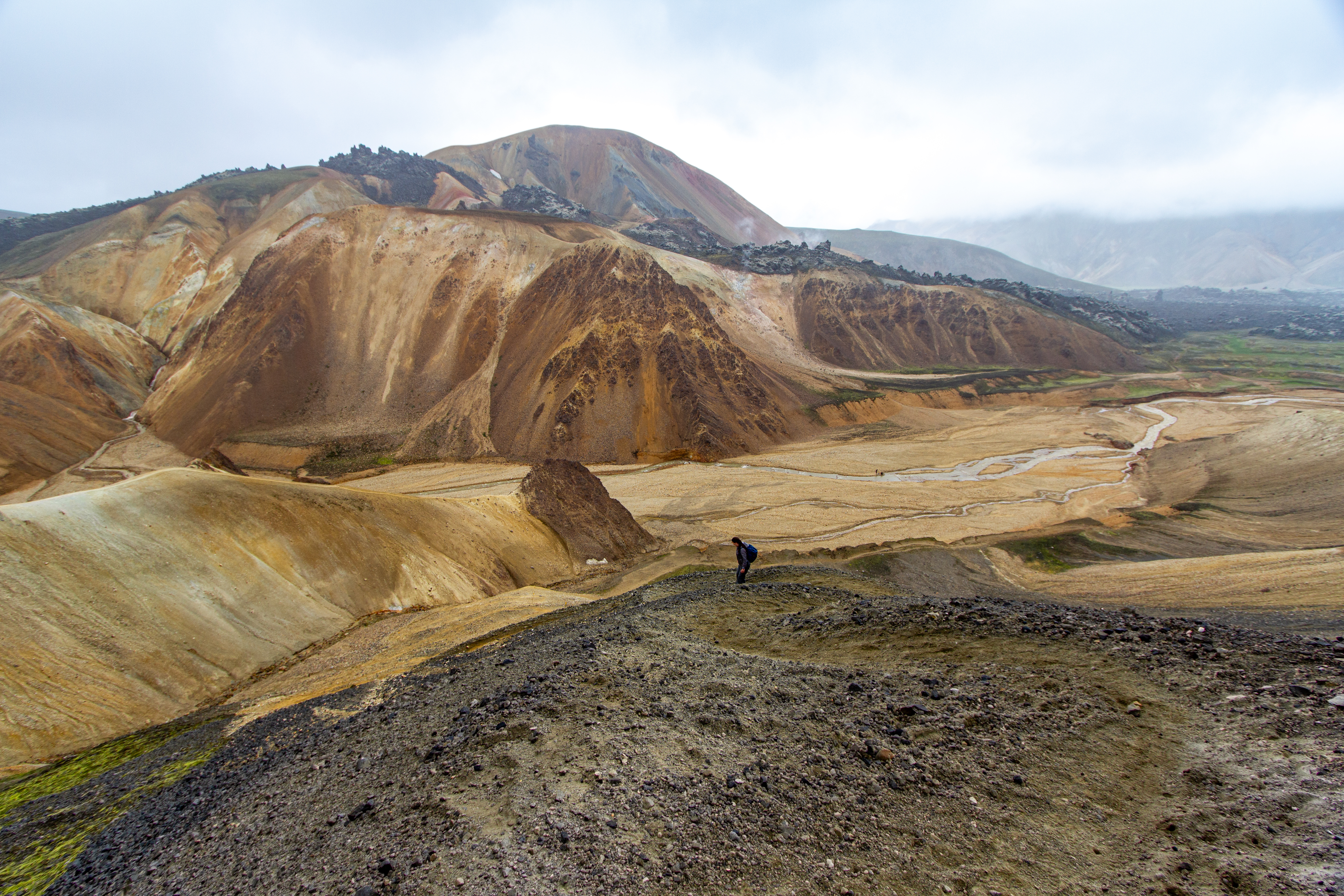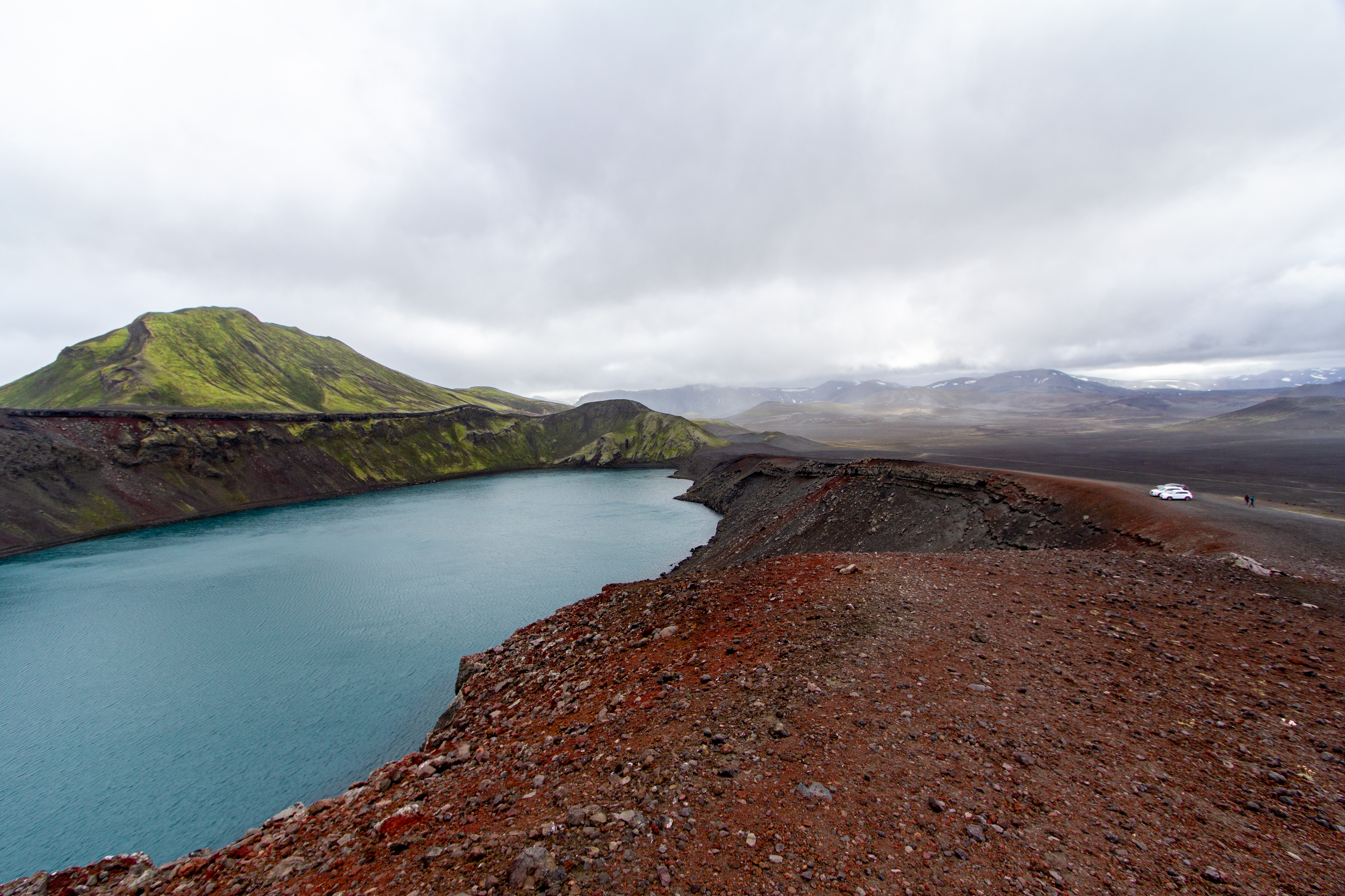 The road wasn’t too dusty, but it was washboarded and we were shaking quite a bit. We read up on how roads get like that (there was cell service everywhere), and it’s basically a steady state of ripples caused by tires bouncing up and down on unpaved roads. After what seemed a long time, we got to a turnoff for Bláhylur. We went up a steep embankment, and parked near the edge of a ridge. Below us was a turquoise lake, on the left was a neon green pyramidal mountain, and on the right was a reddish lava colored mountain - it was incredibly photogenic. Alas, the wind was howling, and there was water vapor in the air, and Justin was having all sorts of issues keeping water off his lenses. Then he couldn’t dry them, even in the car, and he was quite frustrated, as we had just started the trip. Eventually it stopped raining, and he found one cloth that got the moisture off the lenses. The view changed substantially once the sun came out, with the colors changing hues.