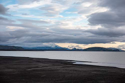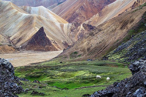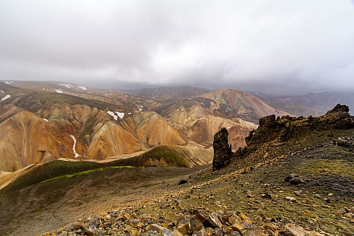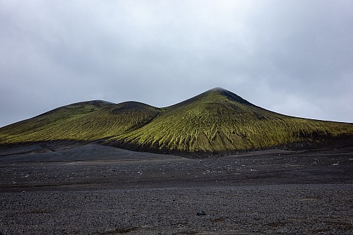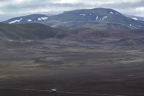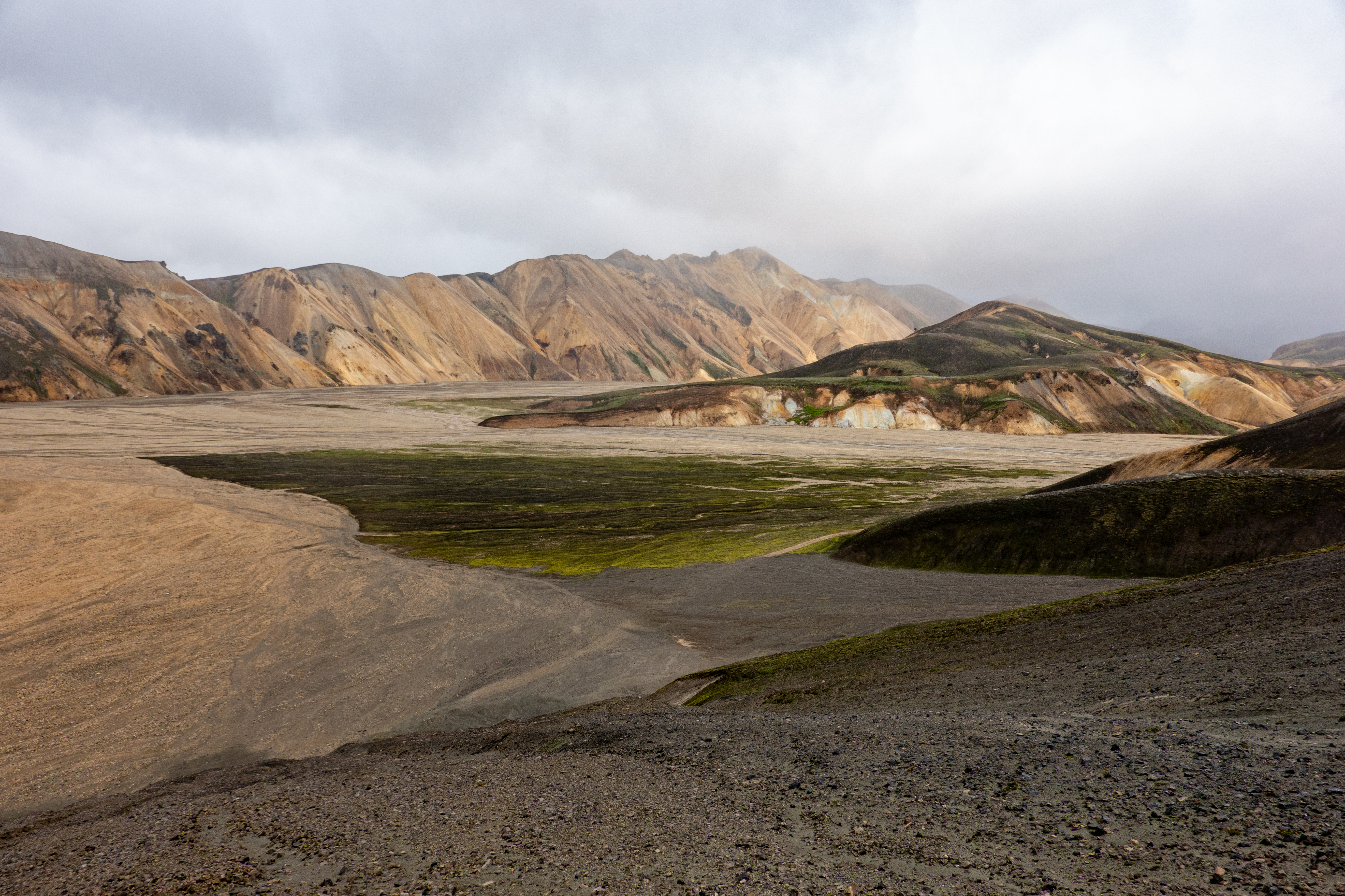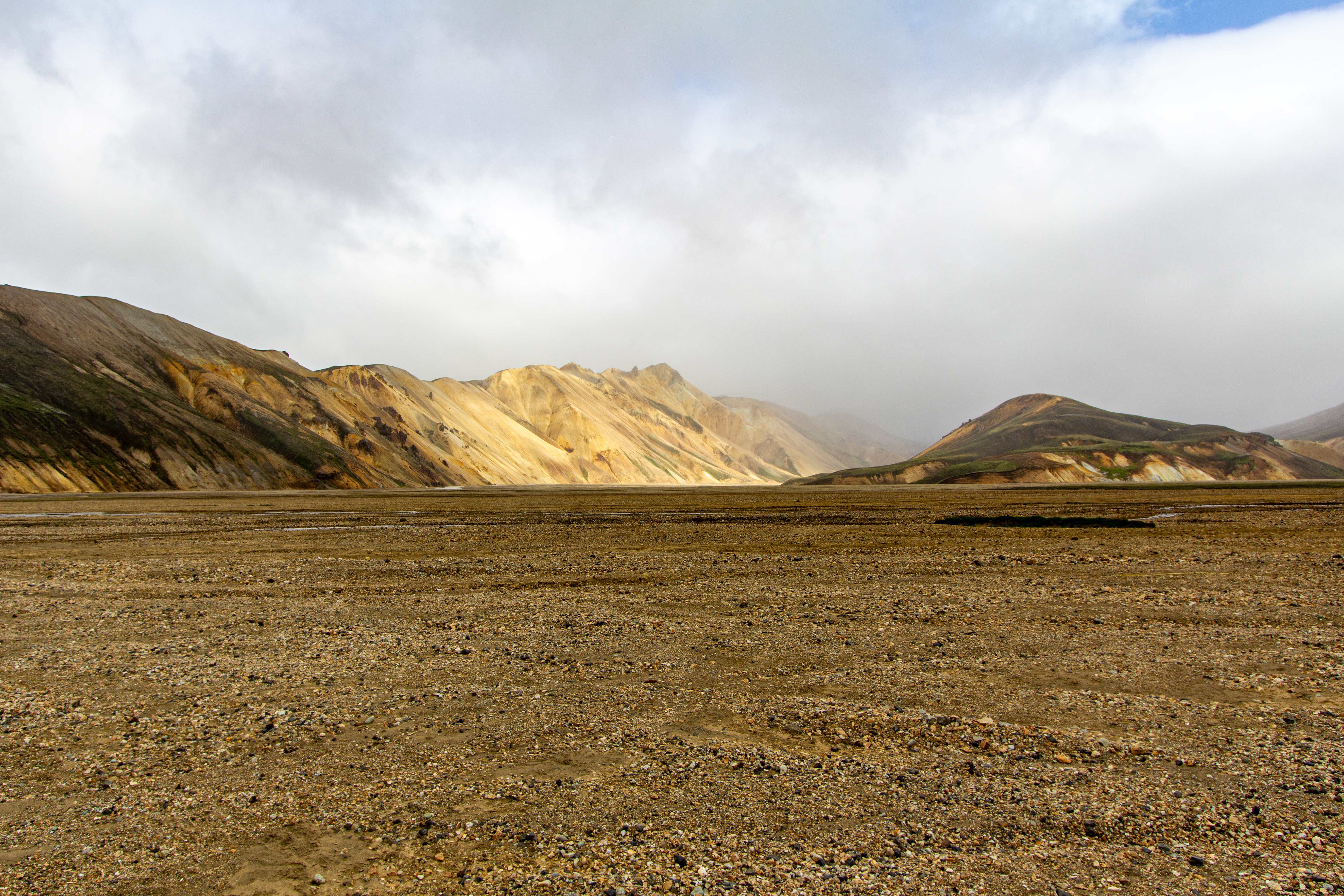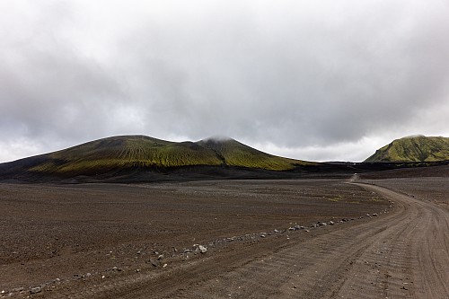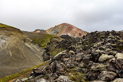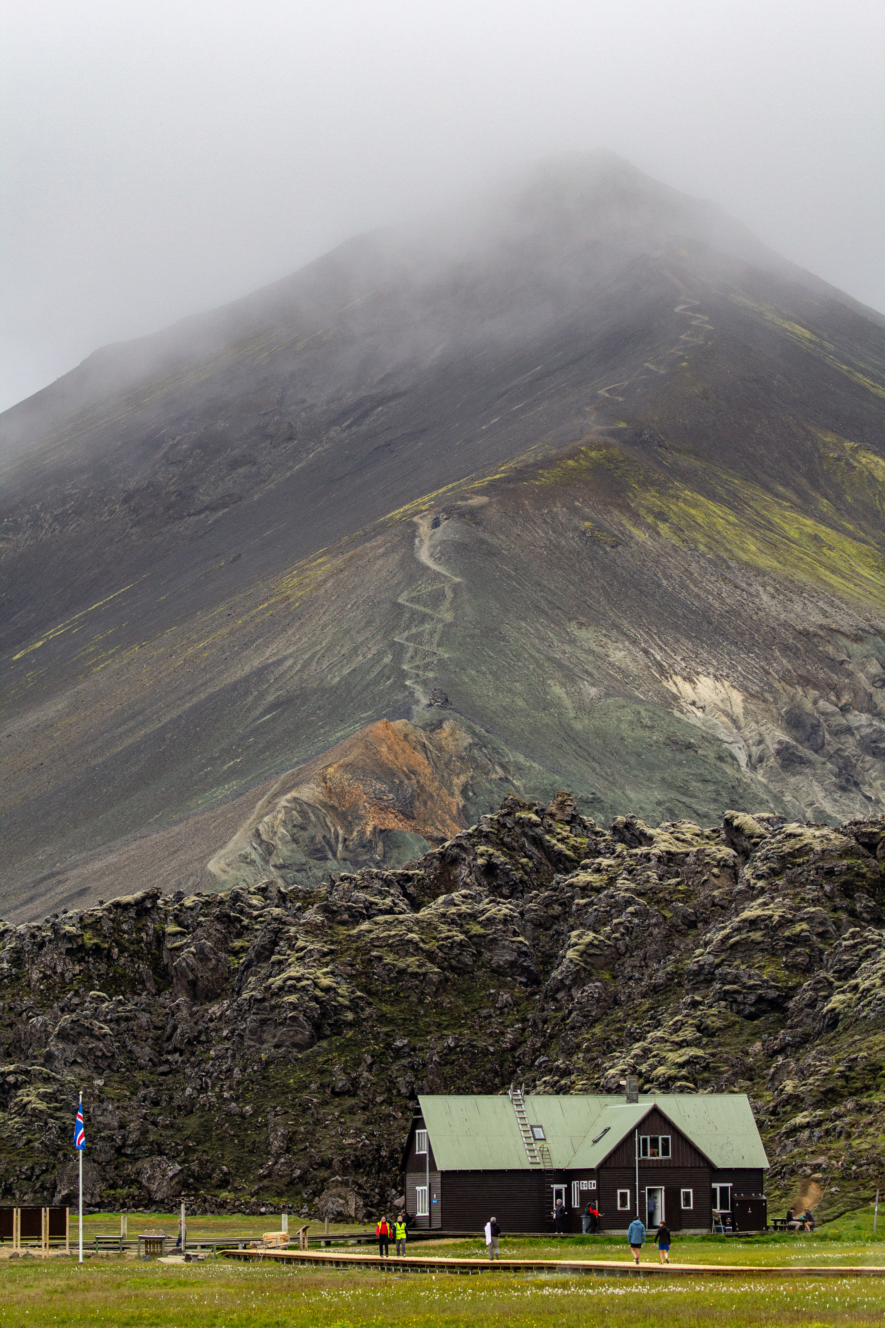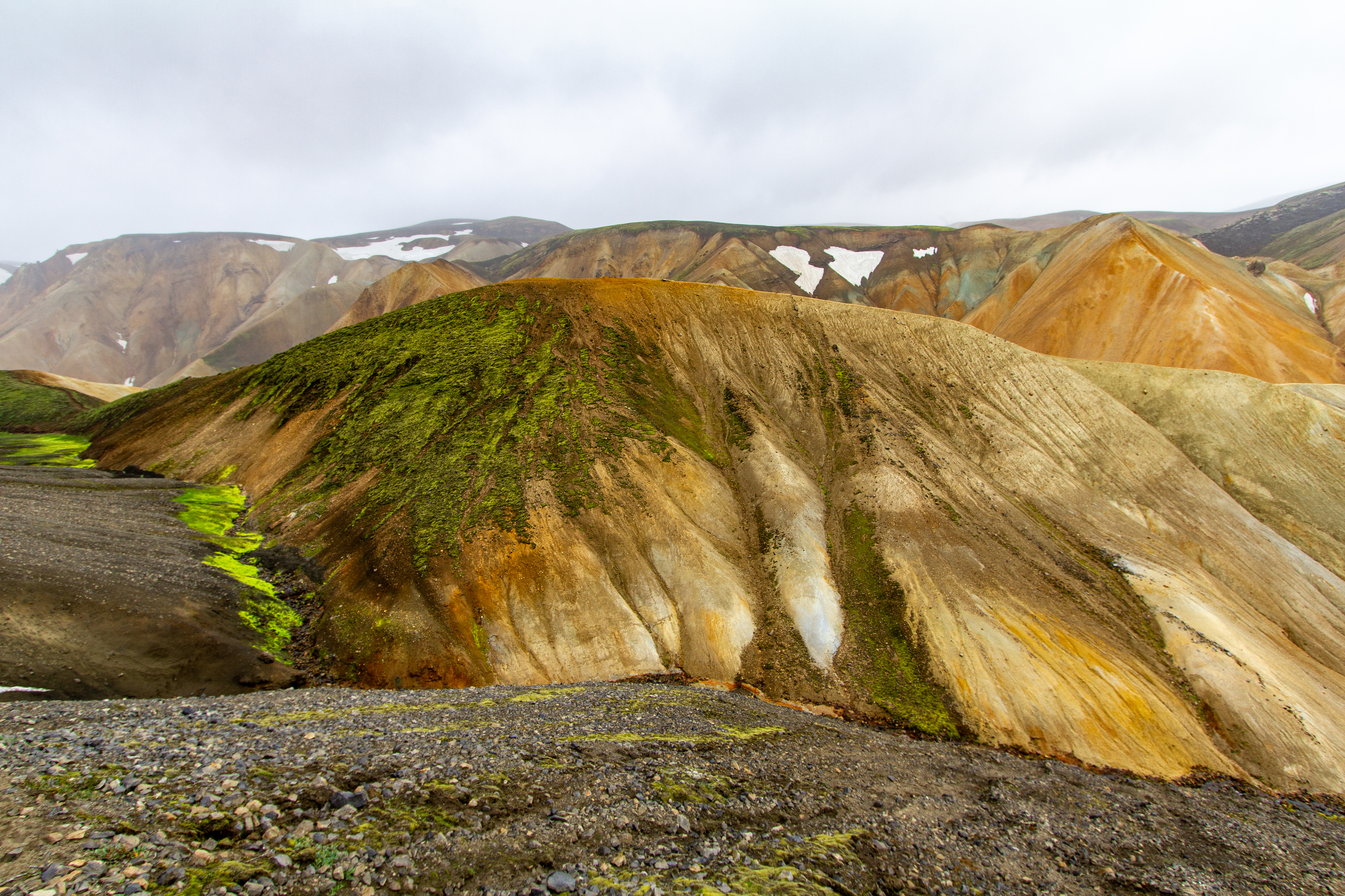 The road wasn’t too dusty, but it was washboarded and we were shaking quite a bit. We read up on how roads get like that (there was cell service everywhere), and it’s basically a steady state of ripples caused by tires bouncing up and down on unpaved roads. After what seemed a long time, we got to a turnoff for Bláhylur. We went up a steep embankment, and parked near the edge of a ridge. Below us was a turquoise lake, on the left was a neon green pyramidal mountain, and on the right was a reddish lava colored mountain - it was incredibly photogenic. Alas, the wind was howling, and there was water vapor in the air, and Justin was having all sorts of issues keeping water off his lenses. Then he couldn’t dry them, even in the car, and he was quite frustrated, as we had just started the trip. Eventually it stopped raining, and he found one cloth that got the moisture off the lenses. The view changed substantially once the sun came out, with the colors changing hues.