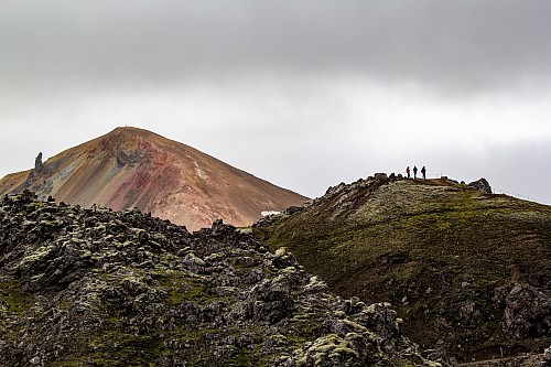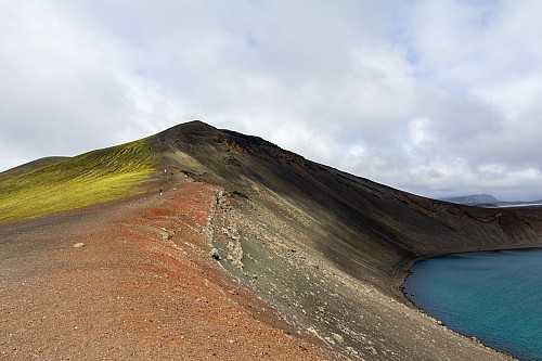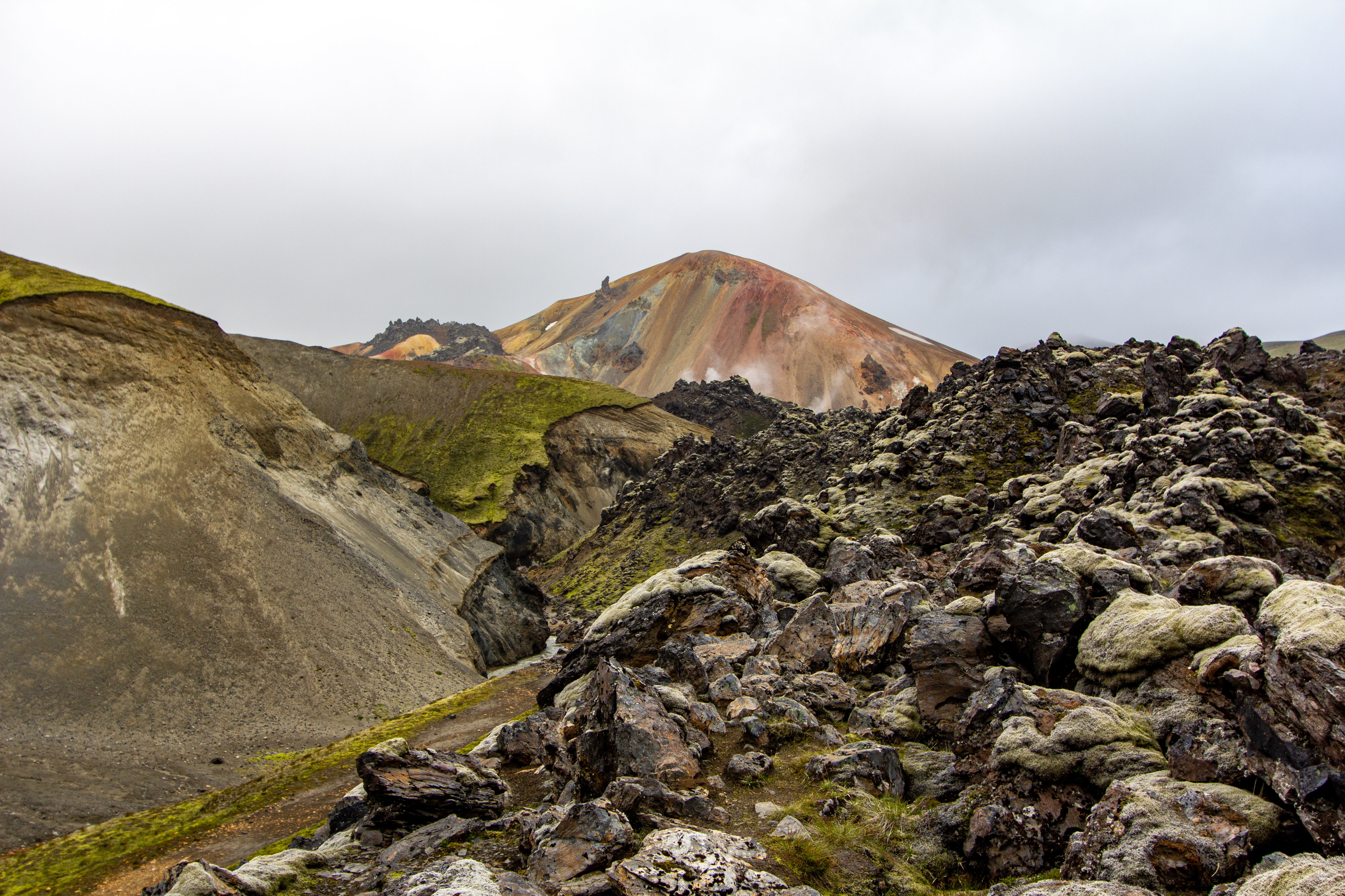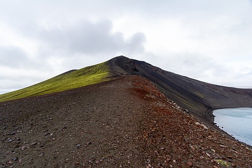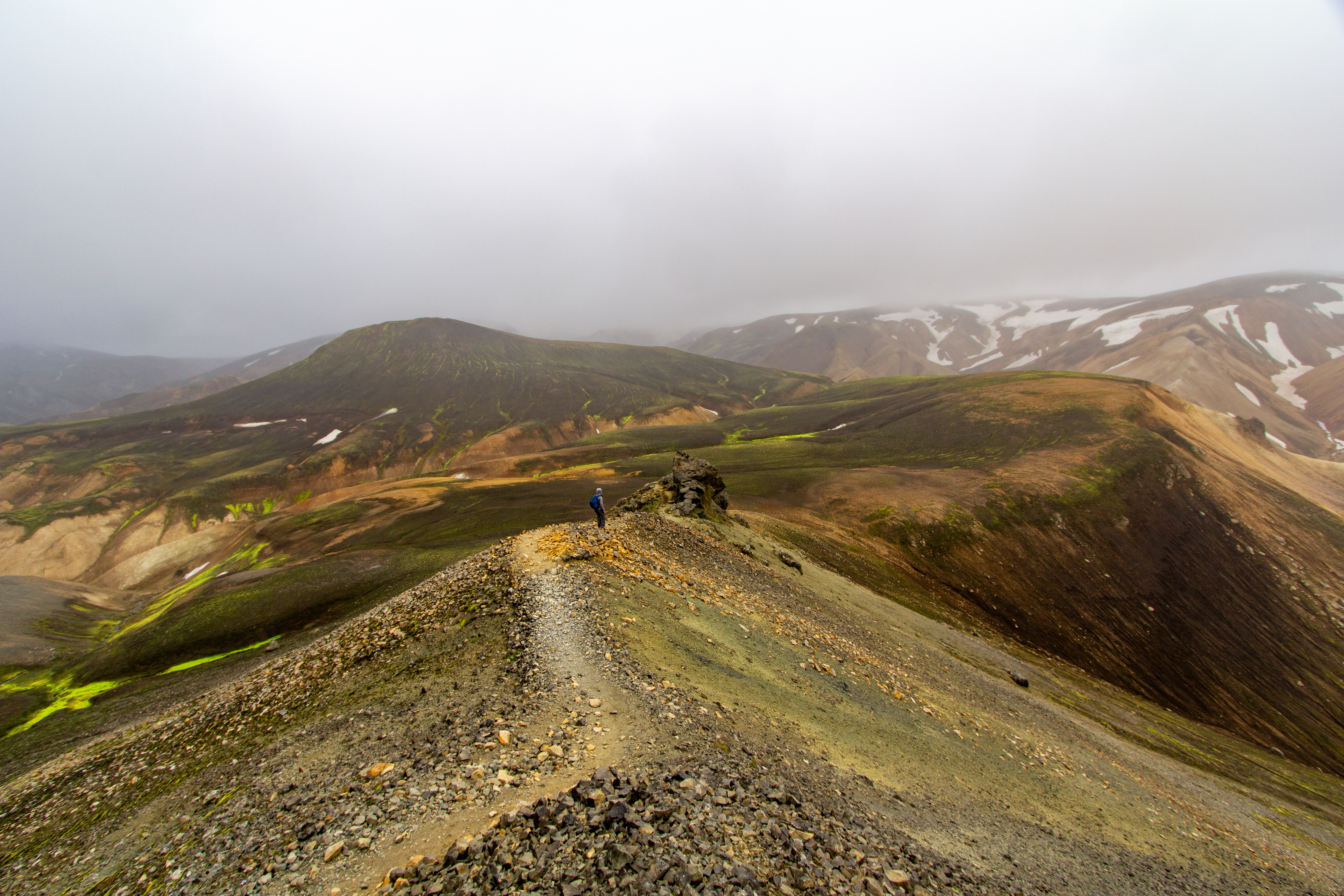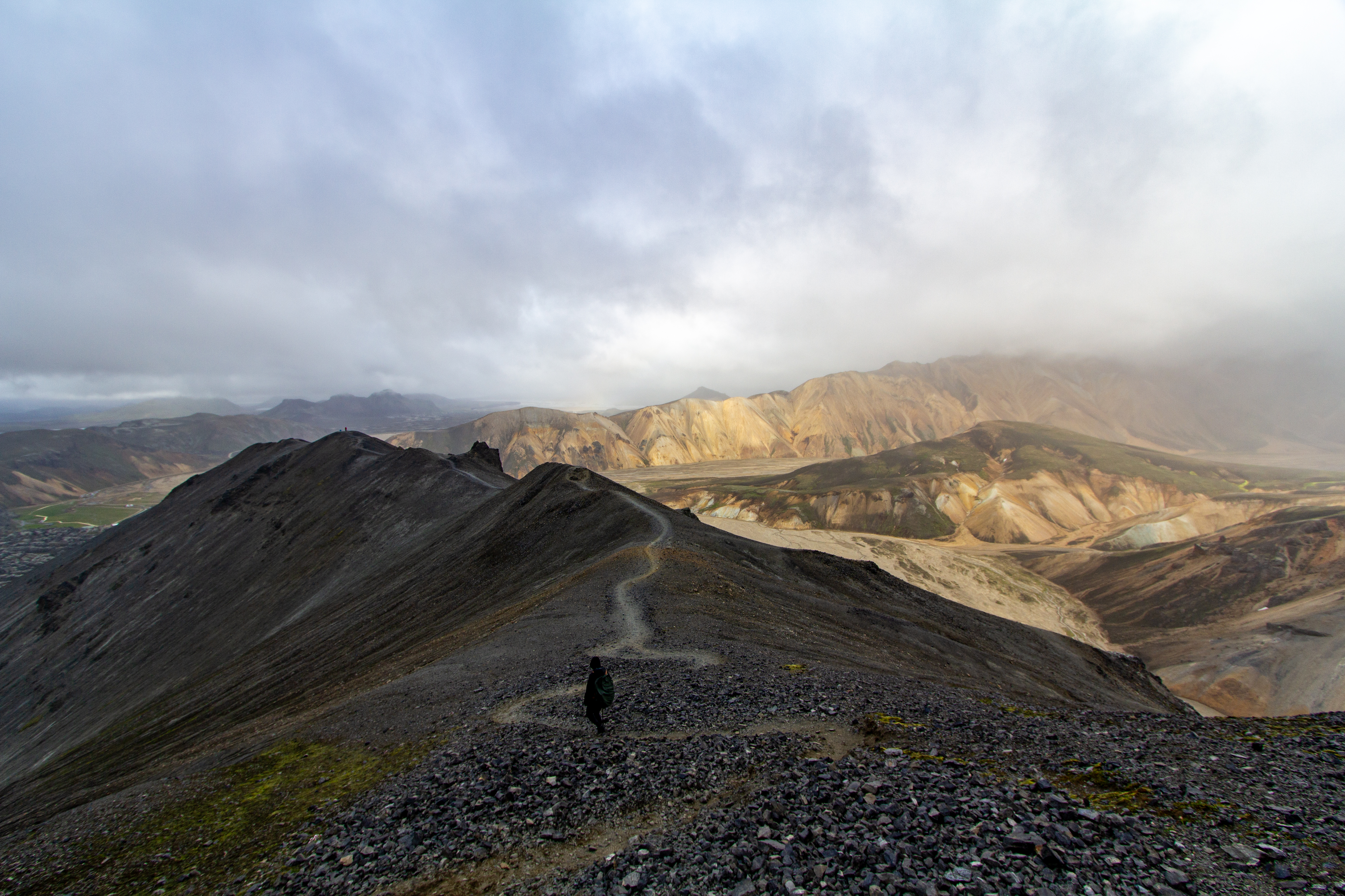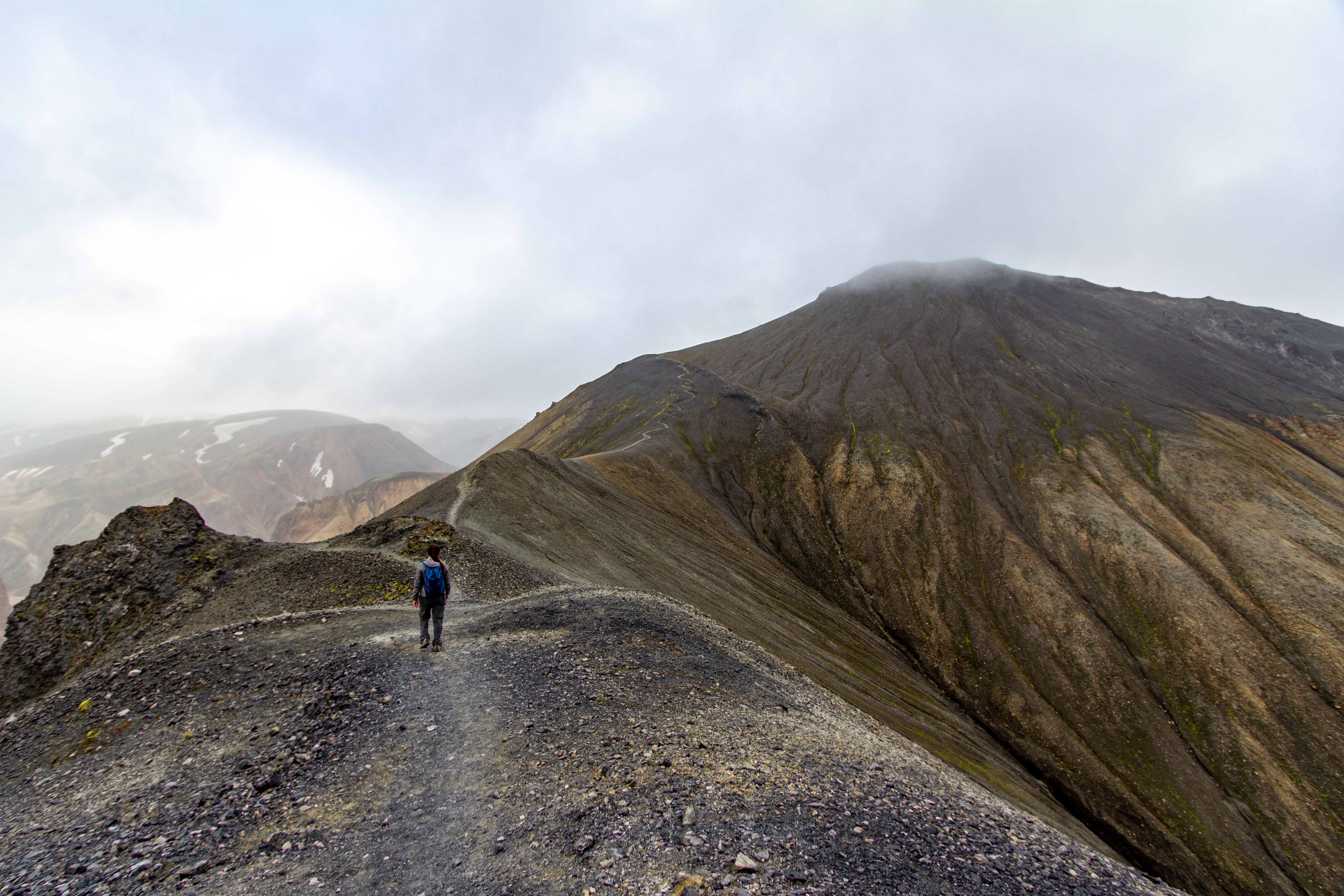It was quite windy as we started our hike, a loop hike going up to Bláhnjúkur peak and then back through some lava fields. We went clockwise, as the first part looked steep, and we’d rather go up steep than go down it. The first part was right up the side of a mountain, which was sort of turquoise-greenish. It was kind of like the green sand beach on the Big Island, but a bit more blue and a bit darker; we wondered what element this was from. Crystal was not a fan of walking on the ridgeline in such windy conditions, but she kept on, one step at a time.