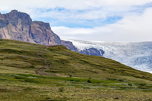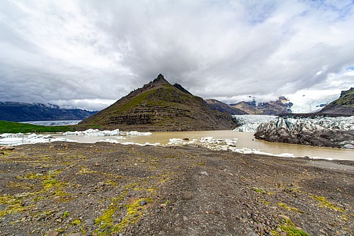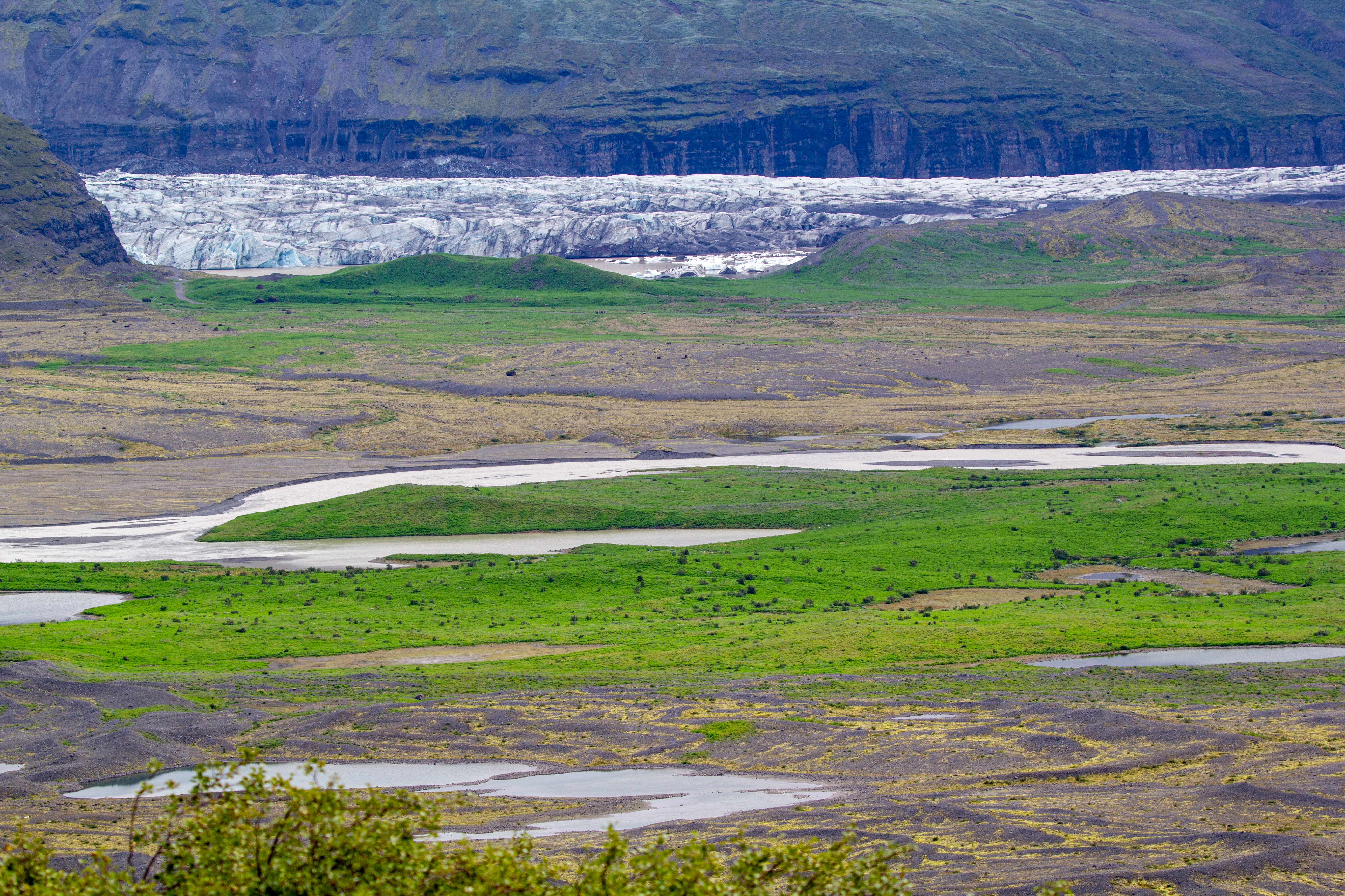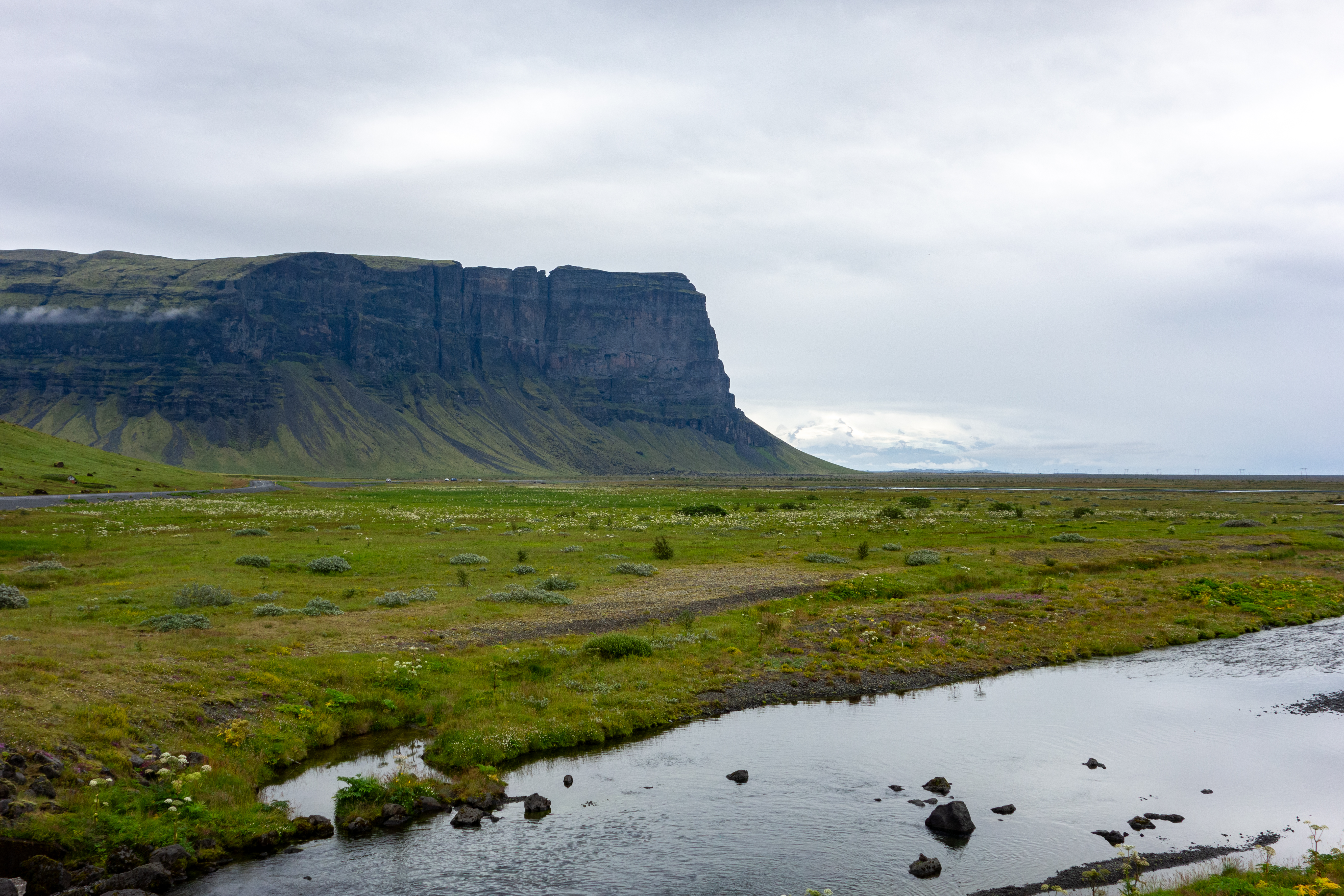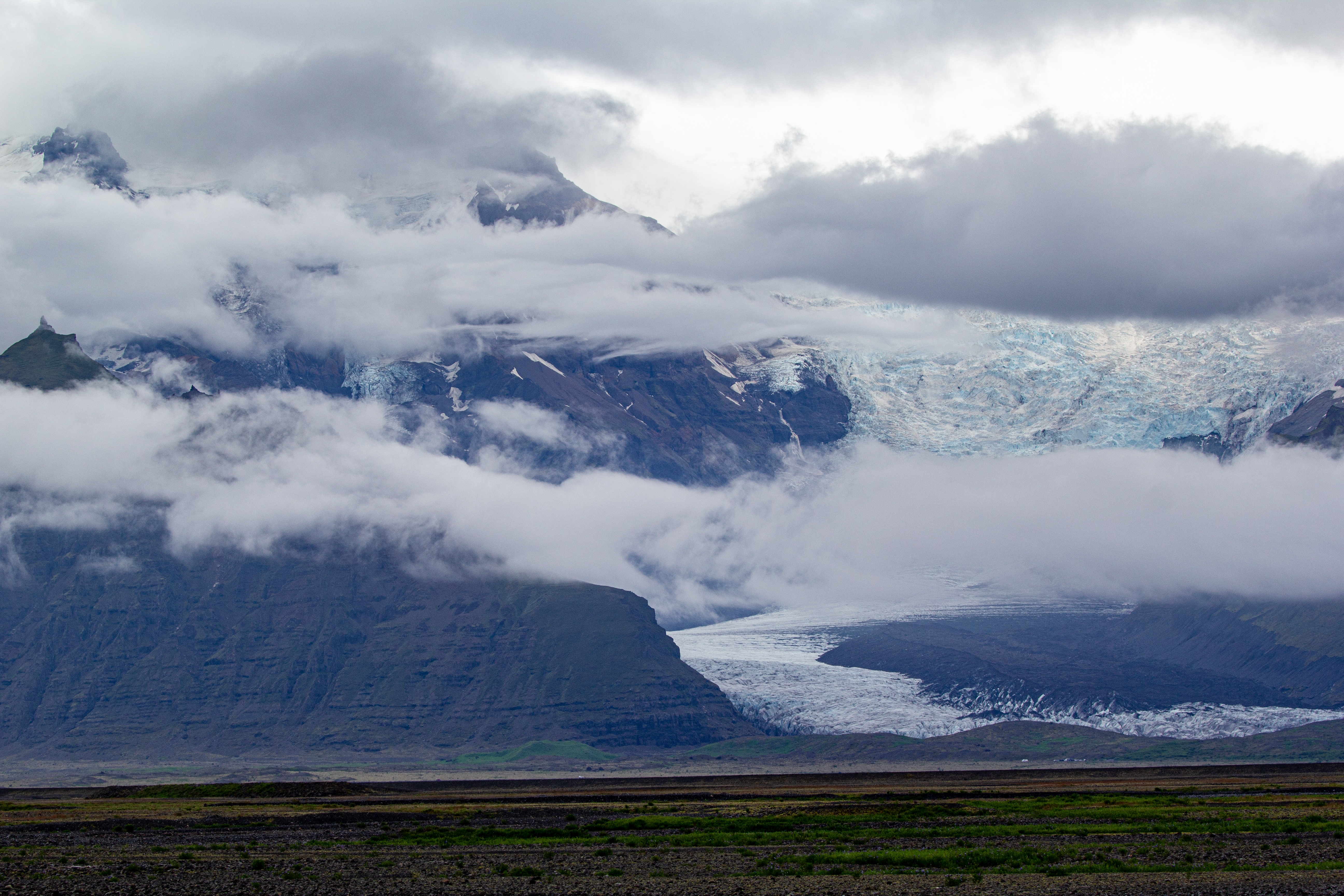We continued to see this butte/mesa the rest of the day, as it was a prominent point at the southwest part of the portion of the island we were visiting. We continued on to Skaftafell, but there were too many “Skaftafells” in the area, and we inadvertently went right past it towards some other location with a similar name, but fortunately the spot where we turned around had great views. We eventually found the correct spot (“Skaftafellsstofa” is probably the best search term to put in Google Maps, FYI), parked, and put some stuff in our waterproof backpacks for a hike.