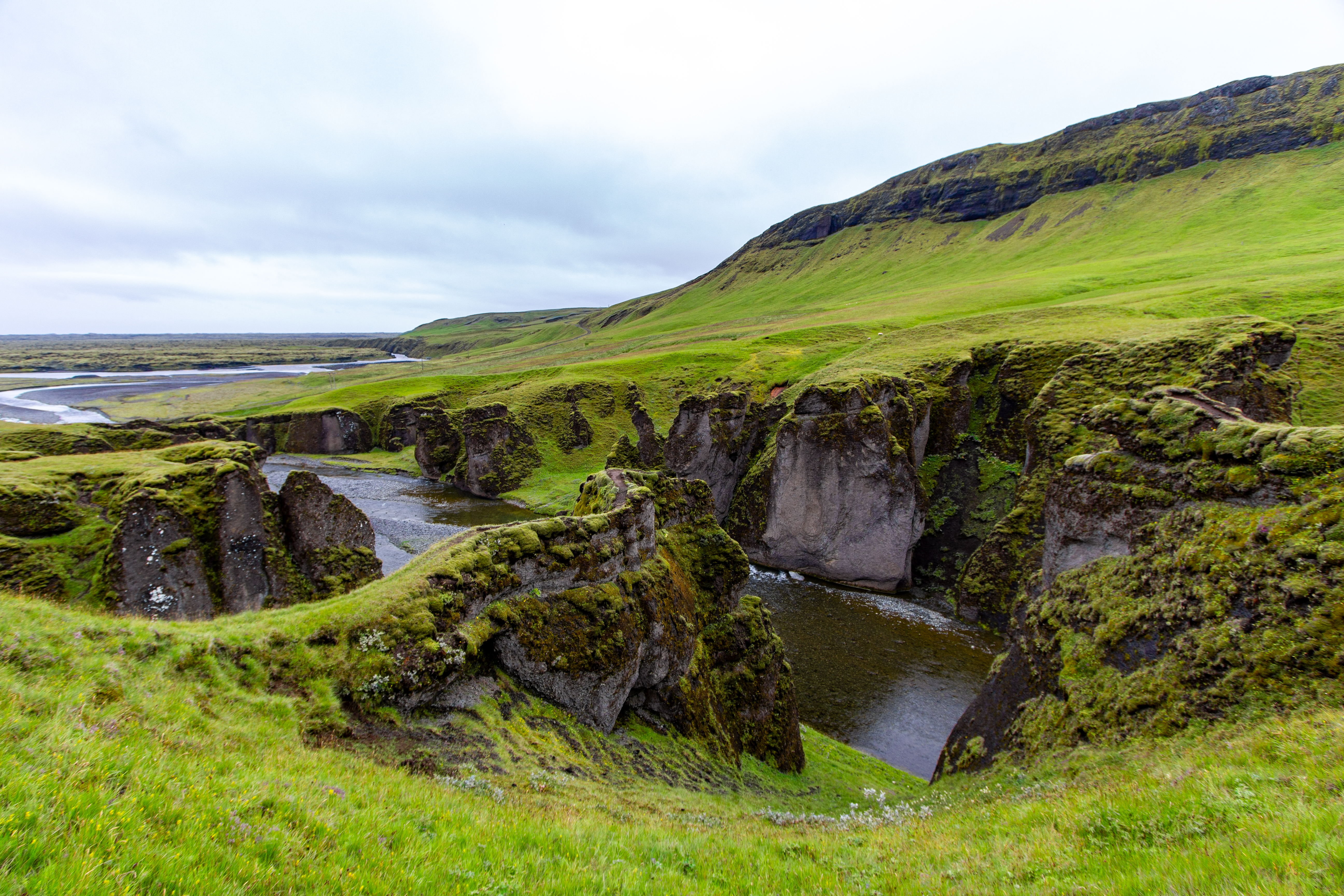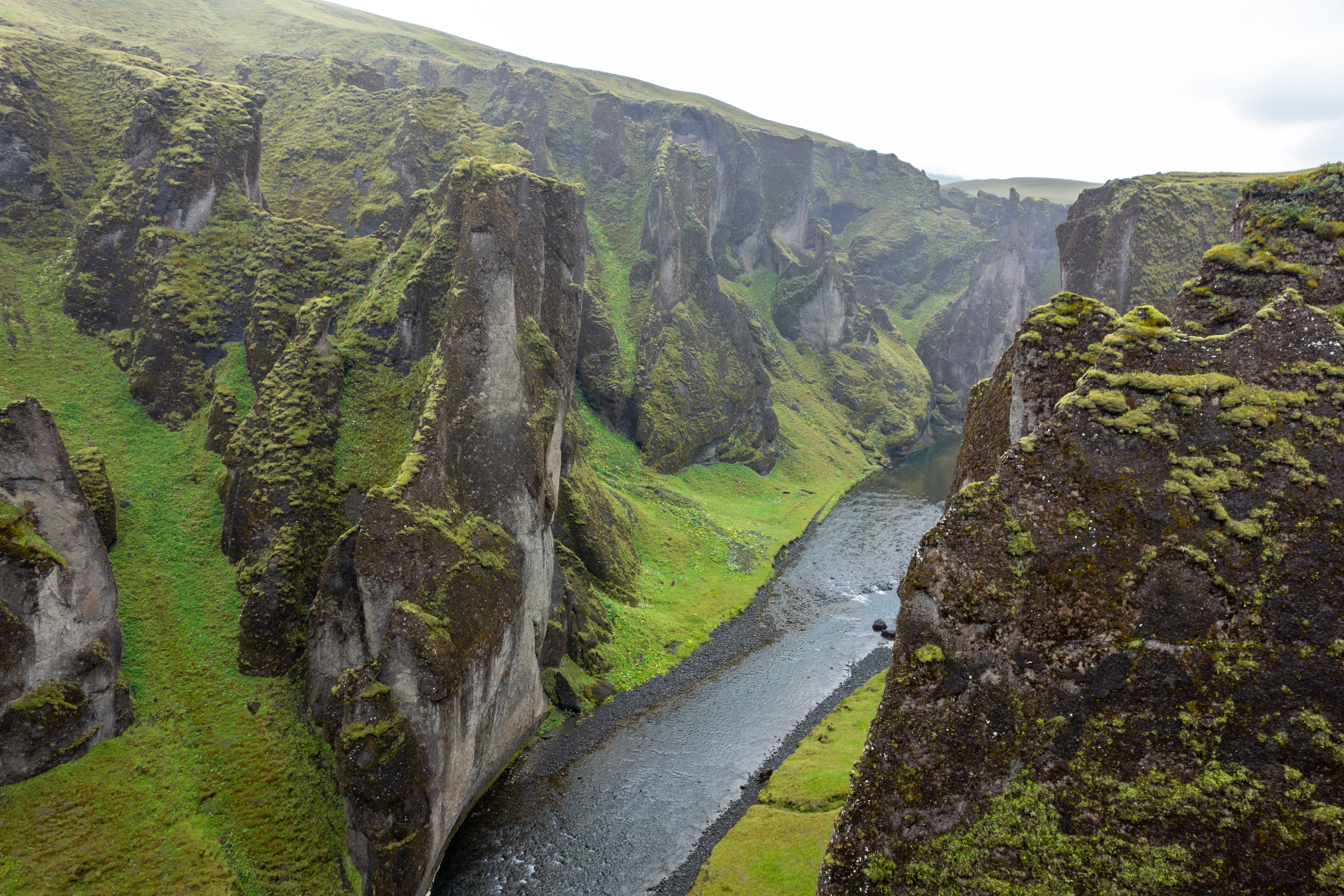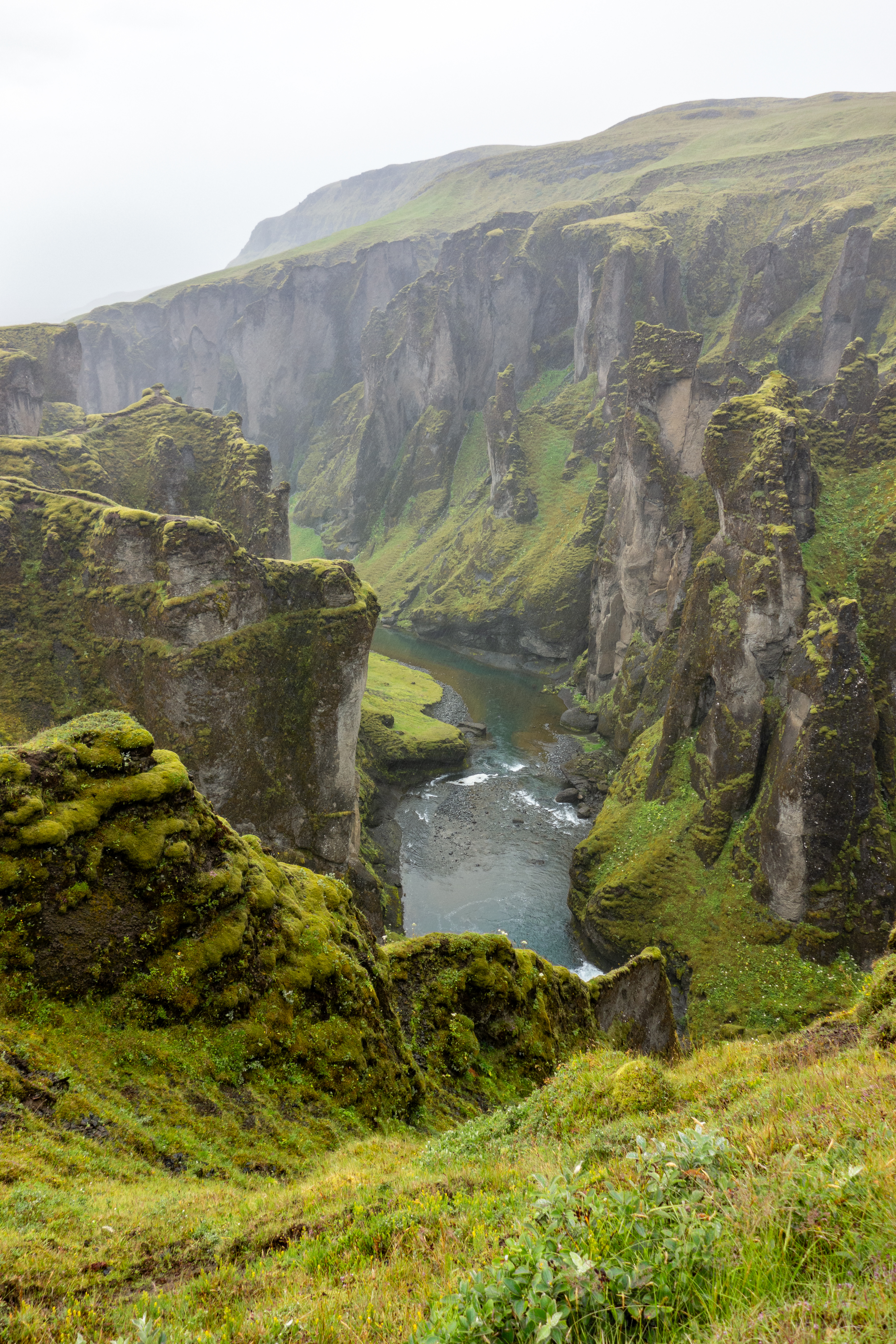 The topography at Fjaðrárgljúfur was unlike anything we’d seen so far. Because we couldn’t begin to pronounce it correctly, we just referred to it as “Squiggly Canyon”, as there was a river winding through the hills, and sharp green cliffs rising up from the river. Several rocks jutted up above the rim here and there, like canine teeth. Sadly, there were several vantage points where the broken Sony would’ve been nice, as the zoom lens couldn’t fit everything in the frame, and the old Sony couldn’t quite zoom in enough.