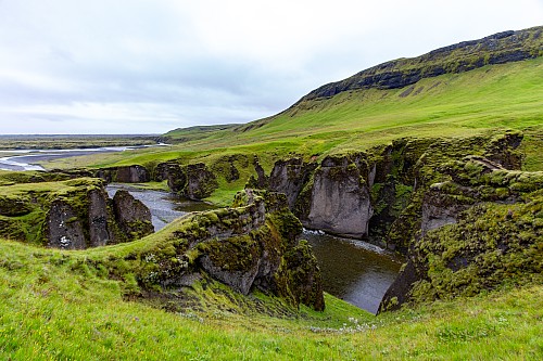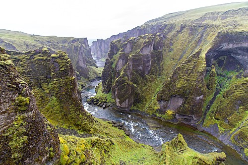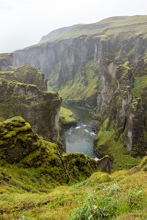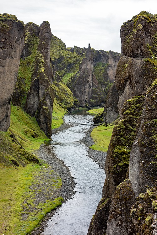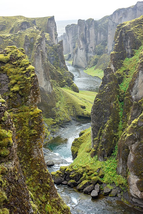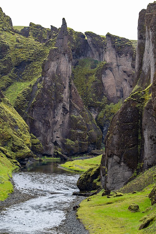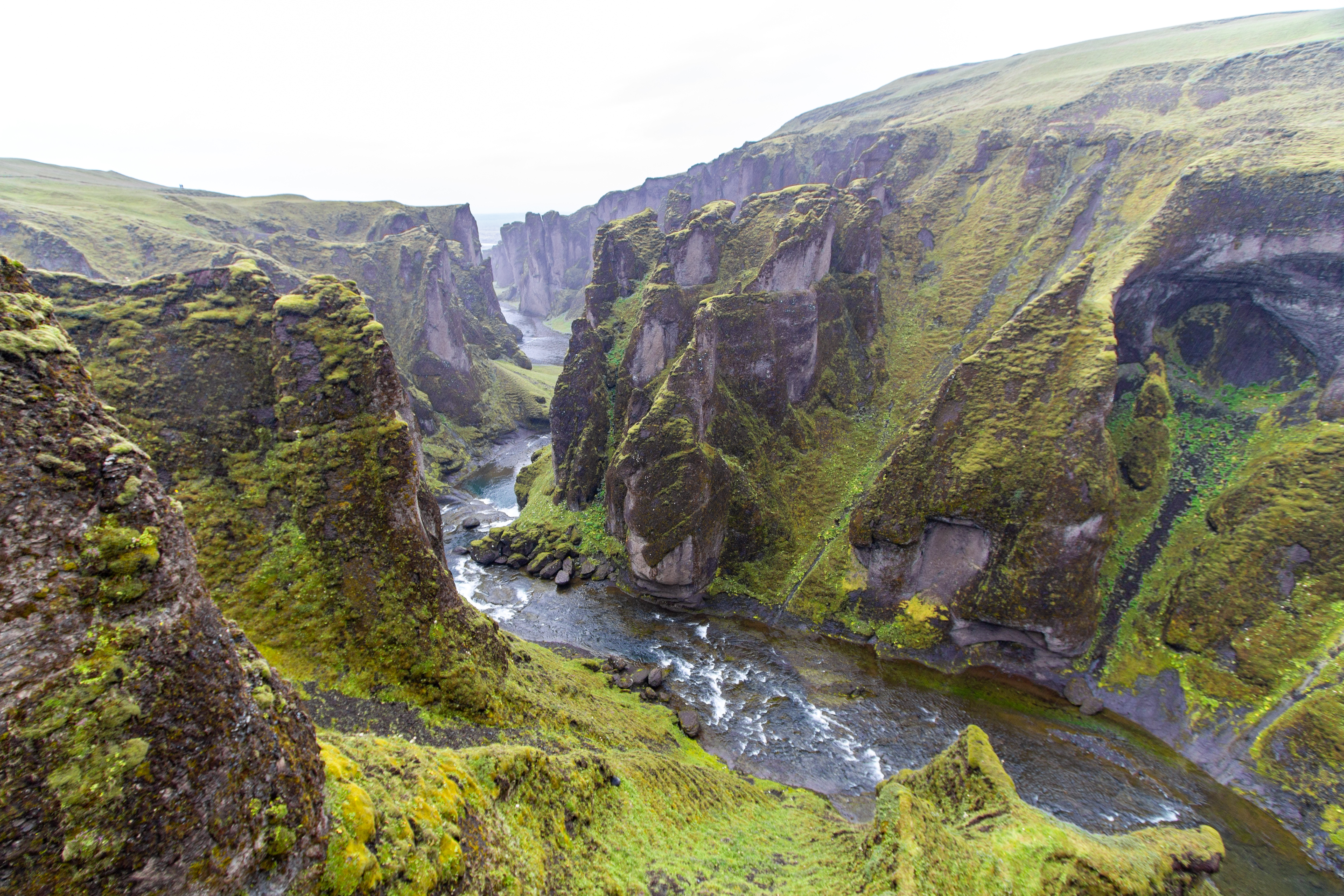 The topography at Fjaðrárgljúfur was unlike anything we’d seen so far. Because we couldn’t begin to pronounce it correctly, we just referred to it as “Squiggly Canyon”, as there was a river winding through the hills, and sharp green cliffs rising up from the river. Several rocks jutted up above the rim here and there, like canine teeth. Sadly, there were several vantage points where the broken Sony would’ve been nice, as the zoom lens couldn’t fit everything in the frame, and the old Sony couldn’t quite zoom in enough.