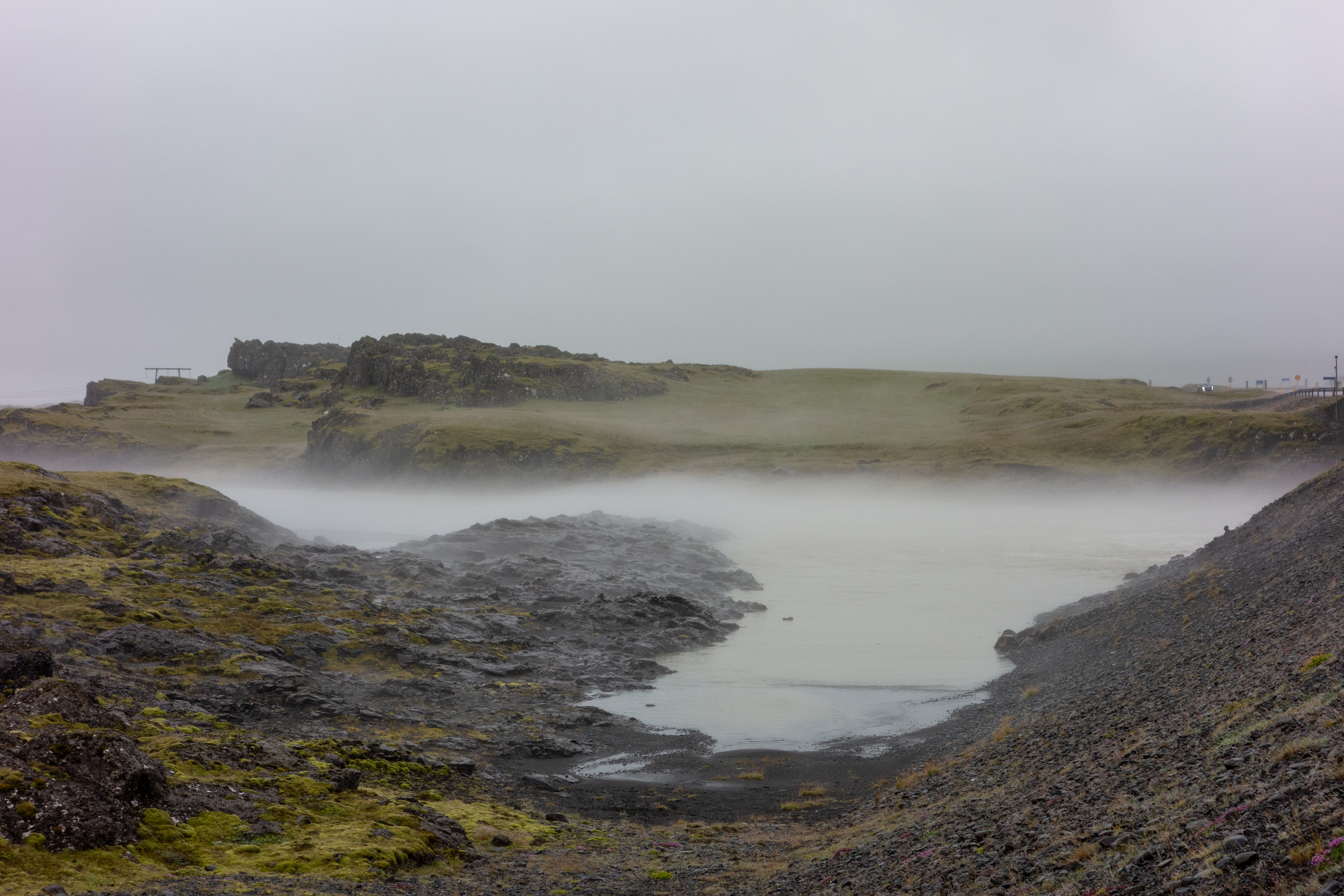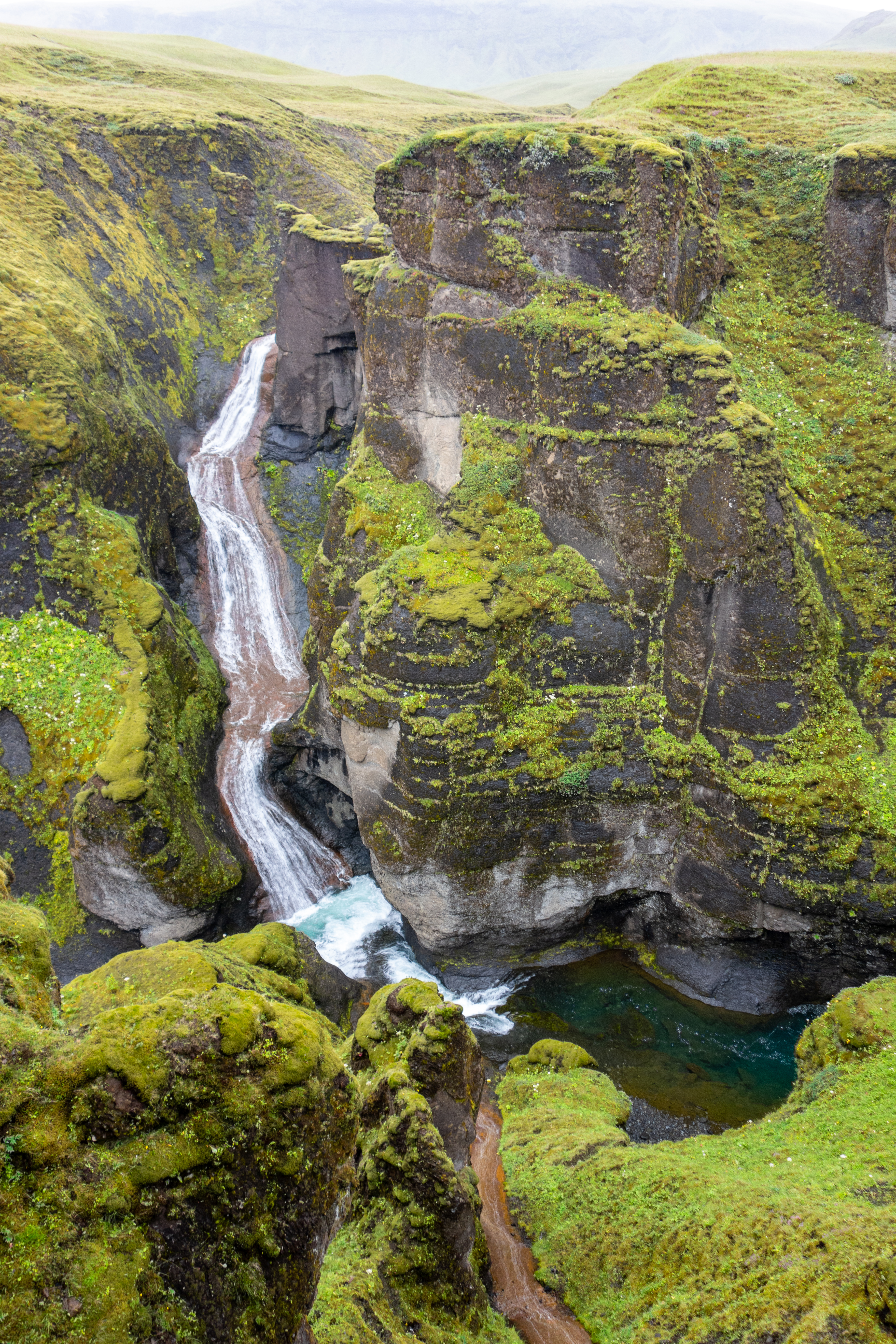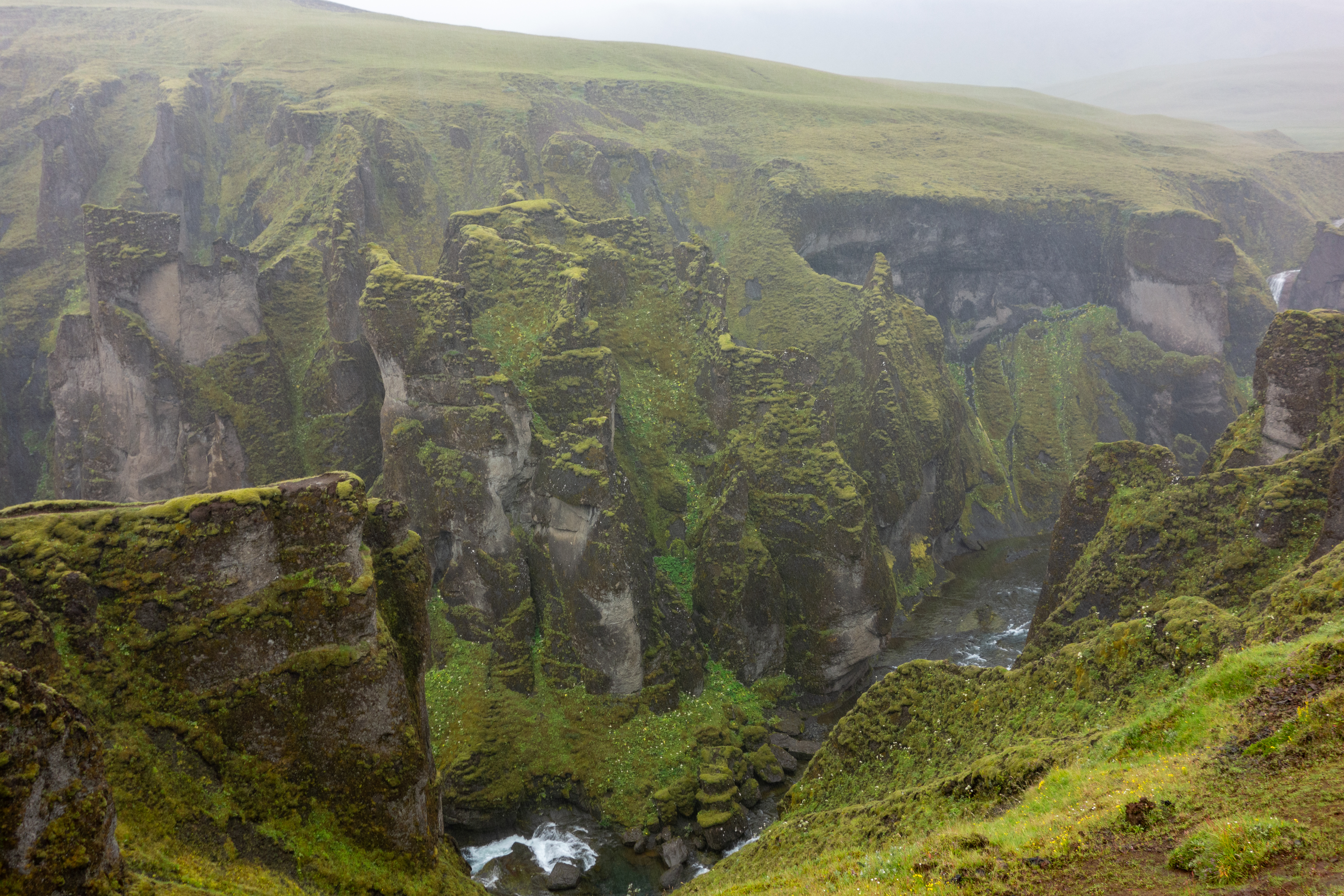For how empty the road was, the few cars were seemingly all going to the same place, Fjaðrárgljúfur. It wasn’t misting when we arrived, but it started on our walk. We hoped this wasn’t going to be a continuation of yesterday. Fjaðrárgljúfur is much more popular than it used to be, and sadly this meant a new path, further from the edges of the cliffs, with the best vantage points now roped off. Some of the “best” vantage points did look admittedly sketchy, and even Justin thought so, but whoever put in the new paths had over-corrected.
