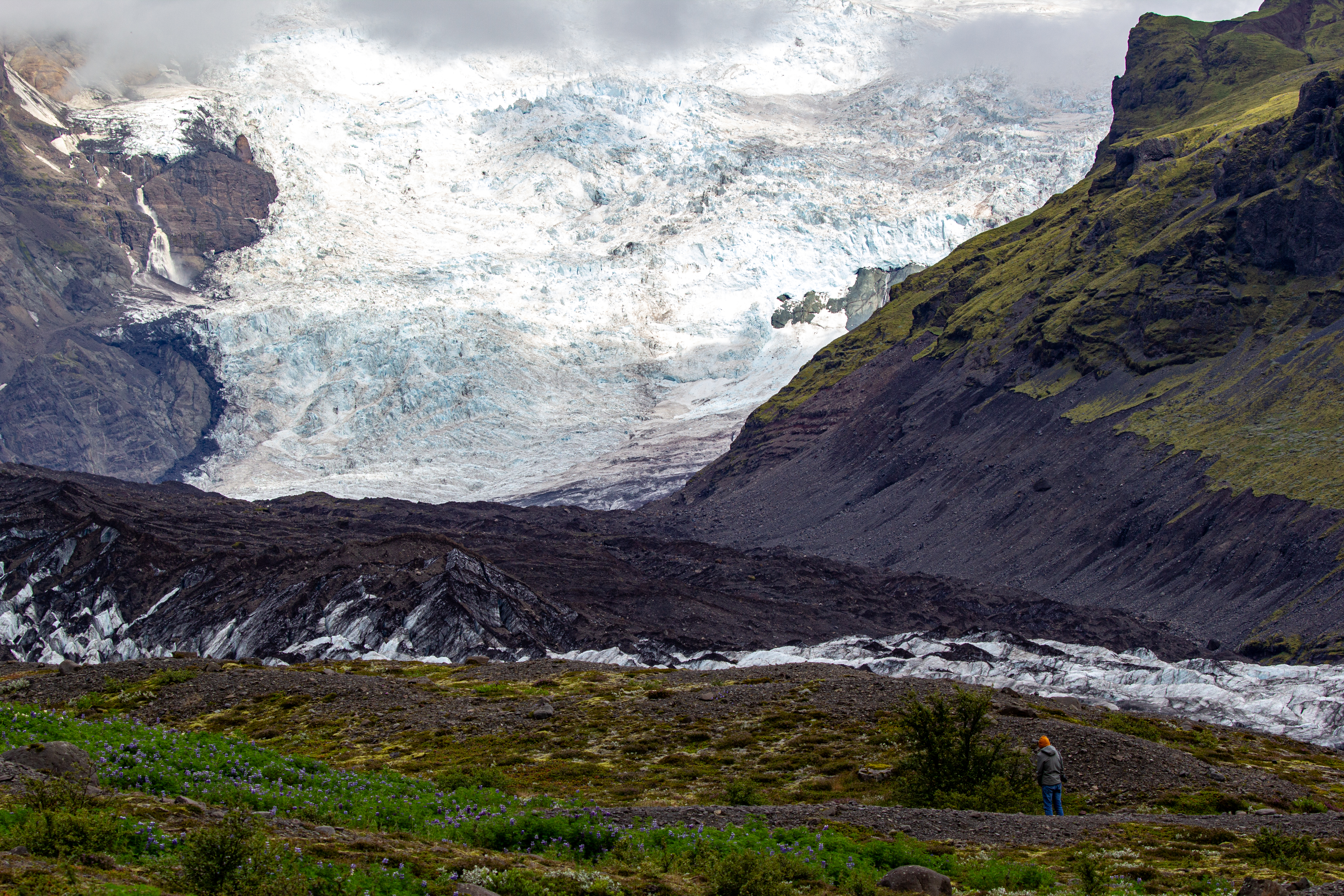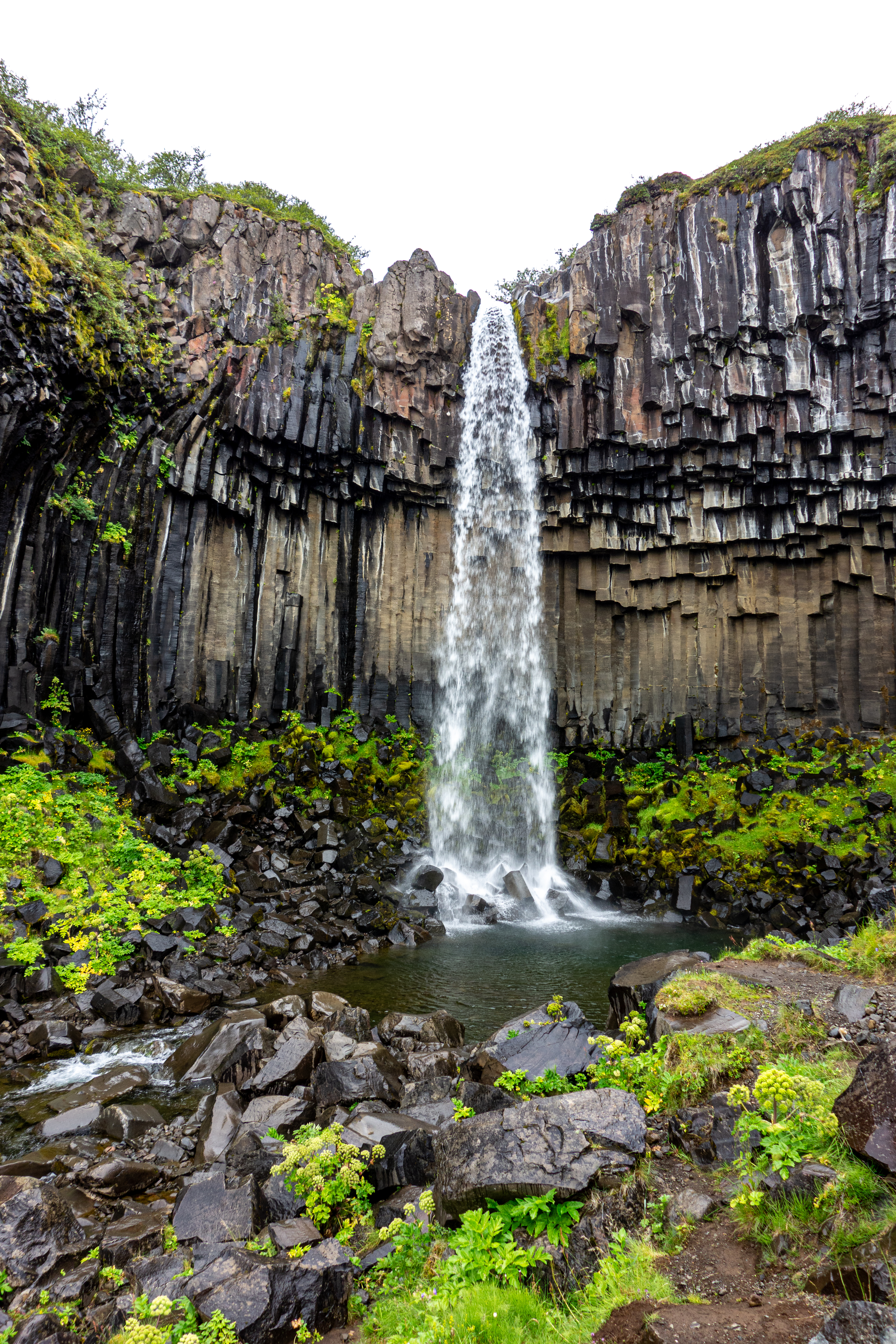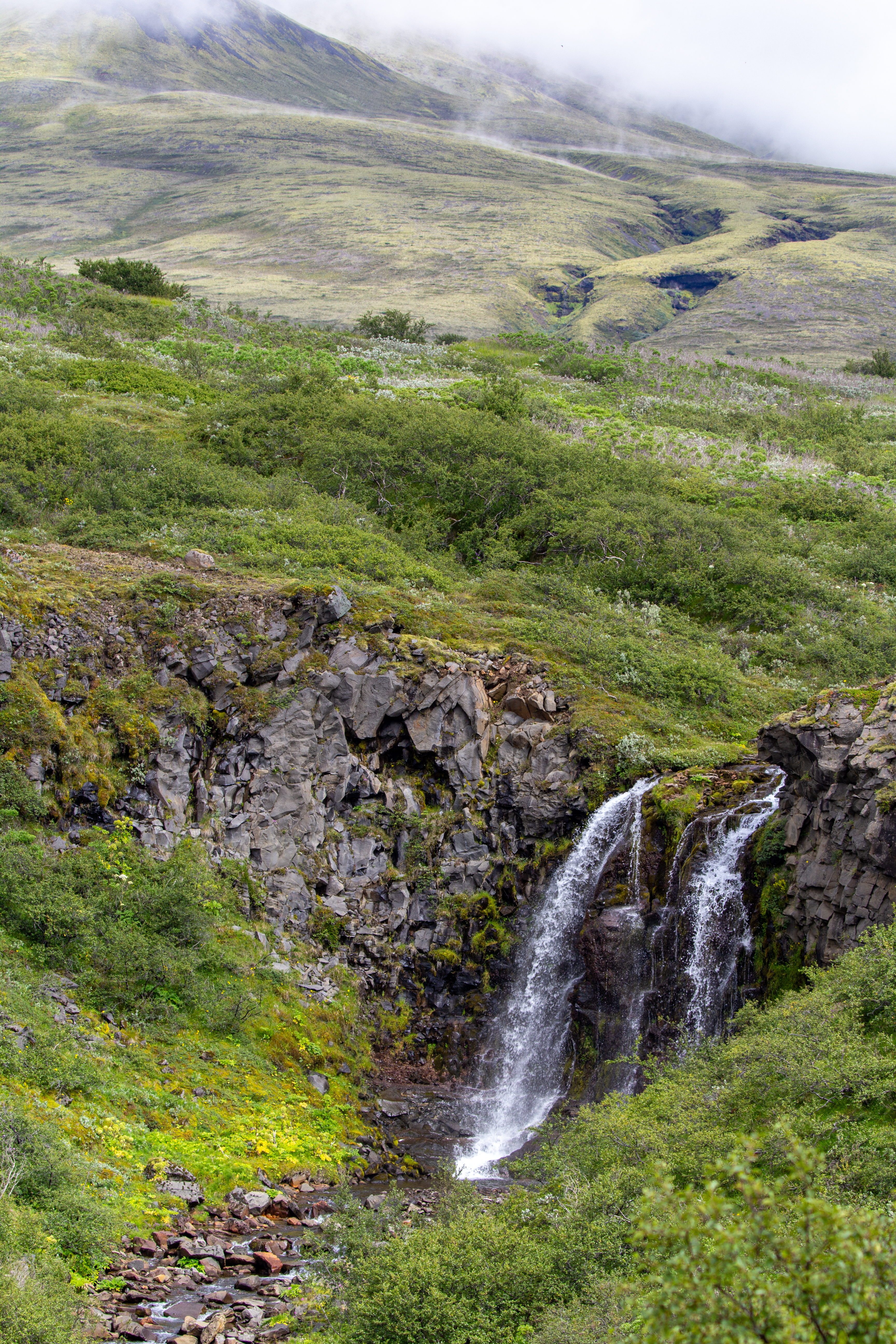 We had chosen to do a loop hike that visited both Svartifoss, a waterfall, and Skaftafell Glacier high-altitude observation point. We had in our notes to go counterclockwise (in bold no less), but we weren’t sure why going that direction was so important. First we had to find the start location, which we missed in the beginning. Lots of some shrub was blooming everywhere - we’ve seen this plant all over the island, but today it seemed to have the densest clusters. We saw a “small” waterfall on the way up to Svartifoss, Magnúsarfoss. In many places we’ve visited, this waterfall would’ve been an attraction on its own. Here, we didn’t even know its name, we had to look it up after-the-fact.
