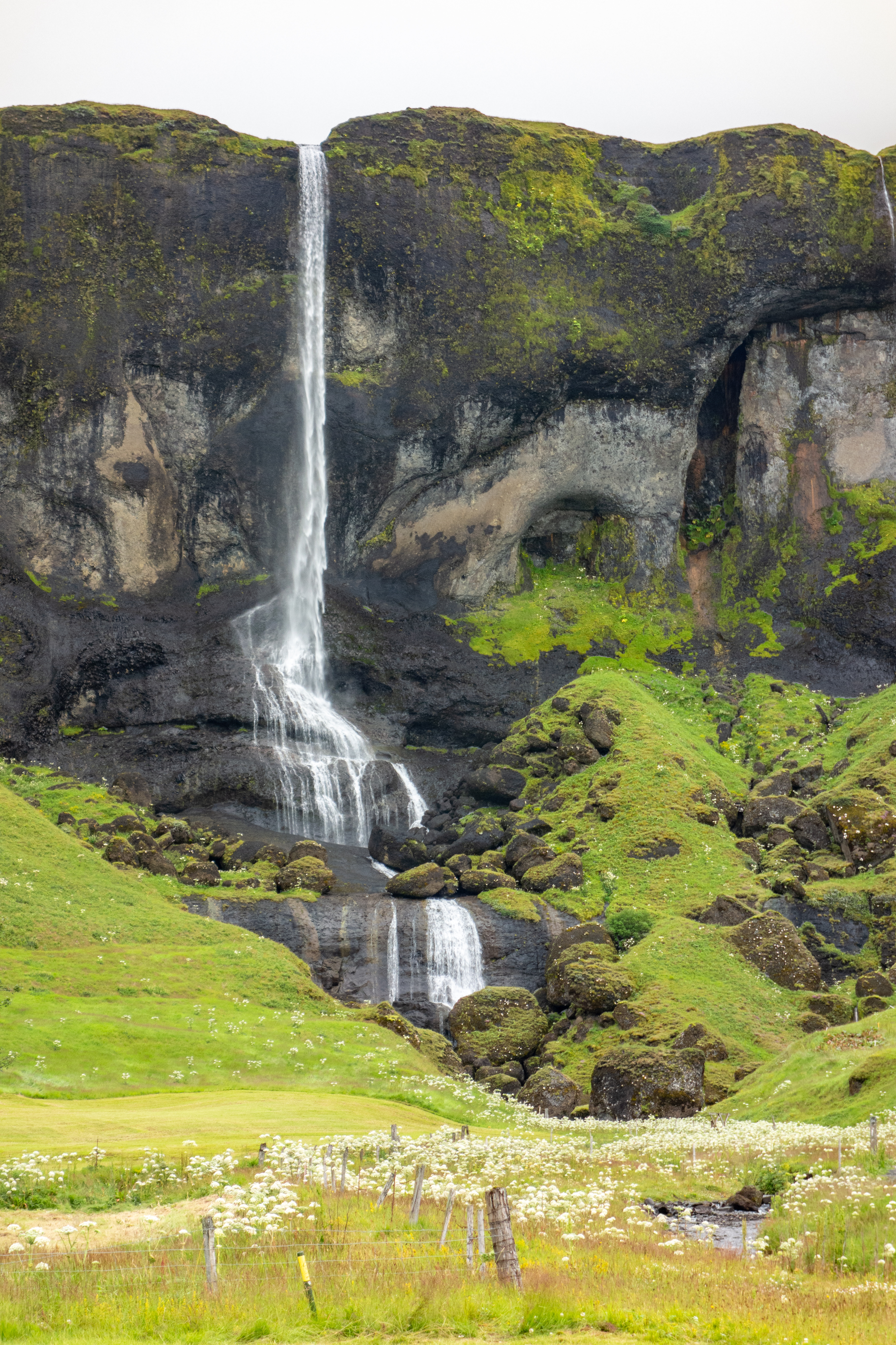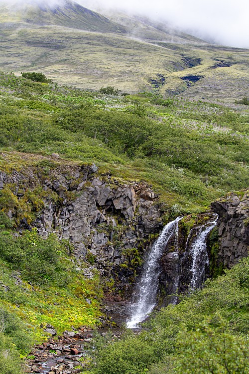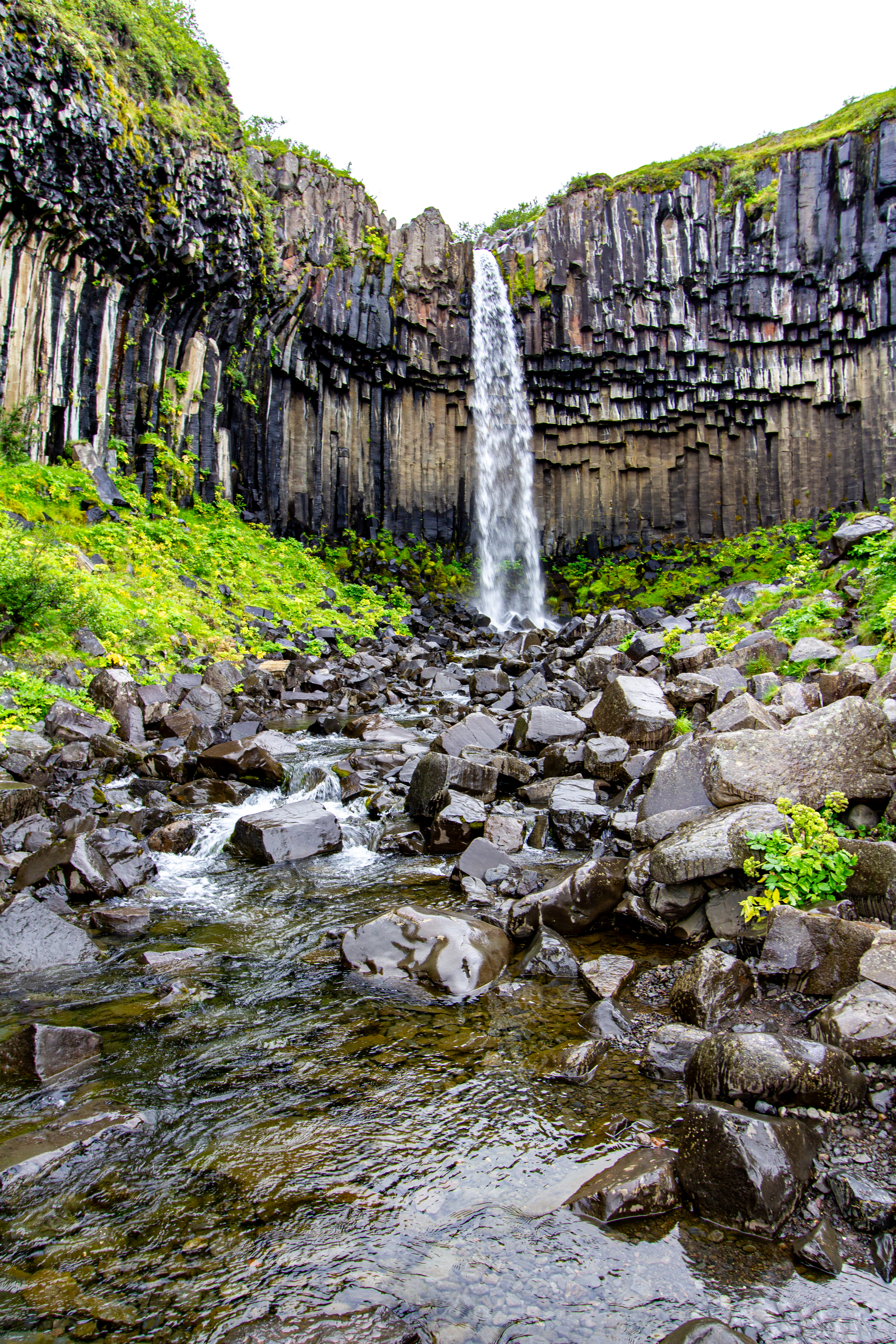 We had chosen to do a loop hike that visited both Svartifoss, a waterfall, and Skaftafell Glacier high-altitude observation point. We had in our notes to go counterclockwise (in bold no less), but we weren’t sure why going that direction was so important. First we had to find the start location, which we missed in the beginning. Lots of some shrub was blooming everywhere - we’ve seen this plant all over the island, but today it seemed to have the densest clusters. We saw a “small” waterfall on the way up to Svartifoss, Magnúsarfoss. In many places we’ve visited, this waterfall would’ve been an attraction on its own. Here, we didn’t even know its name, we had to look it up after-the-fact.