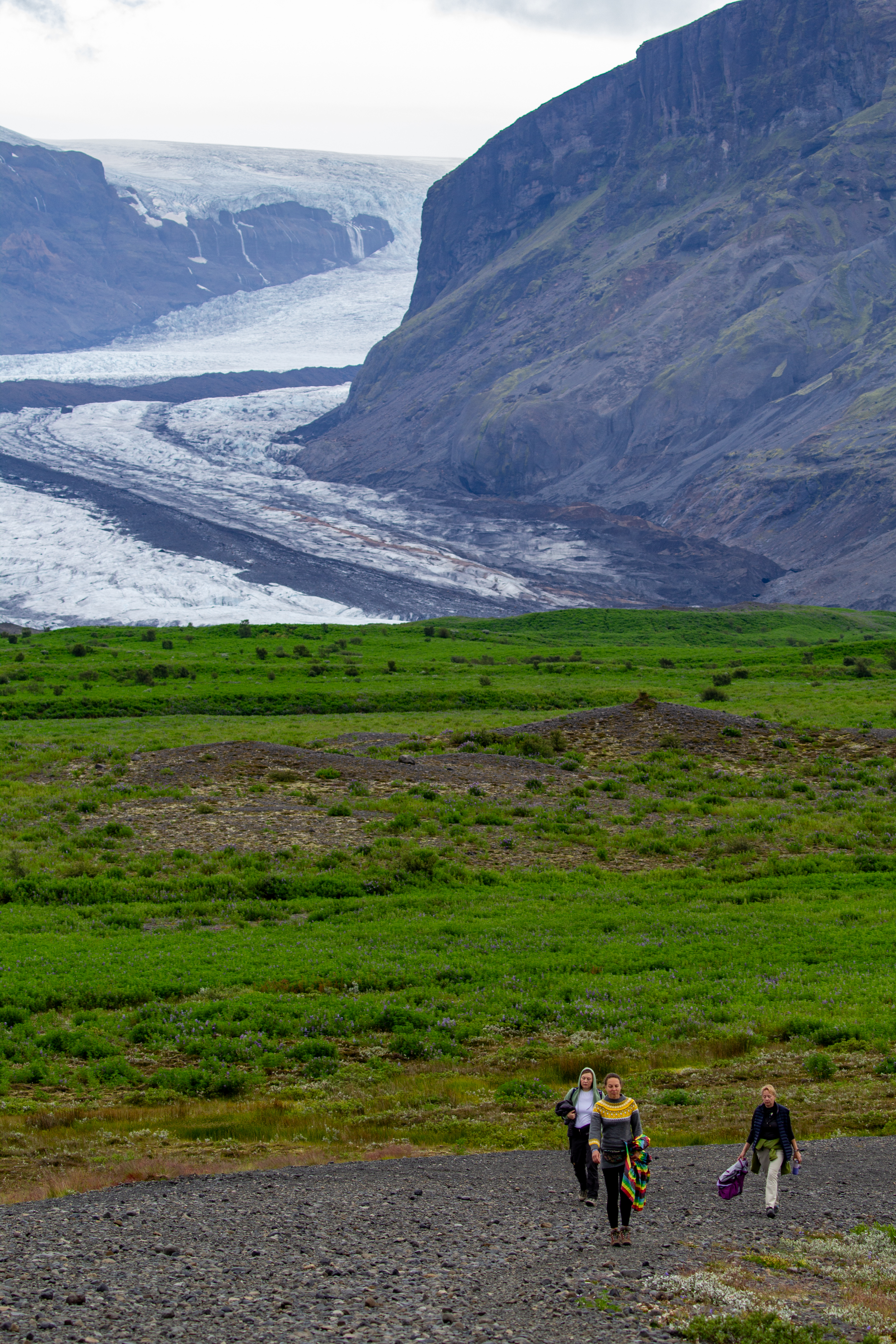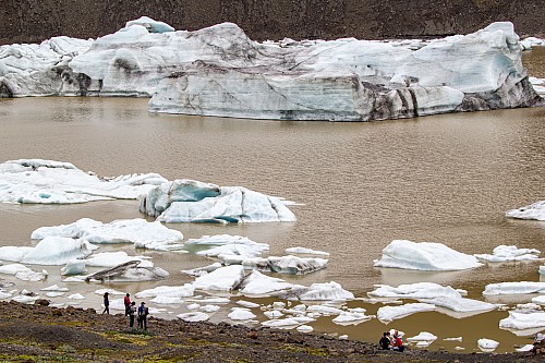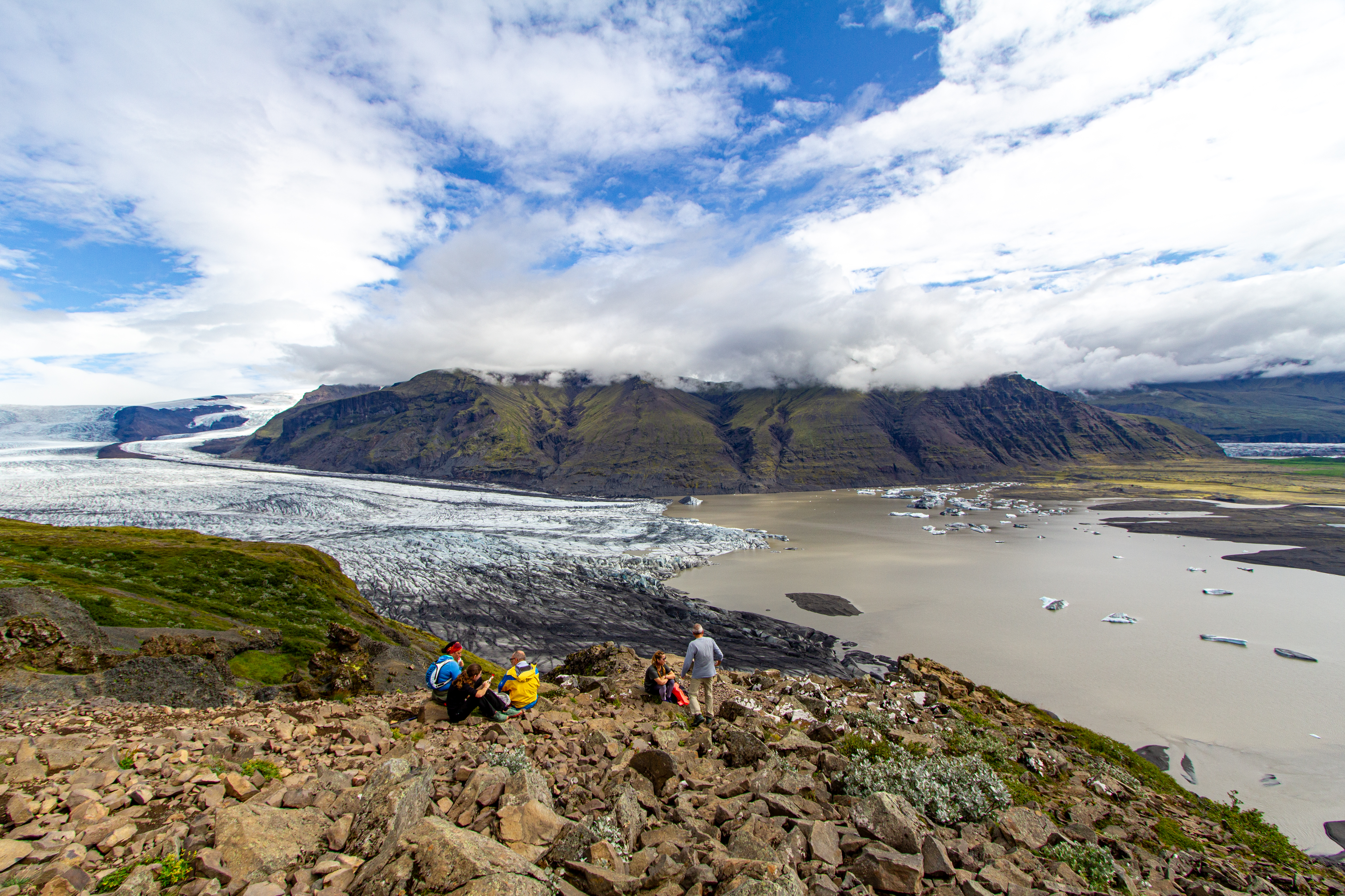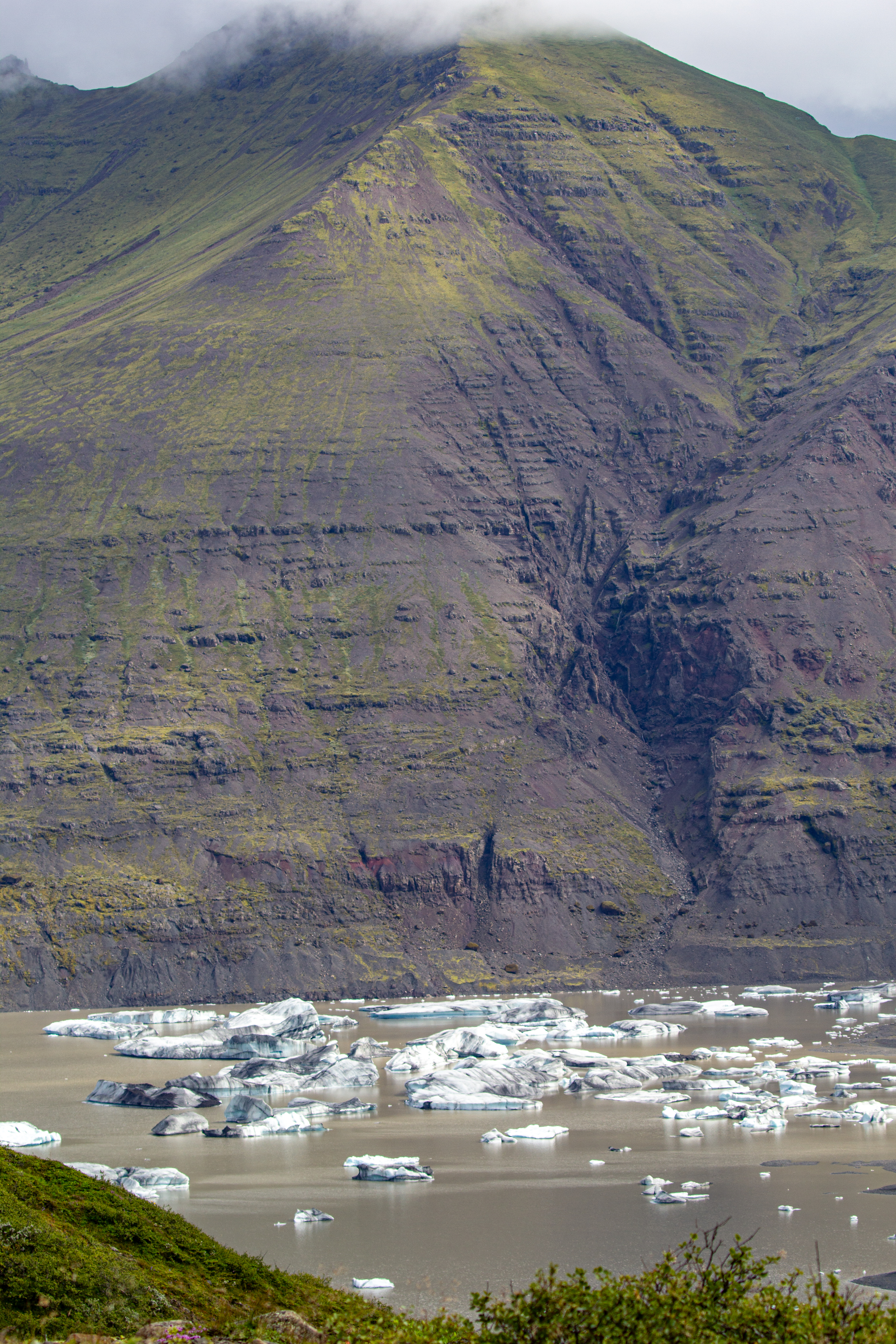 The sun was out for most of the walk from Svartifoss to the glacial lookout. The white on the glacier was super bright in the afternoon sun. We had sweeping views of the whole south and southeast coast, with glaciers all around. When we approached the lookout, there was a big reveal - a lake at the bottom of the glacier full of icebergs. Perhaps this was the reason for the counterclockwise route - to allow for the big surprise reveal. Some of this ice was black as well - presumably from ash from E16 (but maybe not).