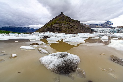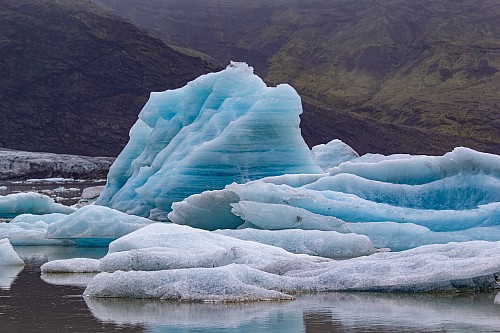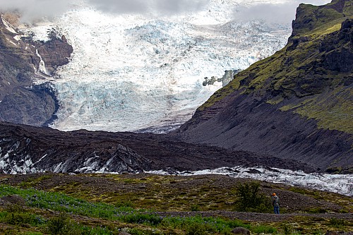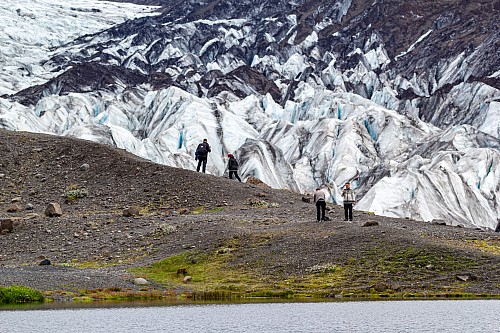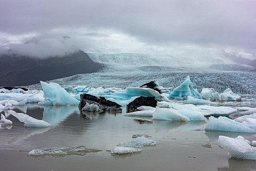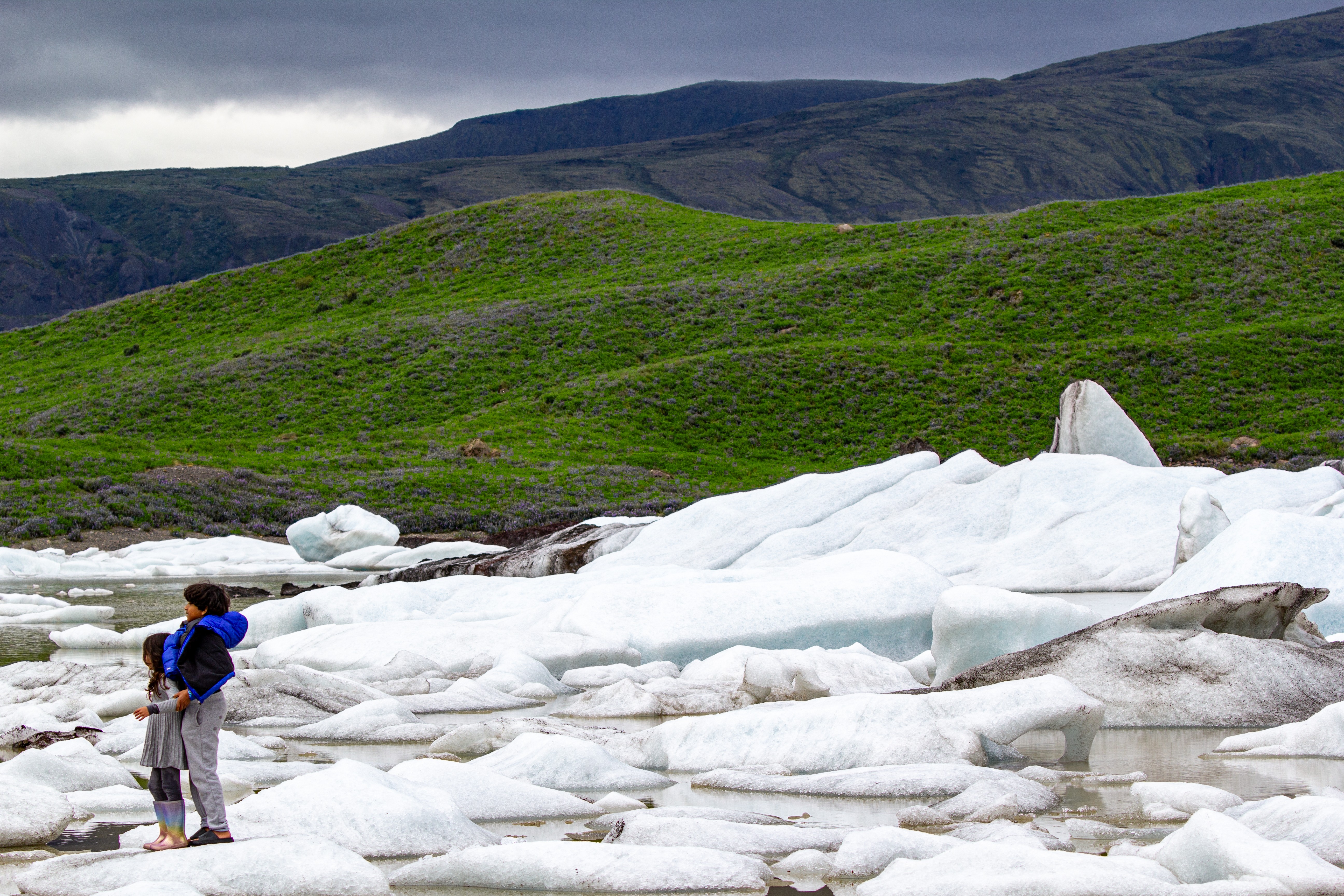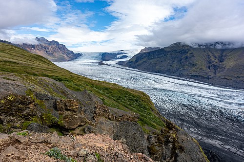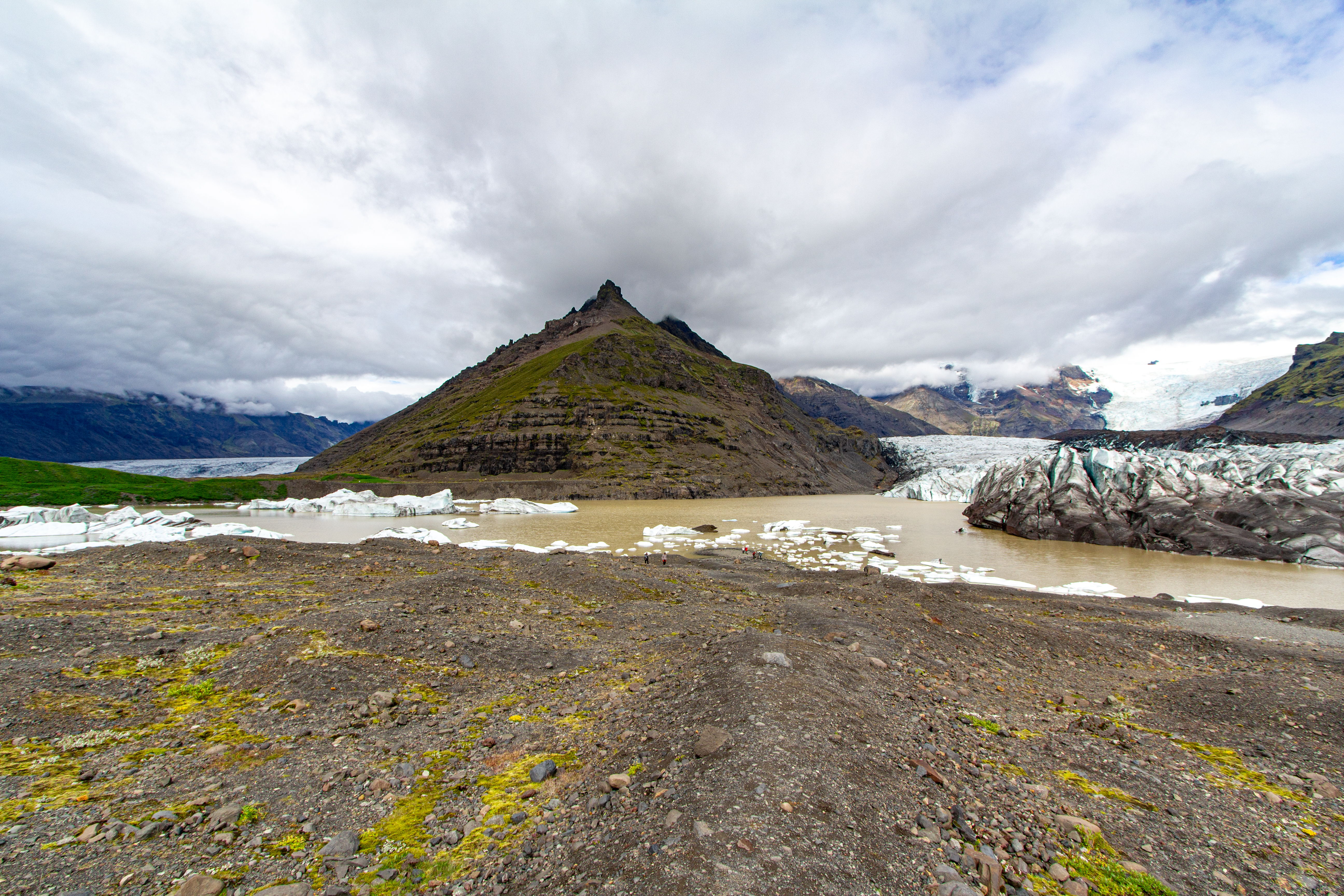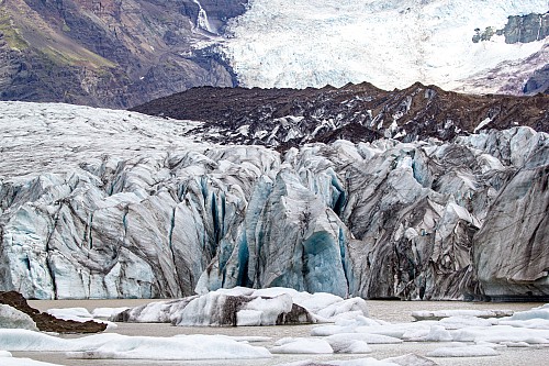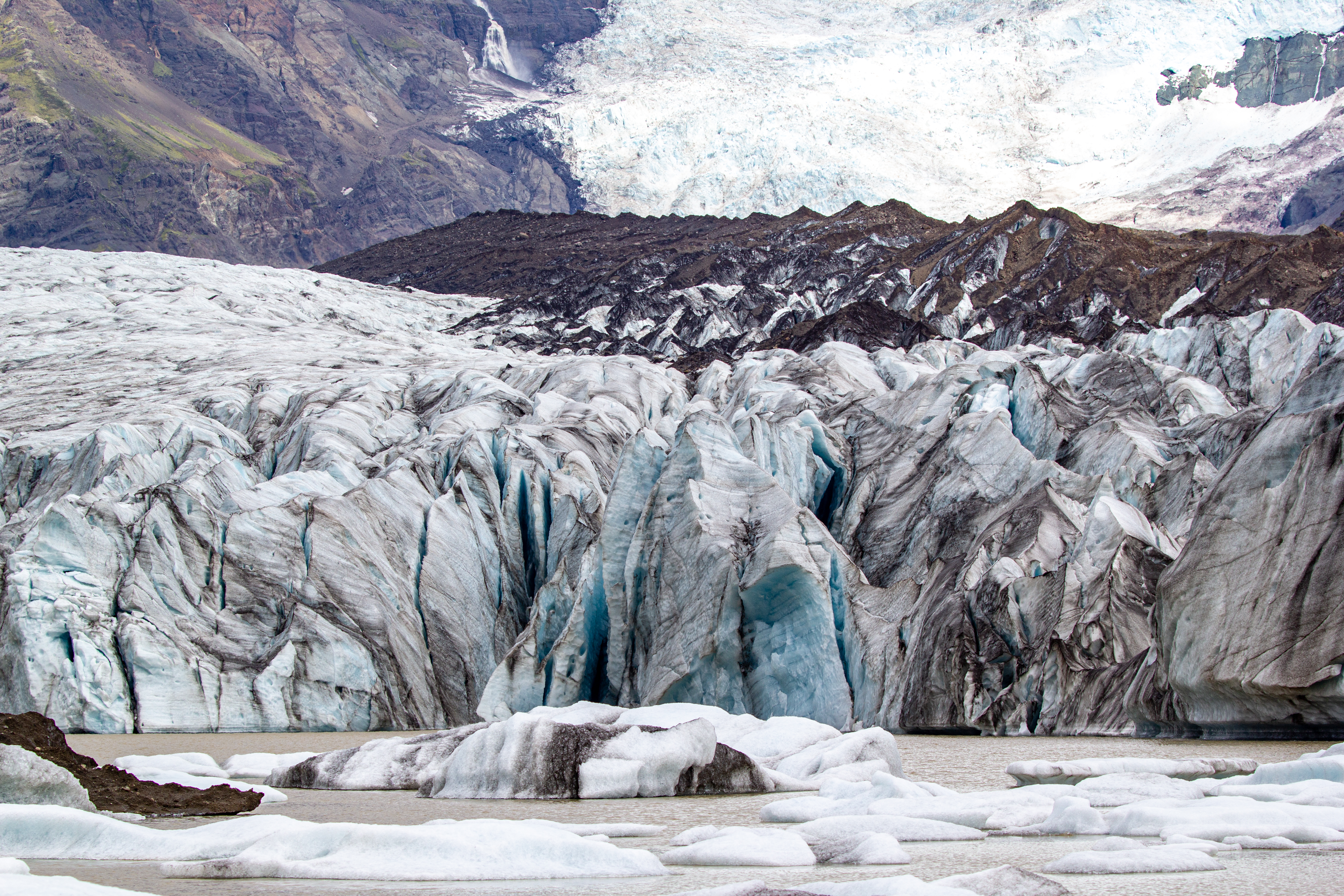 The sun was out for most of the walk from Svartifoss to the glacial lookout. The white on the glacier was super bright in the afternoon sun. We had sweeping views of the whole south and southeast coast, with glaciers all around. When we approached the lookout, there was a big reveal - a lake at the bottom of the glacier full of icebergs. Perhaps this was the reason for the counterclockwise route - to allow for the big surprise reveal. Some of this ice was black as well - presumably from ash from E16 (but maybe not).