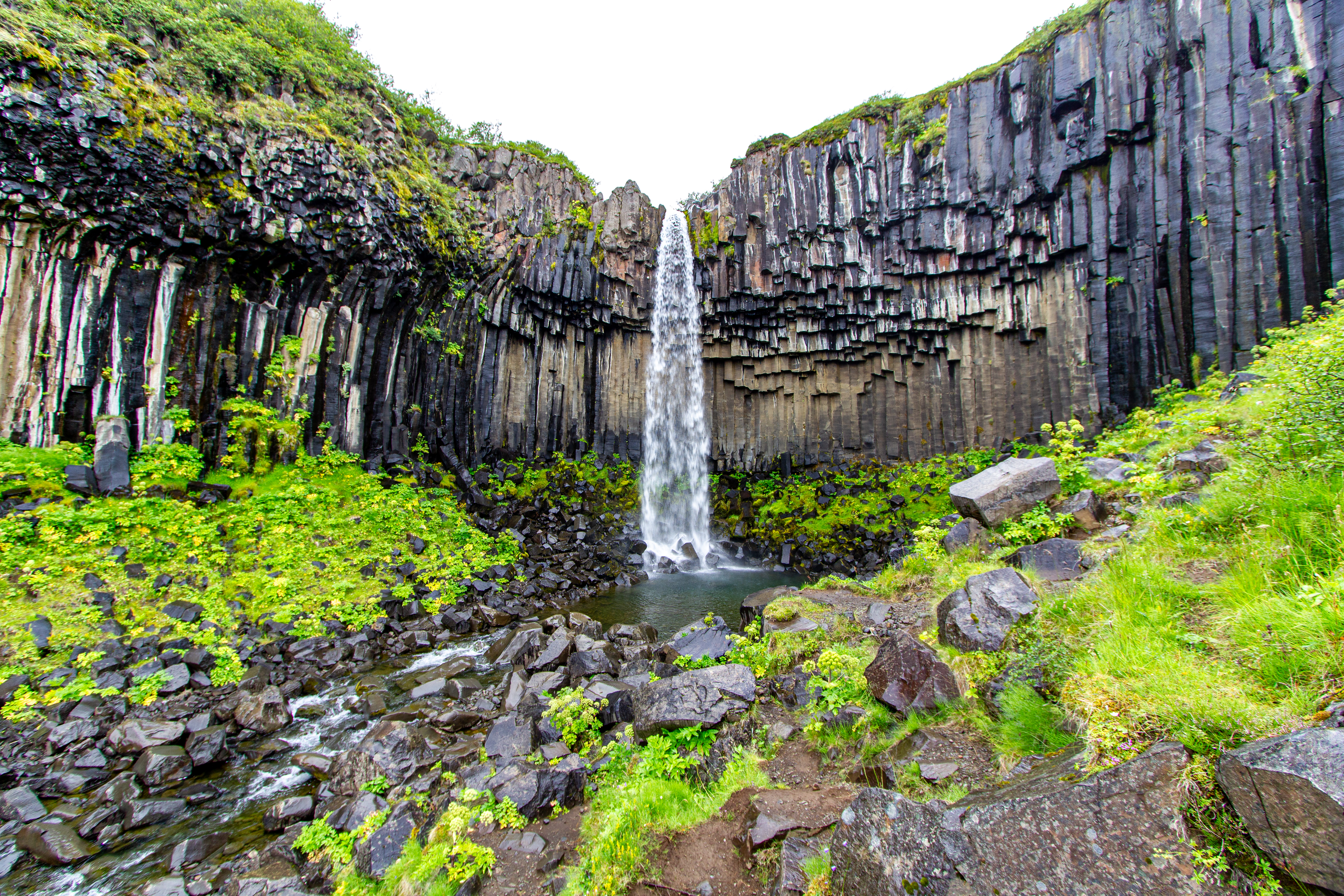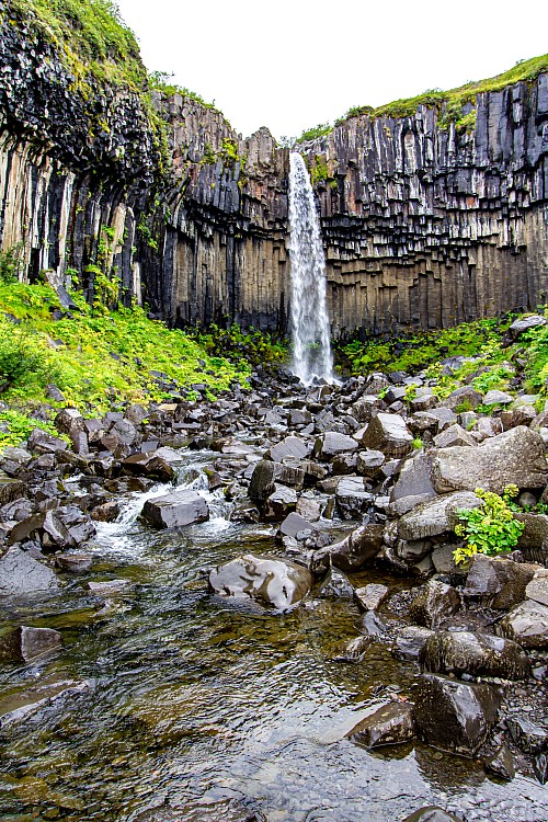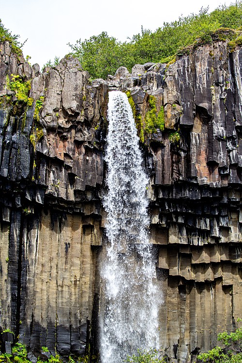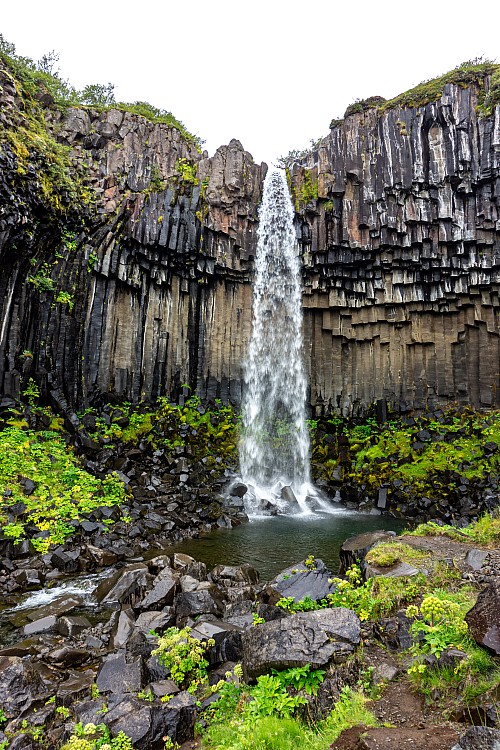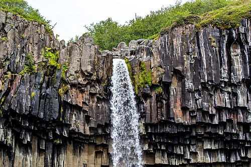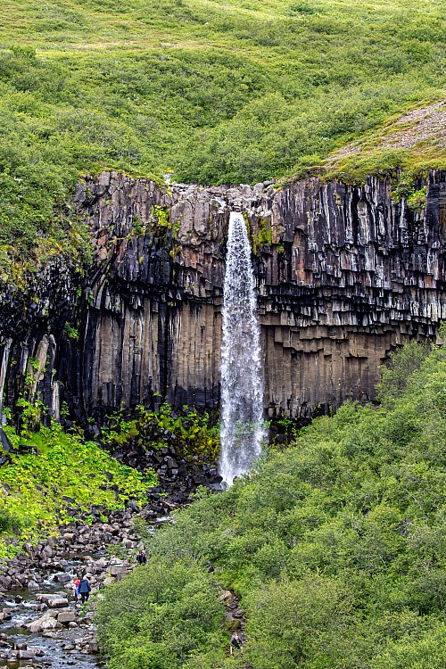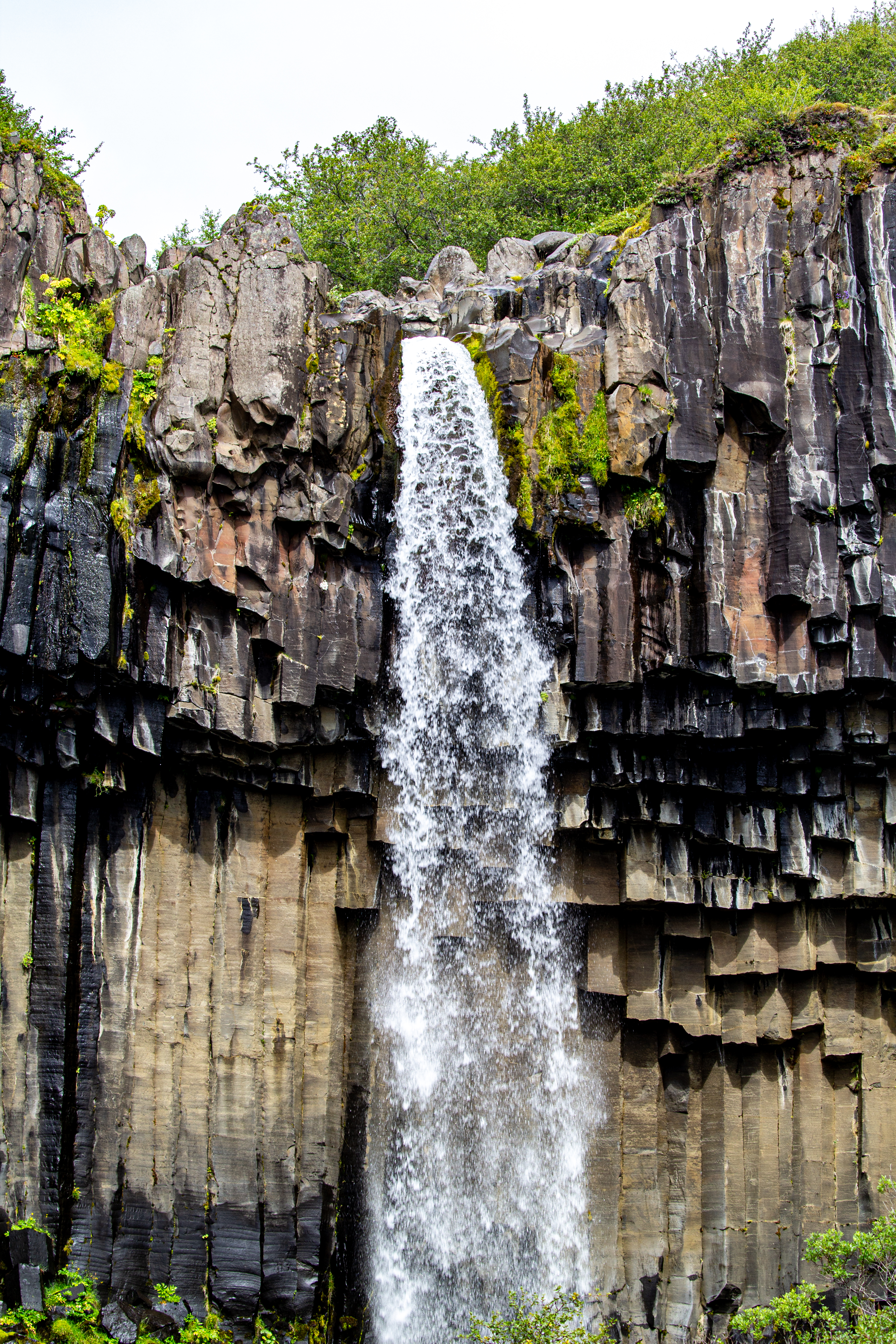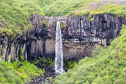 There was a good view of Svartifoss from afar before walking down into a canyon to see it more up close and personal. Perhaps this sneak peak was the reason for going counterclockwise? Svartifoss is famous for the hexagonal basalt columns all around. Apparently the shape is hexagonal because when basalt cools from a molten state, the cooling process creates stress, and the most efficient way to relieve the stress is by fracturing into hexagonal shapes. As the lava cools, cracks propagate downwards, meaning the hexagons from the surface become hexagonal columns.