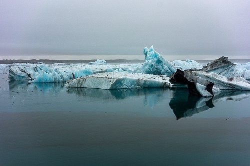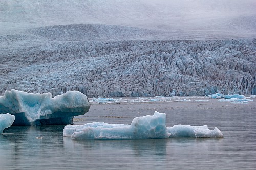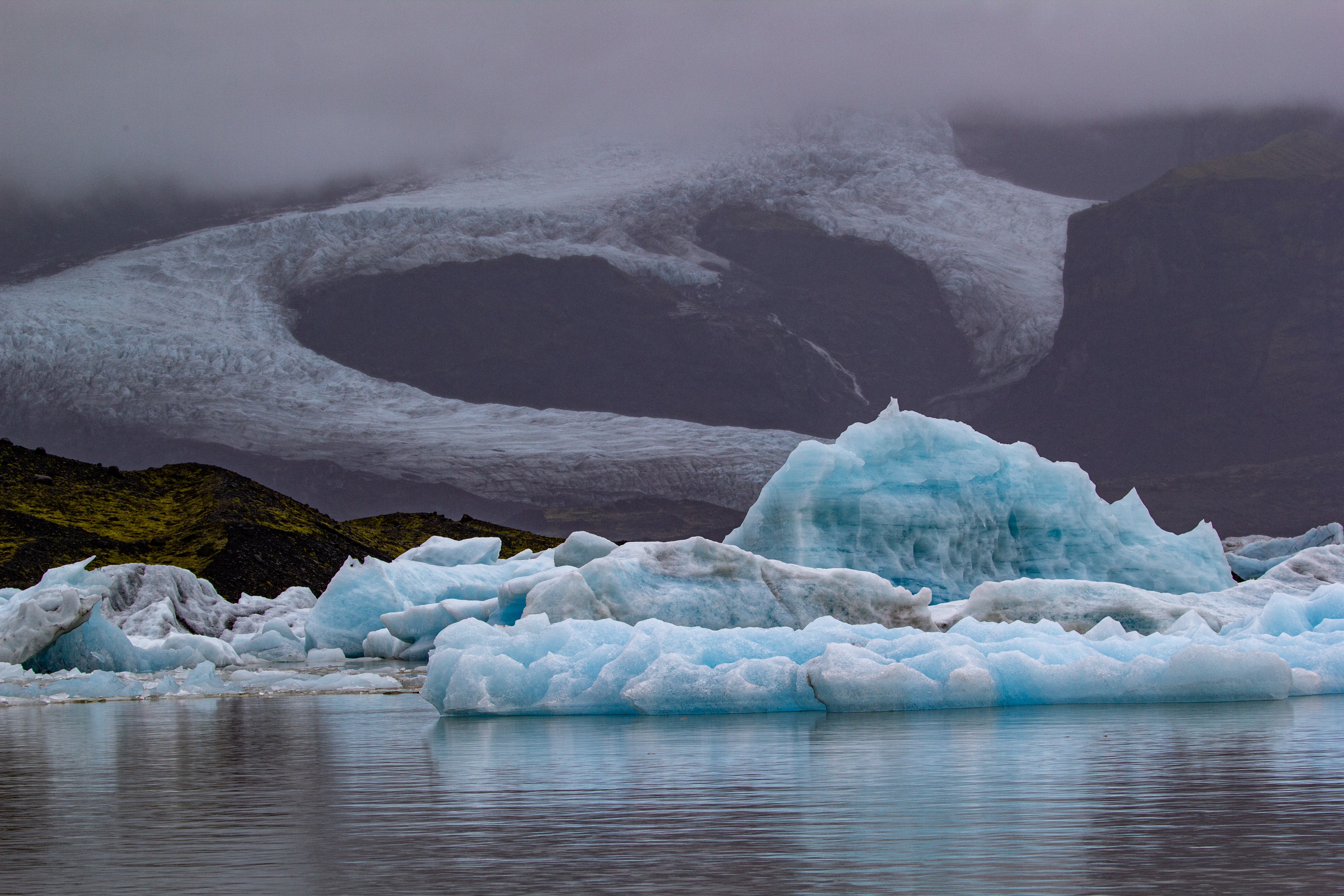 From there we continued heading east, driving out of the “sun” (at least relatively speaking) into a dark and dreary misty land. We drove past Mulagljufur Canyon, which we were going to hike if we’d had inclement weather at Fjaðrárgljúfur this morning. Whenever we come back, we’d like to do this hike, as it looks pretty similar, and arguably better, but a little more demanding. We stopped at Fjallsárlón. This was another iceberg lagoon, and supposedly a smaller version of what we were going to see at the next stop. If this was the small version, we wondered what the big one would look like. The ice seemed more blue than at the prior stop, but perhaps that could’ve been because there was less light out. We didn’t spend a ton of time, not only because of the cruddy weather, but also because we couldn’t be late to our Zodiac tour. We’d been keeping an eye on the clock all day, and we were doing fine, but we didn’t want to screw anything up at the last minute.