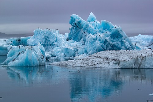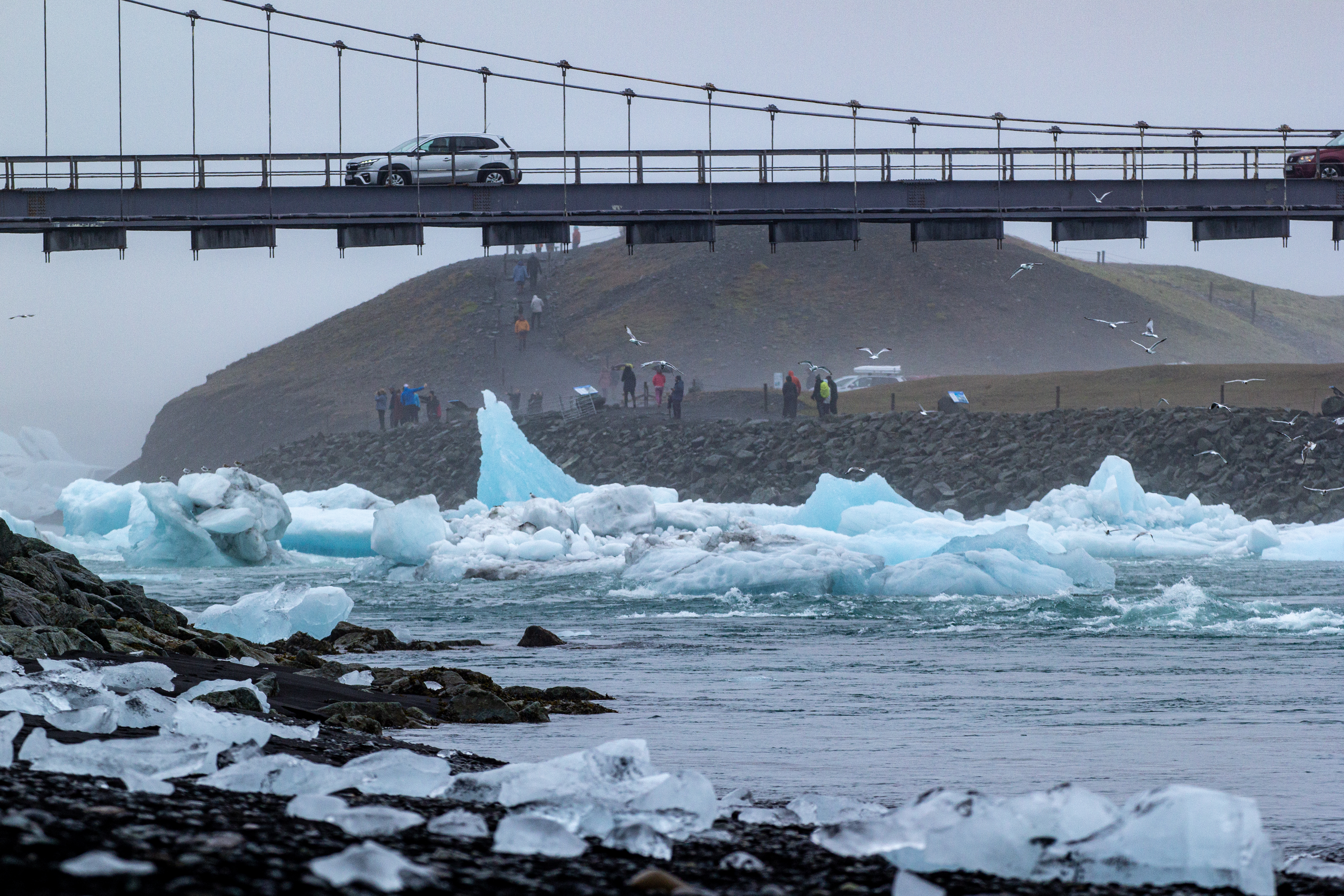 Fortunately it was just a short 10 minute drive east to Jökulsárlón. We crossed over the famous bridge where icebergs float below out a narrow channel to the ocean, and there was ice everywhere. We had about 30 minutes before our check-in, so we walked around a bit, and then Crystal went back in the car to get out of the cold misty weather. It was either a light rain or a heavy mist, and it was about 10 degrees. The lagoon was absolutely full of ice, and there were birds (seemingly nesting birds) on some of the larger icebergs.