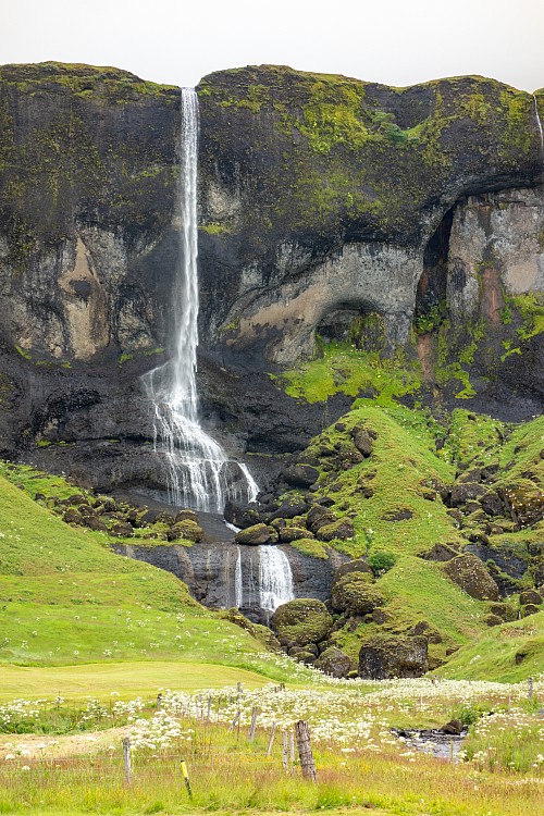 On the way out, Crystal got a photo of a sign for Heidi (not spelled exactly like that, it was with Icelandic letters). We continued east on the Ring Road and stopped briefly for a photo of Foss á Síðu, which wasn’t on our itinerary, but was a huge waterfall right off the road. Our next planned stop was a large green mesa that theoretically resembled Monument Valley, but it was green so it’s tough to compare. The viewpoint was east of the mesa, but we found a small turnoff on the west side, and took some photos from there. This was good because it started to rain just before we arrived at the official viewpoint (bad luck yet again), and so we took pictures from rolled down windows in the car.