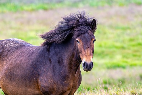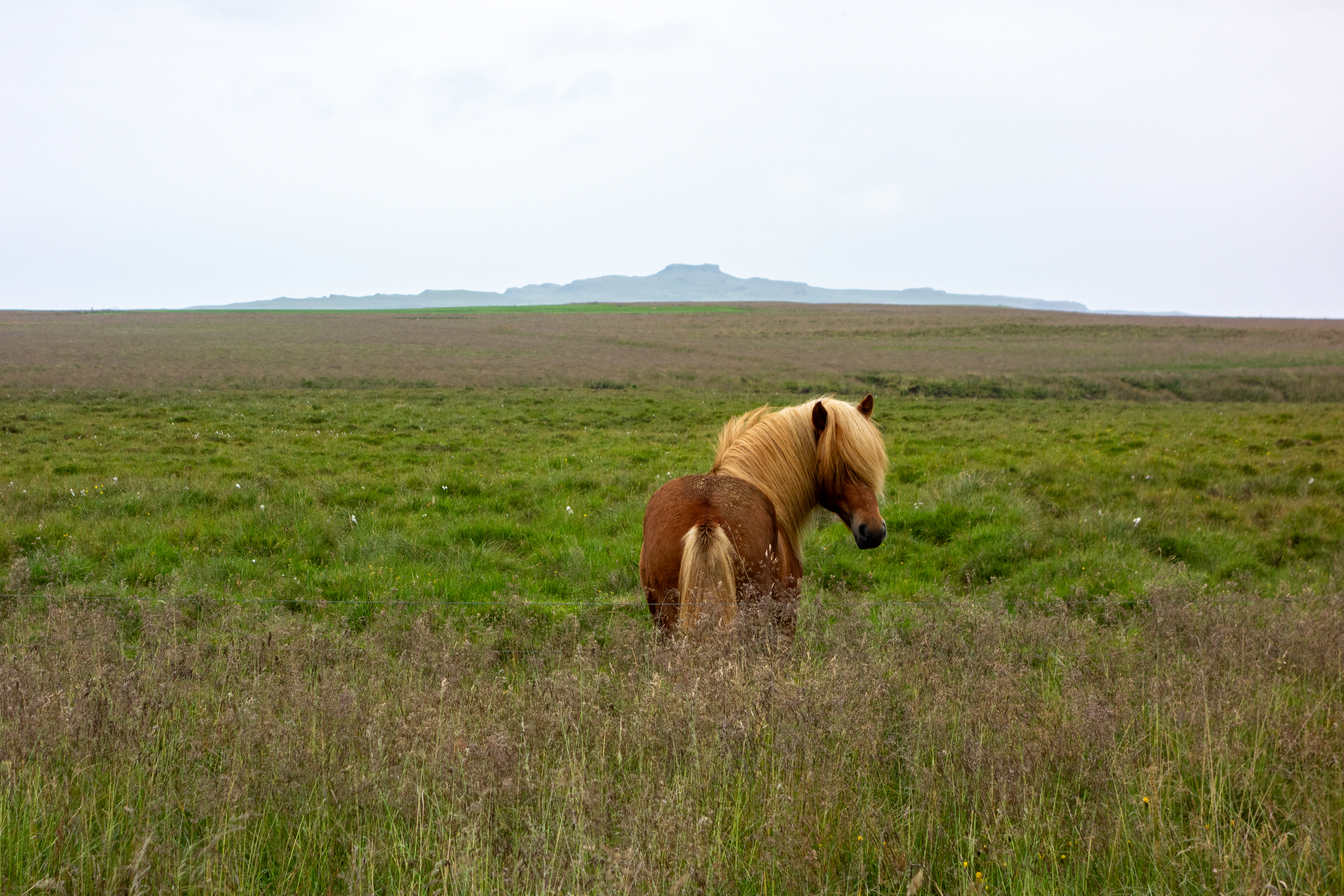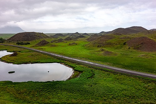 But, as we’d read, this was a natural fortress, not a building, so we managed our expectations accordingly. Essentially, it was a huge rock pile on top of a hill. Still, it was interesting to see something put together by vikings, and the views were good. At first, just two other people were there, but then a bus showed up right as we were leaving. We were a little surprised that a bus was driving around on the gravel roads. Rather than backtrack on Road 717 to the Ring Road, we went counter-clockwise around the small lake there, going north on Road 717 and then south on Road 711. This route was totally empty, as all we saw were several horses, including some young ones, quite close up. We’d seen hundreds of horses on this trip, but never in a place where we could easily stop and take their photos. The road we were on was empty and straight, so we could see no one was coming and it was possible to stop.