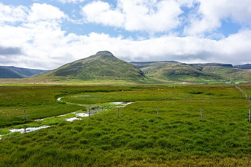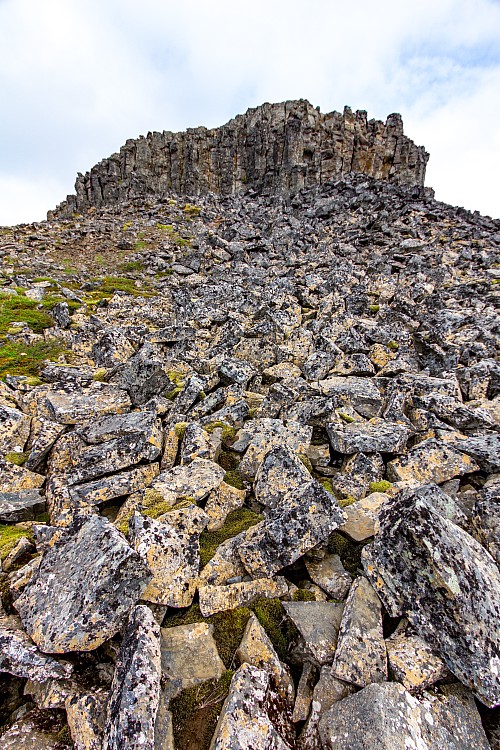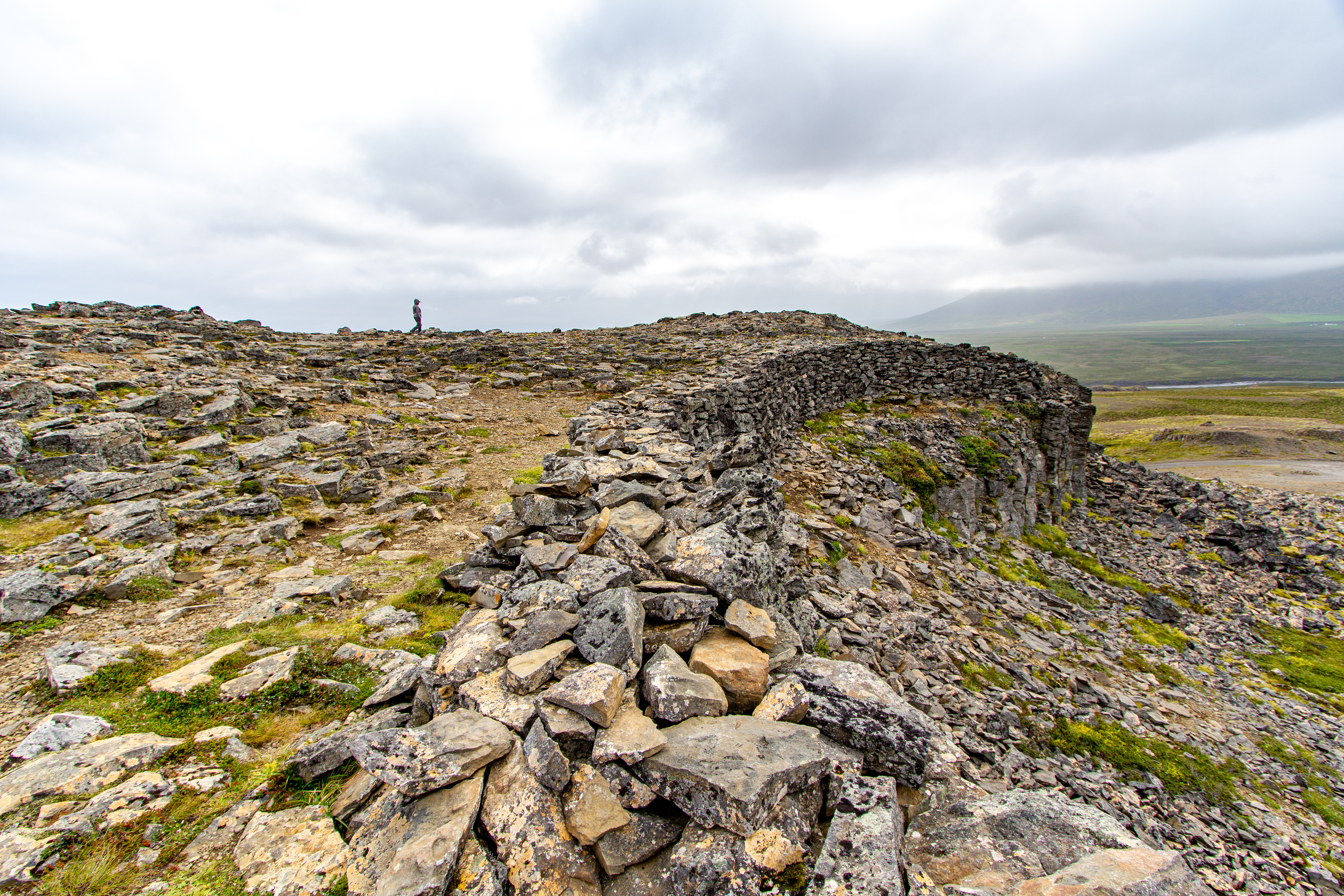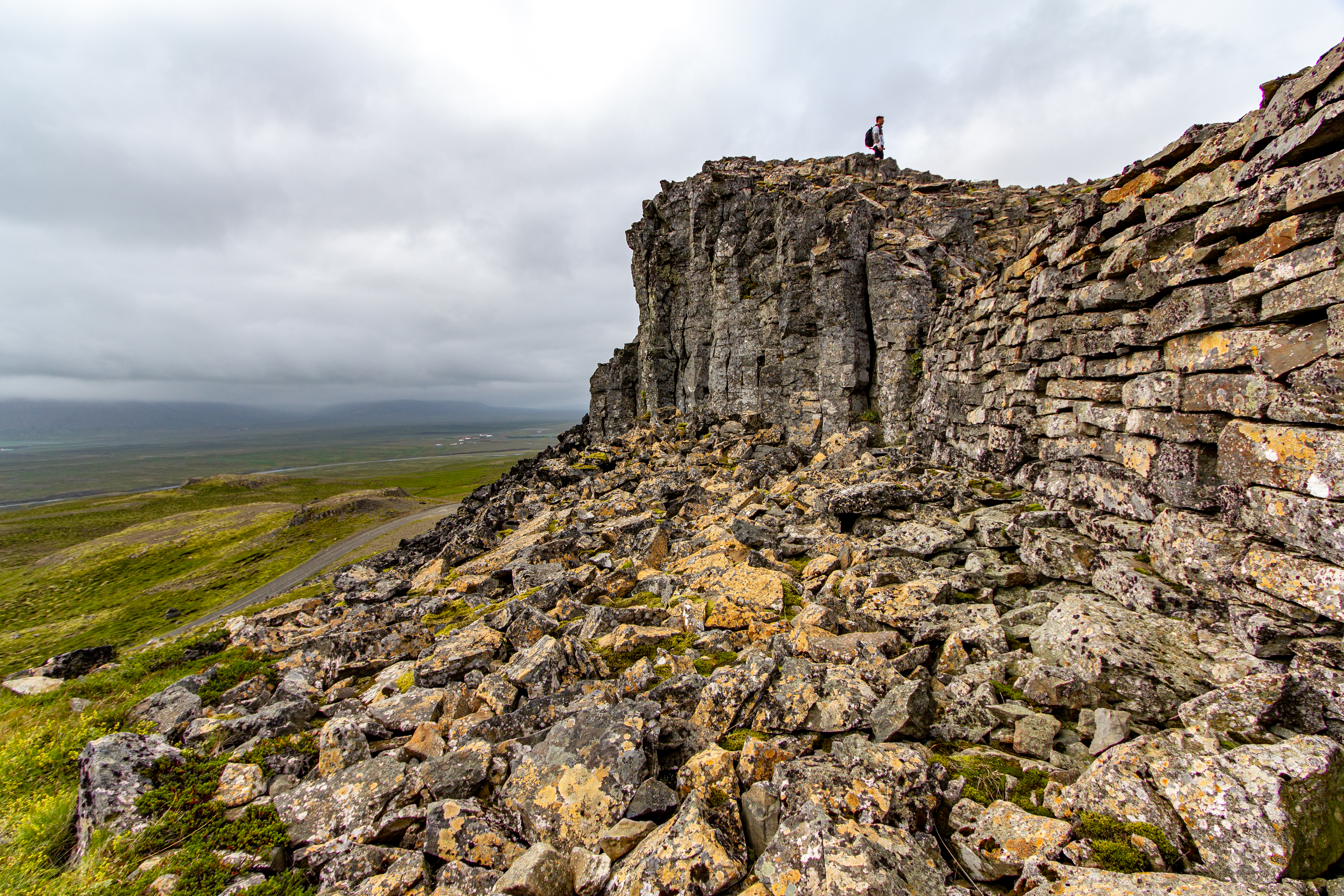 We left just before 08:30. Our first stop was just 20 minutes away, at the Vatnsdalshólar viewpoint. We were back on the Ring Road again, after being off it for all afternoon yesterday. There were low clouds again this morning (it seemed to be a pattern), but even with that, it was easy to tell that this was a picturesque spot. There was just one other couple there, walking up the stairs as we were walking down. We hopped back in the car for 30 minutes, getting off the Ring Road yet again, onto a gravel road again, to visit Borgarvirki, which was labeled as a “Viking fortress.”