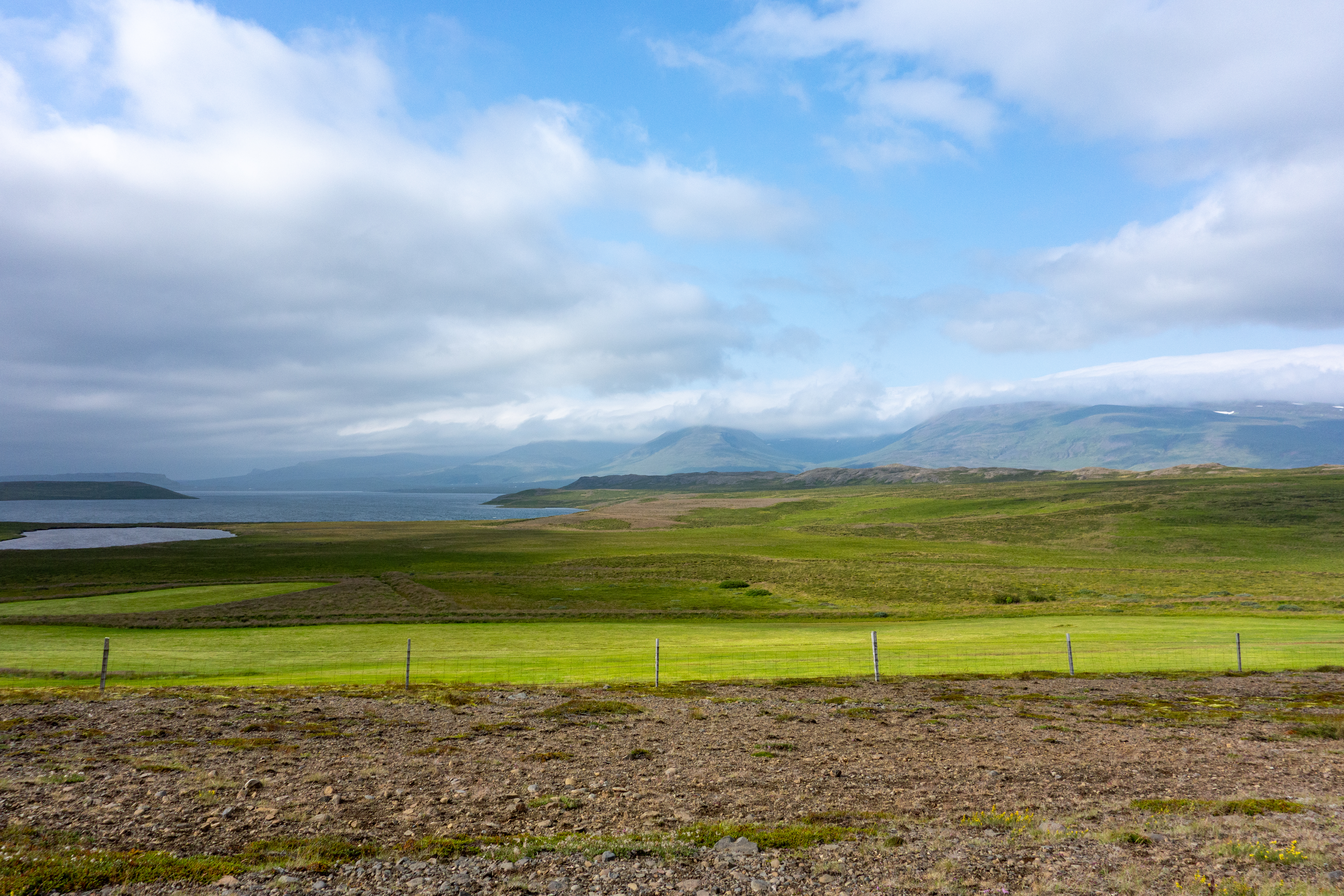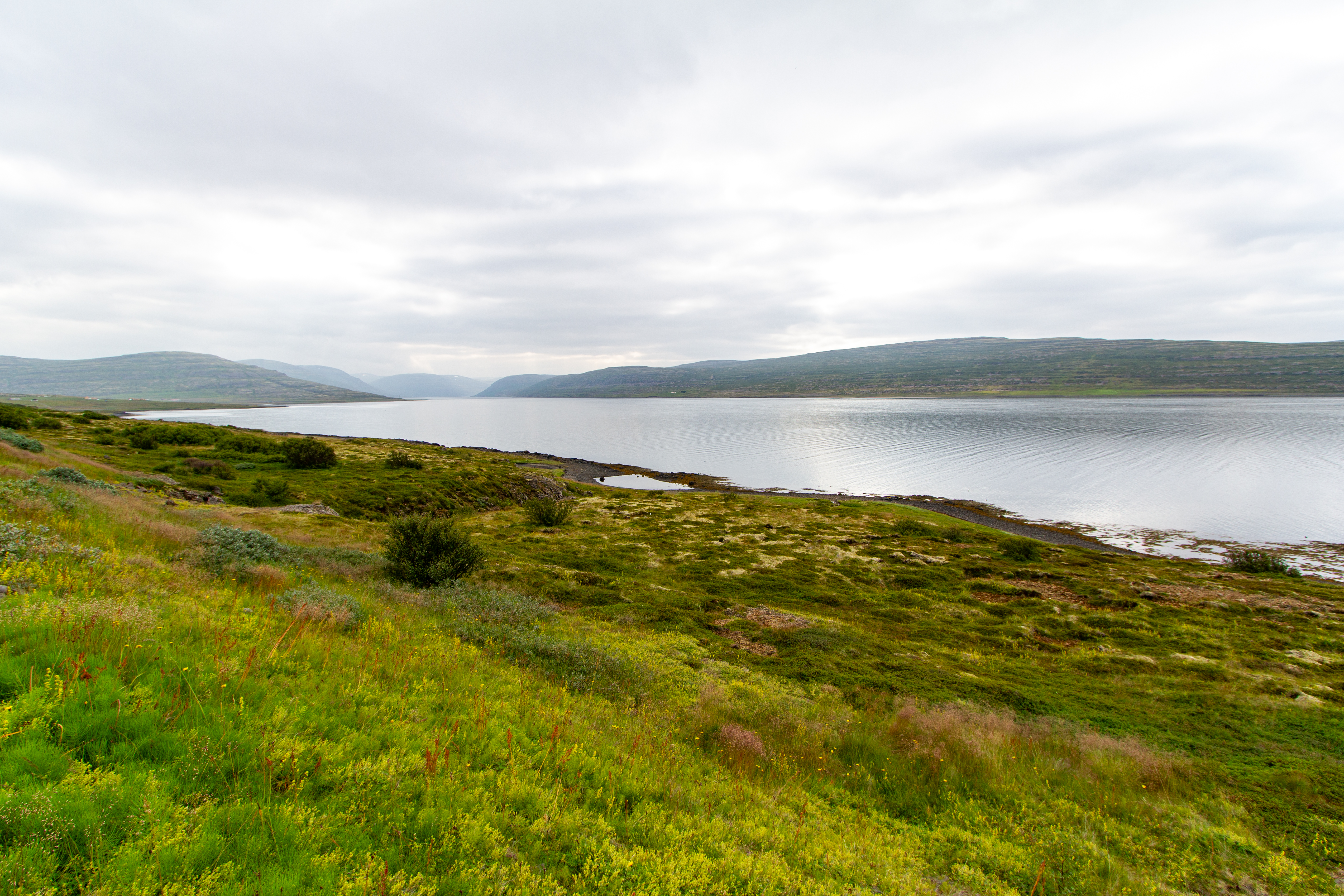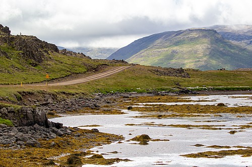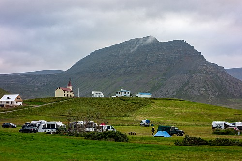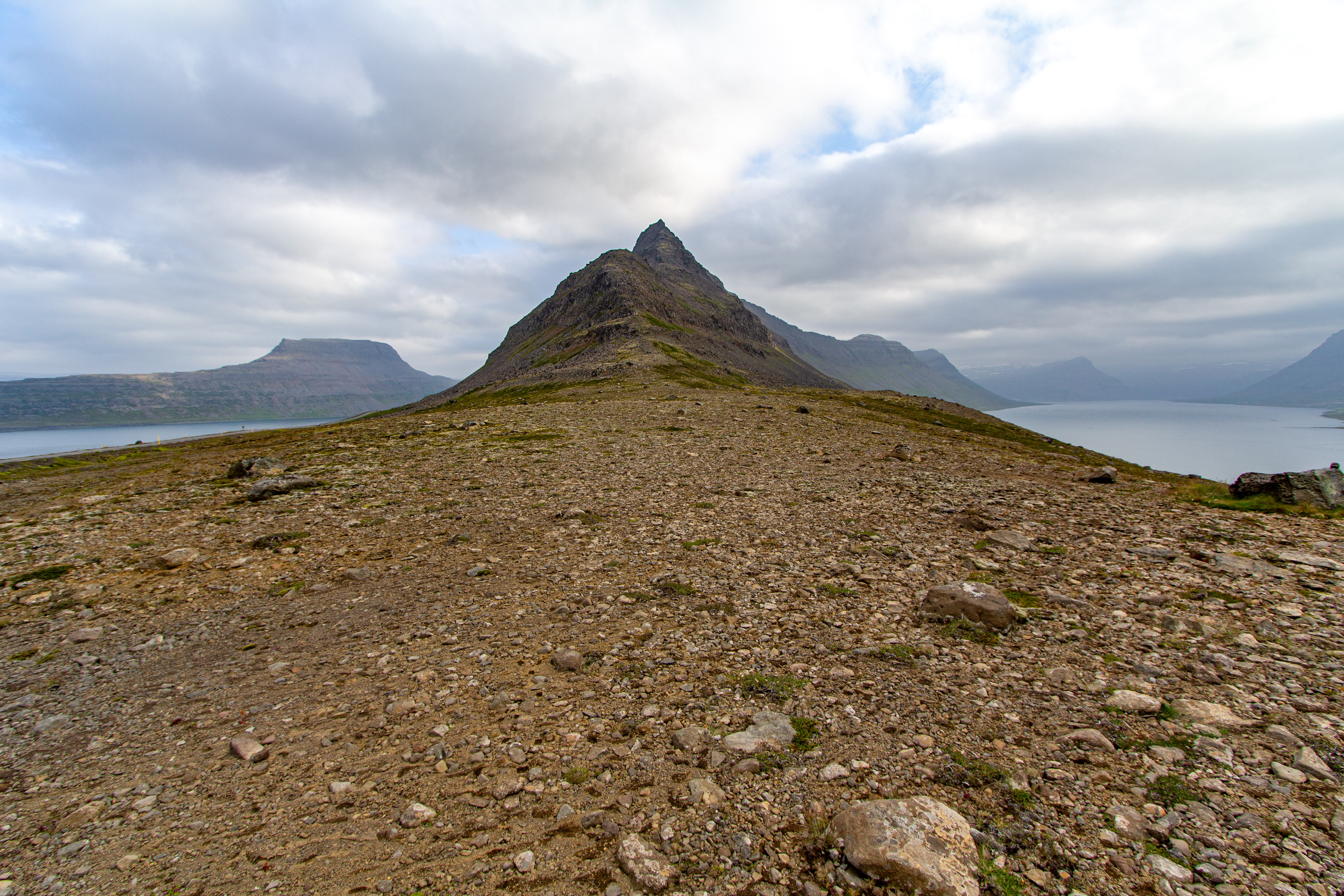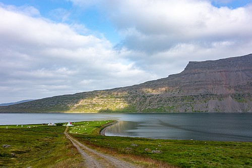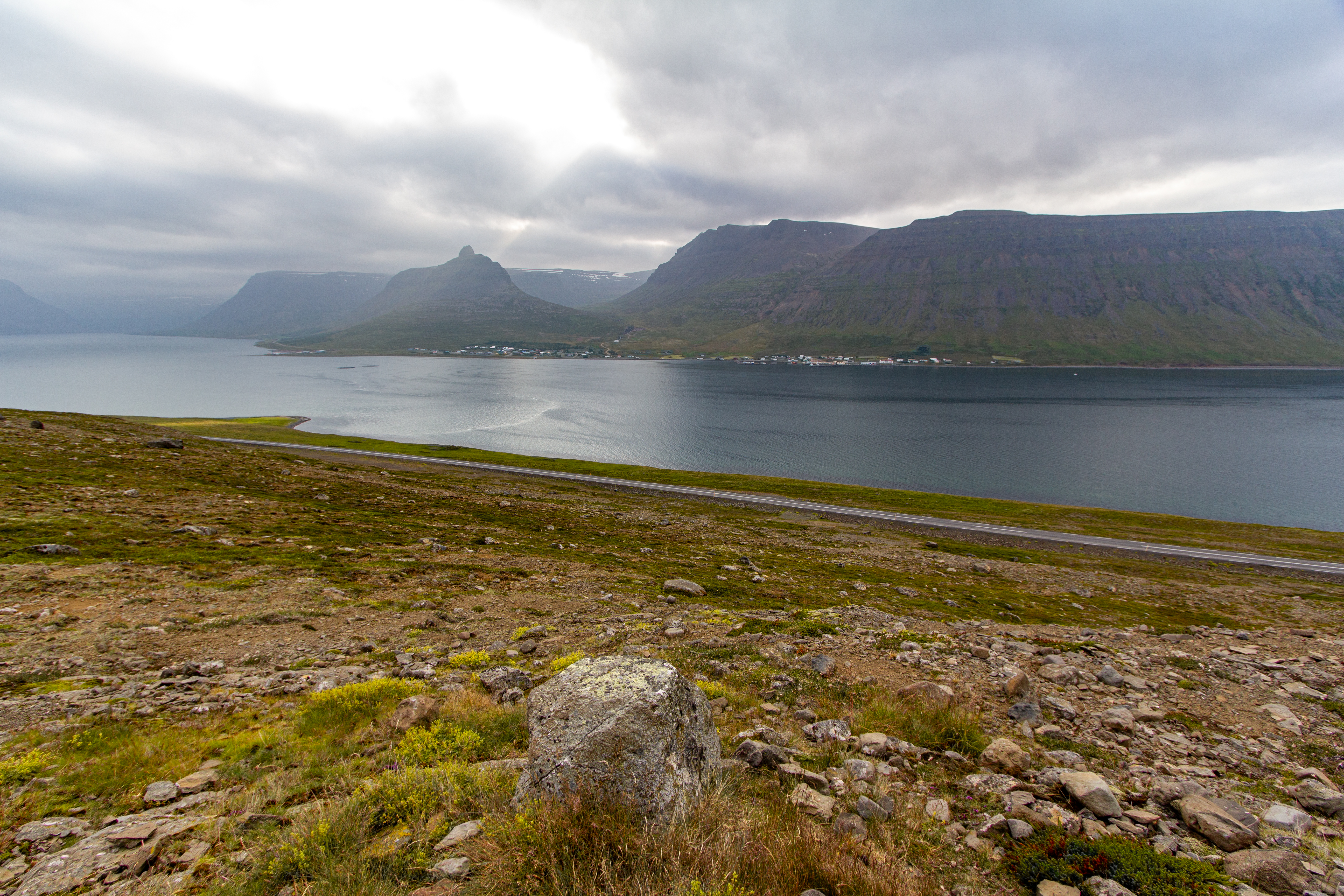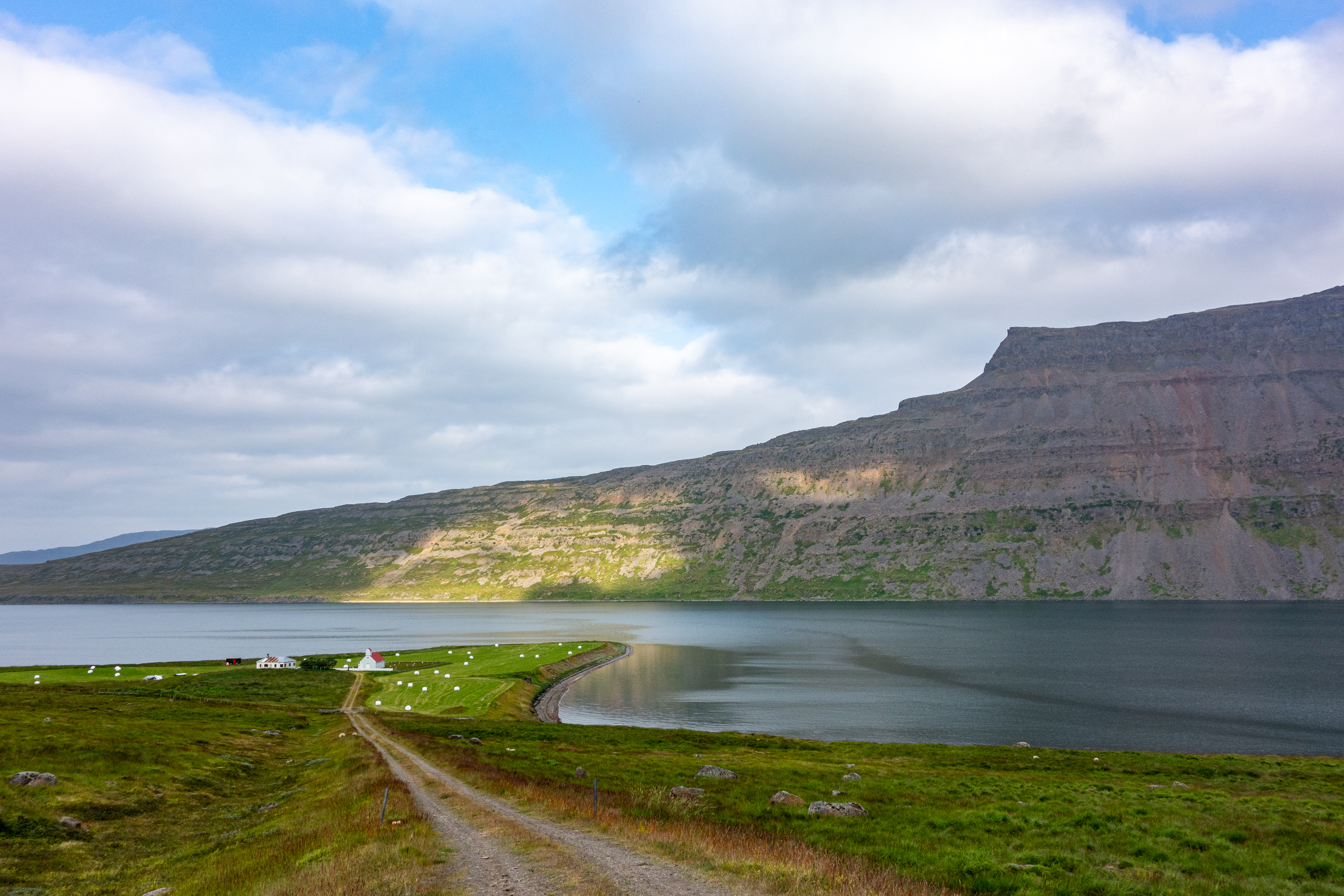There was a mix of sun and clouds, but mostly clouds, as we continued on our way. We stopped briefly when we saw Eyrarkirkja in Kolbeinseyri. We also made a quick stop just north of Kolbeinseyri, rounding the northern tip of the peninsula, with one fjord, Seyðisfjörður, on the left (east) and another fjord, Álftafjörður, on the right (west). From the same spot we could also see Súðavík, where we had in our itinerary a stop at the Arctic Fox Center. Given that it was almost 19:00, we just assumed it would be closed, and we didn’t stop.