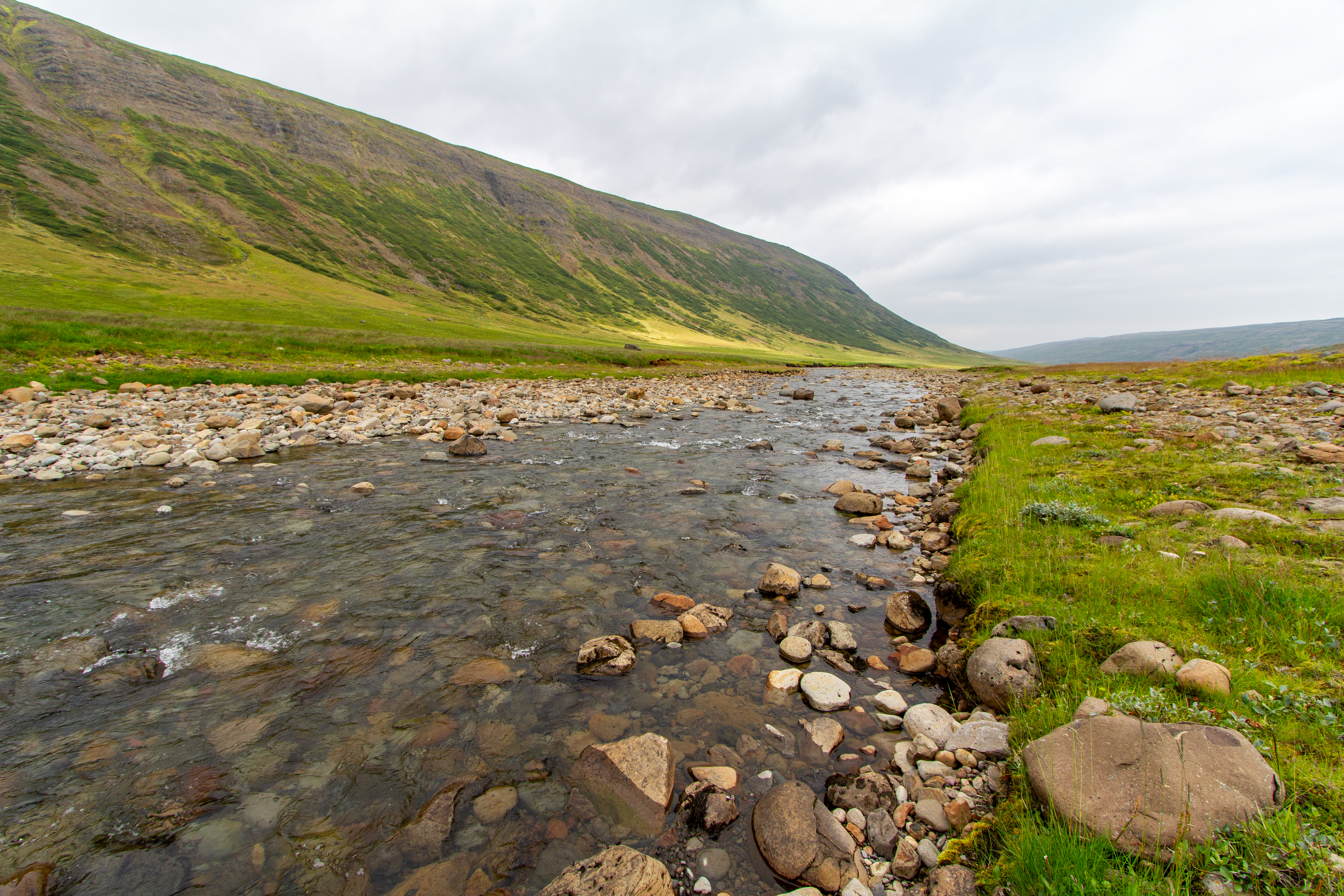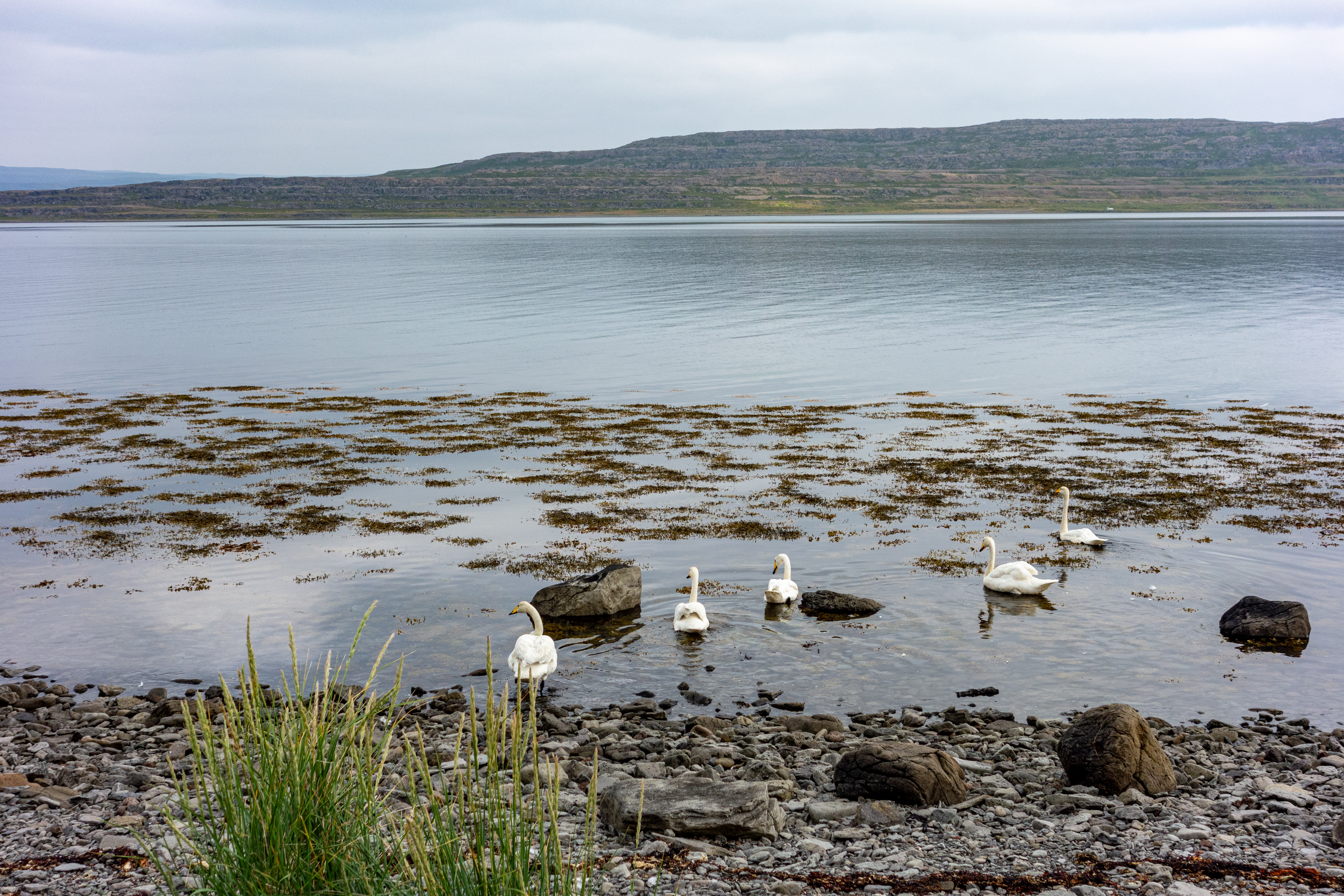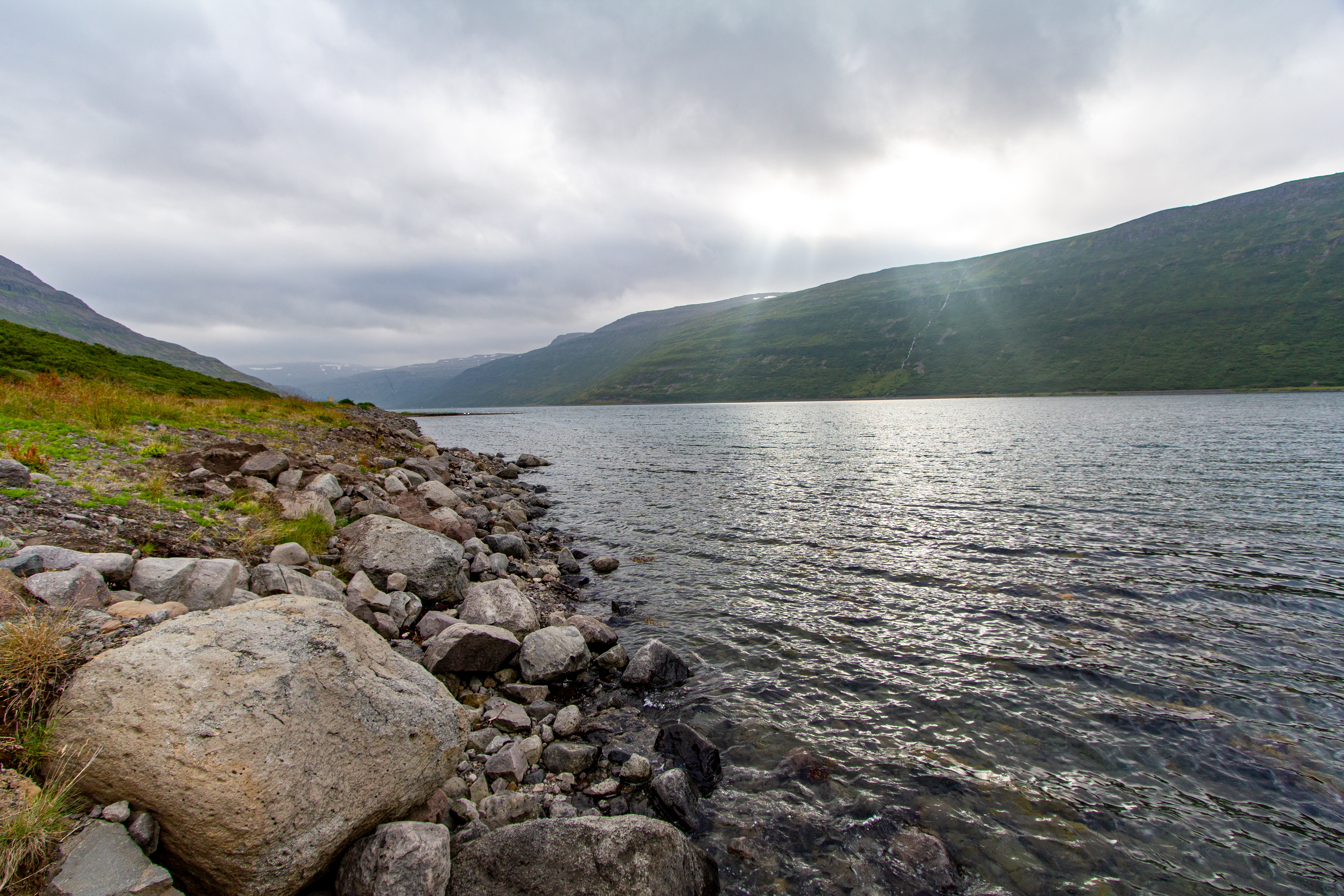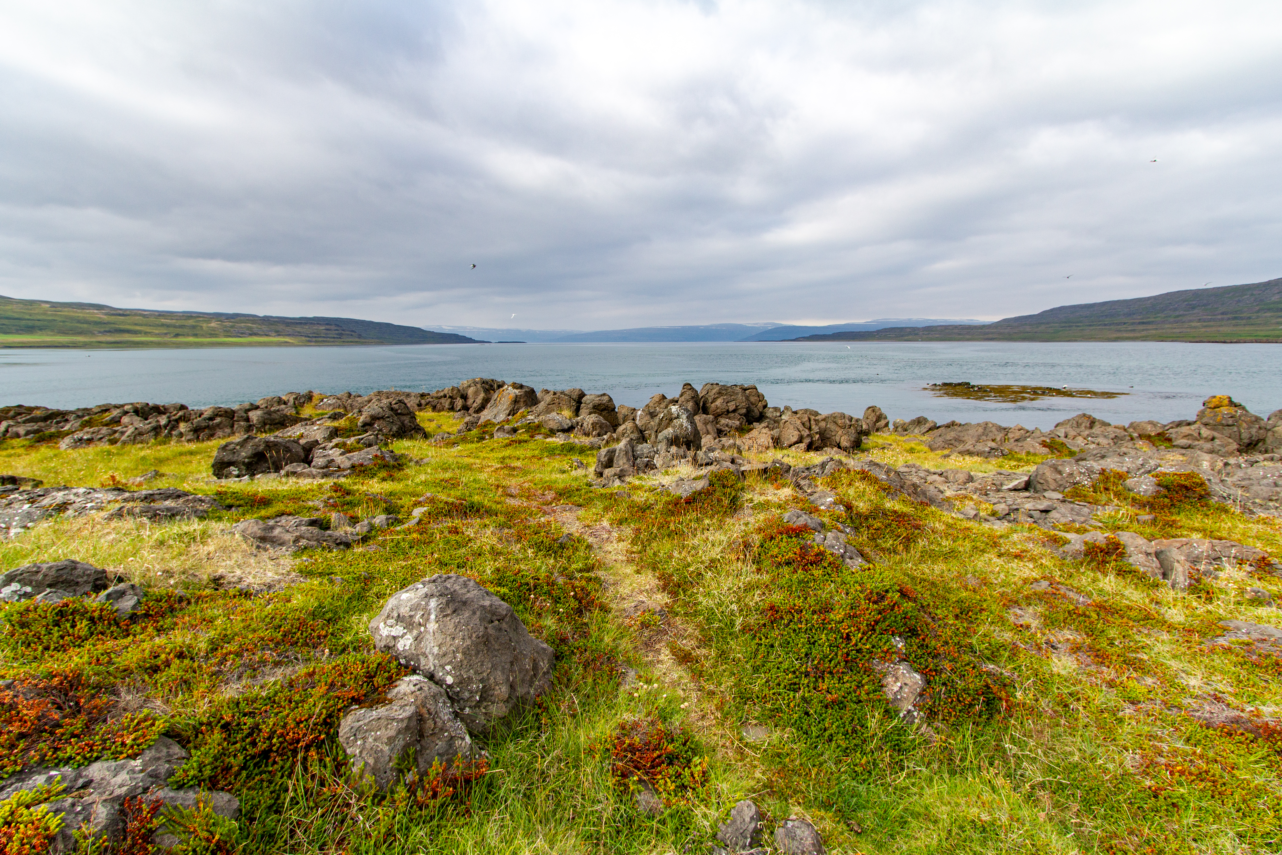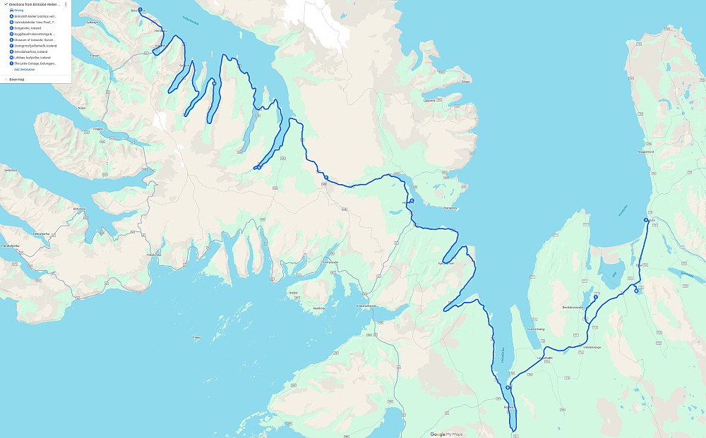 There was a mix of sun and clouds, but mostly clouds, as we continued on our way. We stopped briefly when we saw Eyrarkirkja in Kolbeinseyri. We also made a quick stop just north of Kolbeinseyri, rounding the northern tip of the peninsula, with one fjord, Seyðisfjörður, on the left (east) and another fjord, Álftafjörður, on the right (west). From the same spot we could also see Súðavík, where we had in our itinerary a stop at the Arctic Fox Center. Given that it was almost 19:00, we just assumed it would be closed, and we didn’t stop.