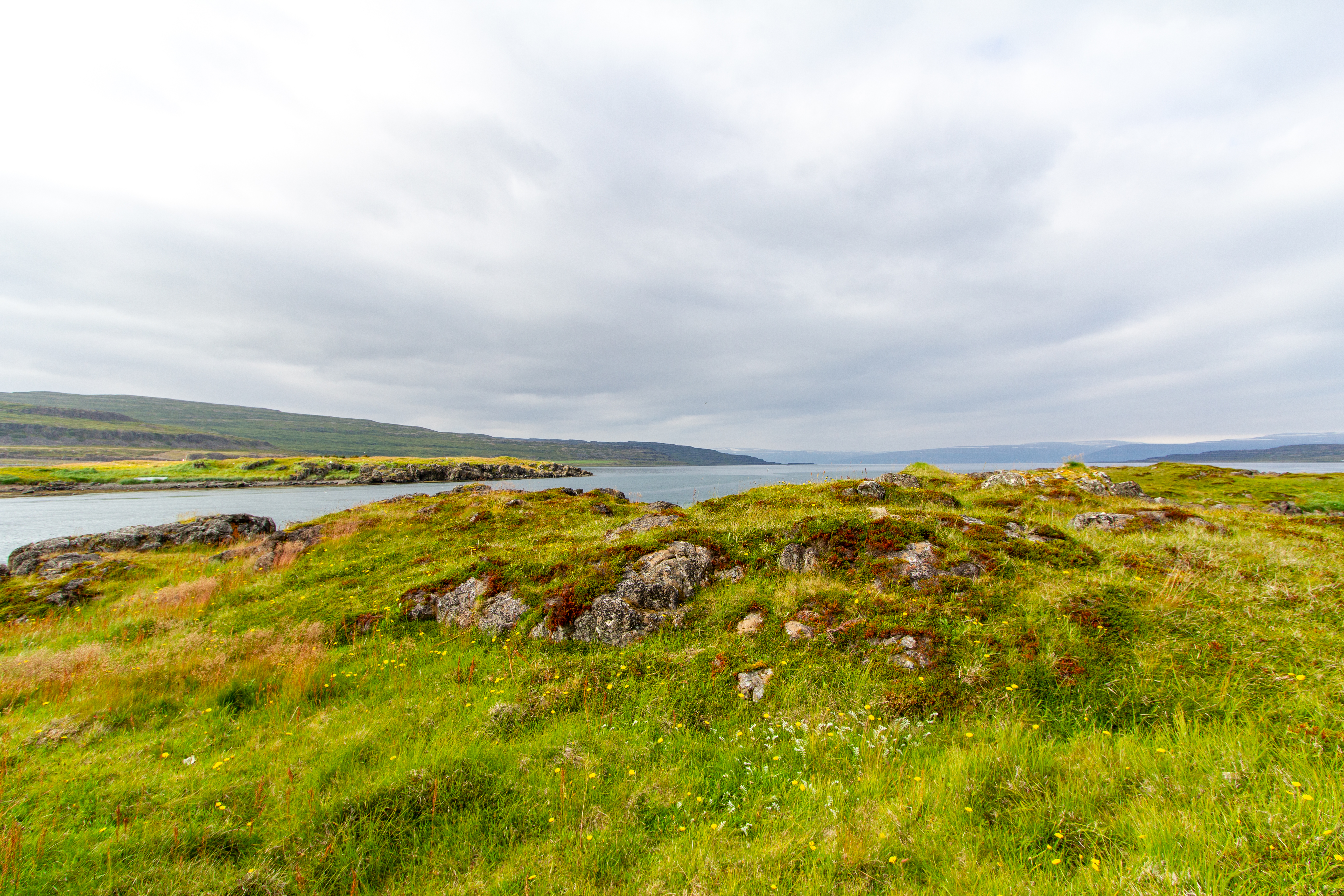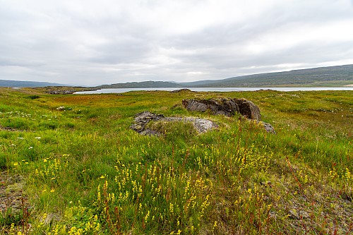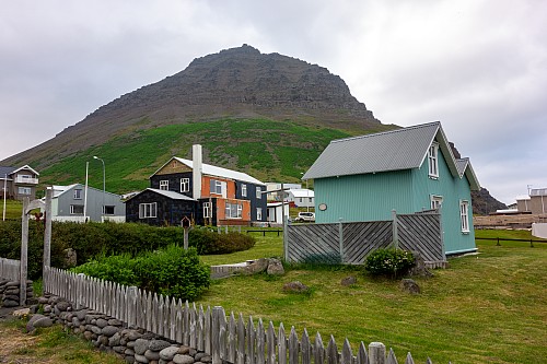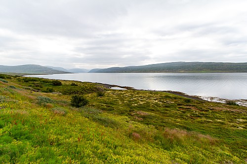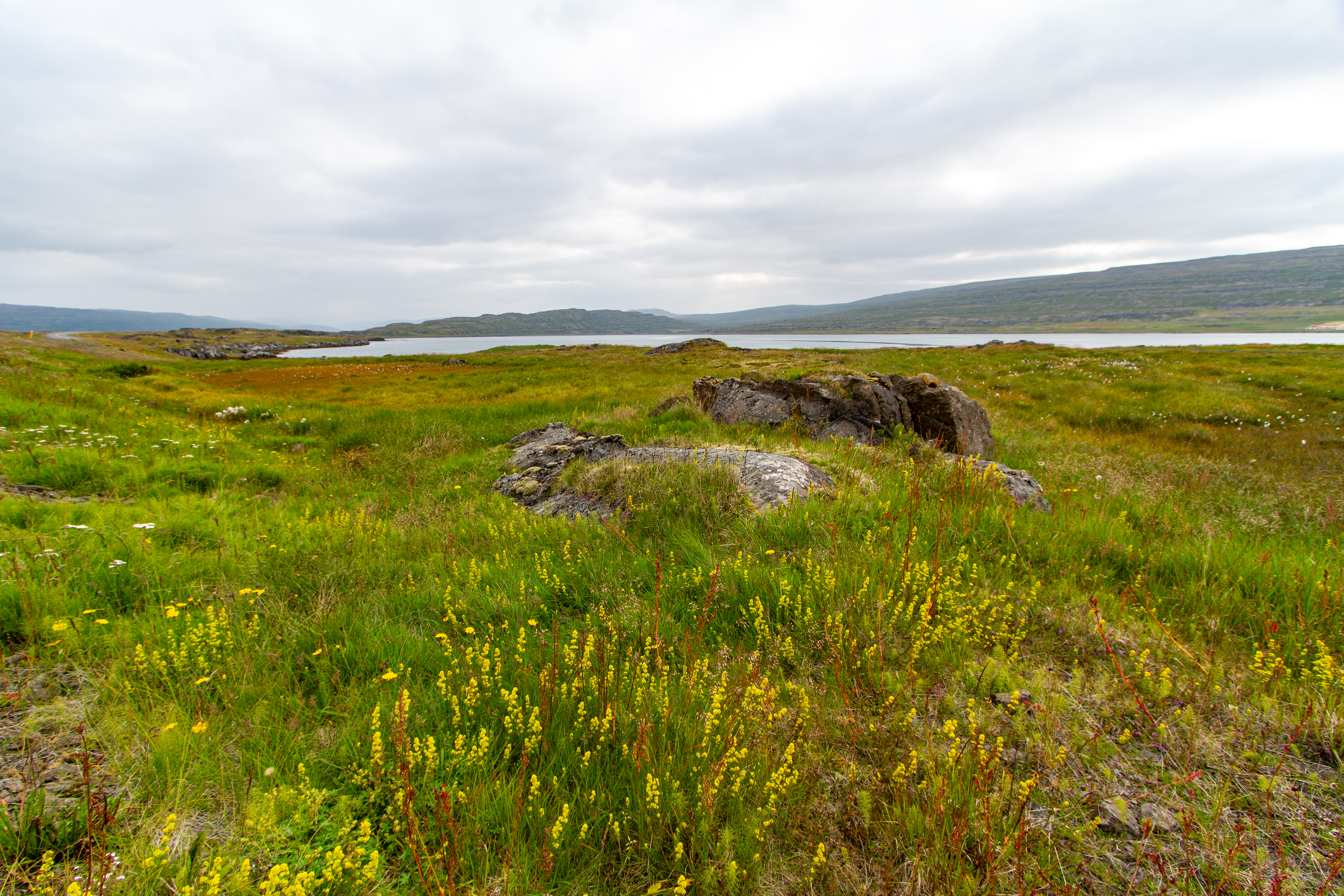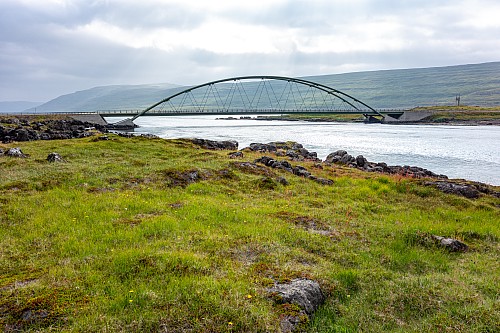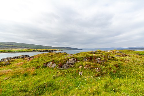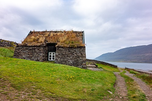 We were back in the fjords now, zig-zagging in and out of the inlets and peninsulas. One fjord, Mjóifjörður, actually had a bridge, so we went across that to save some time. But before we crossed it we got out of the car and walked around a visitor area for a few minutes. There were quite a few wildflowers, and great views of the fjords and the bridge itself. Our next stop was Litlibær, which we called Little Bear. It was a historic old building that was now a café, but it had closed just minutes before we got there. So we just viewed it from the outside for a bit, then got back on the road.