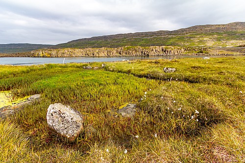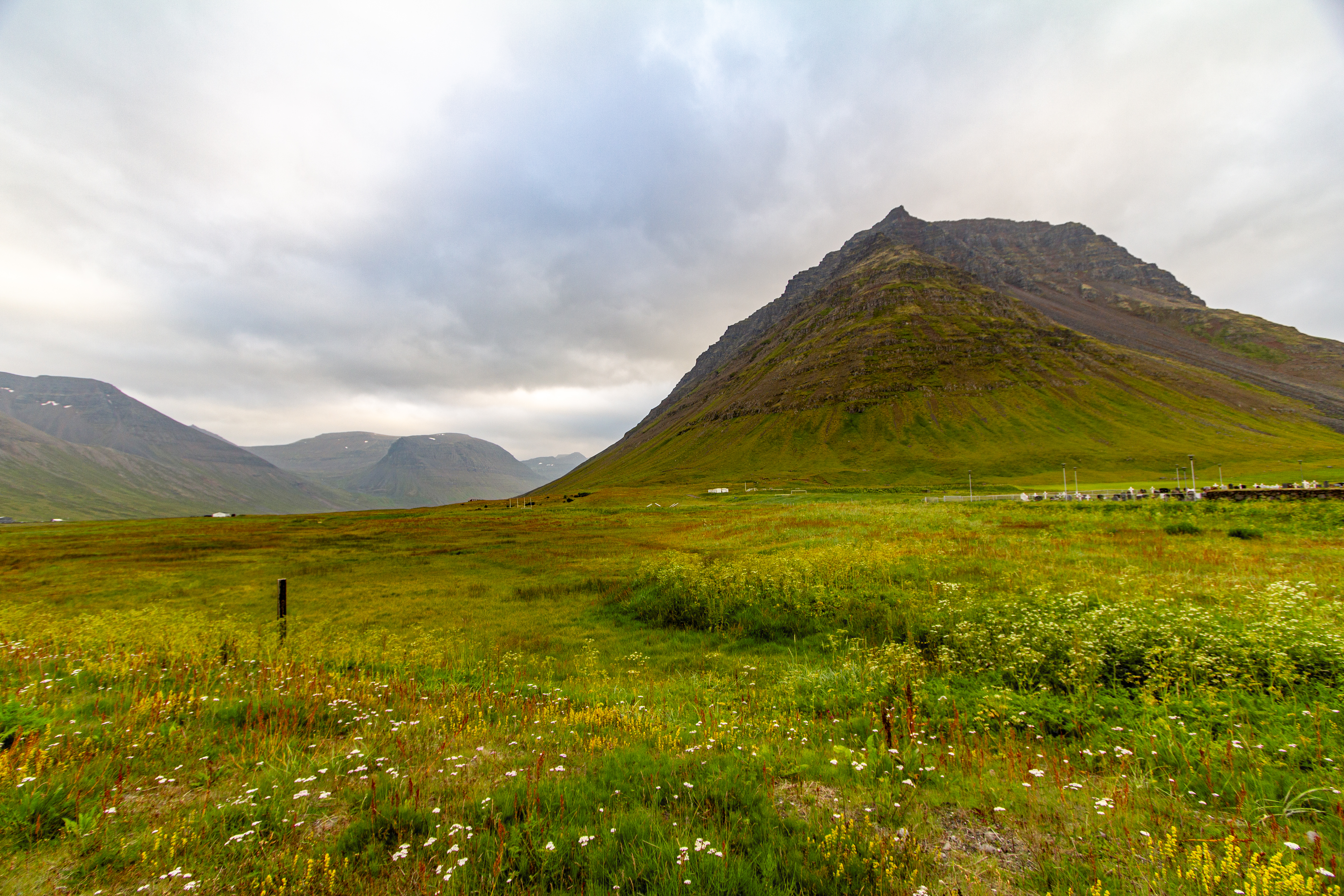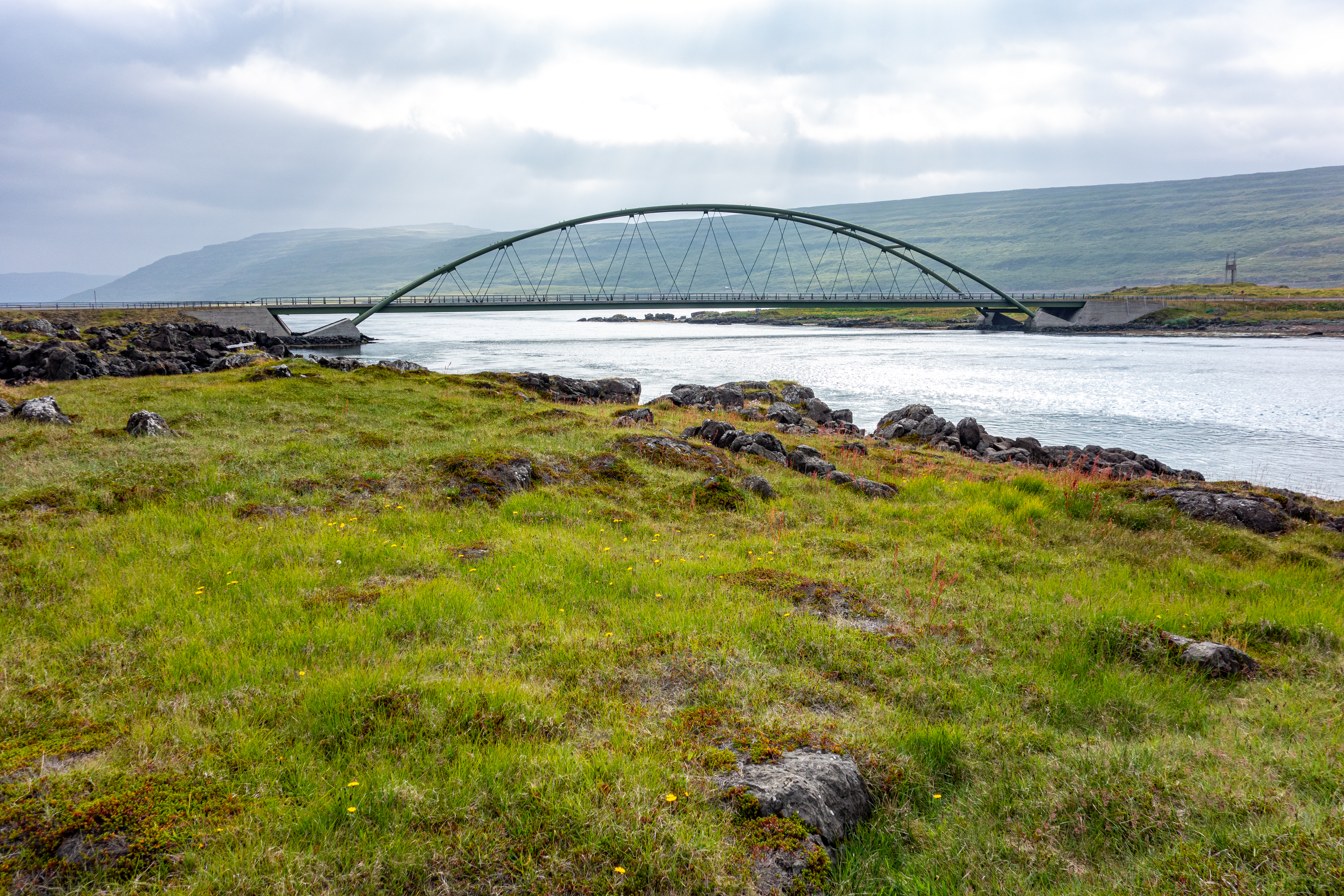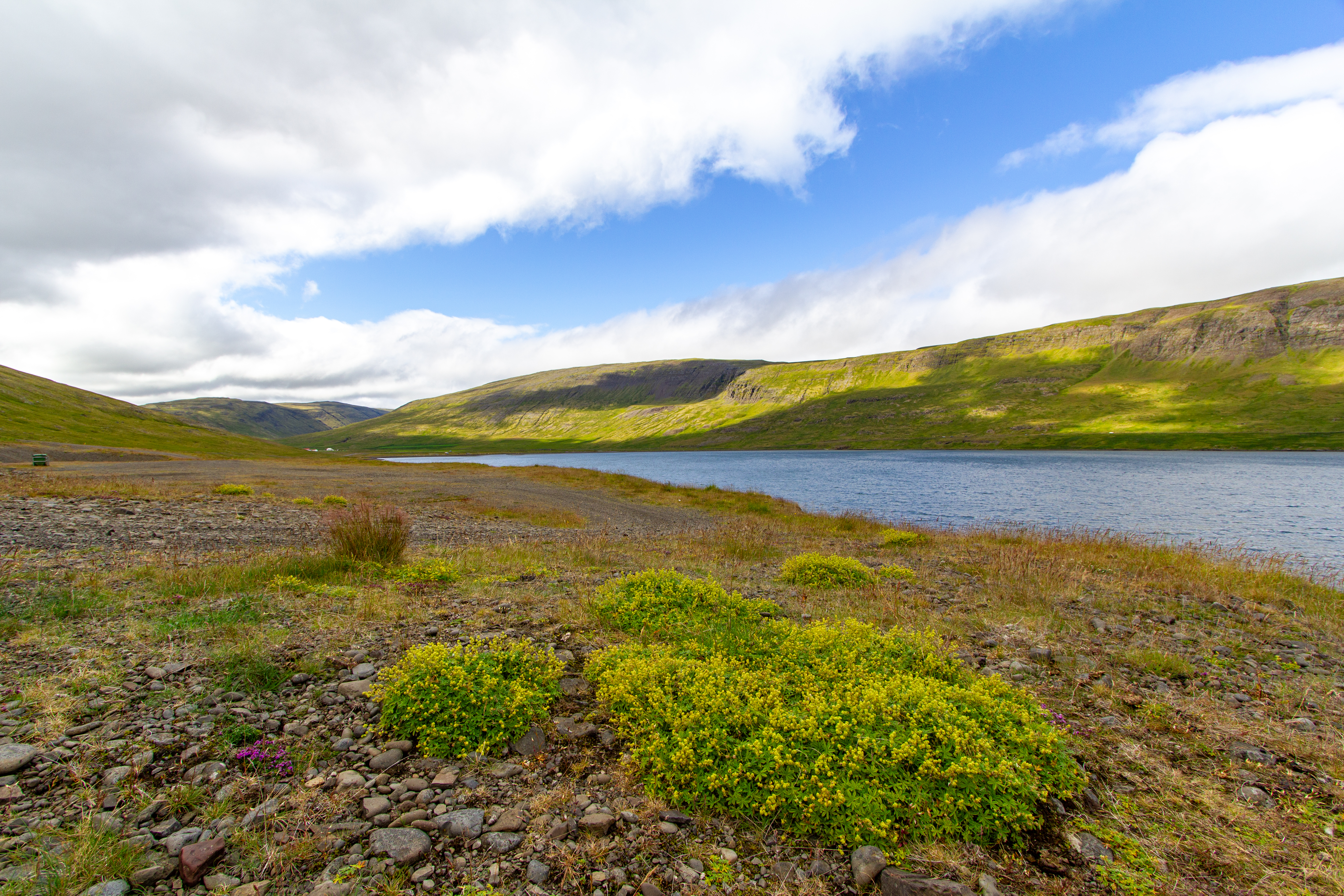 We were back in the fjords now, zig-zagging in and out of the inlets and peninsulas. One fjord, Mjóifjörður, actually had a bridge, so we went across that to save some time. But before we crossed it we got out of the car and walked around a visitor area for a few minutes. There were quite a few wildflowers, and great views of the fjords and the bridge itself. Our next stop was Litlibær, which we called Little Bear. It was a historic old building that was now a café, but it had closed just minutes before we got there. So we just viewed it from the outside for a bit, then got back on the road.