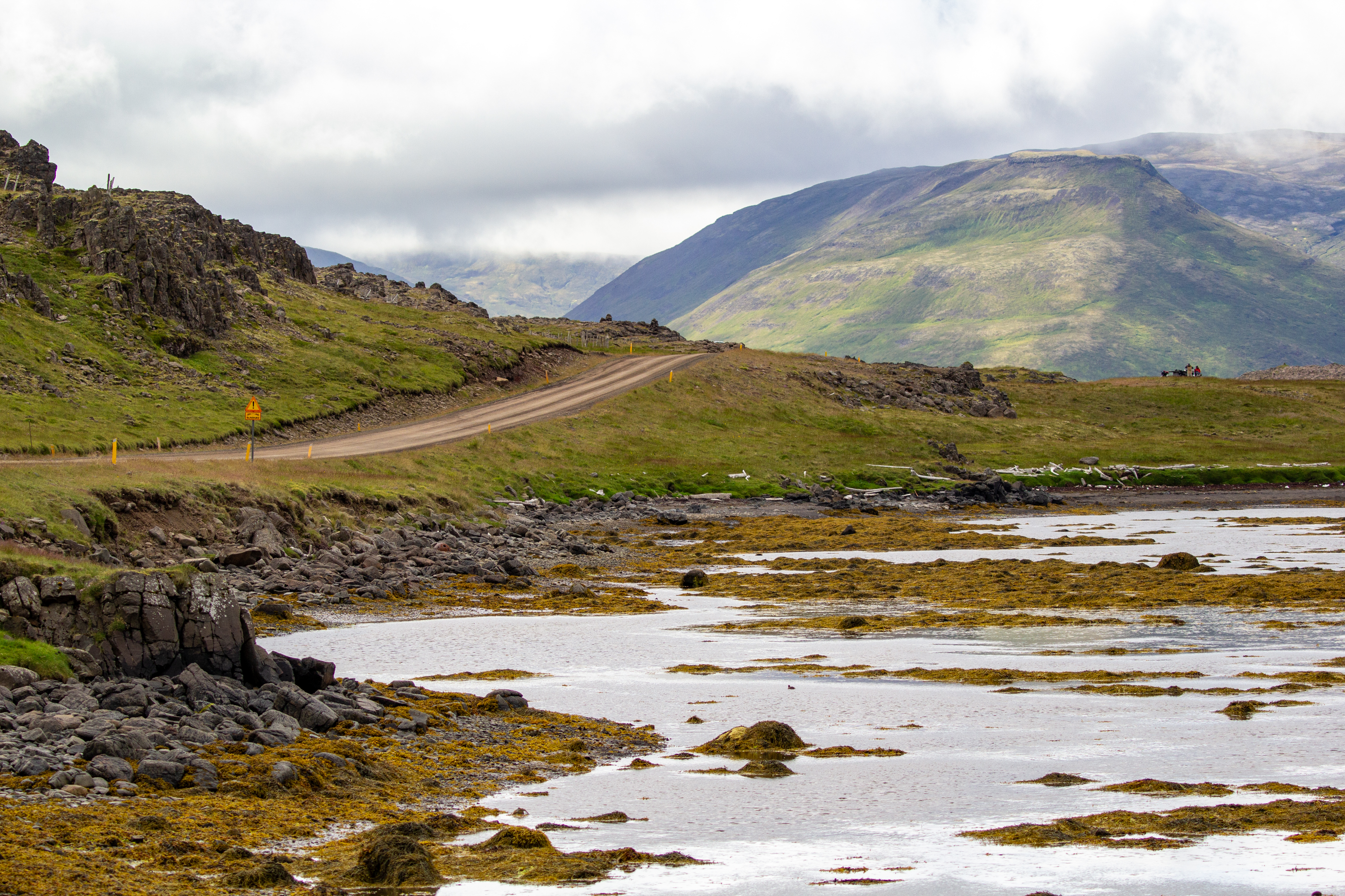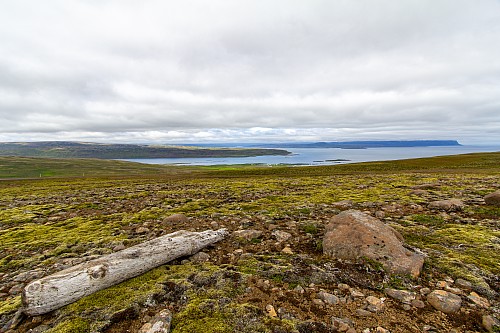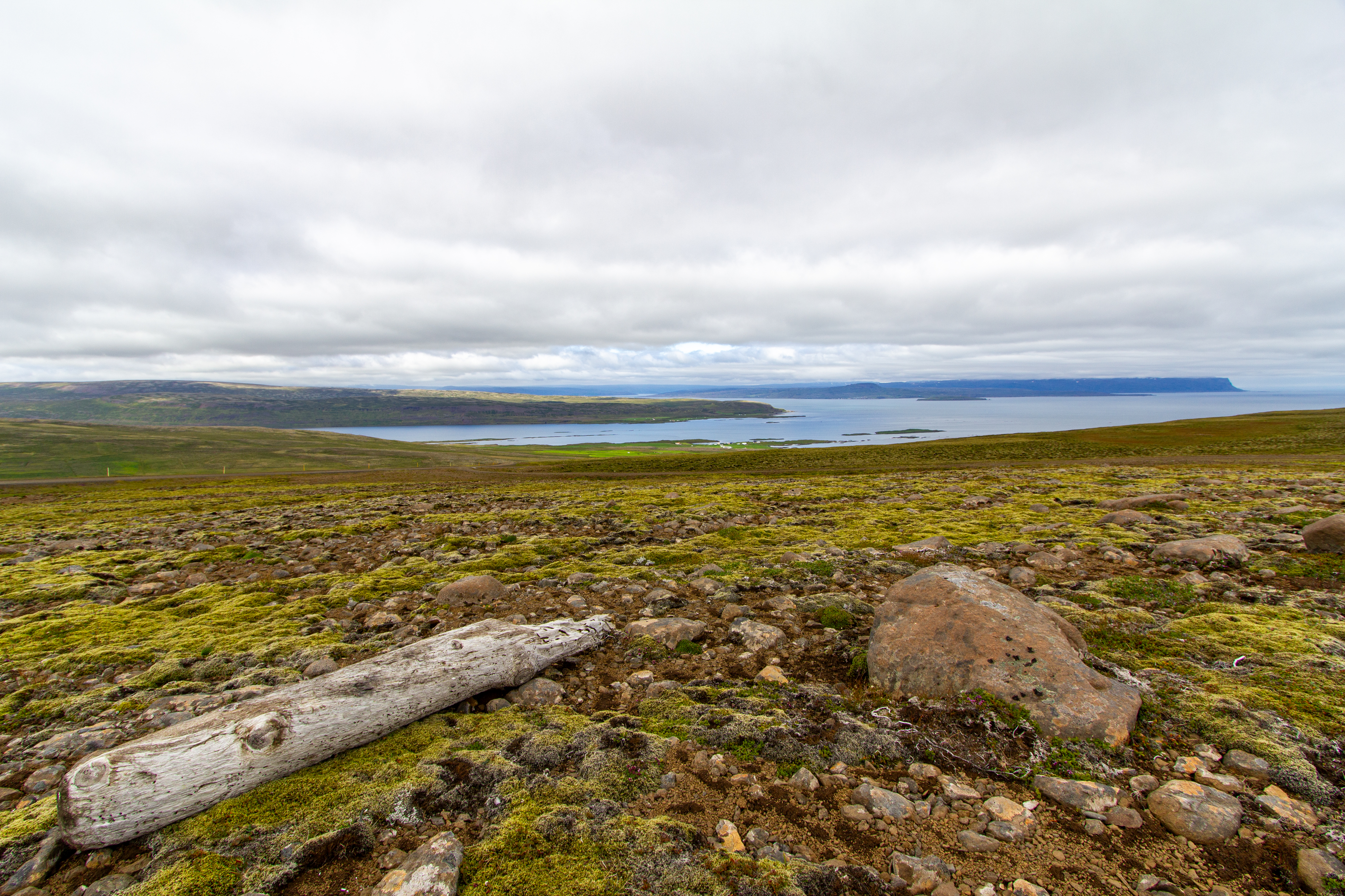The Arctic Terns attacked the car again on the way out, and we thought to take some video of the experience. Shortly after leaving the museum we turned off of the Ring Road onto Road 68, which we assumed marked the border of the Westfjords. Comparatively very few tourists visit the Westfjords, instead usually opting for a one week trip that goes around the Ring Road. We had two weeks, so we added on a couple days in the Westfjords, a couple days in the Snæfellsnes peninsula, and a couple days in the Highlands. Interestingly, as we drove around on Road 68, along the shoreline in the Westfjords, we did start to see a good amount of driftwood.