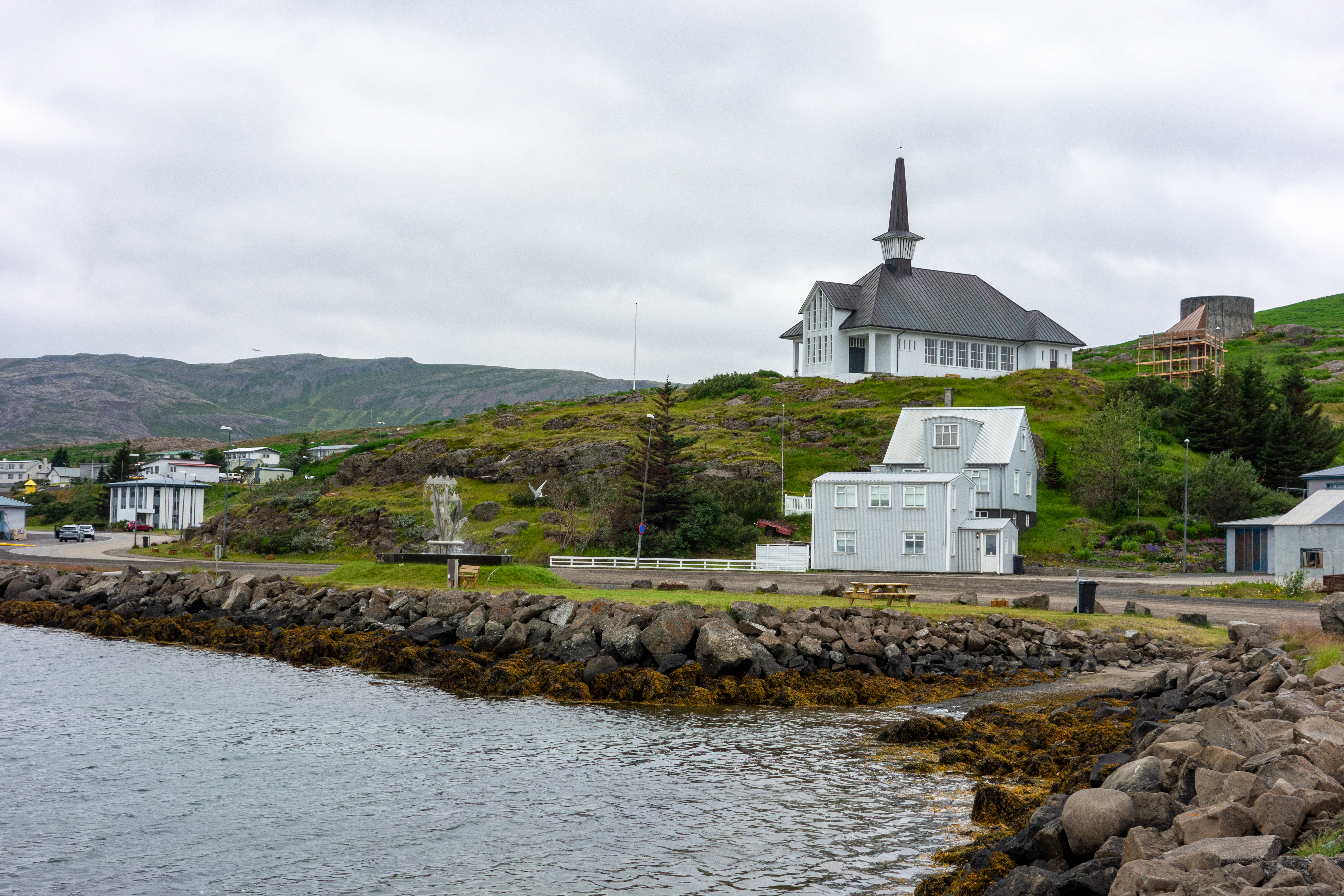 Out in the water we could see a large ship (maybe a cruise ship?), but we couldn’t tell if it was coming or going to Ísafjörður. Speaking of Ísafjörður, we just drove straight through it, and decided to check it out a bit in the morning, as we’d be backtracking through the town anyway. We got into Bolungarvik around 19:30, so late, but nothing crazy like a couple of our nights so far. The town (more of a village, actually) was incredibly scenic, with huge mountains on every side that wasn’t the ocean. Bolungarvik is the last town in the northwest end of the Westfjords, so basically the end of the road.