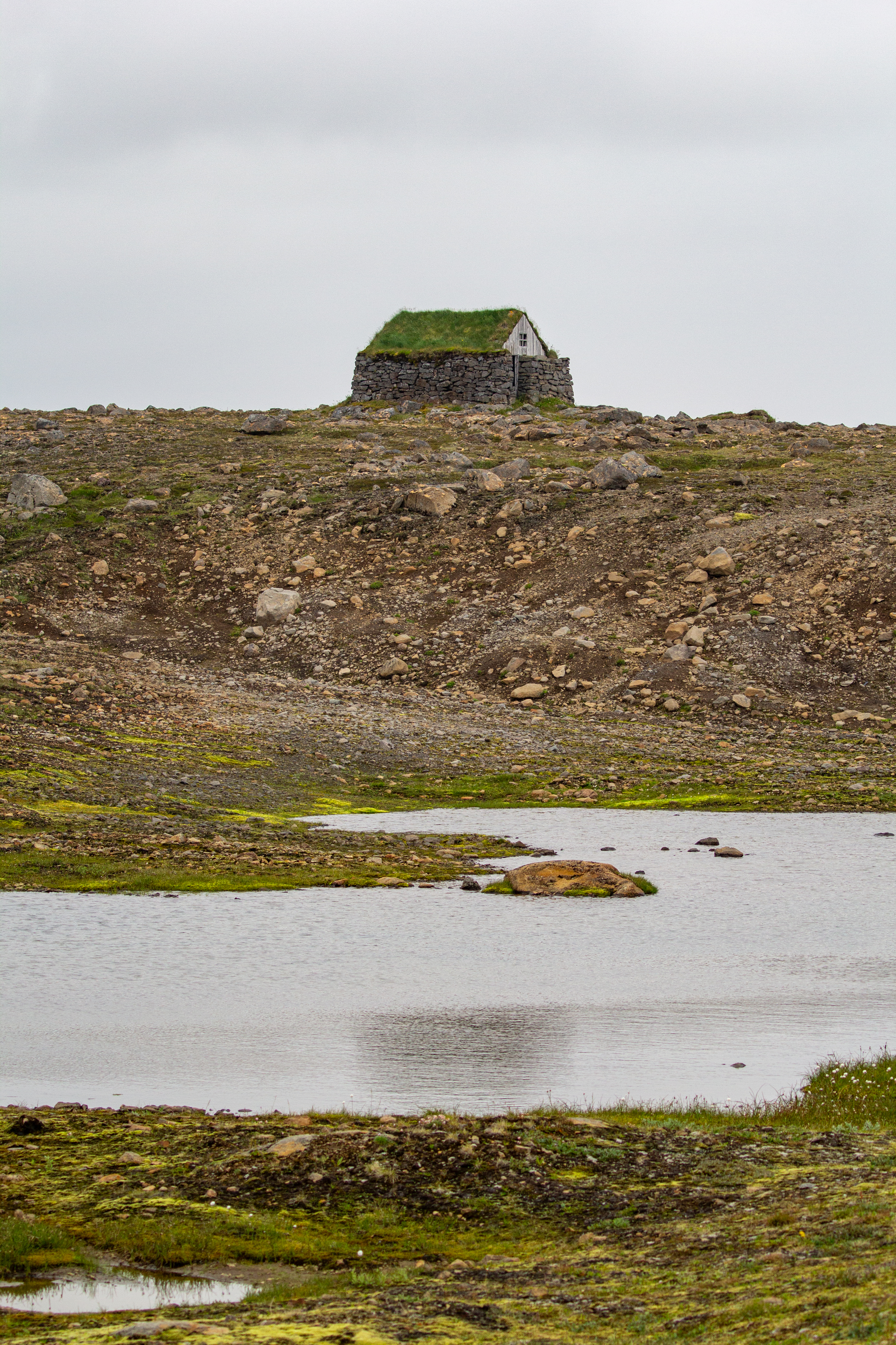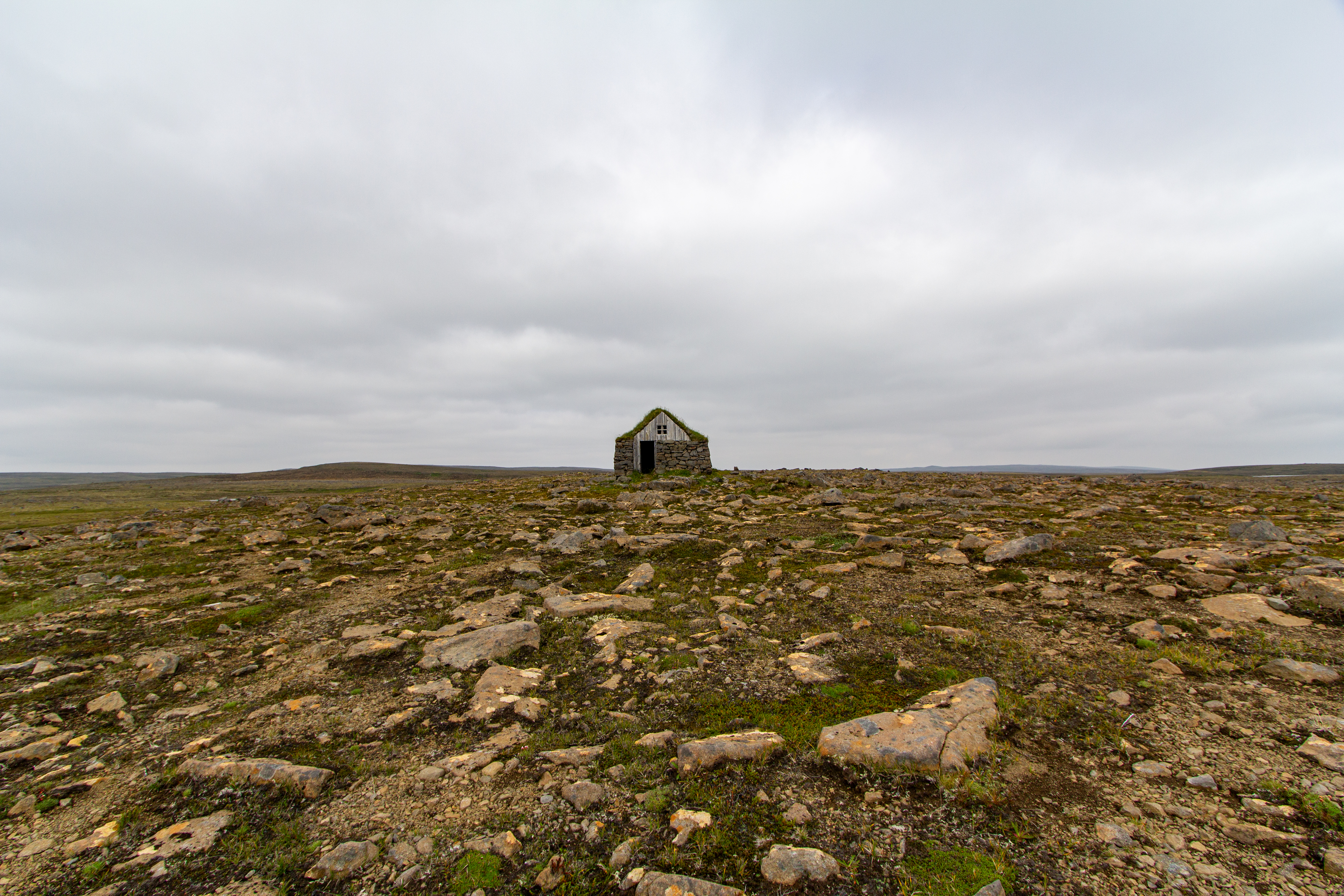 The museum was pretty much what we expected, but at least we weren’t disappointed. And we did get to stretch our legs a bit. While we were in Hólmavík we got soda, gas, and snacks at the N1 station. We looked under the car and shook it a bit, and everything seemed to be consistent with the suspension on the right rear wheel. We drove west on Road 61, away from the coast for a bit, until we stopped at Steingrímsfjarðarheiði, an old house in the middle of nowhere with plants on the roof. The parking lot was on the other side of the road, but there were cars coming only every 3-5 minutes, so we weren’t sweating crossing the road. The house had an open door, and to our surprise, no one had ruined the inside. The roof had some sort of netting underneath the soil and plants, we wondered if that was for the roots to wrap around for structural integrity.