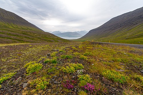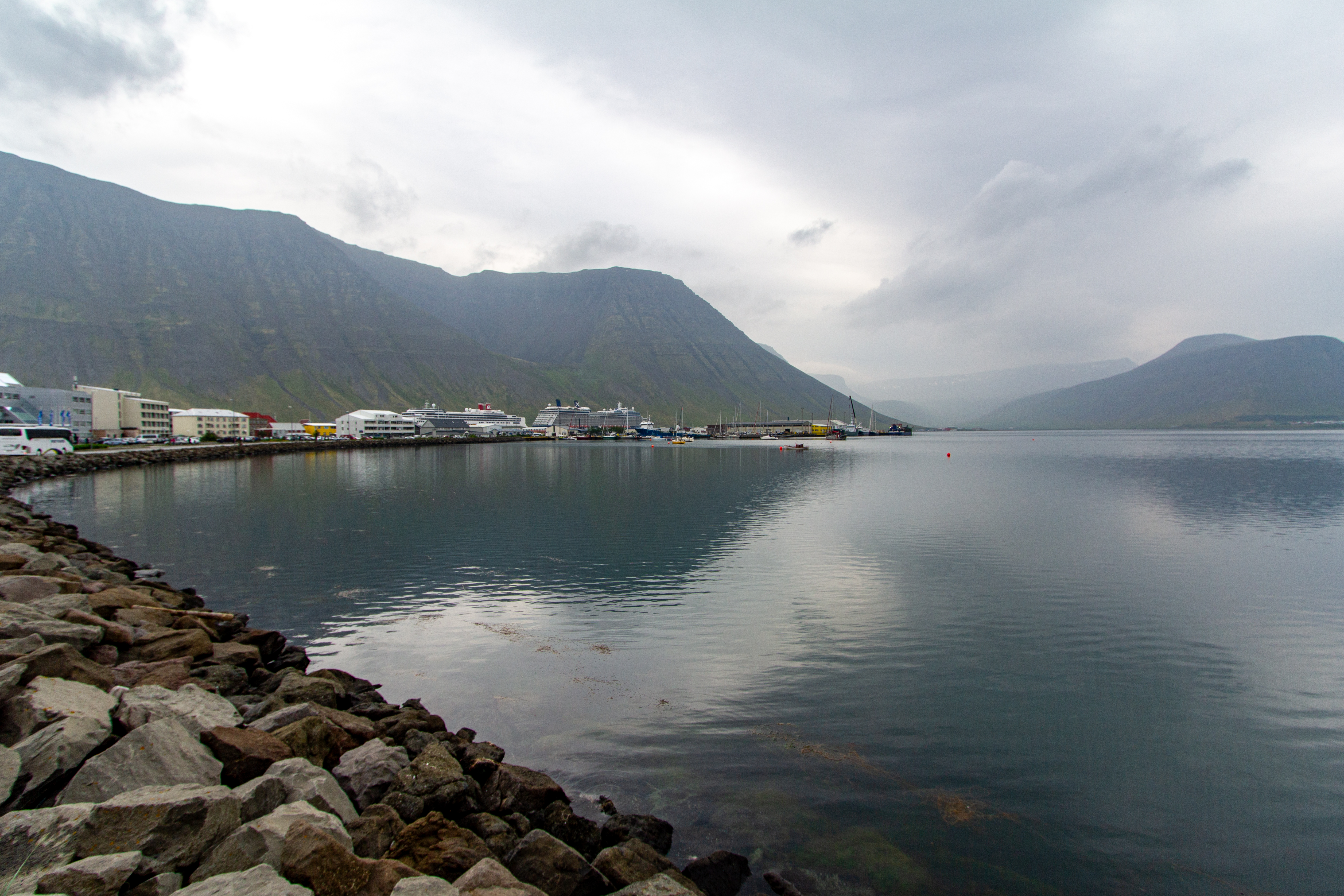 We left town and went through a tunnel, and right on the other side of the tunnel we parked at a viewpoint, Hnifsdalur. Just a little bit south of there was Ísafjörður. The town isn’t that large at all, but it’s huge for Westfjords standards. We went up to an observation deck to overlook the town. From there we could see two large cruise ships in port. Crystal noticed a parade of buses coming towards the dock. We had the epiphany that Dynjandi was going to be crowded, since it was the main tourist site in this area. As we were standing there, we saw a plane come into land at the airport. It went over our head, then circled around and landed on the other side of the bay.