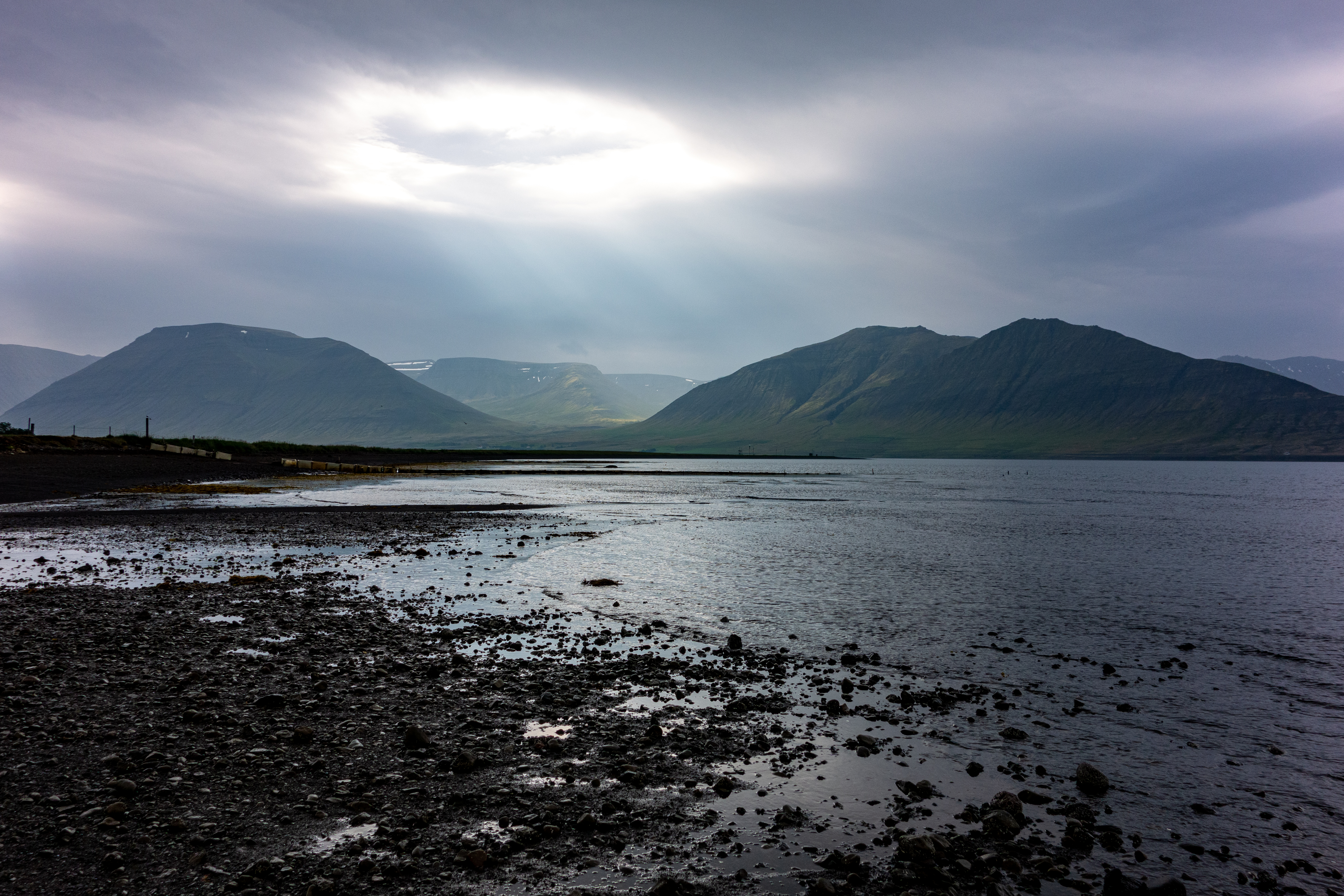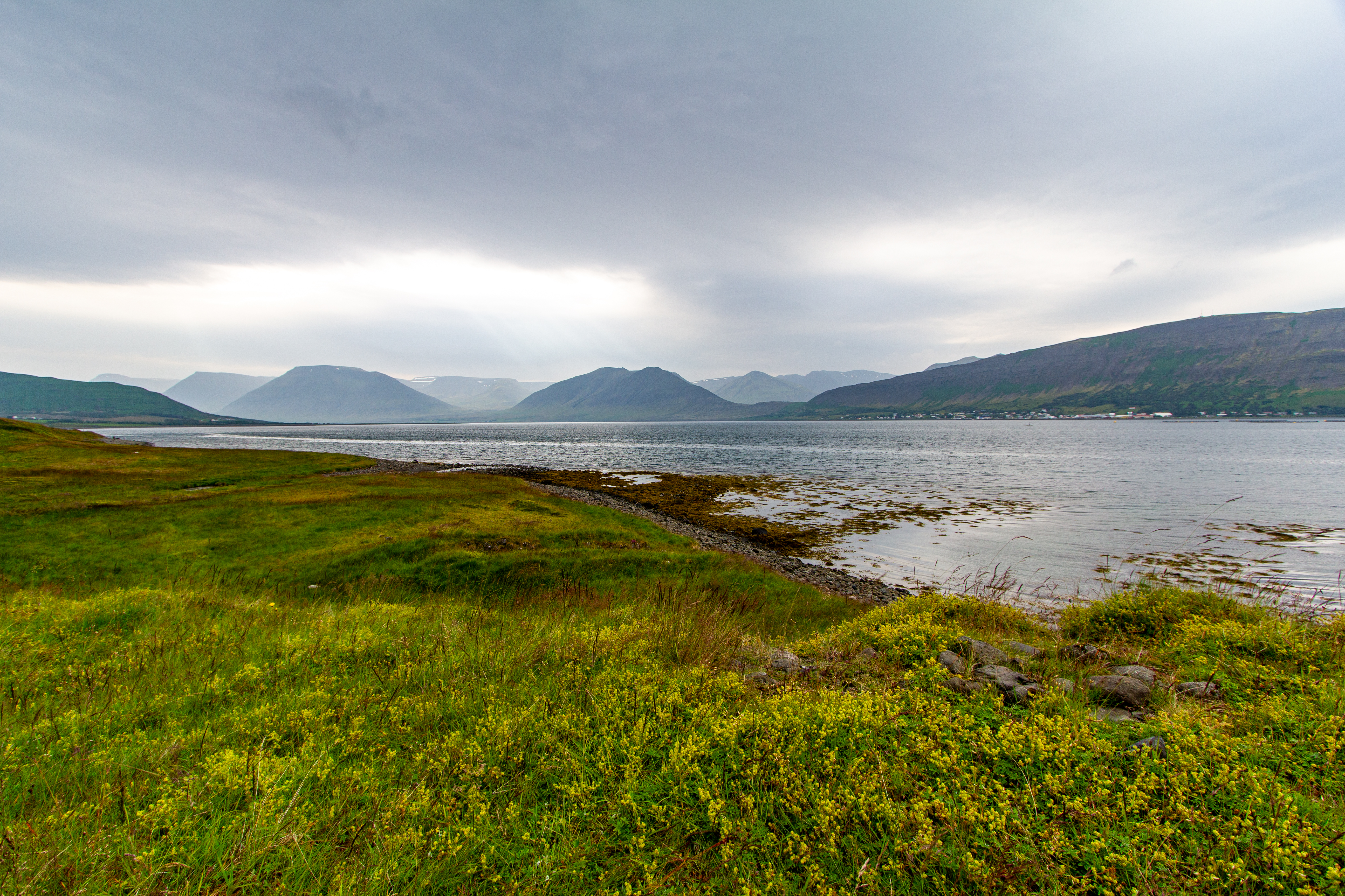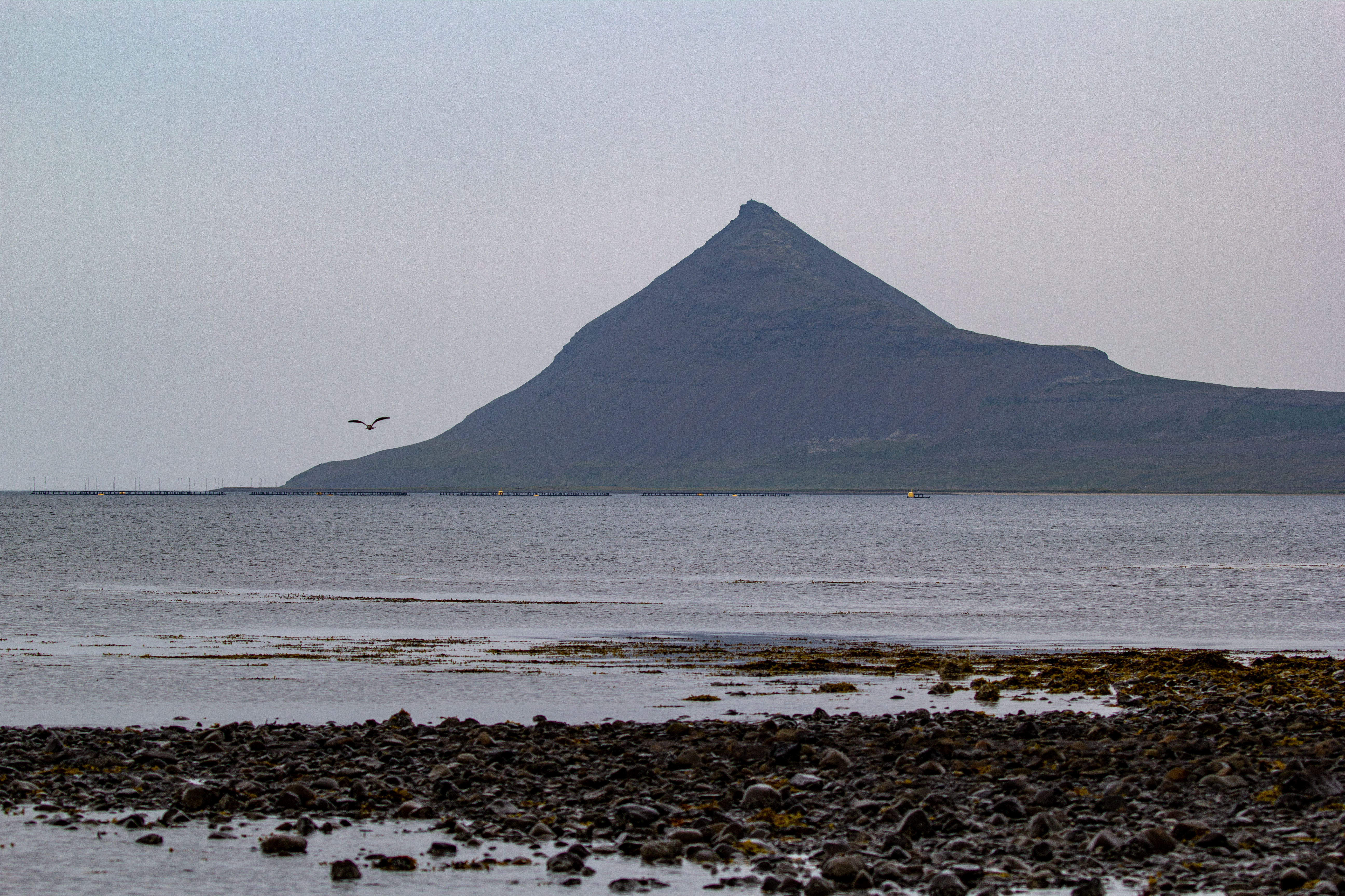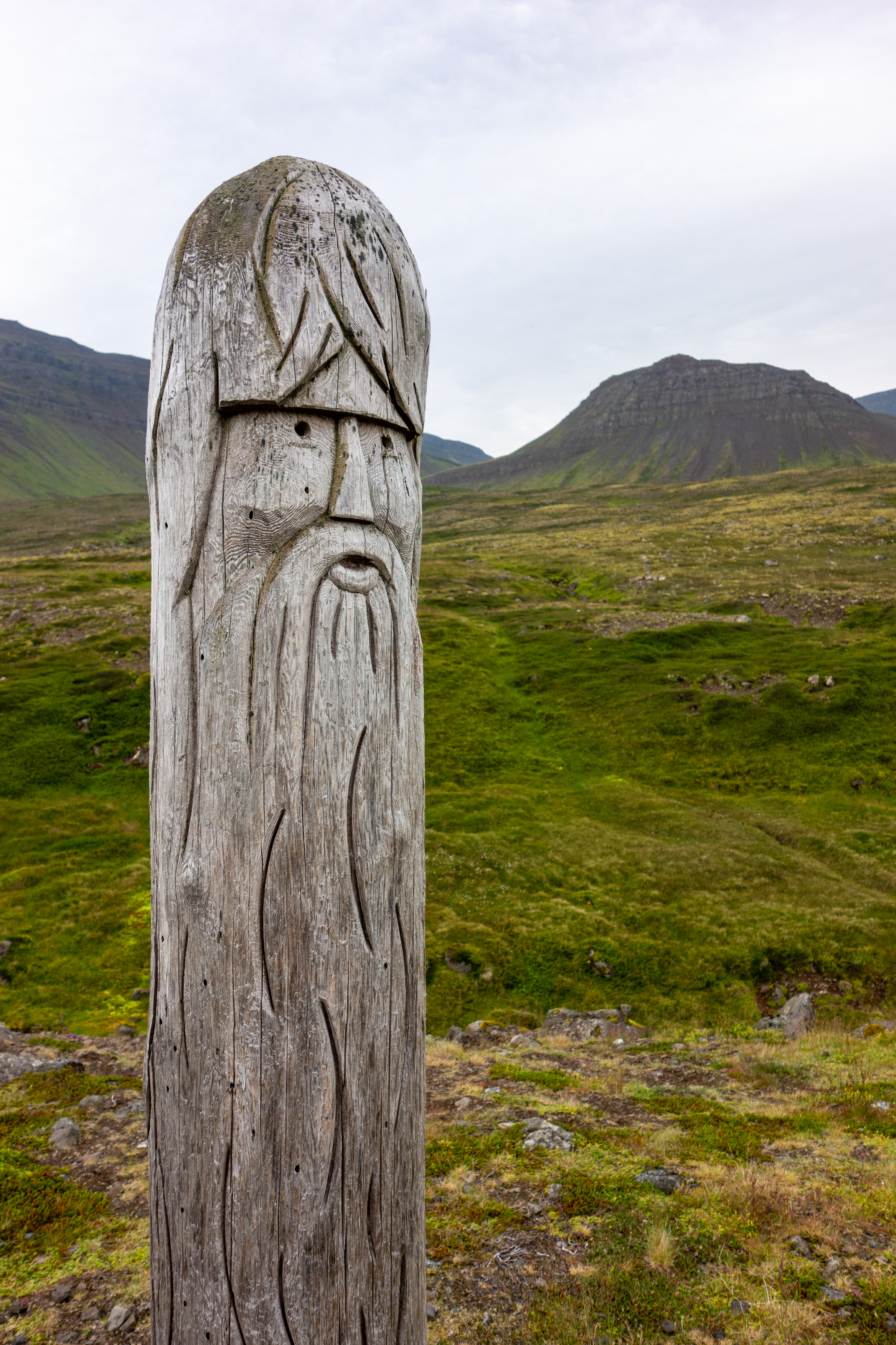 Unlike yesterday where we were driving in and out of the fjords, following the coastline, today we were just cutting across the peninsulas. This time it wasn’t a tunnel, but instead going up and over the mountains. As we were descending towards Dyrafjordur, we stopped at a viewpoint where there were two carved wooden figurines. Crystal was a fan of these. We couldn’t find anything indicating who made them or why they were there. We stopped at a couple different viewpoints for the views of Dýrafjörður, which was quite scenic. There was one ray of sunlight coming through the clouds, but that was it. As with most of the places we visited in Iceland, we would’ve liked to have seen the view in the sun. But, as with most days, we’d settle for just no rain.