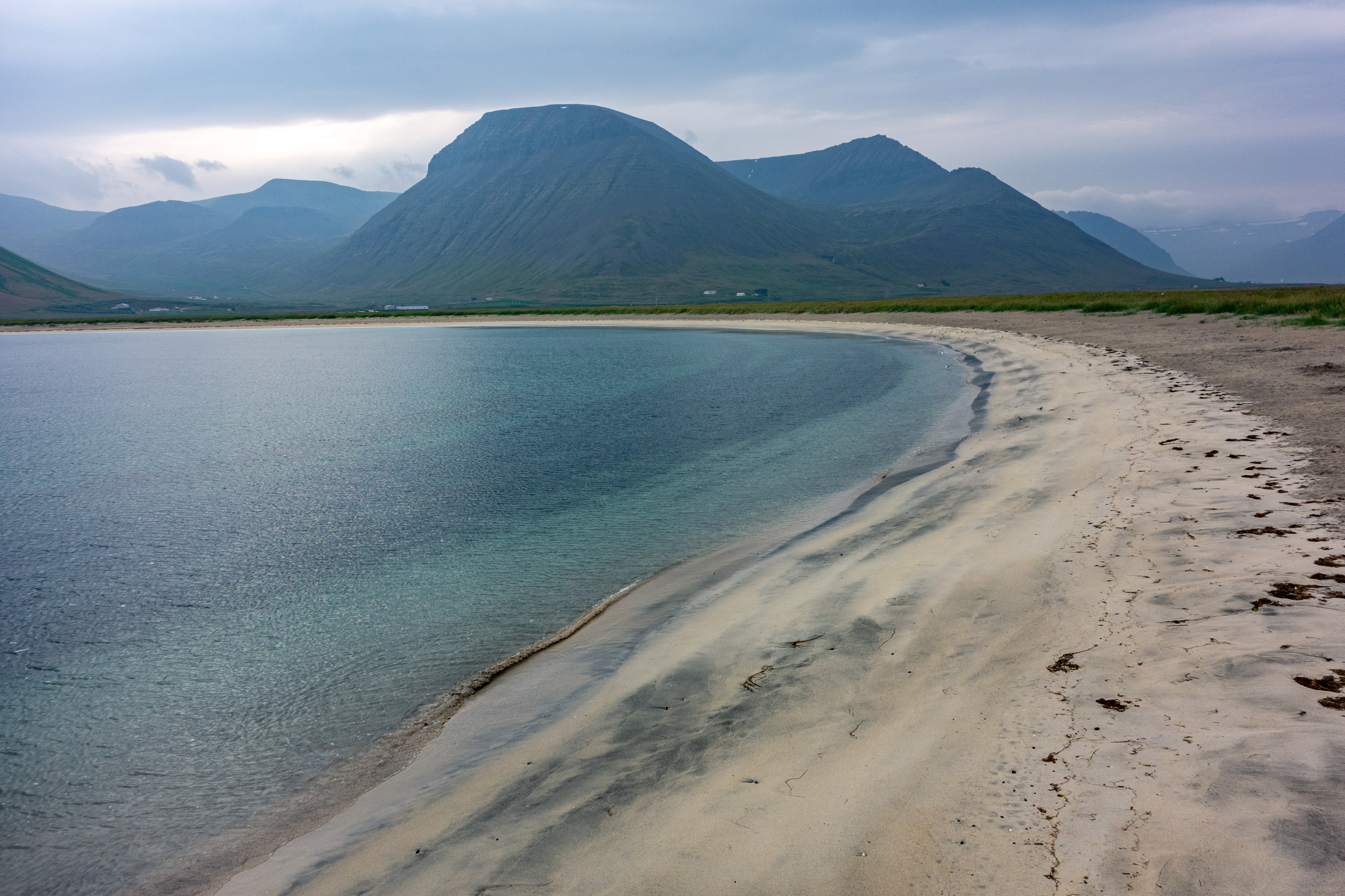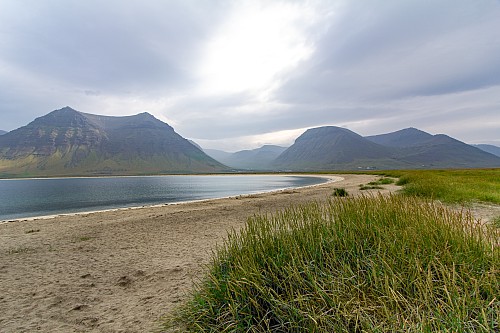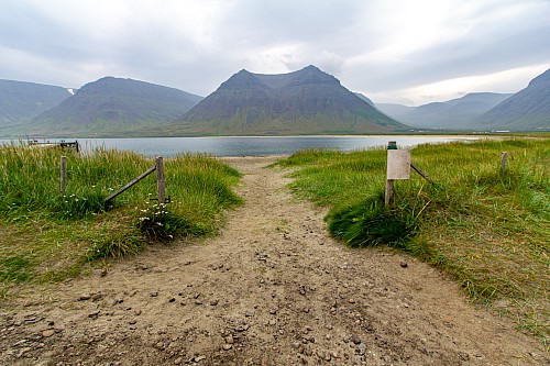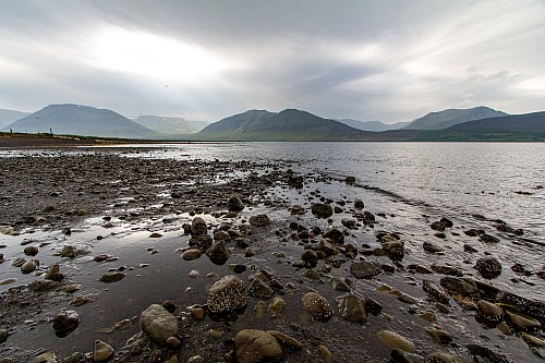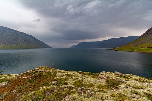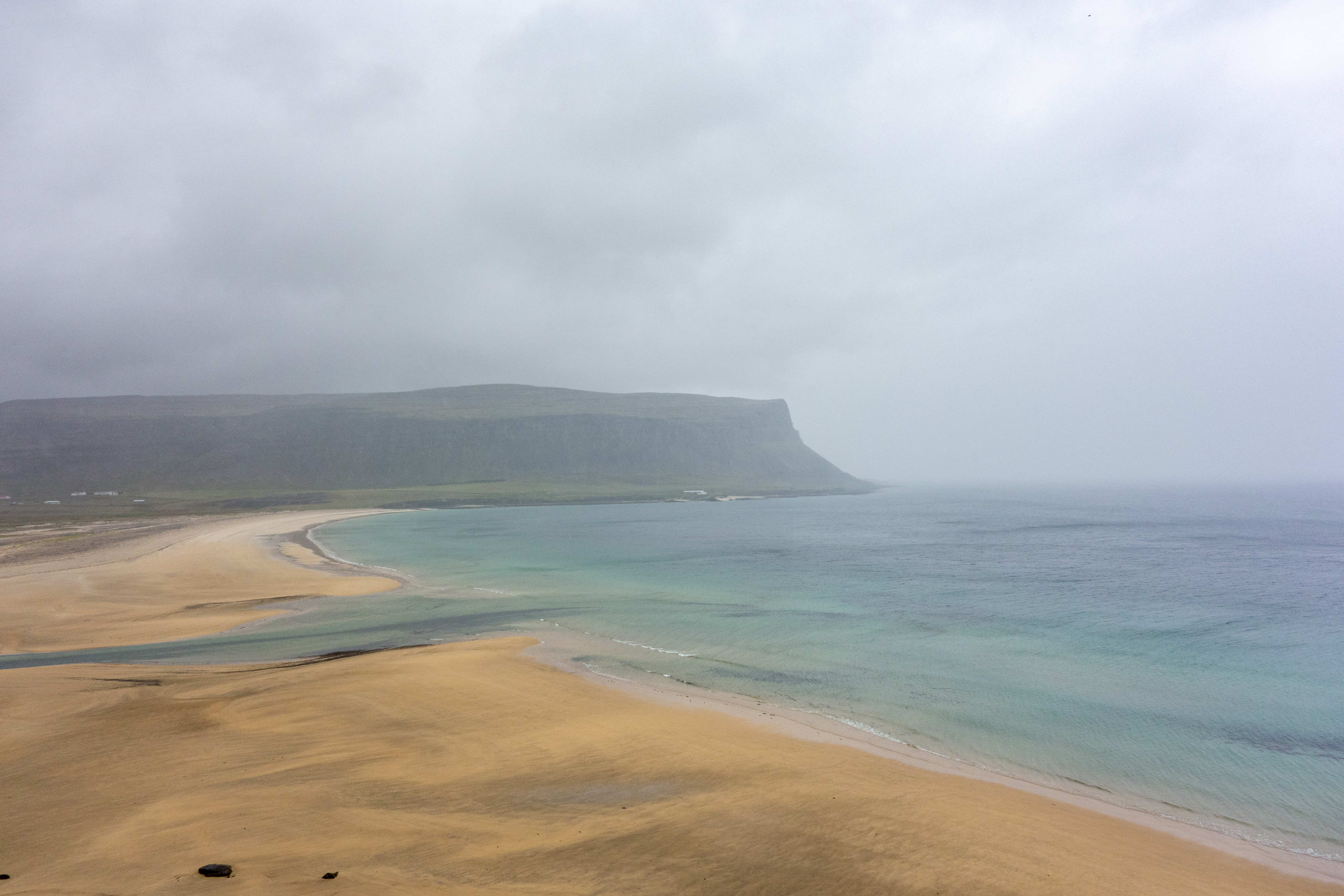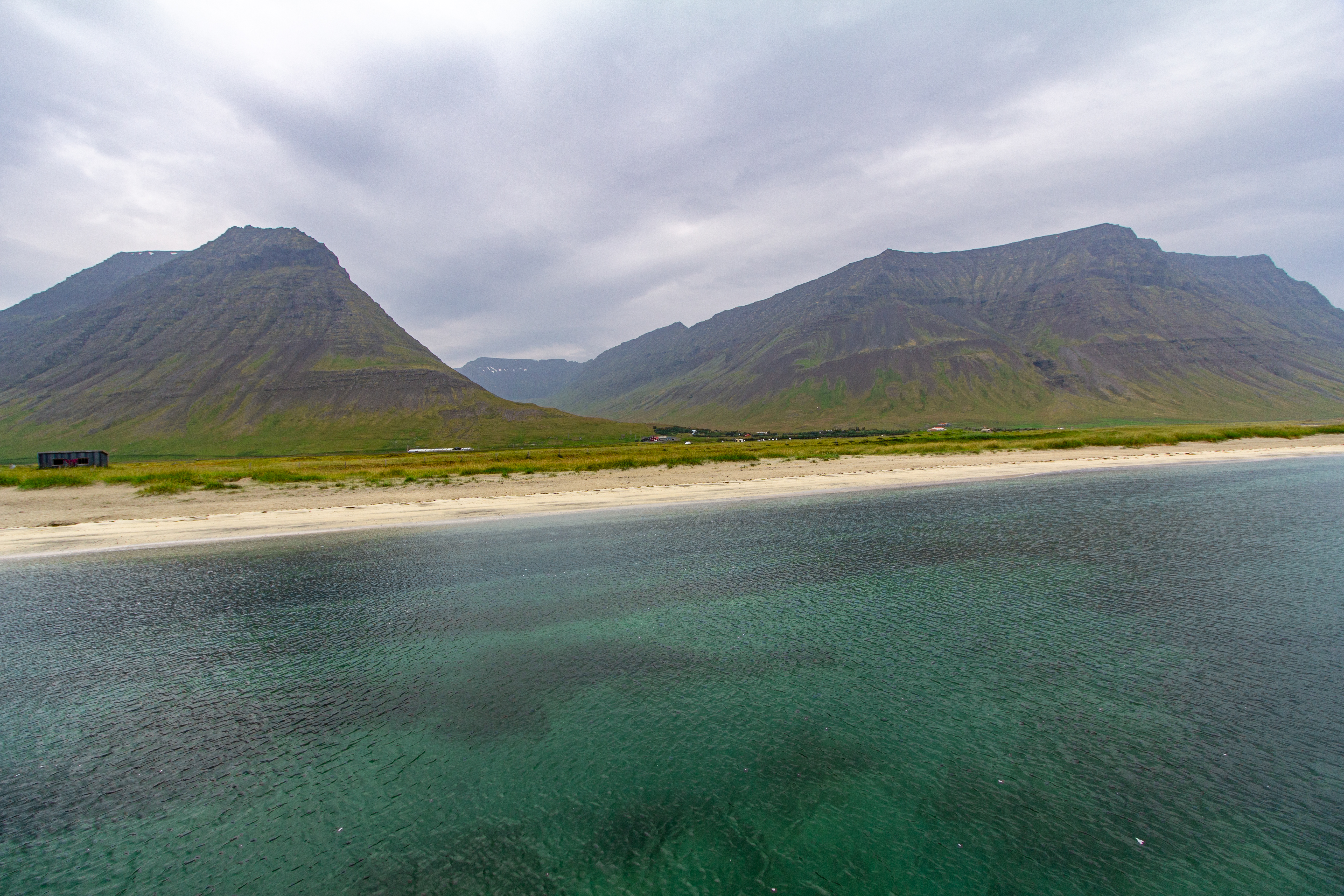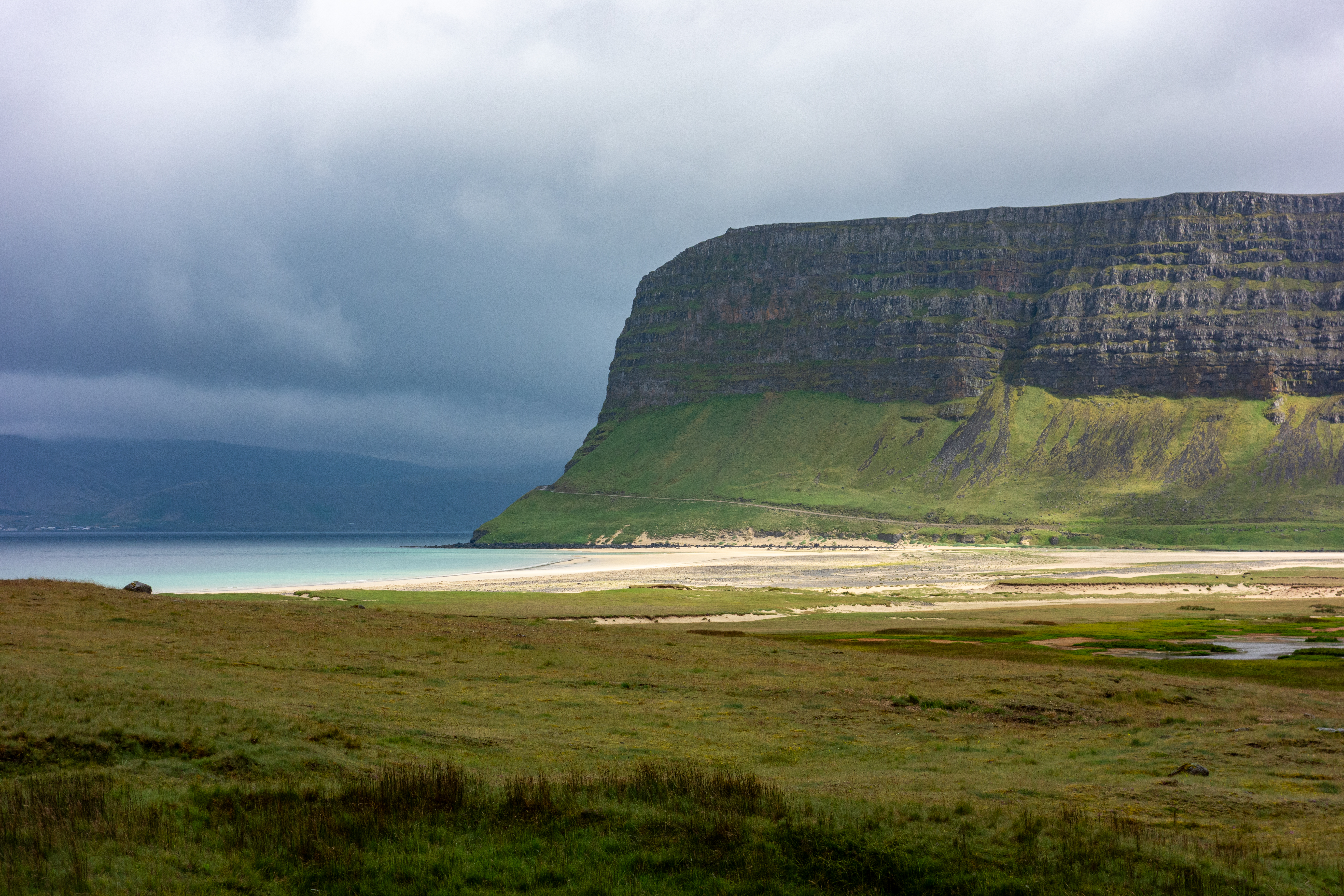 Unlike yesterday where we were driving in and out of the fjords, following the coastline, today we were just cutting across the peninsulas. This time it wasn’t a tunnel, but instead going up and over the mountains. As we were descending towards Dyrafjordur, we stopped at a viewpoint where there were two carved wooden figurines. Crystal was a fan of these. We couldn’t find anything indicating who made them or why they were there. We stopped at a couple different viewpoints for the views of Dýrafjörður, which was quite scenic. There was one ray of sunlight coming through the clouds, but that was it. As with most of the places we visited in Iceland, we would’ve liked to have seen the view in the sun. But, as with most days, we’d settle for just no rain.