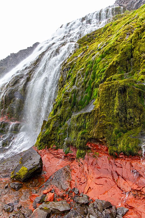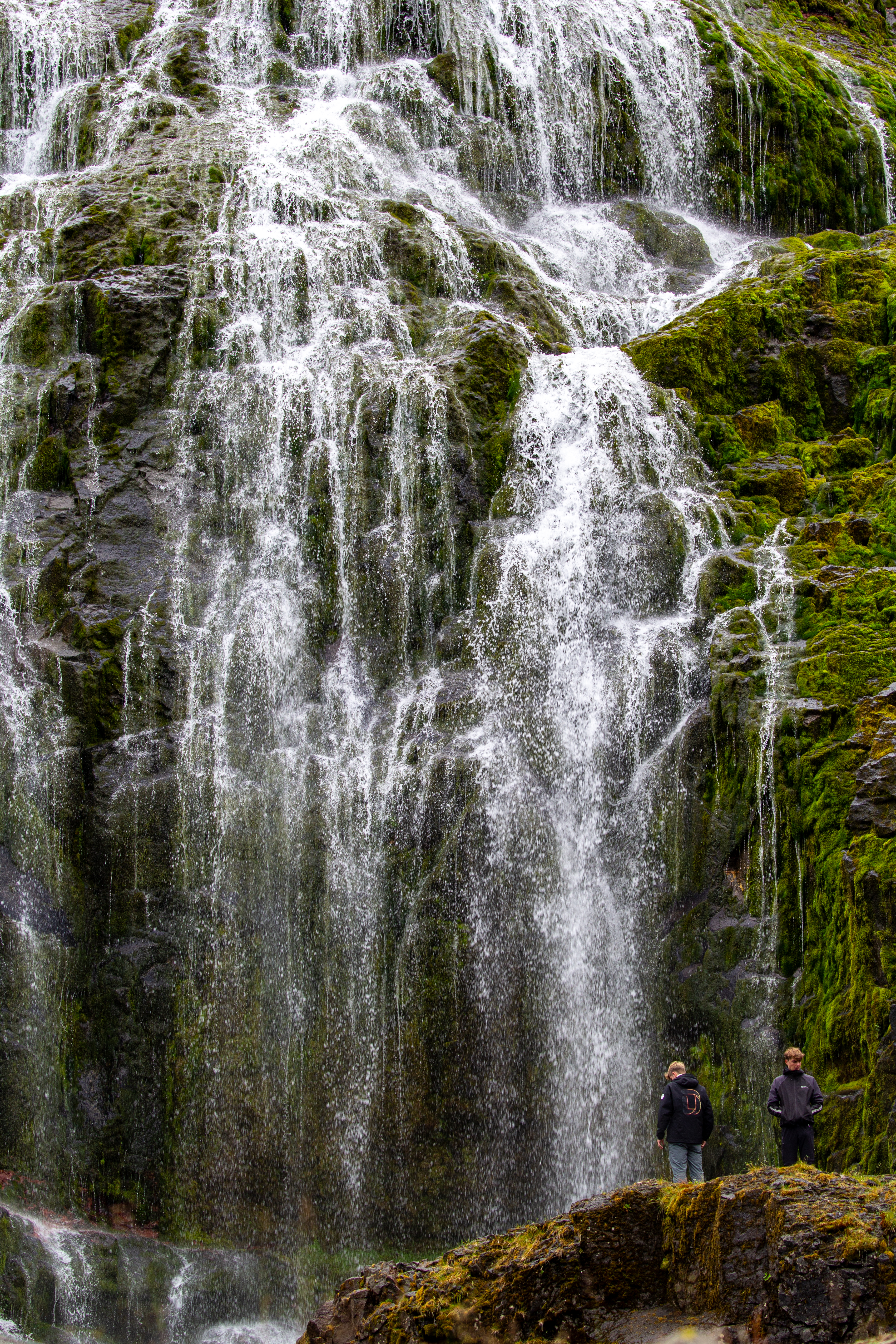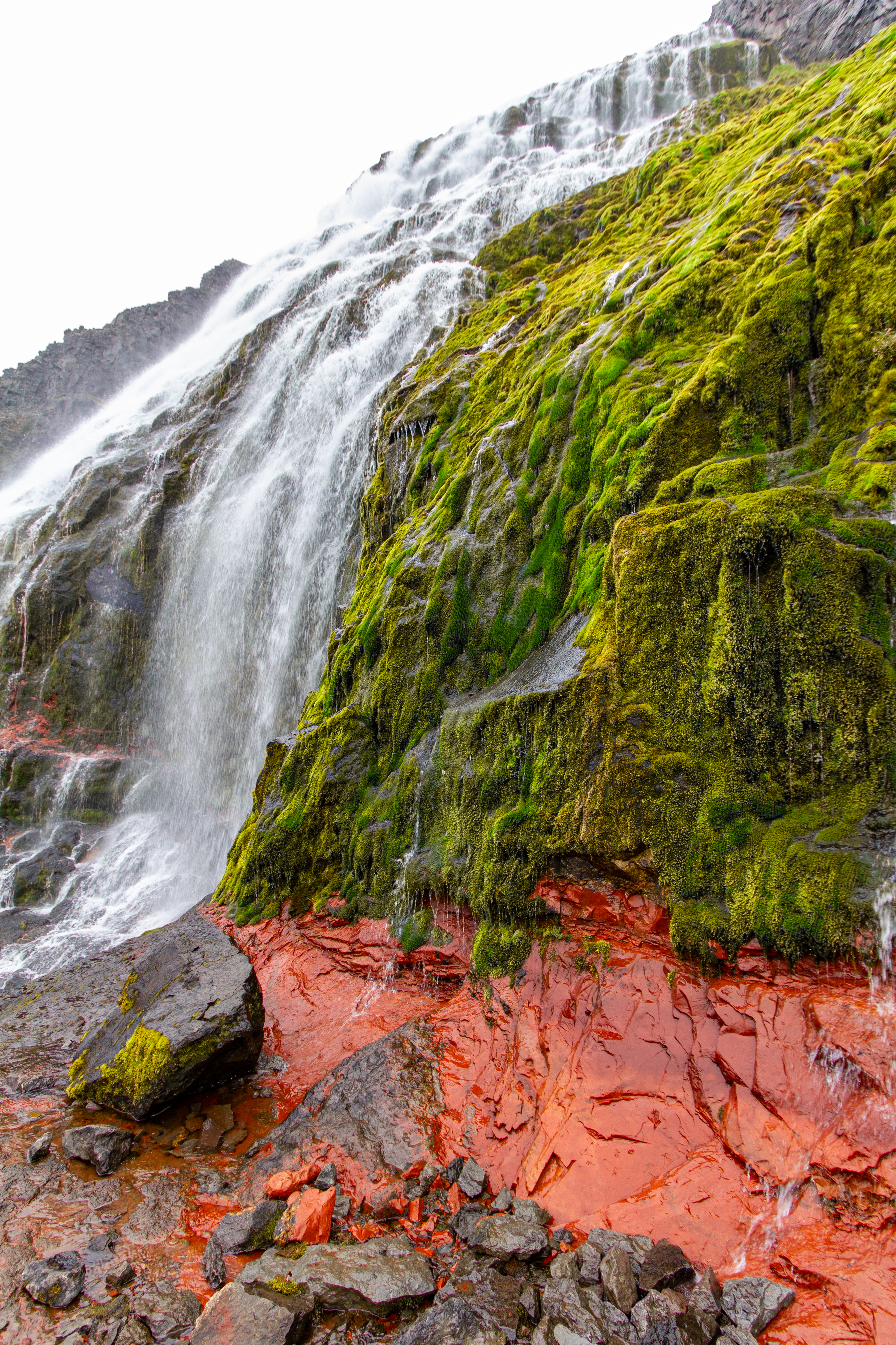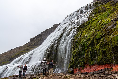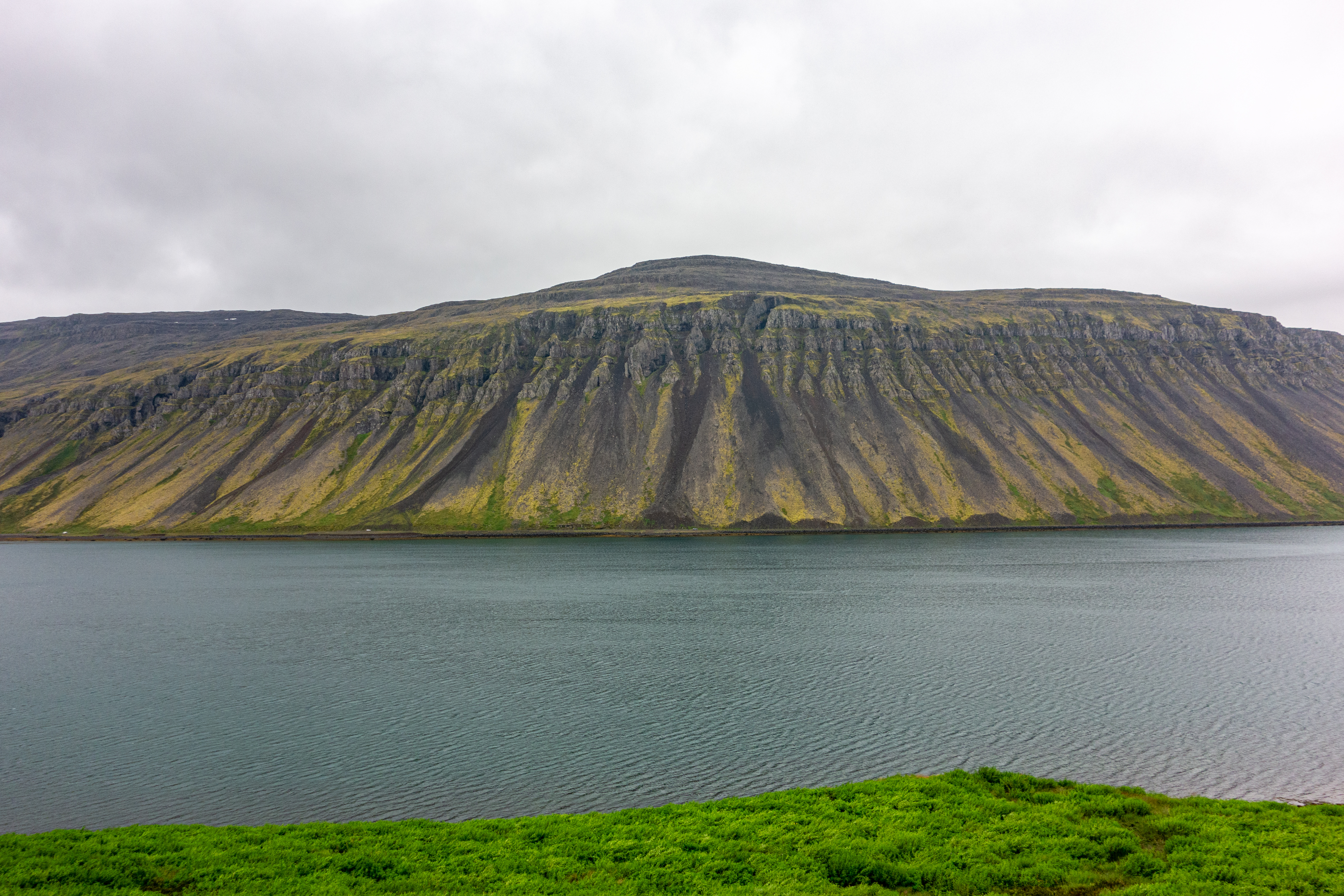 The falls were incredible. There were several different falls, and the one at the top, the largest one, fanned out sideways while going over a dozen or so little steps on the side of the mountain. At the very top of the path, right next to the base of the top falls, there was some of the red clay soil we’d seen at Hengifoss. Here we could stand right next to it and see it up close. It was striking, especially right next to the bright green moss. The flow was less powerful than many of the other falls we’d been to, so it was much less misty. We stayed quite a while enjoying Dynjandi, until around noon.