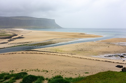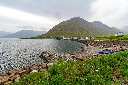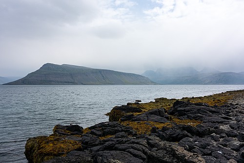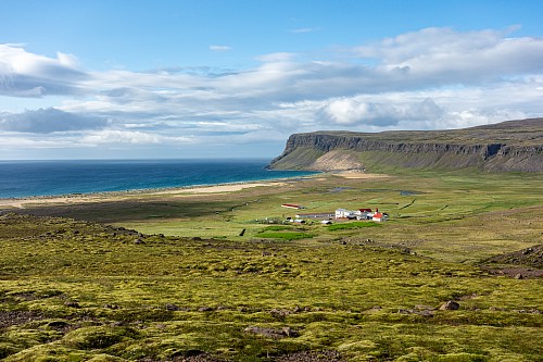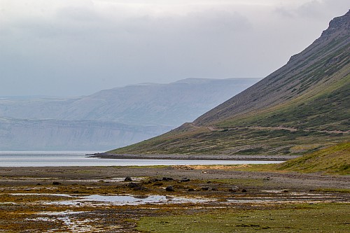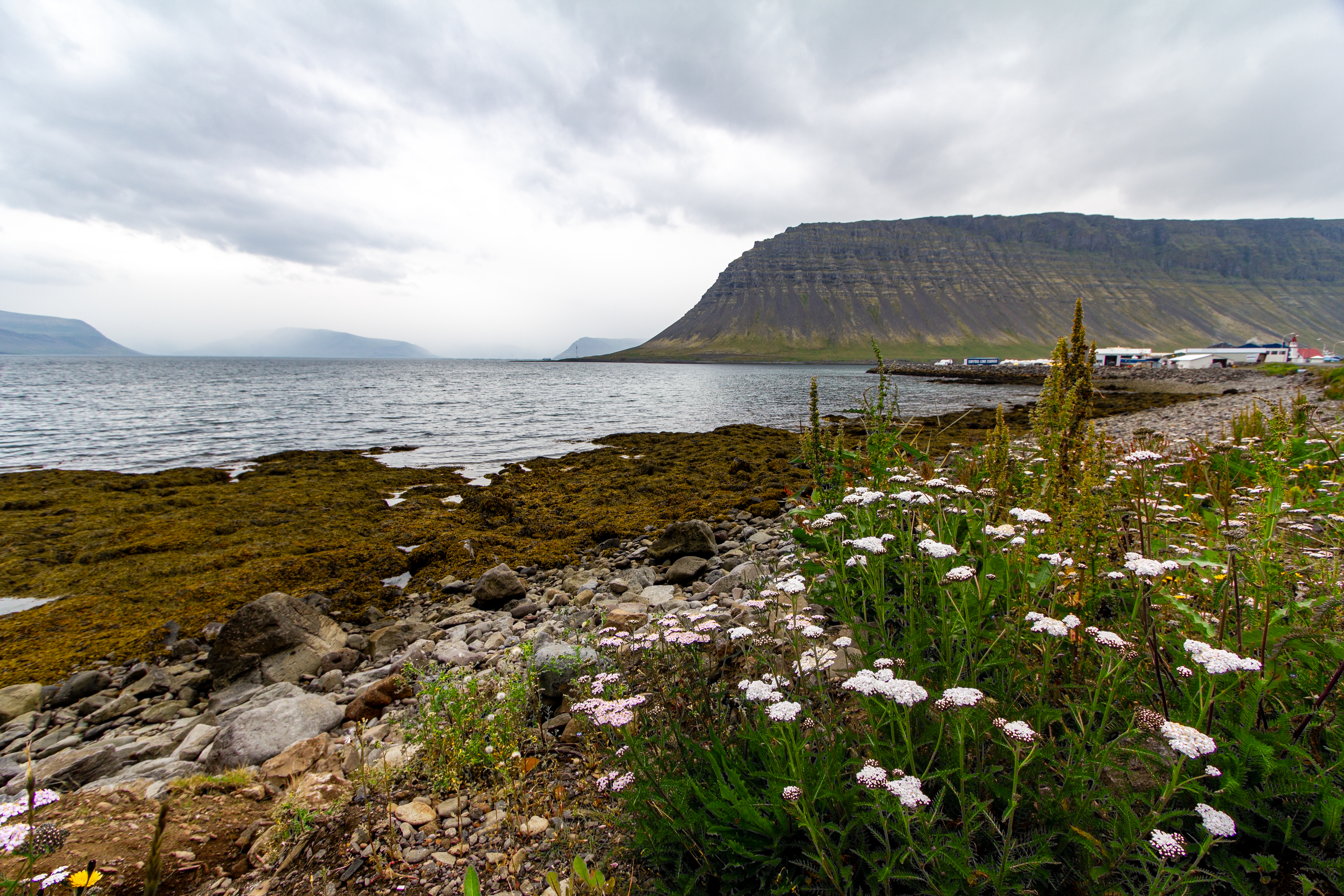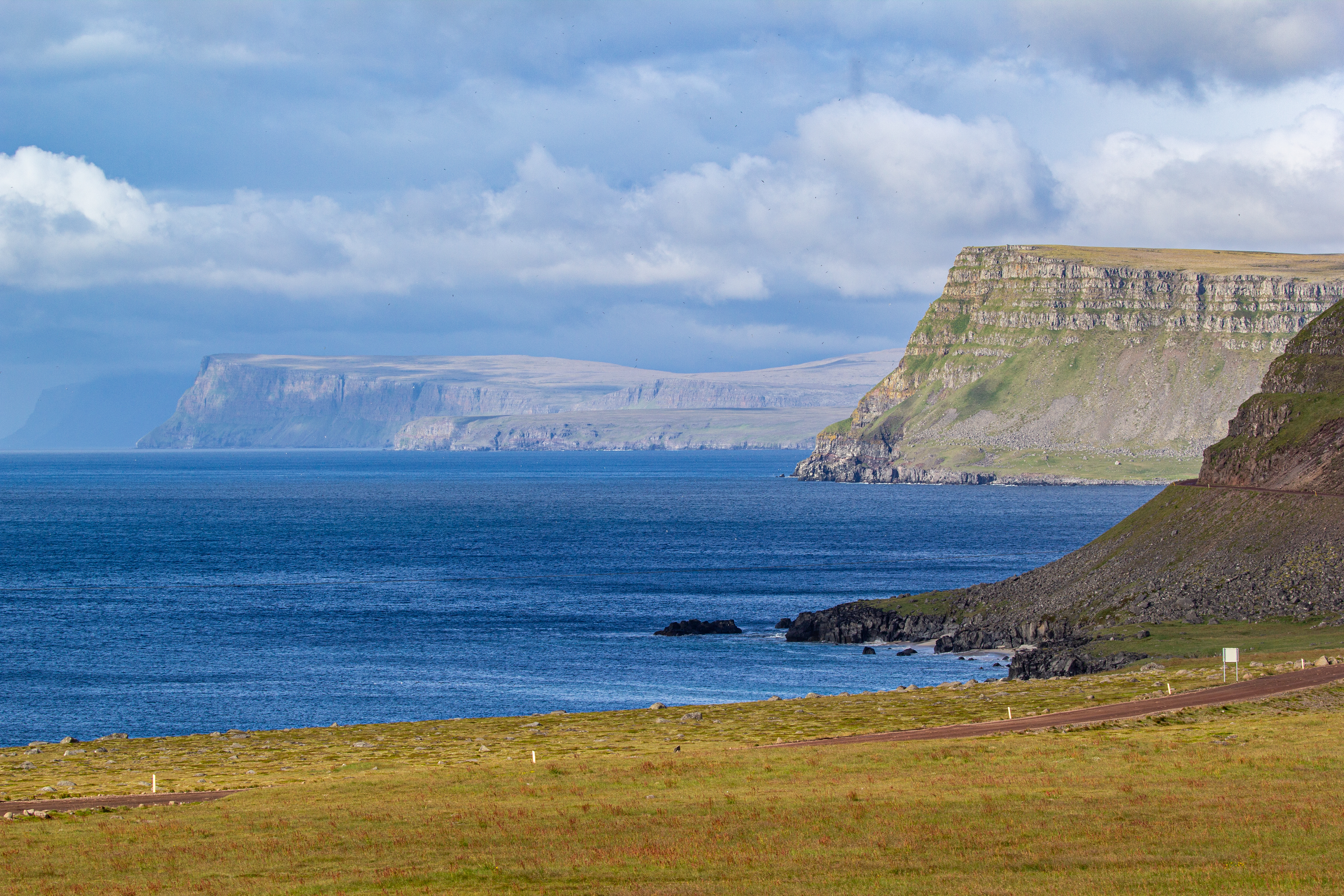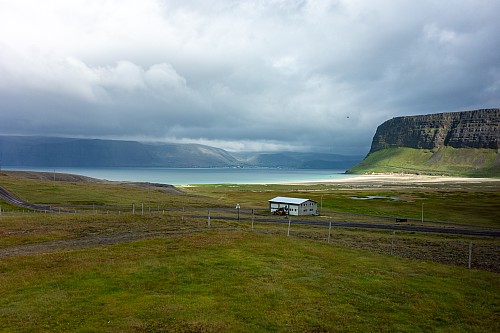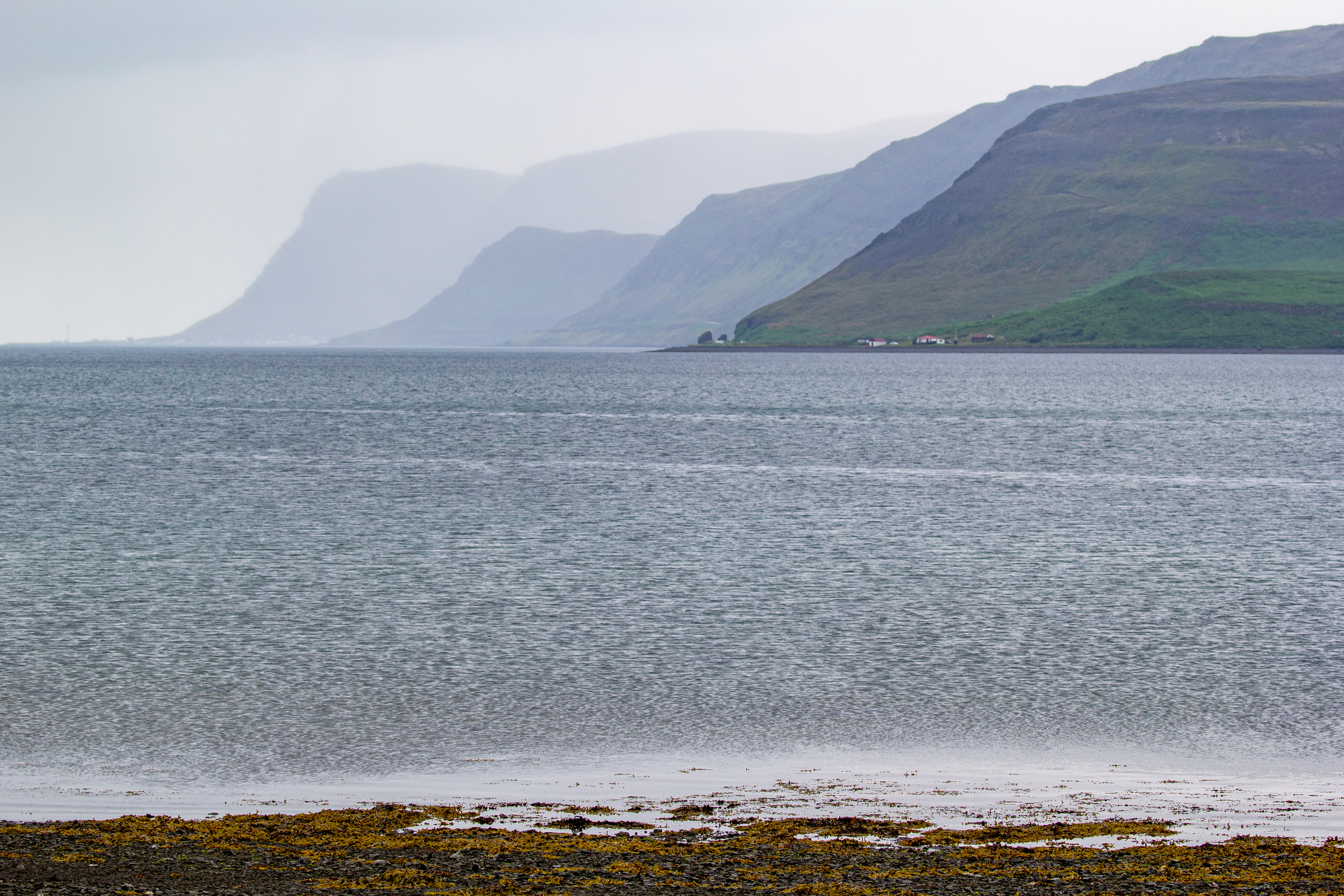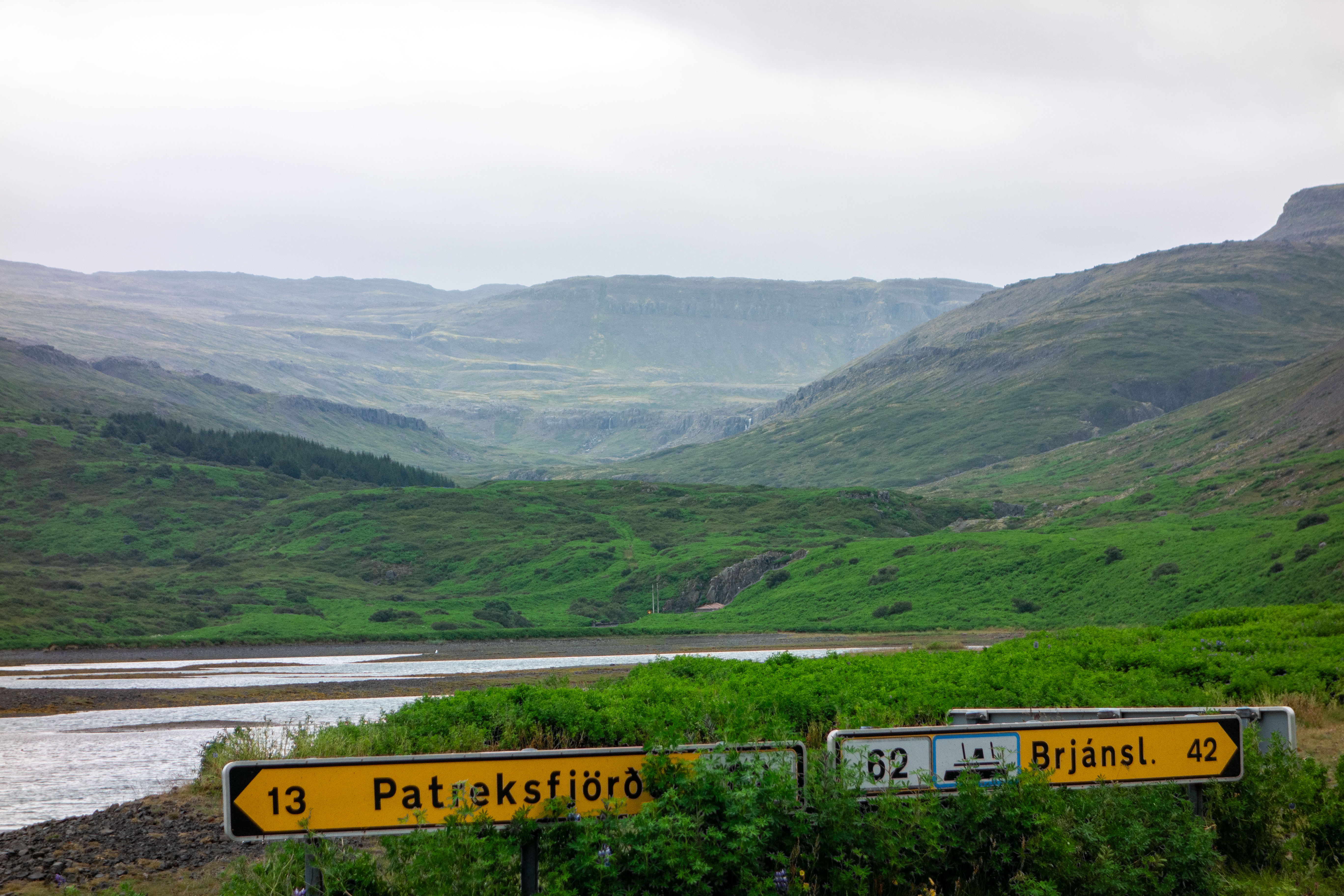 The scenery outside was nice, with many smaller waterfalls, but after Dynjandi, these weren’t worthy of stopping the car. The only exception was Fossfjörður, where we stopped for a minute or two. A little before Fossfjörður we’d turned off of Road 60 onto Road 63, heading west. On Road 63 we made one other short stop, at the Litla-Eyri Rest Stop, which was a nice viewpoint. From there we didn’t stop for a while, but we did drive through a couple small towns, first Bíldudalur (which shockingly had an airport) and then Patreksfjordur, which we thought might be of some size since we saw a sign for a hospital. [Narrator: It was not of some size.]