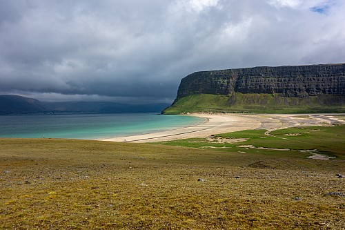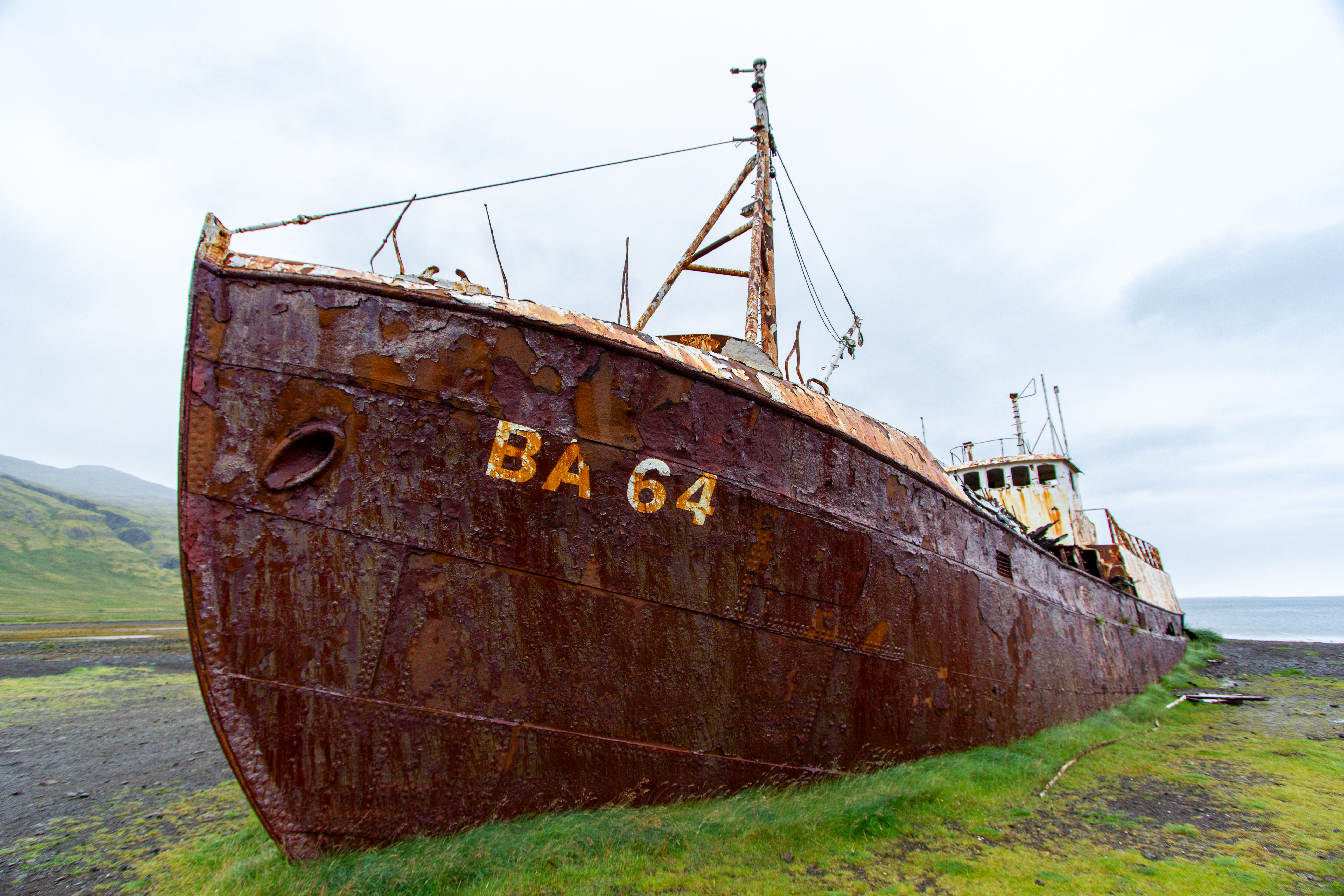At Patreksfjordur the road changed numbers, from Road 63 to Road 62, and we headed southeast for about 10 minutes until we turned off the pavement onto gravel, Road 612. Right near there we stopped for a few minutes at a beached ship, Gardar BA 64. We kept trying to get photos of the whole ship, but lazy idiot tourists kept parking right in front of the ship, rather than where 75% of the cars were parked, further back. It started to rain pretty good, so we got back in the car and booked it out of there. Also, because it was raining, we decided to go to the hotel first before the cliffs. Our hotel (Hotel Látrabjarg) was only five minutes or so off of the road that we needed to take to the cliffs, so it wasn’t really out of the way.