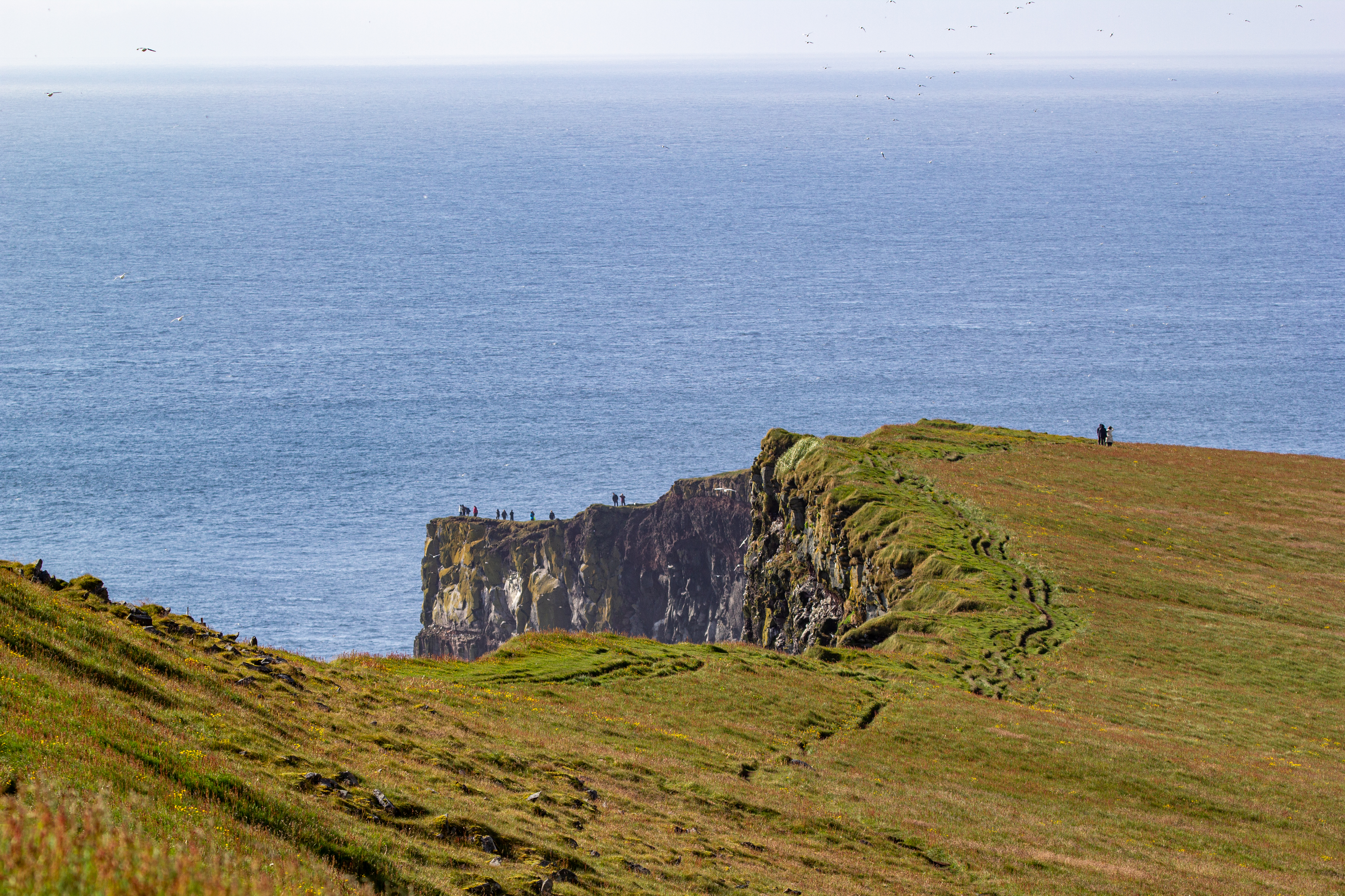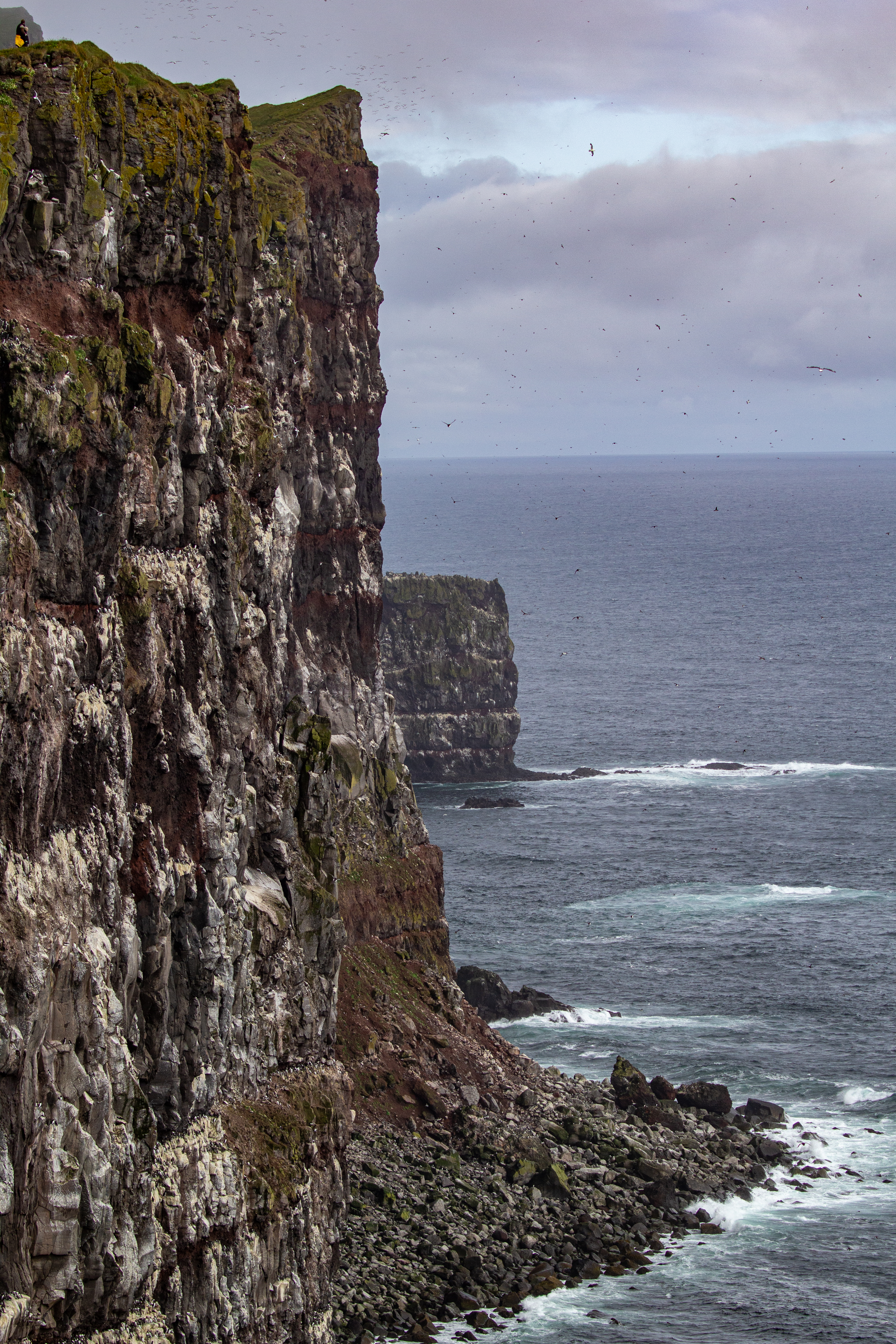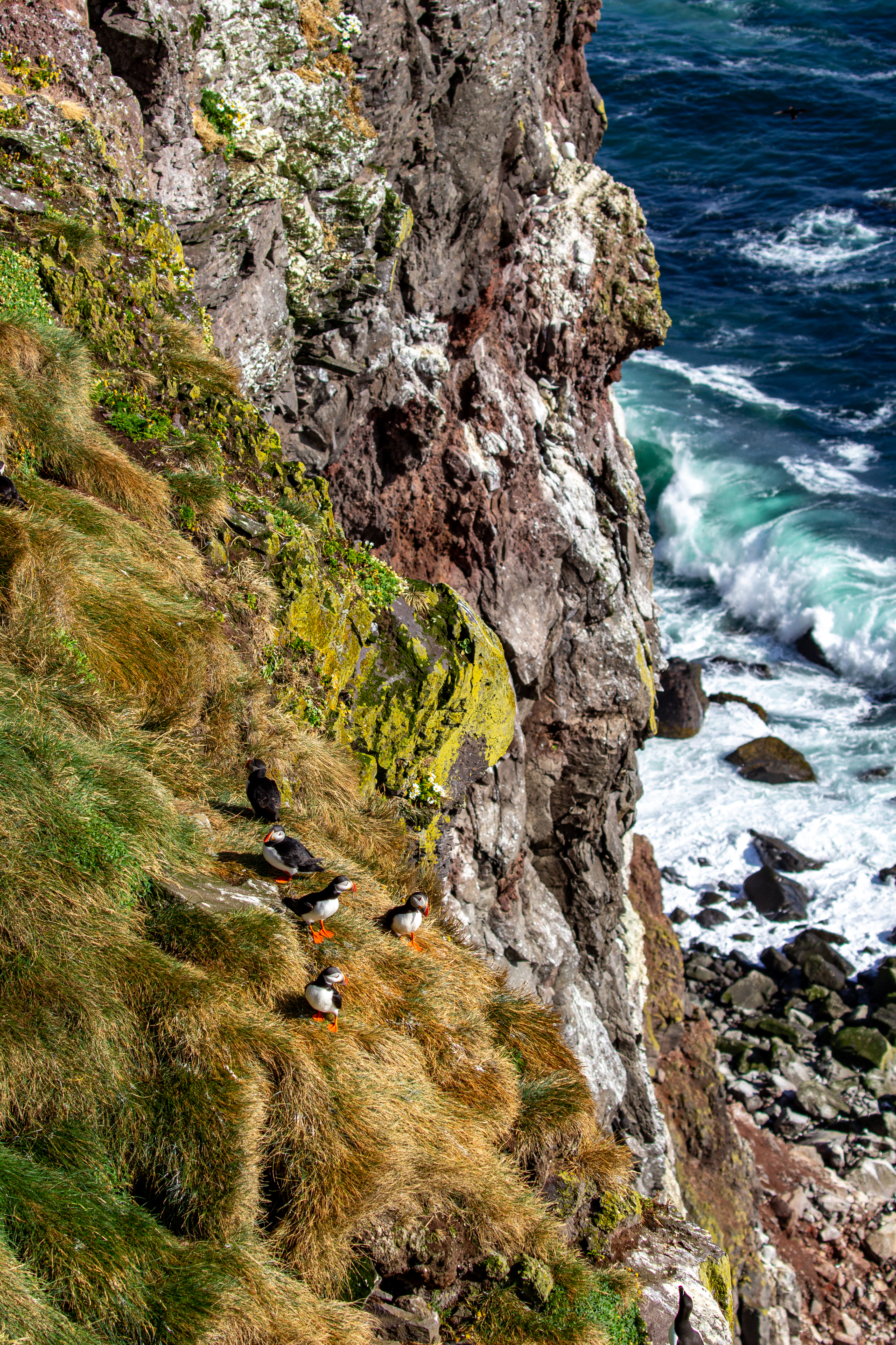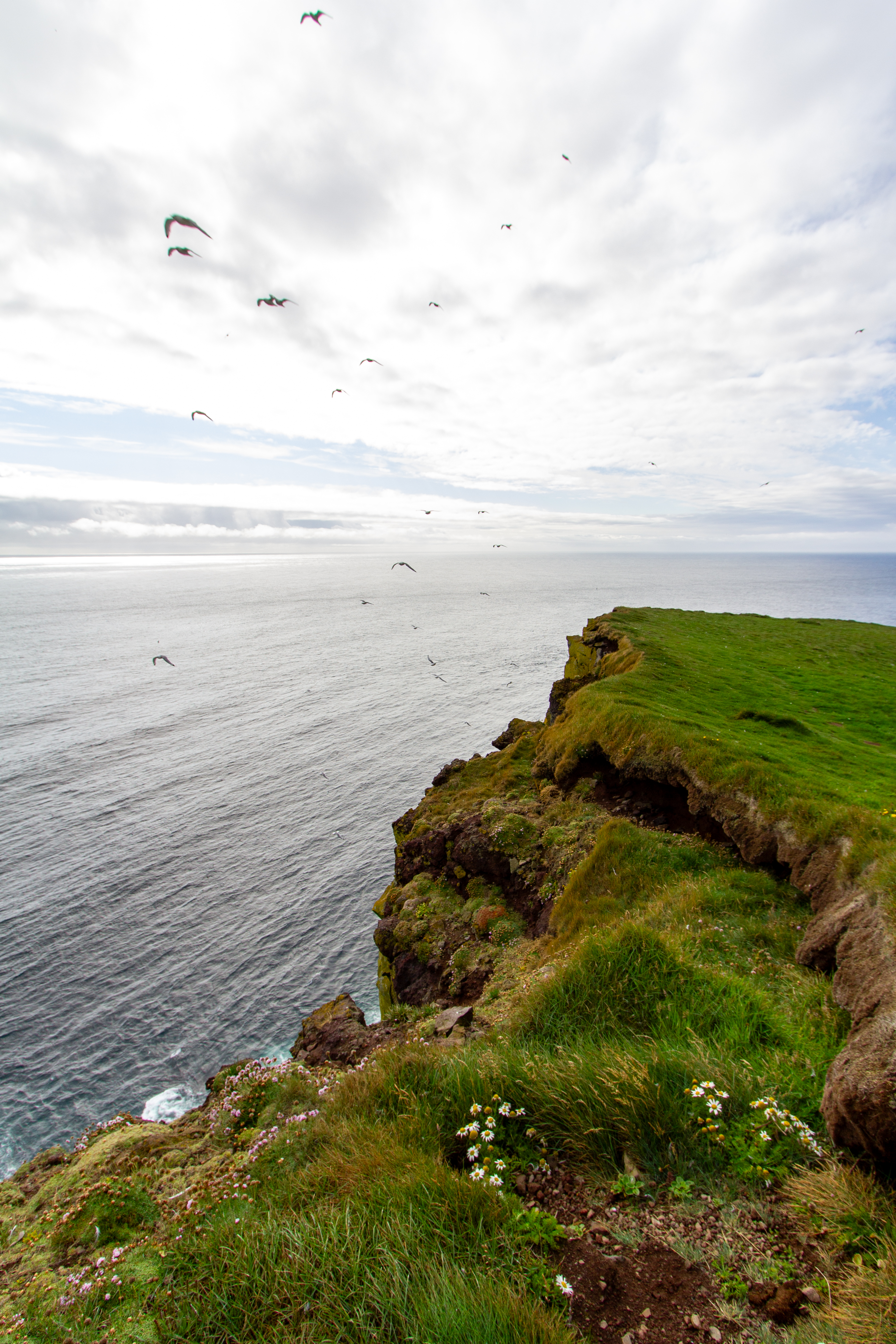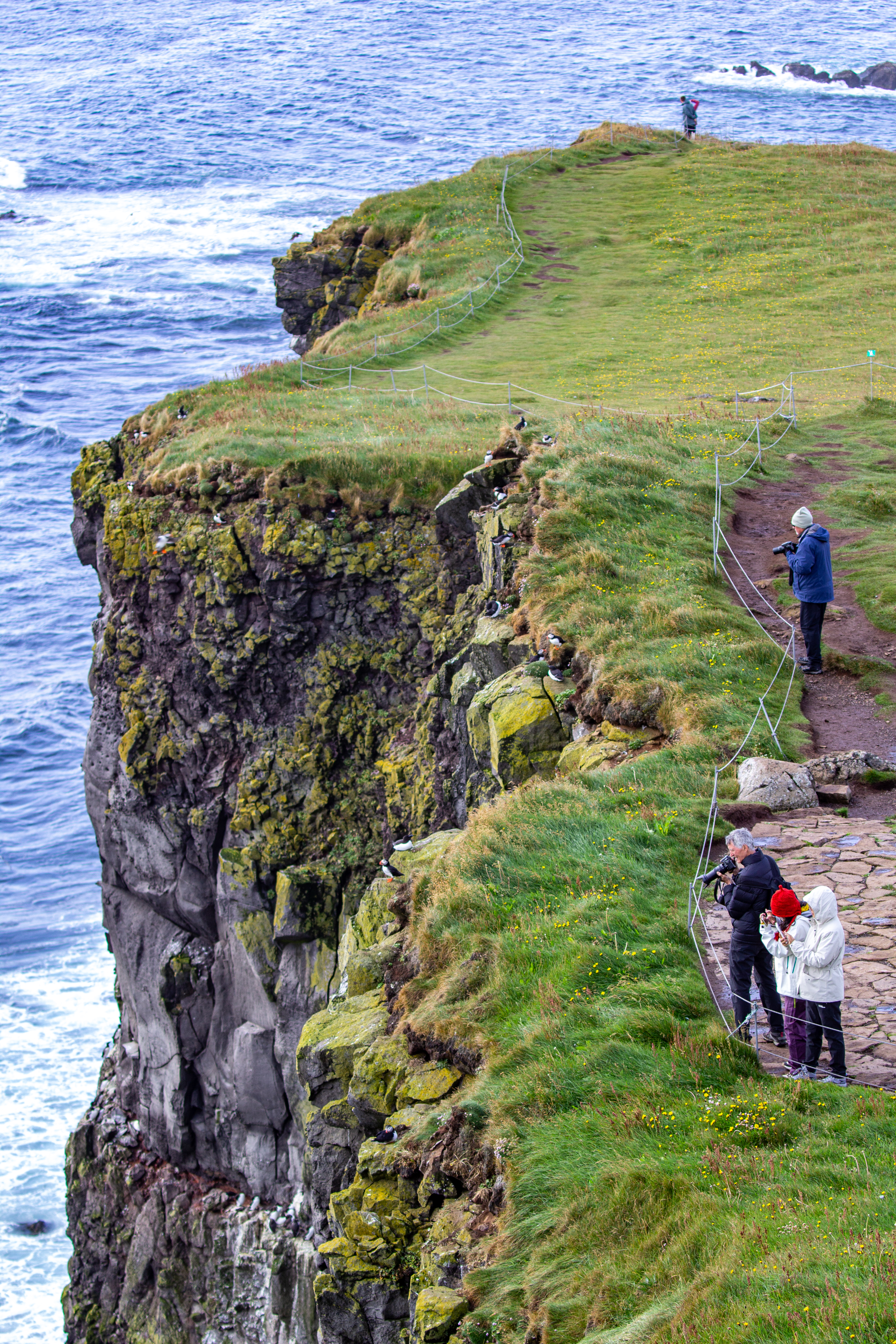 A rainbow appeared right after we got out of the car. It looked gray inland, but on the coast it looked like it might be a nice afternoon. It was a short walk to the cliffs, where we immediately saw puffins and who knows how many other birds. [According to the interwebs, there are millions of birds at Látrabjarg, with razorbills (over 160,000 couples), guillemots (over 225,000 couples), fulmar, kittiwakes, and of course puffins.] It was quite windy right at the cliff’s edge, but the wind was an updraft, which thankfully pushed us away from falling over the cliff.