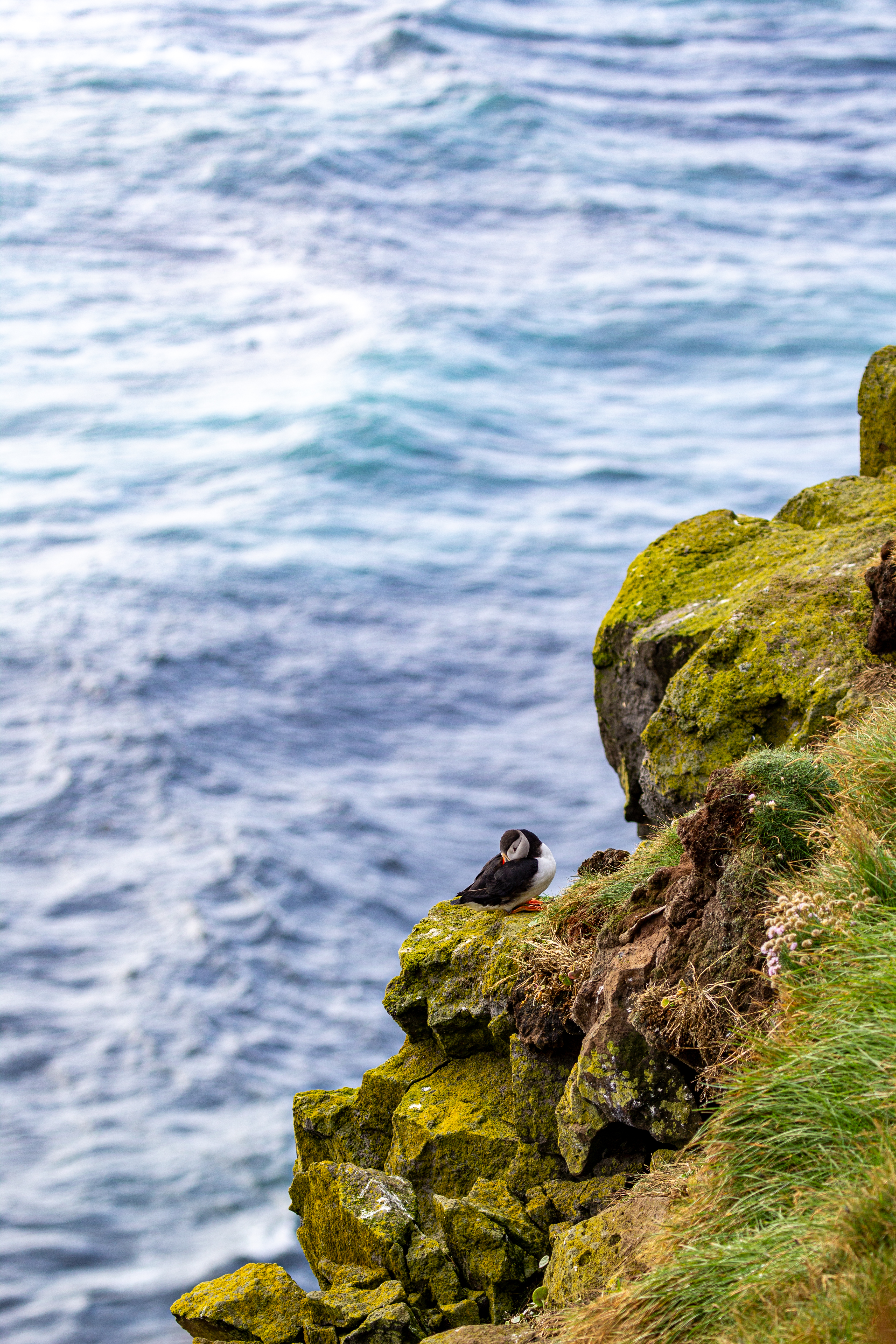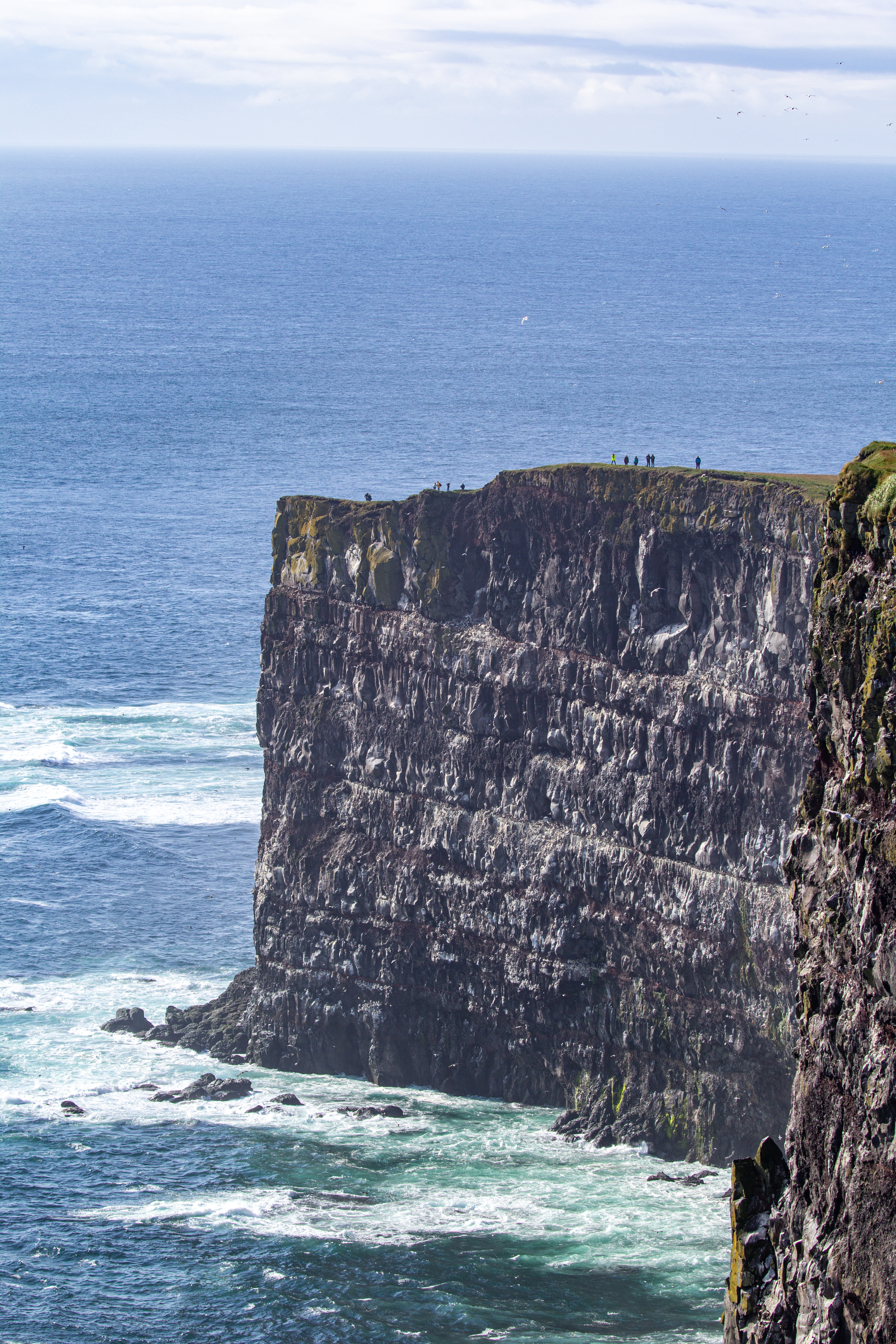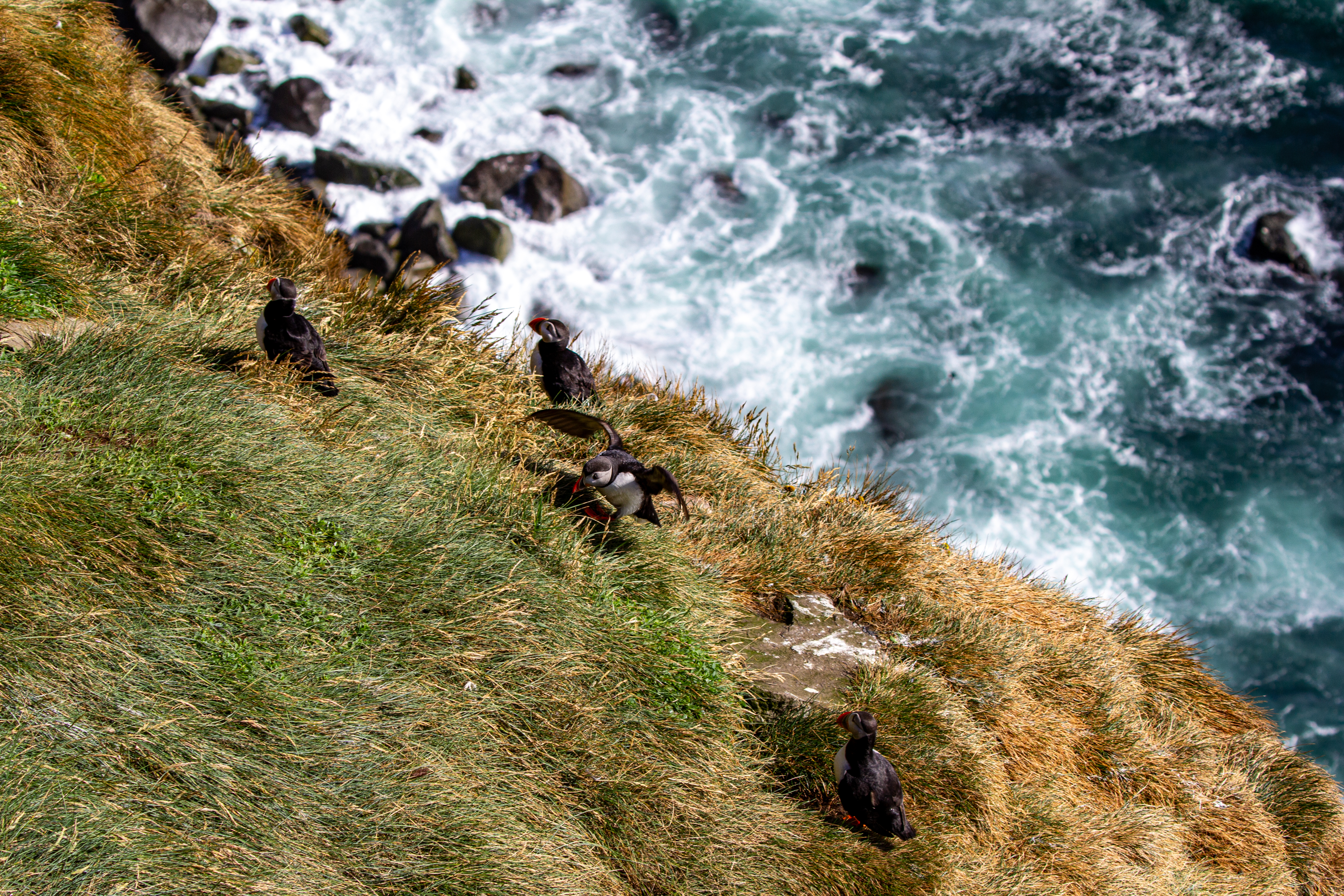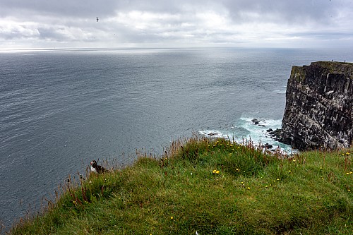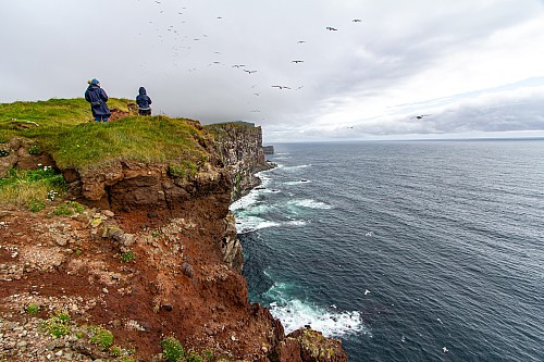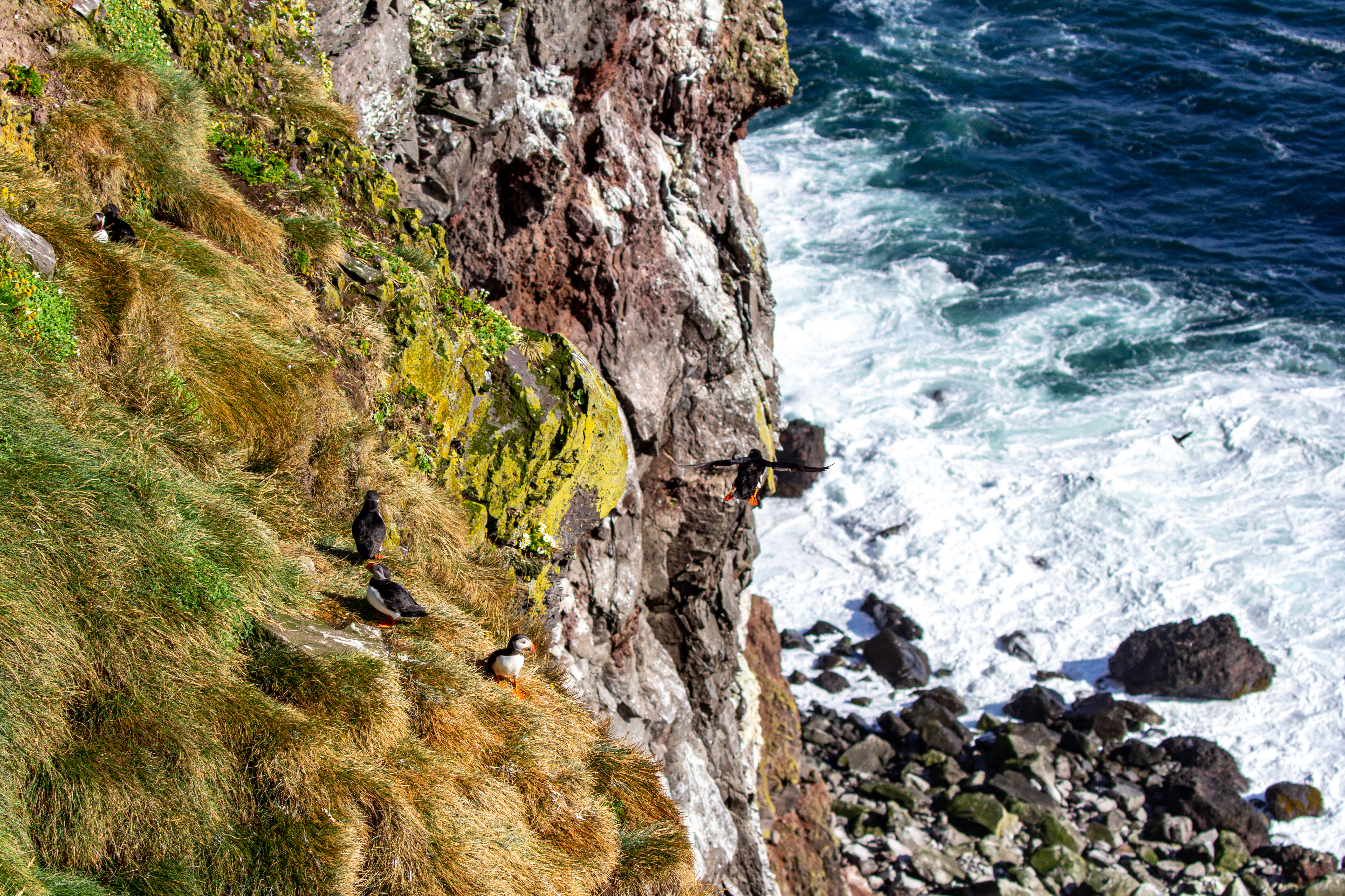 A rainbow appeared right after we got out of the car. It looked gray inland, but on the coast it looked like it might be a nice afternoon. It was a short walk to the cliffs, where we immediately saw puffins and who knows how many other birds. [According to the interwebs, there are millions of birds at Látrabjarg, with razorbills (over 160,000 couples), guillemots (over 225,000 couples), fulmar, kittiwakes, and of course puffins.] It was quite windy right at the cliff’s edge, but the wind was an updraft, which thankfully pushed us away from falling over the cliff.