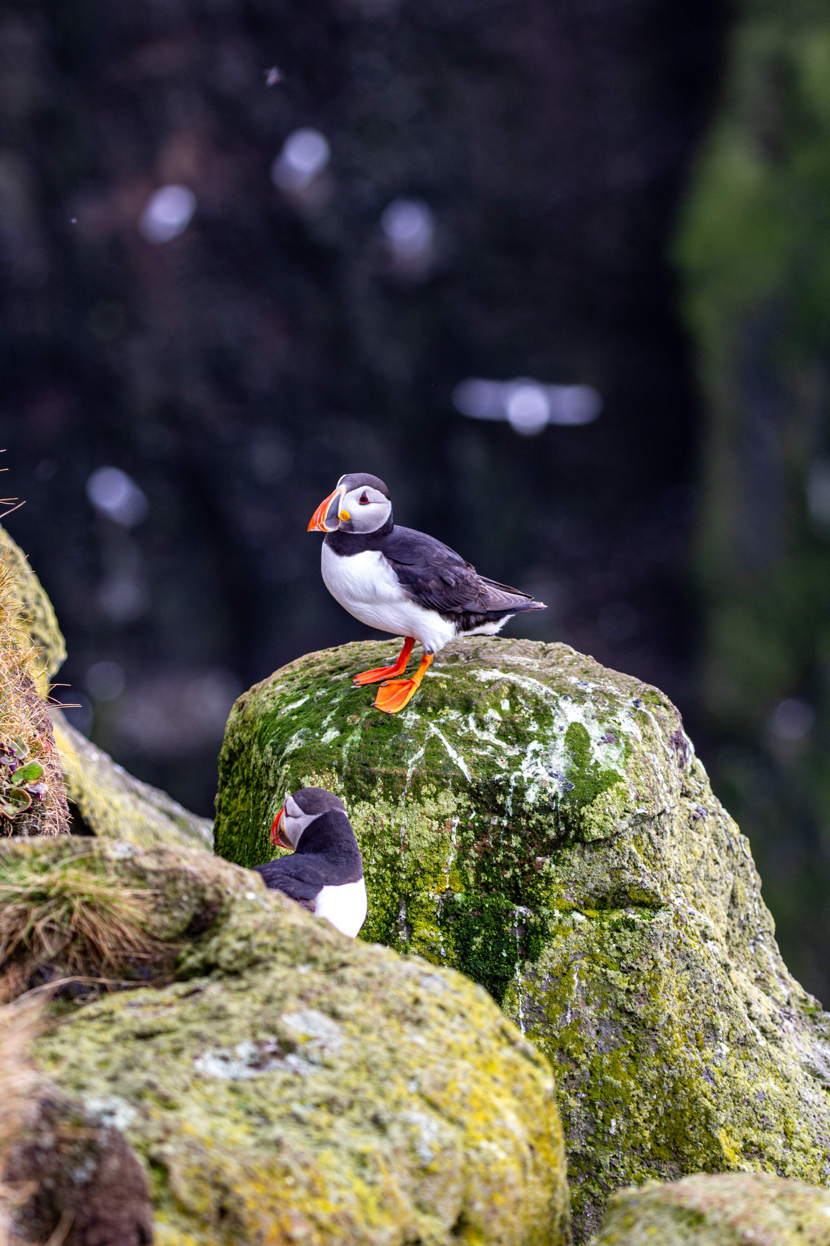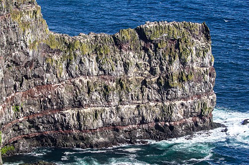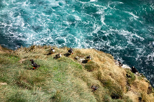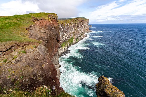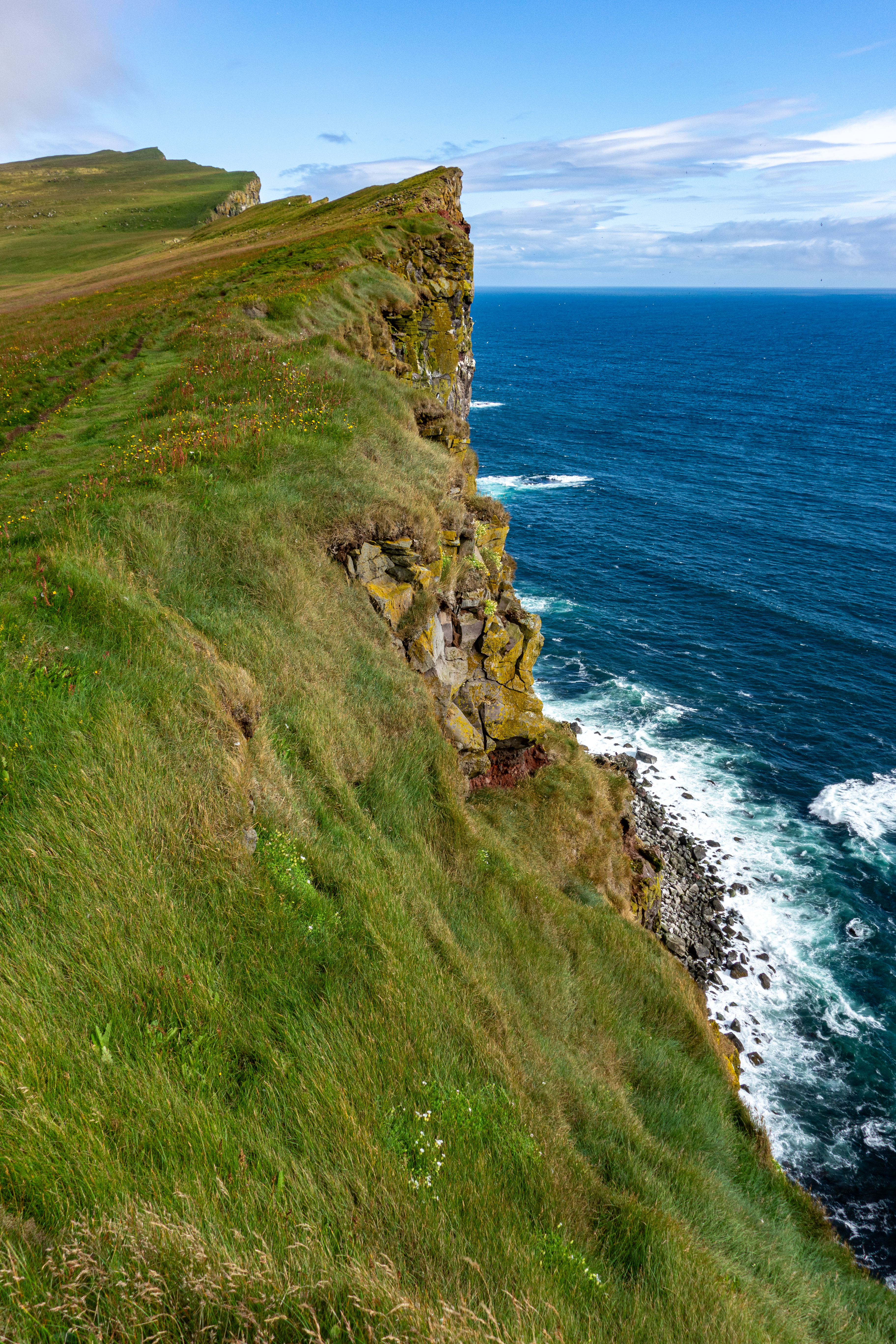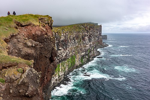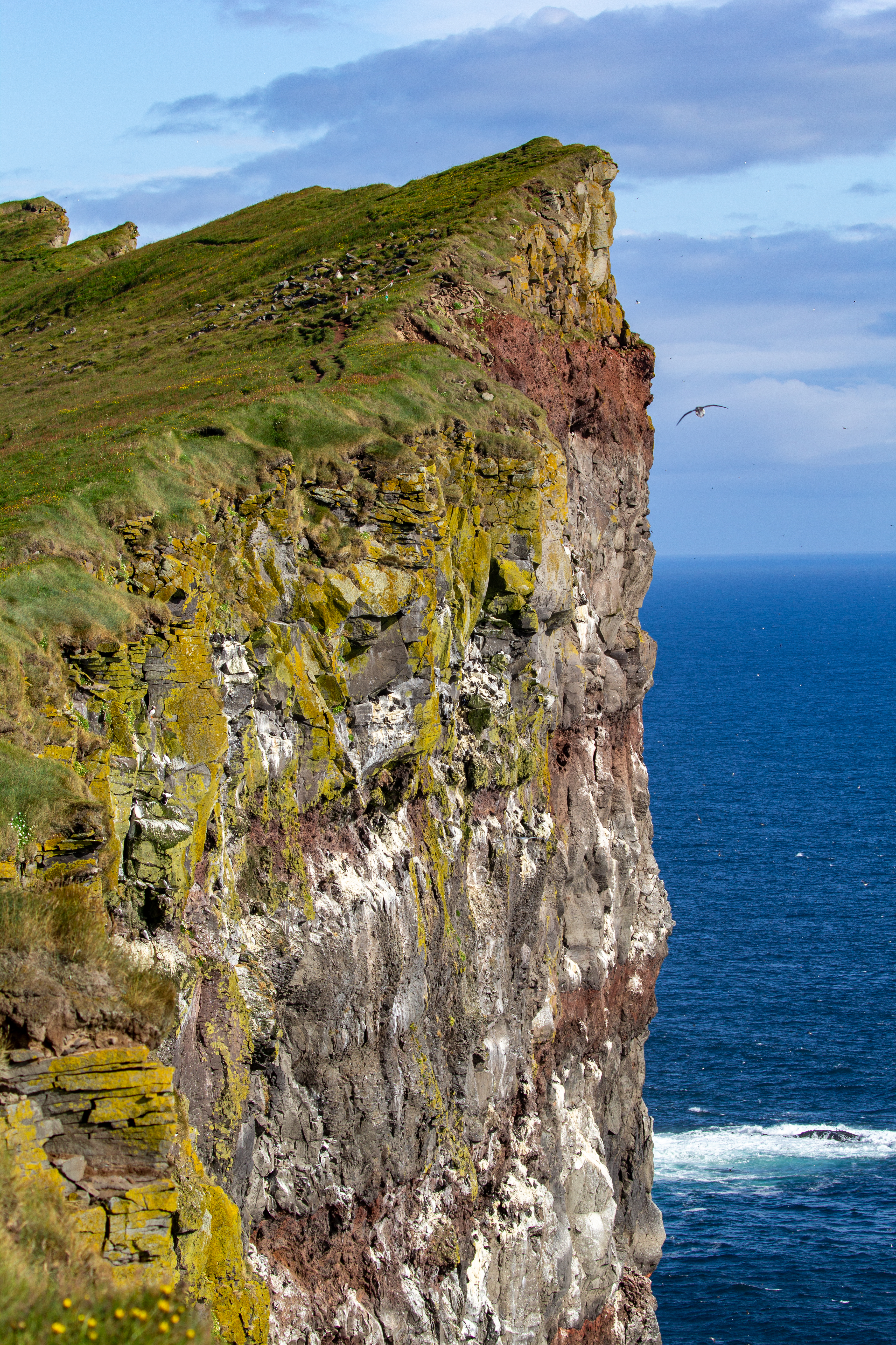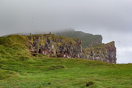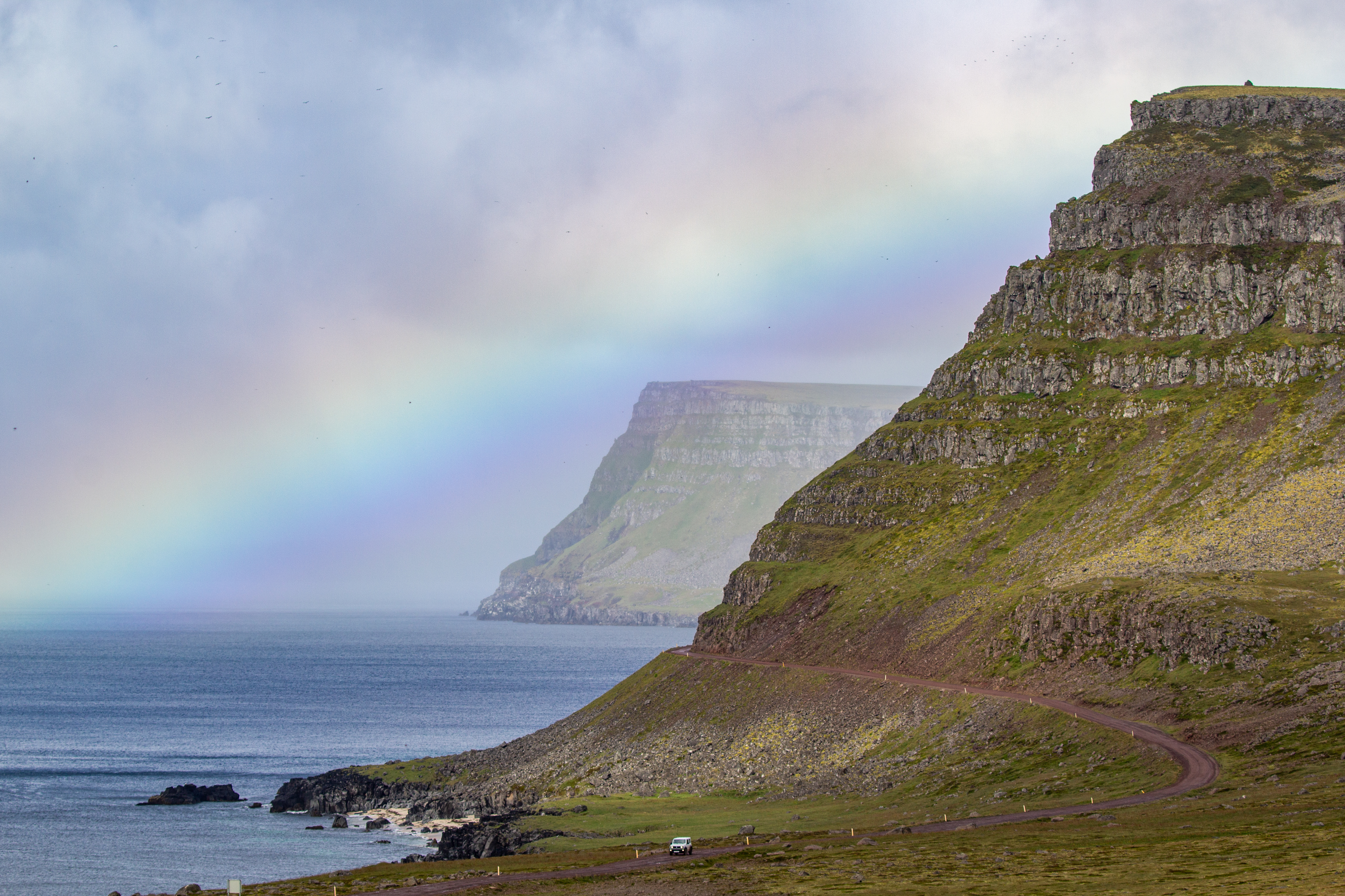 A rainbow appeared right after we got out of the car. It looked gray inland, but on the coast it looked like it might be a nice afternoon. It was a short walk to the cliffs, where we immediately saw puffins and who knows how many other birds. [According to the interwebs, there are millions of birds at Látrabjarg, with razorbills (over 160,000 couples), guillemots (over 225,000 couples), fulmar, kittiwakes, and of course puffins.] It was quite windy right at the cliff’s edge, but the wind was an updraft, which thankfully pushed us away from falling over the cliff.