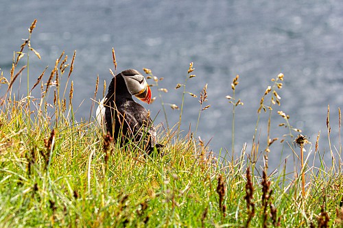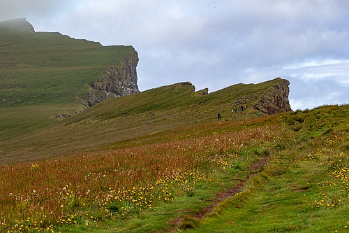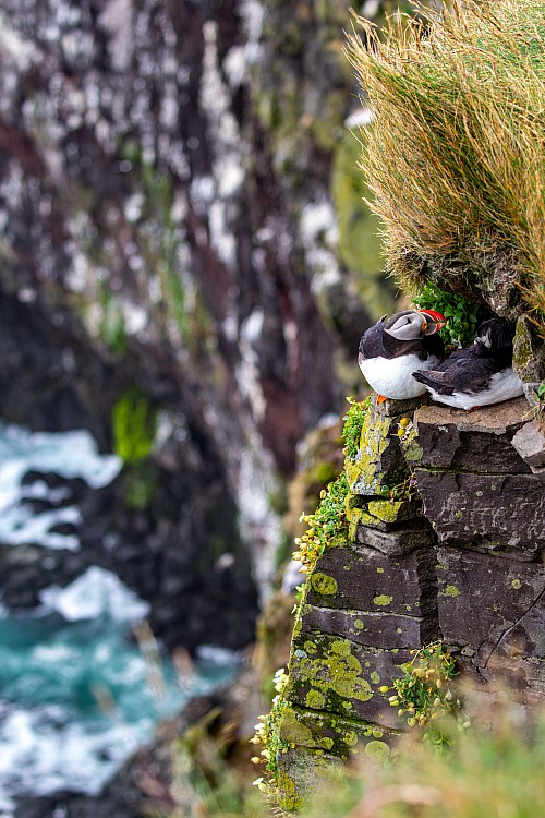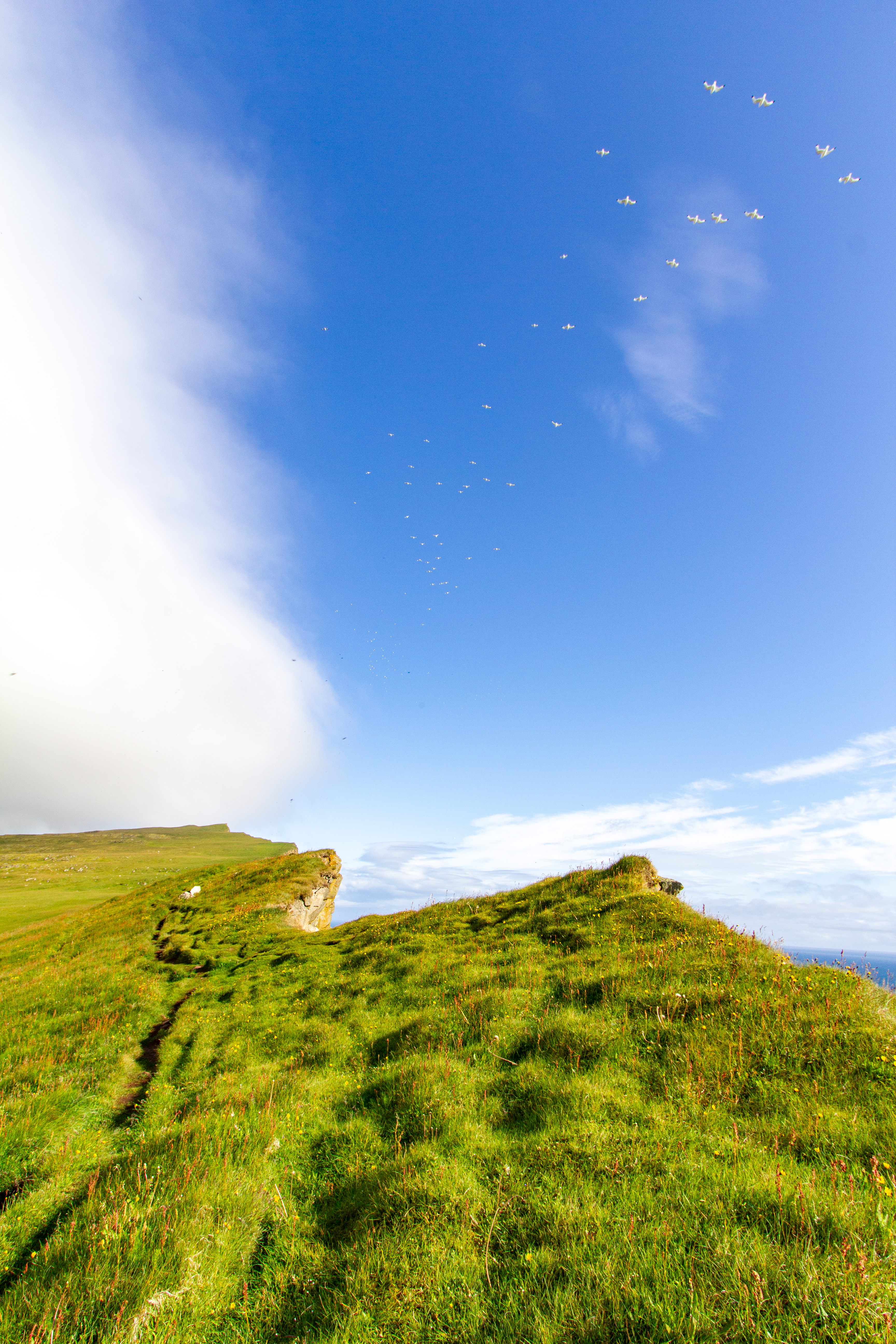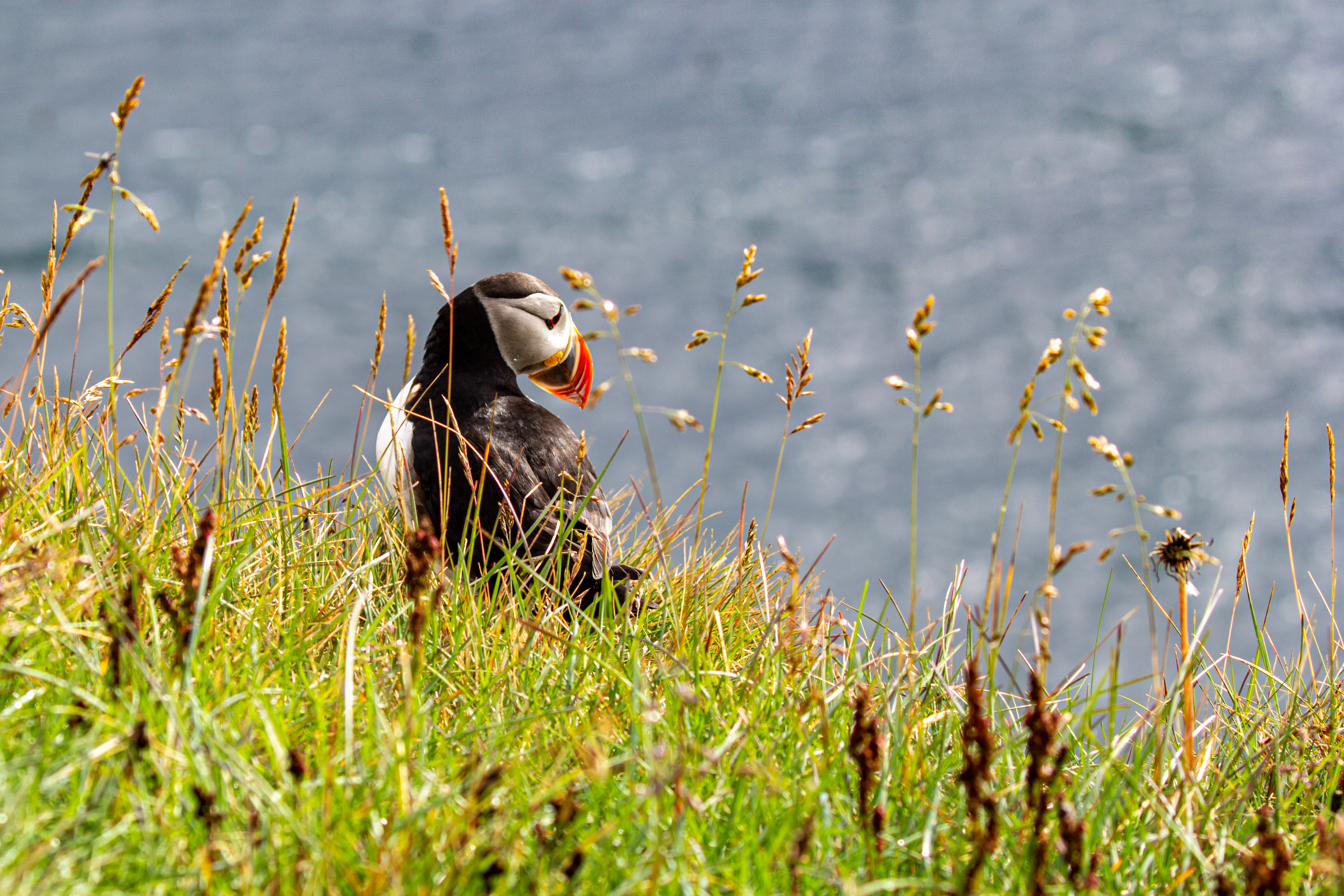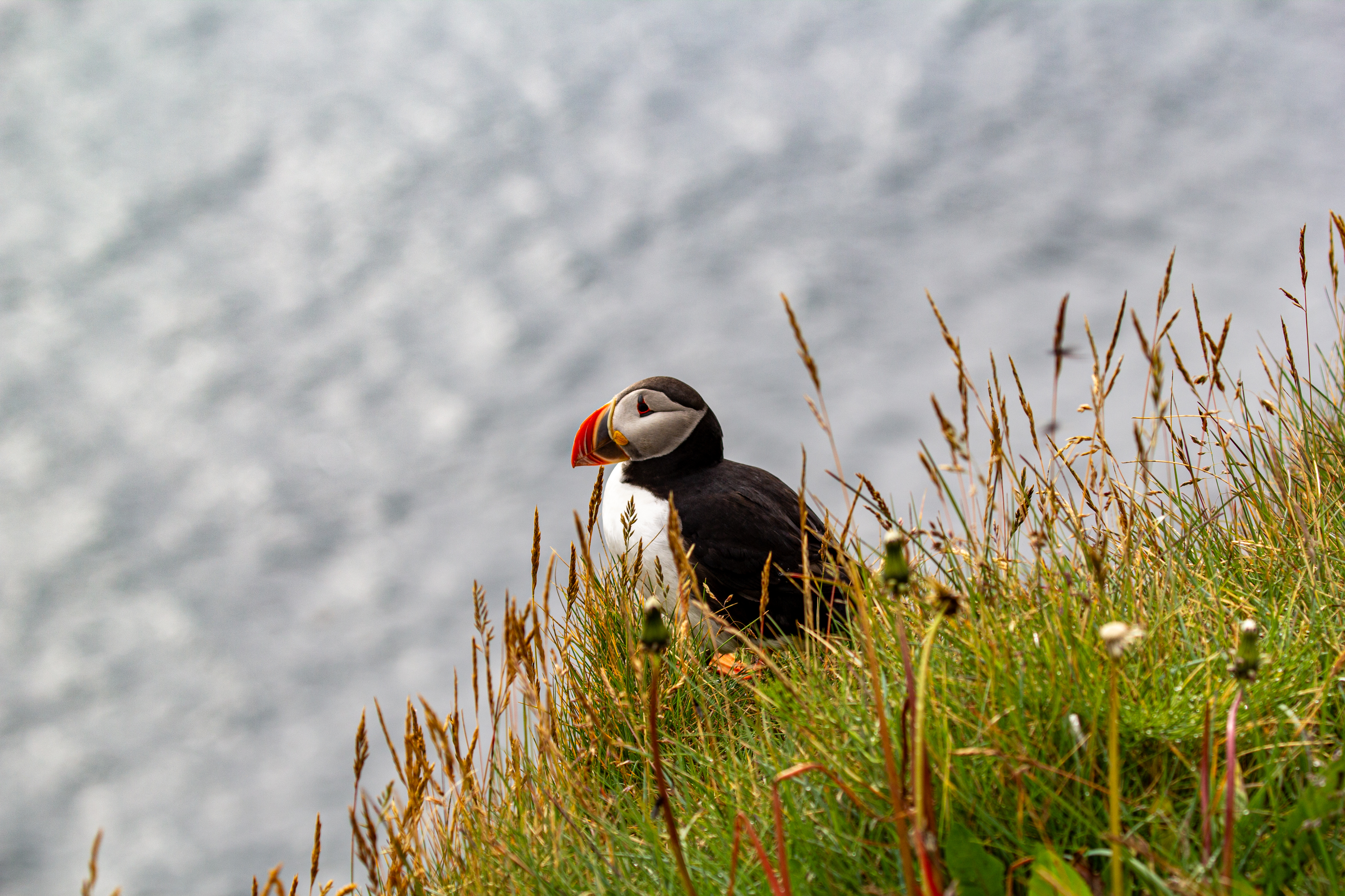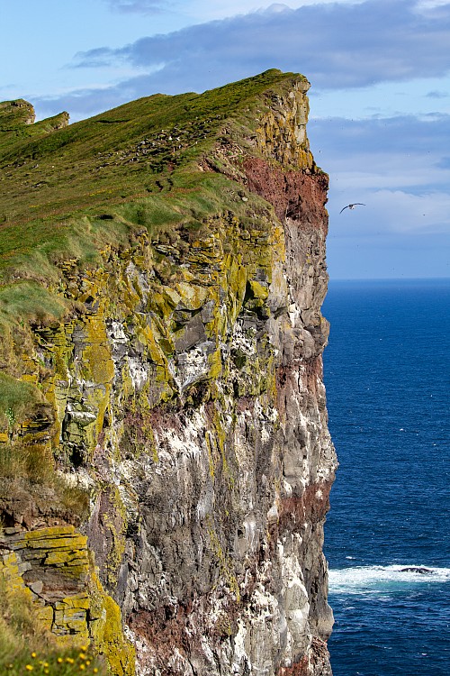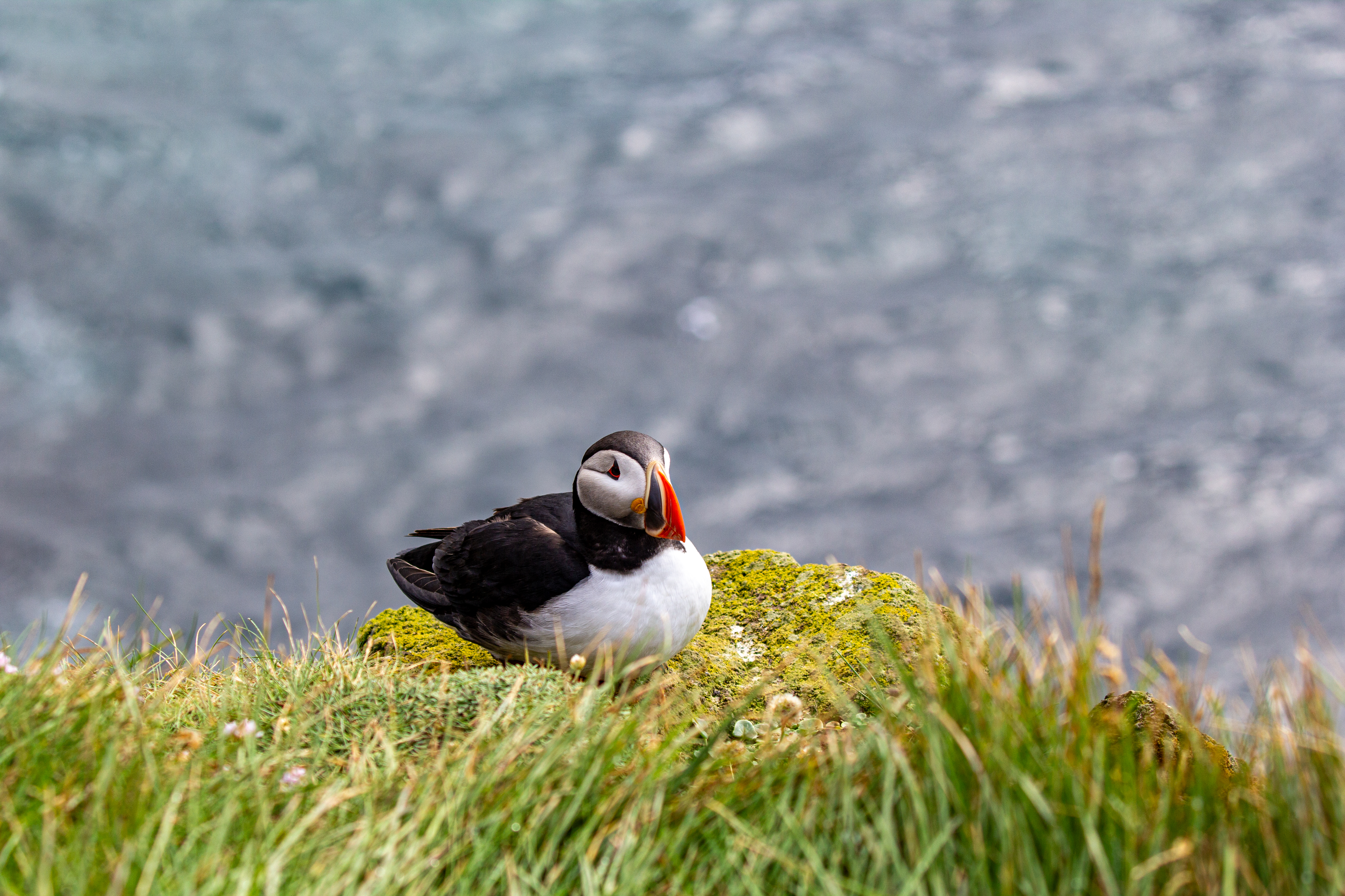 A rainbow appeared right after we got out of the car. It looked gray inland, but on the coast it looked like it might be a nice afternoon. It was a short walk to the cliffs, where we immediately saw puffins and who knows how many other birds. [According to the interwebs, there are millions of birds at Látrabjarg, with razorbills (over 160,000 couples), guillemots (over 225,000 couples), fulmar, kittiwakes, and of course puffins.] It was quite windy right at the cliff’s edge, but the wind was an updraft, which thankfully pushed us away from falling over the cliff.