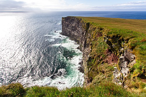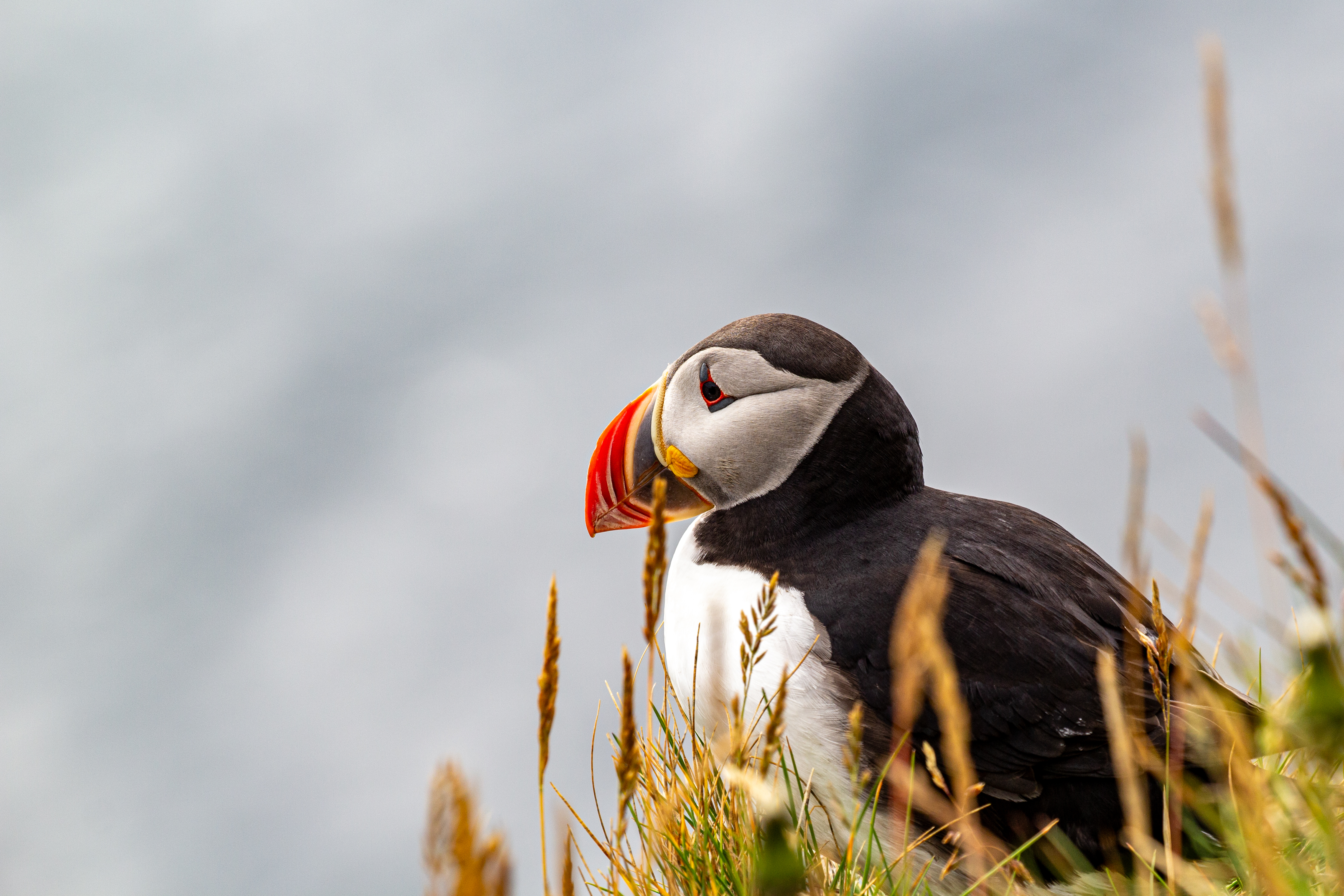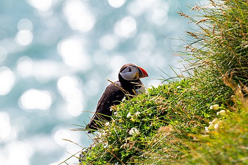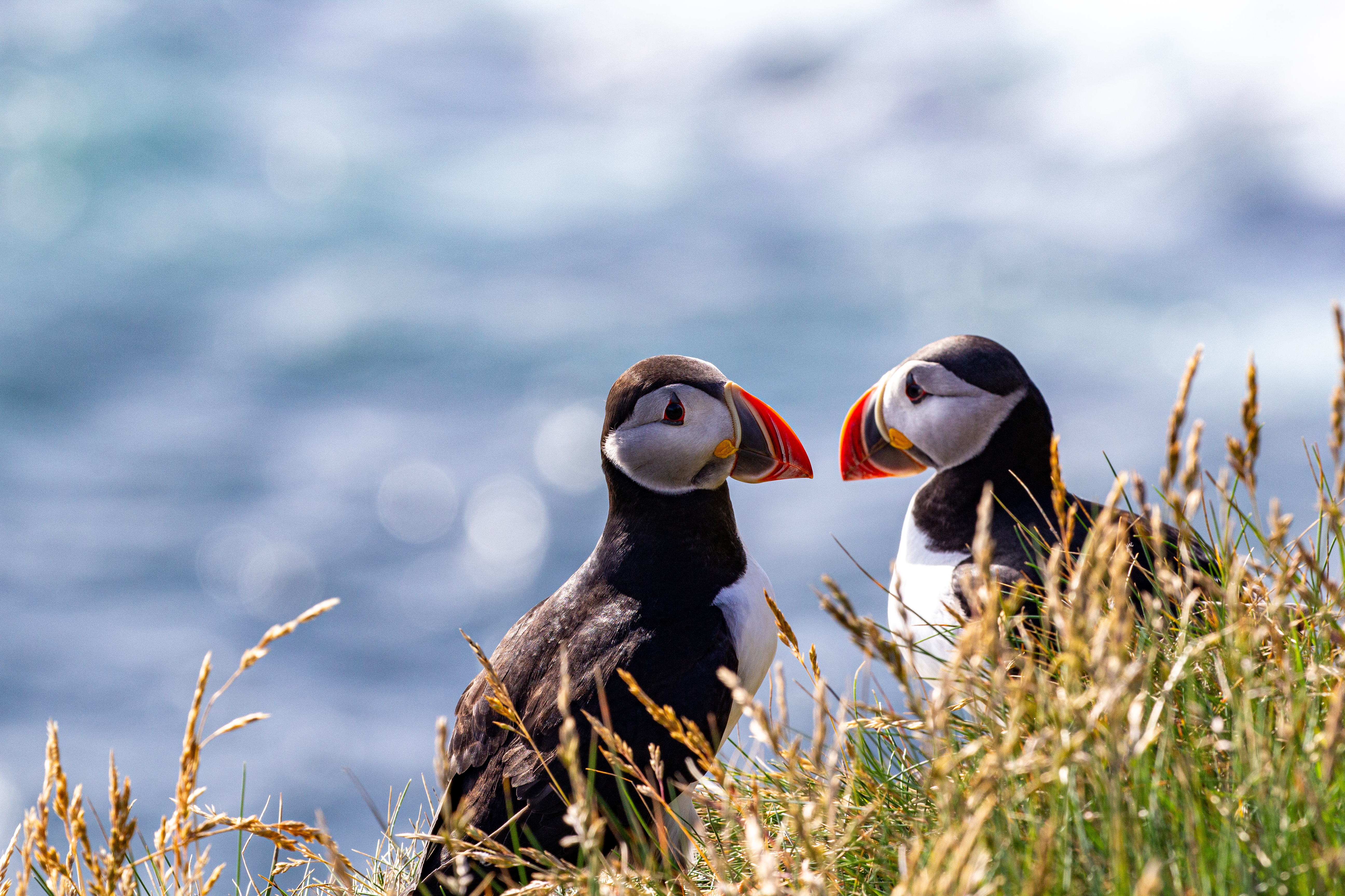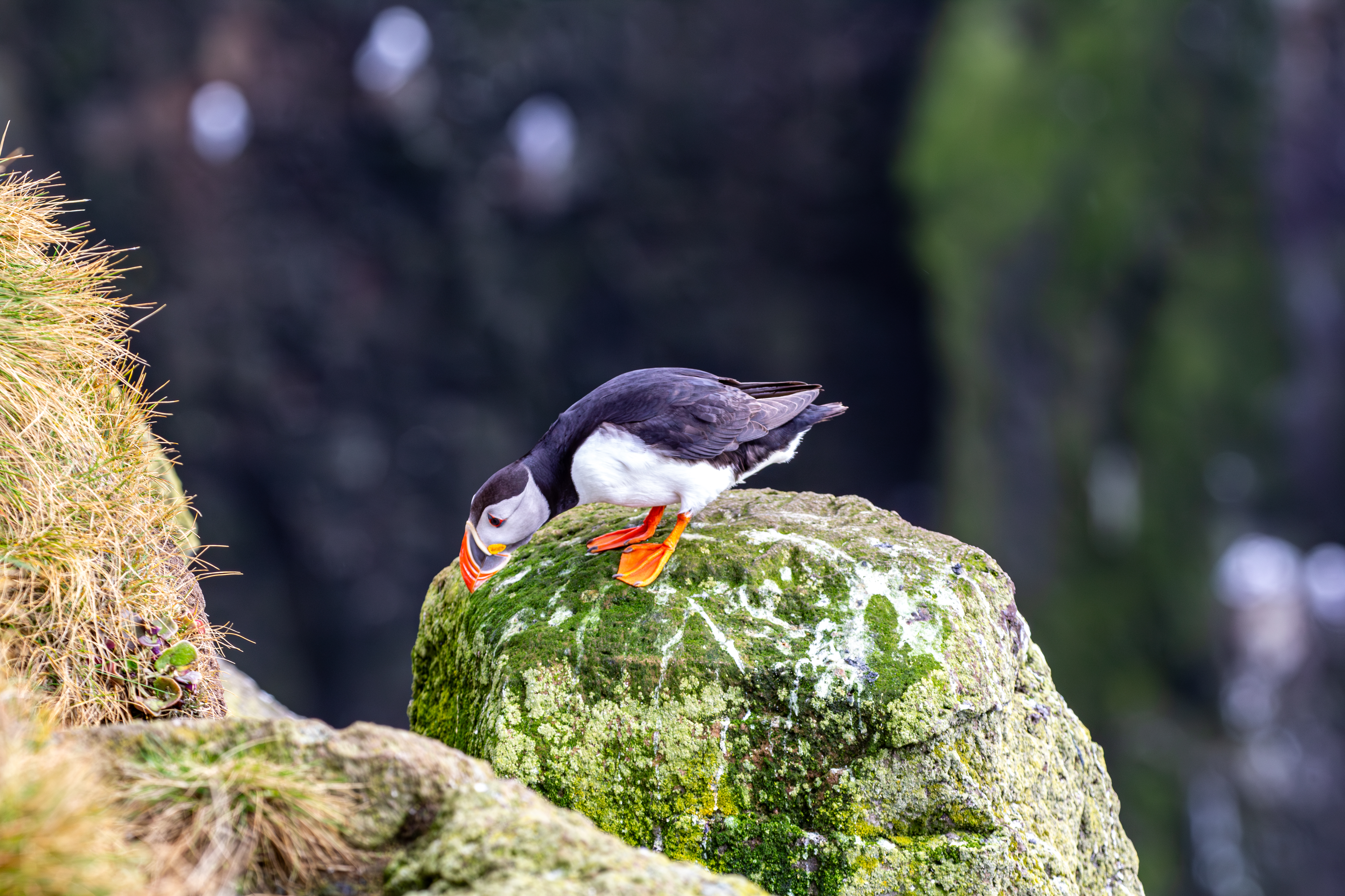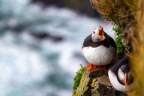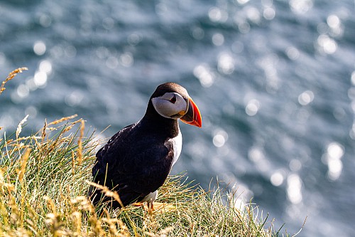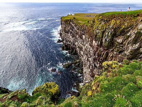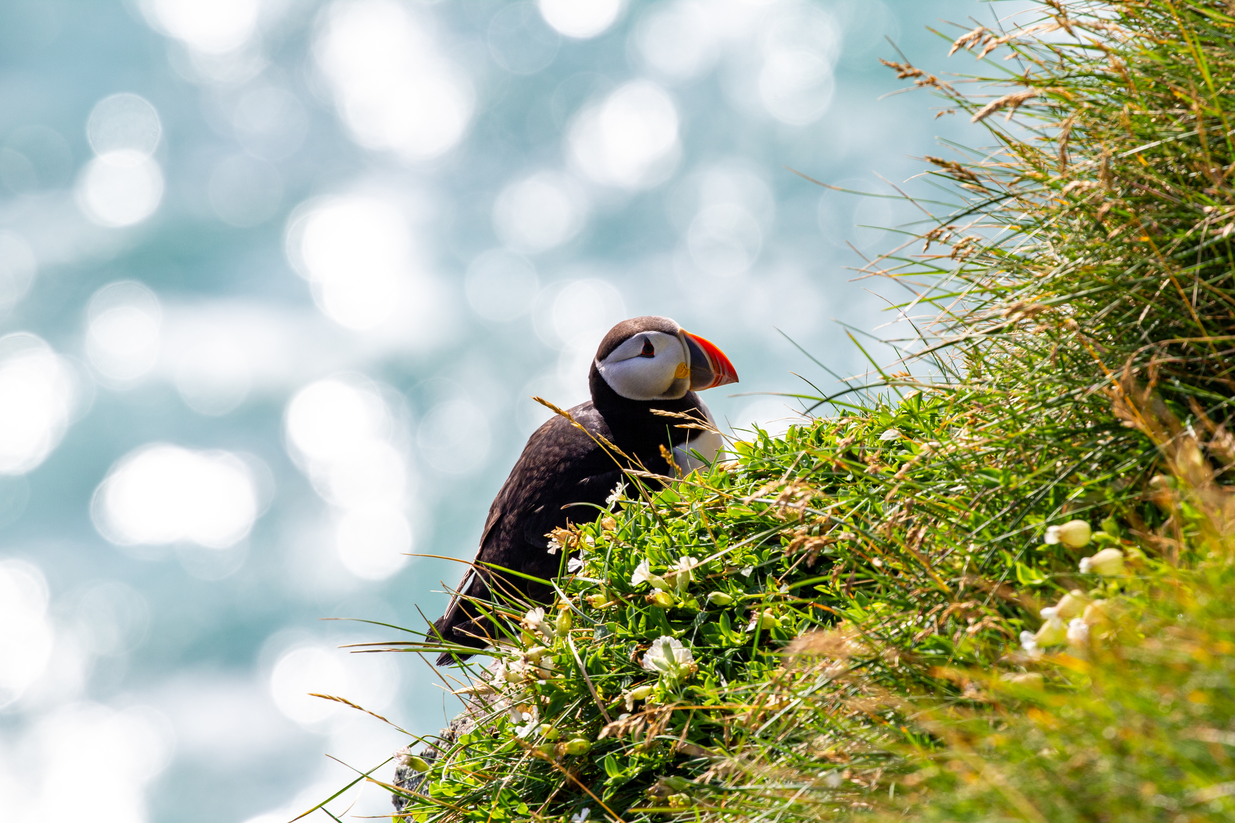 A rainbow appeared right after we got out of the car. It looked gray inland, but on the coast it looked like it might be a nice afternoon. It was a short walk to the cliffs, where we immediately saw puffins and who knows how many other birds. [According to the interwebs, there are millions of birds at Látrabjarg, with razorbills (over 160,000 couples), guillemots (over 225,000 couples), fulmar, kittiwakes, and of course puffins.] It was quite windy right at the cliff’s edge, but the wind was an updraft, which thankfully pushed us away from falling over the cliff.