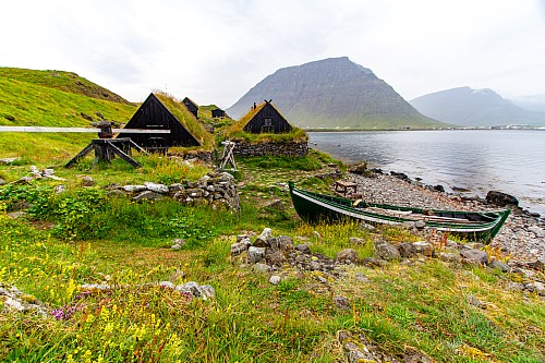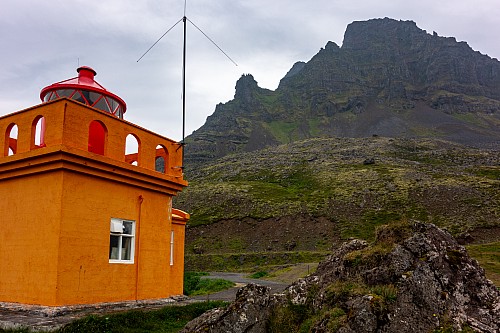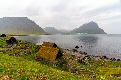 We got up this morning without an alarm, a little before 07:00. We got ready a little slower than usual, as we had less on our plate today than the past several. It was cloudy outside, but not low clouds today, so we could actually see the mountaintops around town. Our first stop was on the other side of town, at a place with three houses with grass roofs, Ósvör Maritime Museum. In the same area was an orange lighthouse, Óshólar Lighthouse. Justin wandered down to the lighthouse, and Crystal wondered where Justin had wandered off to.