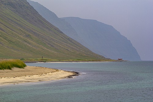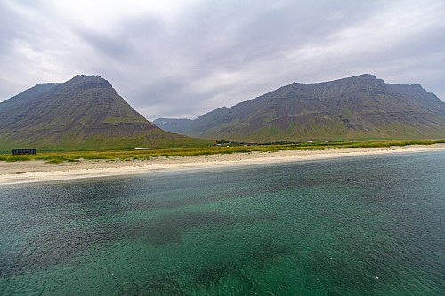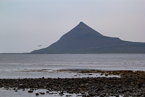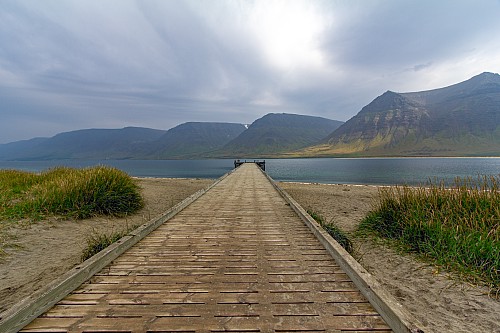 After leaving town, we went through another tunnel, and came out on the west coast of the Westfjords. Yesterday we’d been on the northern side of the Westfjords most of the day. We stopped not far from where we came out of the tunnel, at Önundarfjörður Pier, in Holt. We’re not sure what the pier was most commonly used for, as there were no boats nearby, but the pier was in great condition, and the views from there were phenomenal. Like a couple of other places we’d seen around the island, from the pictures alone, one might think they were from Hawaii. Justin thought he saw the bird with the curved peak, the Ibis, that Crystal thinks she saw in Hella, but according to Google, it was a Whimbrel. [Of course, this could’ve been what Crystal saw in Hella.]