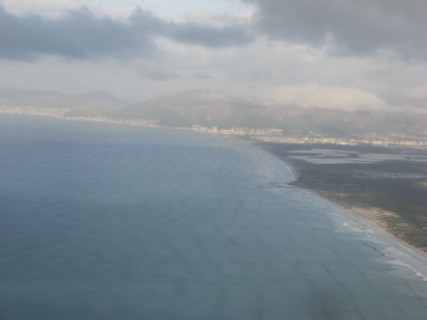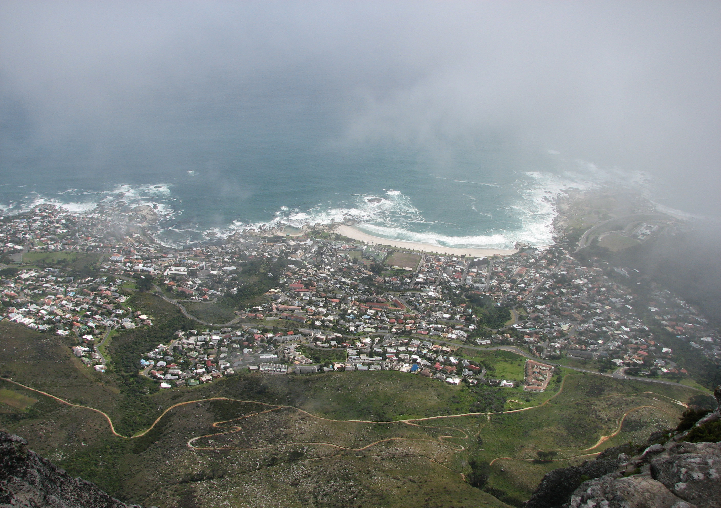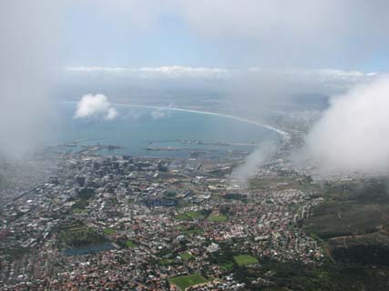 We awoke when the plane was somewhere off the Namibian coast, an hour or two from Cape Town. The sun was not quite up yet, but bit by bit the sky started to brighten as we approached the Cape. Unfortunately, as we started our approach we began to see clouds, clouds that had not been present at all near Namibia or northern South Africa. While technically it was still winter in Cape Town, we had checked the weather reports several times before we left home, and the weather was supposed to be sunny and mild during our time there. We flew right over the Cape Peninsula (south of Cape Town), circled around False Bay (seeing Seal Island), and came into the airport from the south.