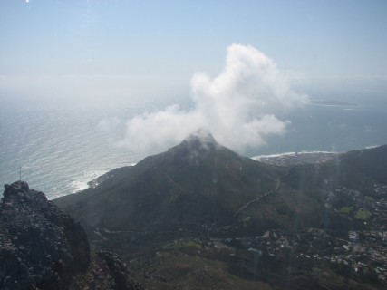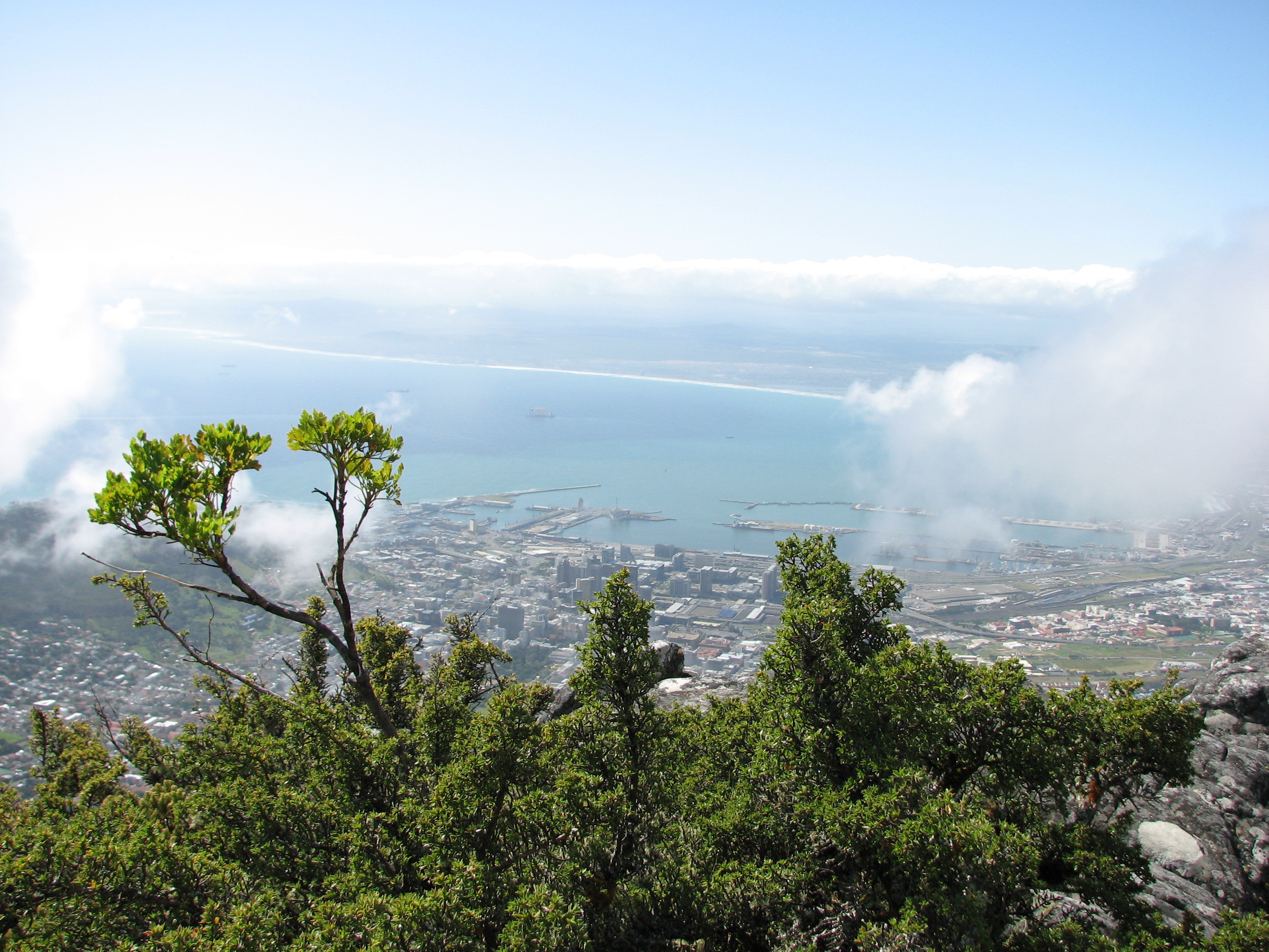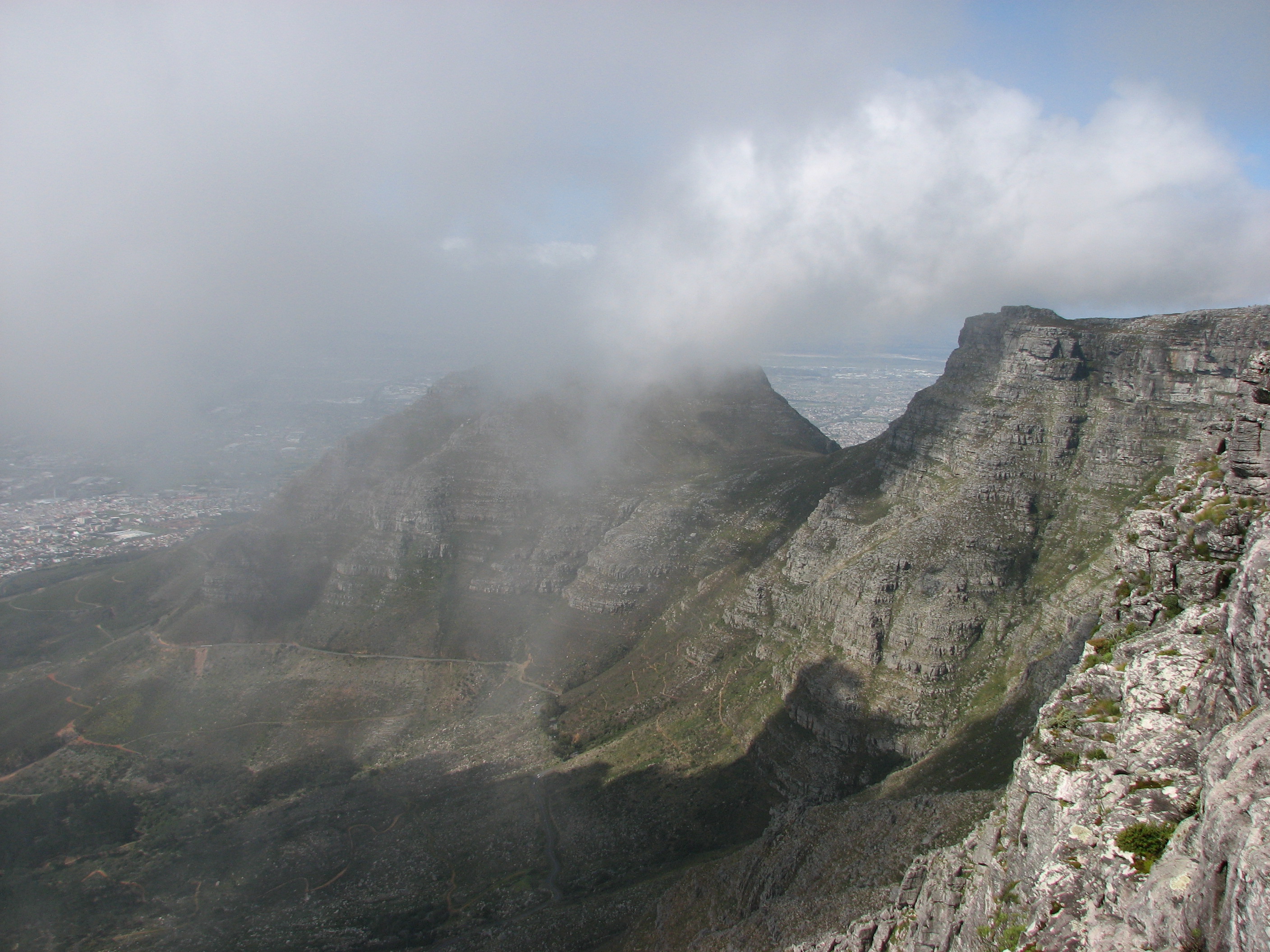 It was much colder at the top, and also much more cloudy. Fortunately, the clouds were getting blown around and offered moments of sunshine before new clouds rolled in. From the top there were great views of the city bowl, Lion's Head, and the West Coast. Occasionally it cleared up enough to see much of the rest of the city past Devil's Peak.