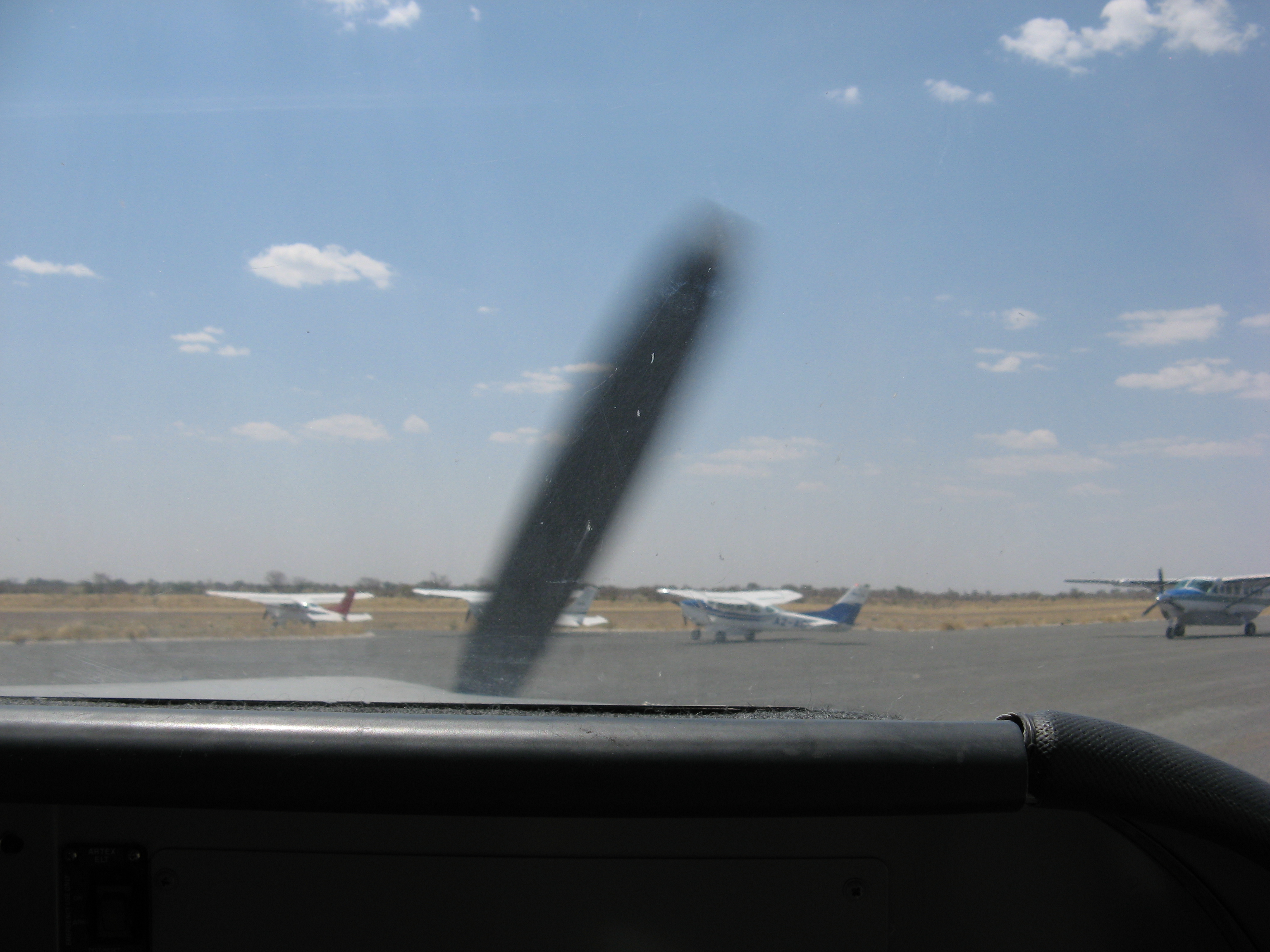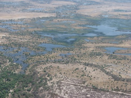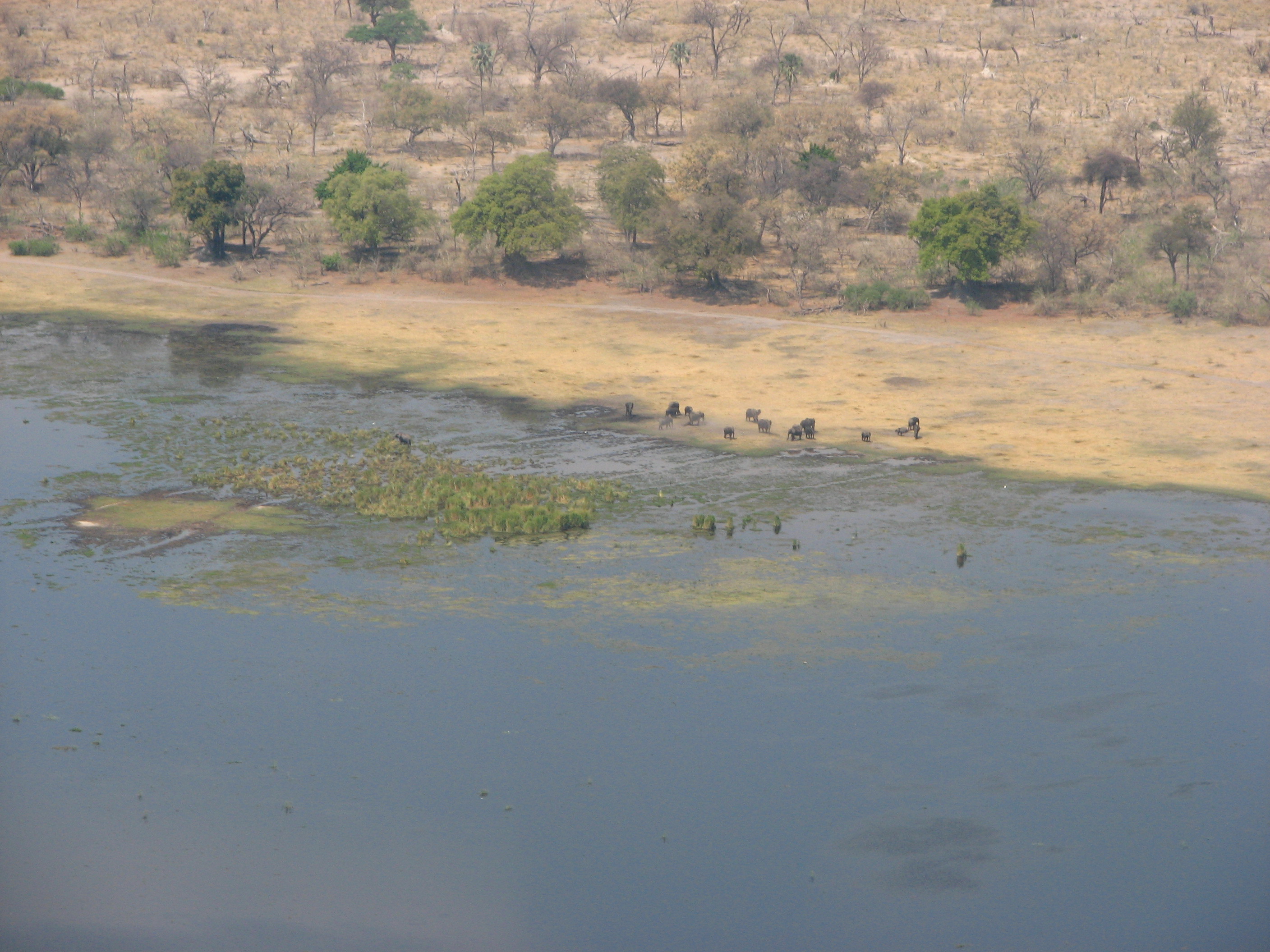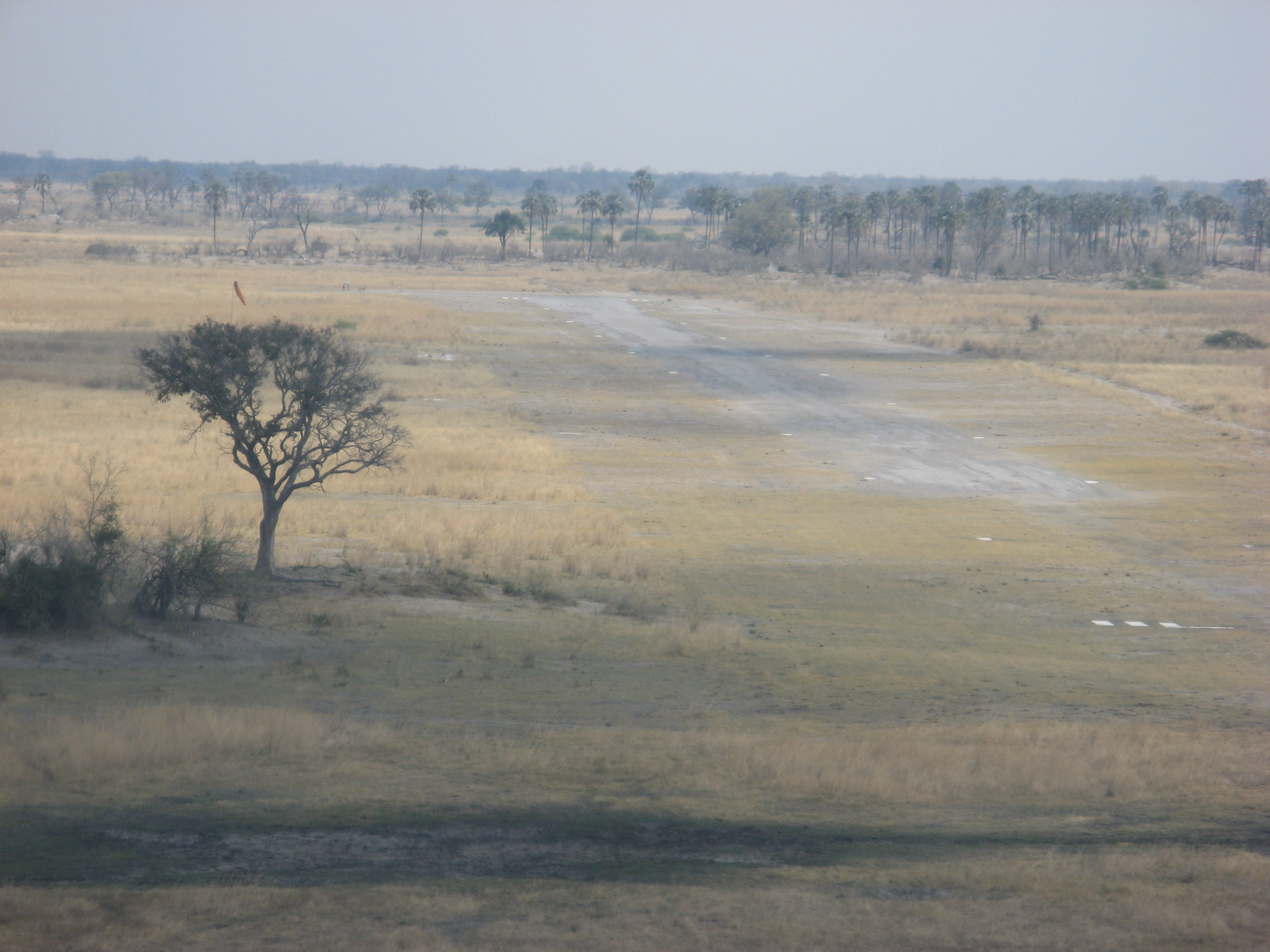 The flight was less than an hour, but was pretty turbulent because of the heat. Both Crystal and Justin's mom got airsick, although Crystal was a trooper and actually managed to get a photo of the landing strip with one hand while holding the airsick bag with the other. On the flight we got some views of the Okavango Delta area, but it was mostly dried Mopane forest. September is towards the end of the dry season in Botswana, which has rain from October (or November) through April, and is dry the rest of the time. Shortly after takeoff Justin saw some elephants and giraffes, but there was nothing else in sight until shortly before landing, when we saw elephants, and Justin's parents saw hippos as well.