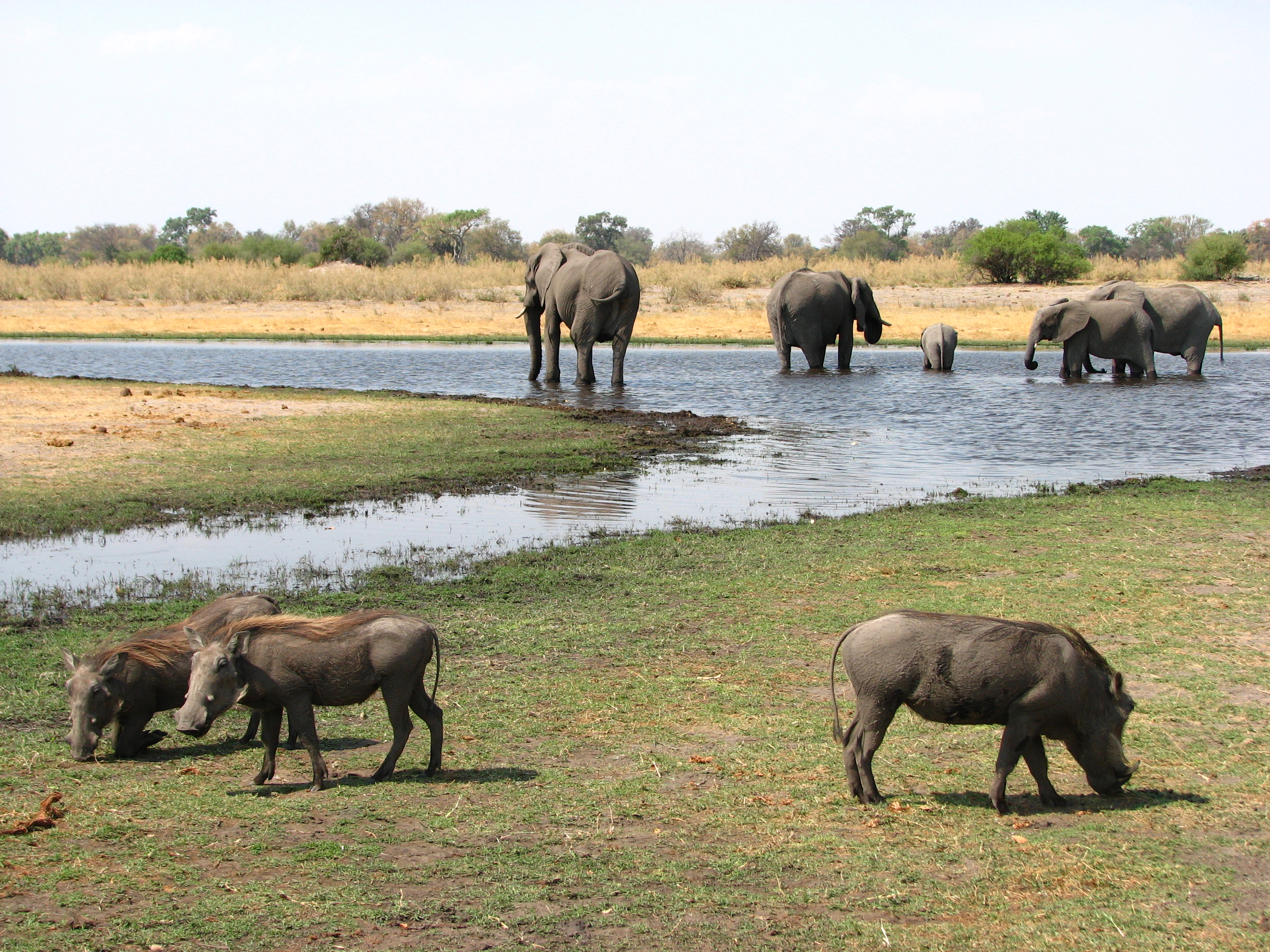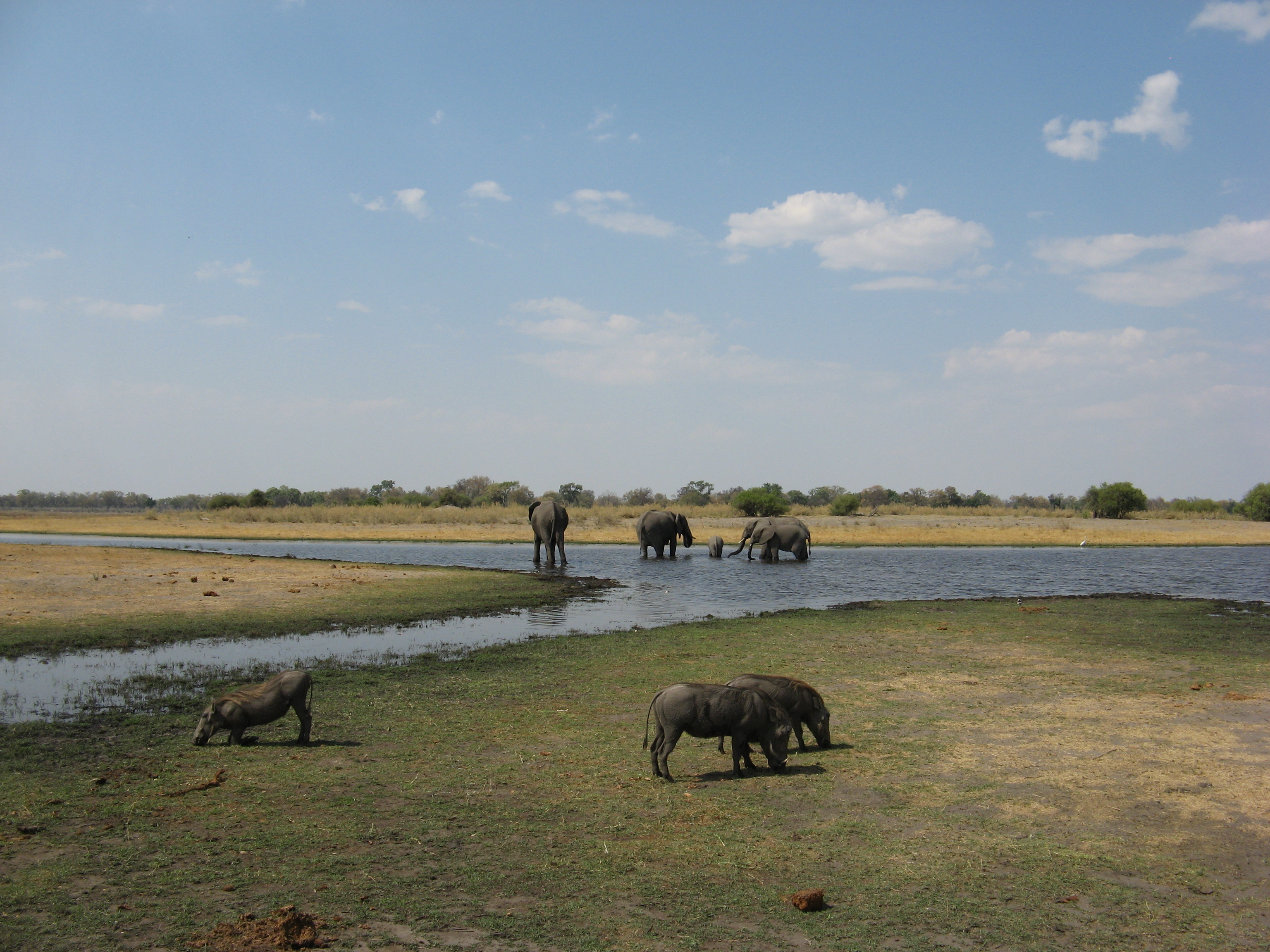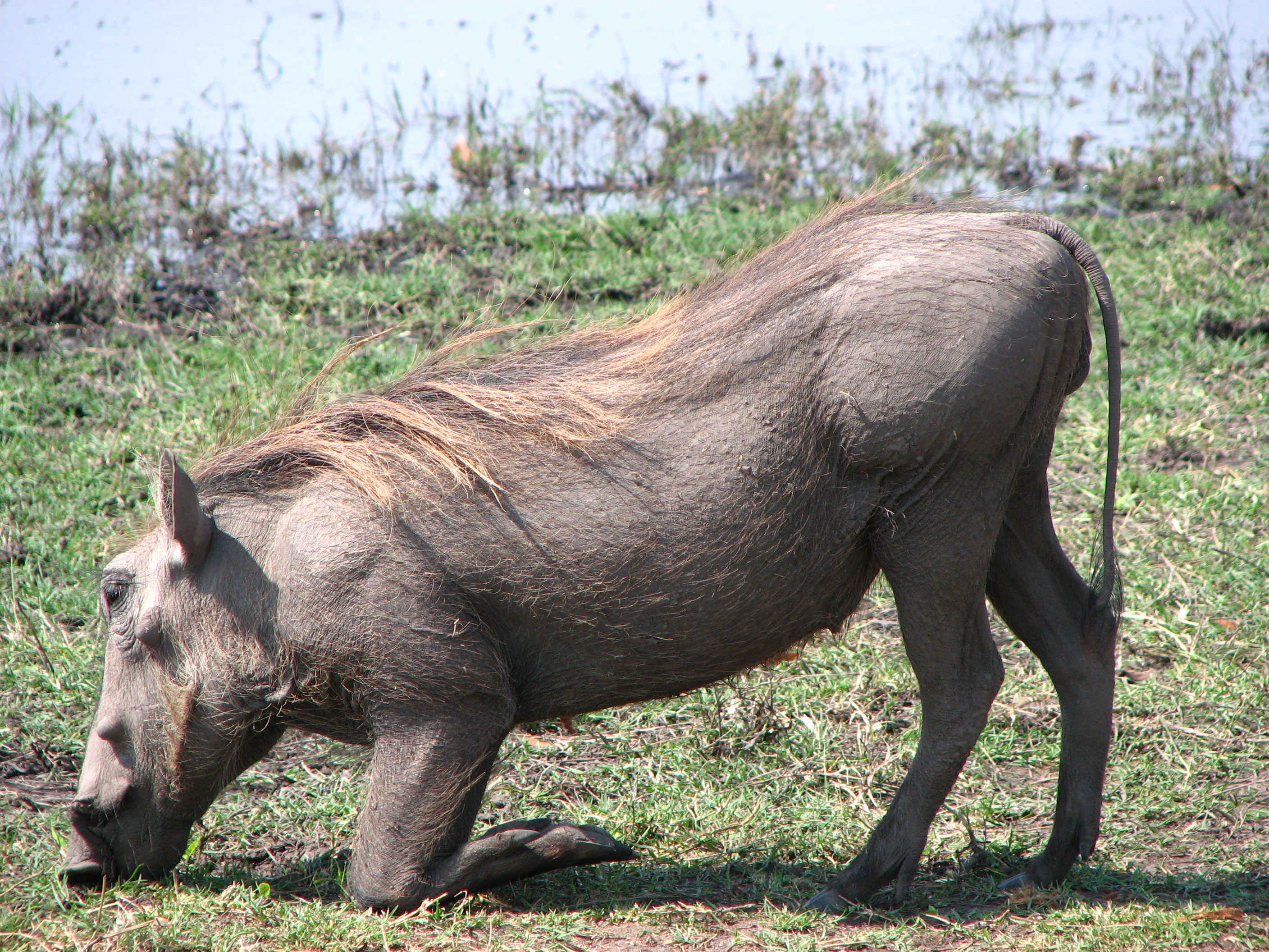 Our sightings started with some impalas crossing the road right in front of us. Then we saw a giraffe. Then we saw a group of warthogs and elephants, with the warthogs grazing and the elephants getting a drink. The warthogs actually have to get down on their "knees" to eat the low grass. Other highlights from the drive from the airport to the camp included: