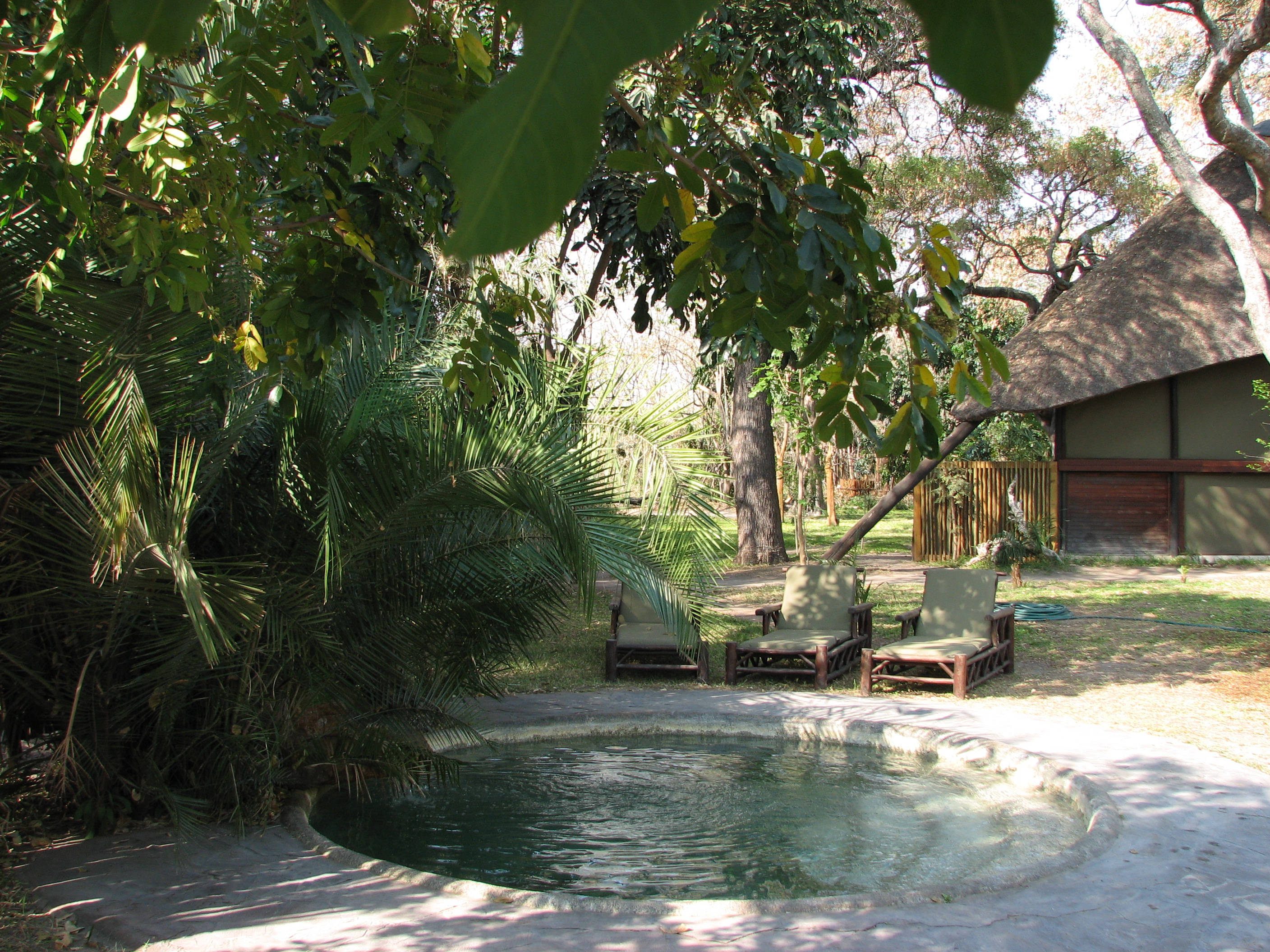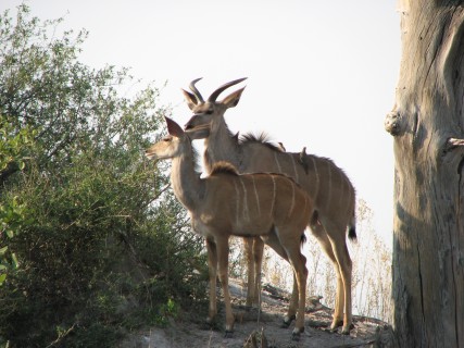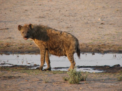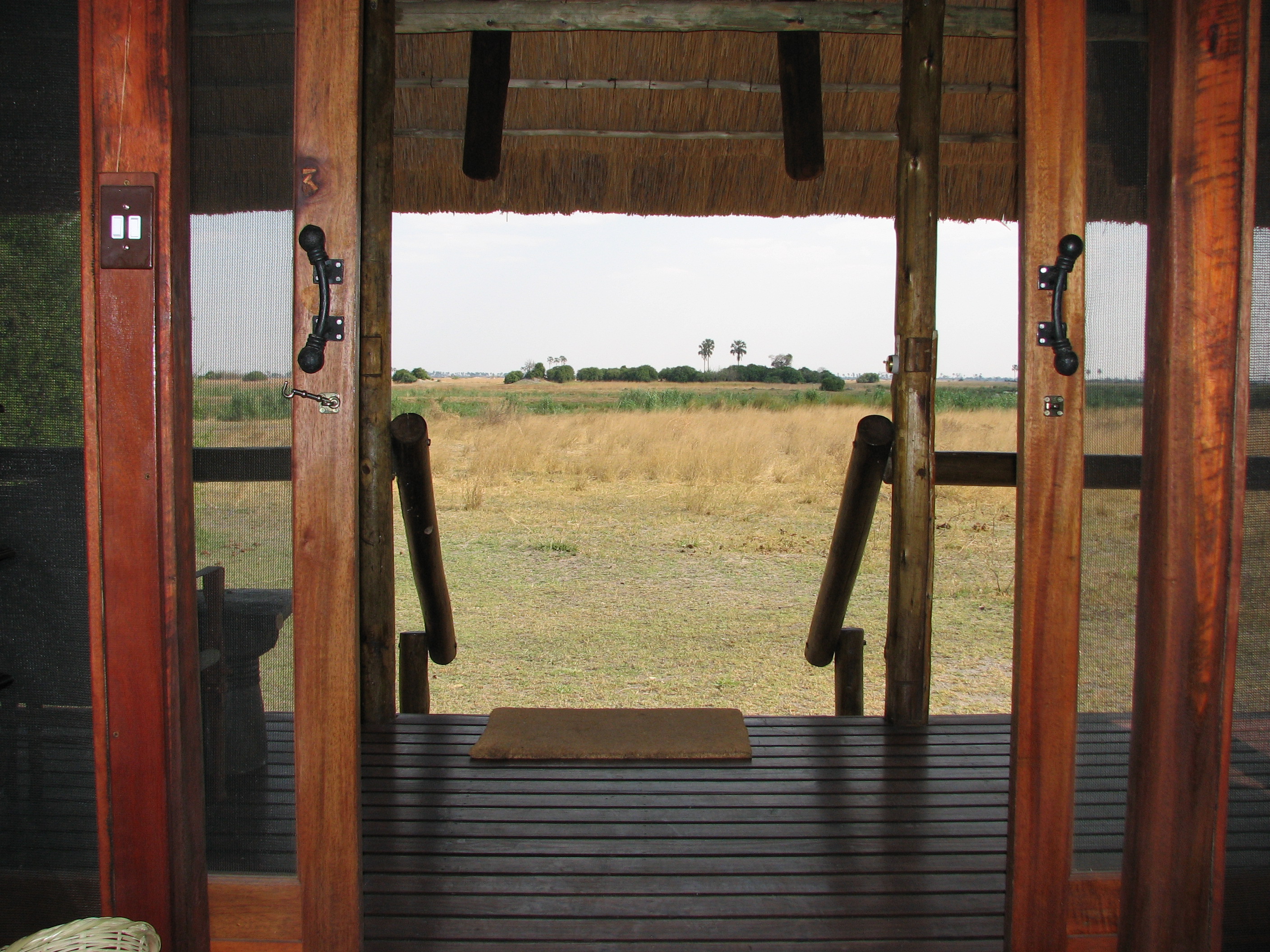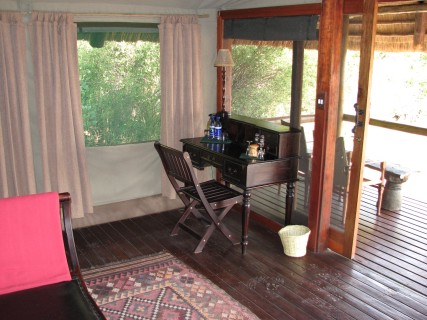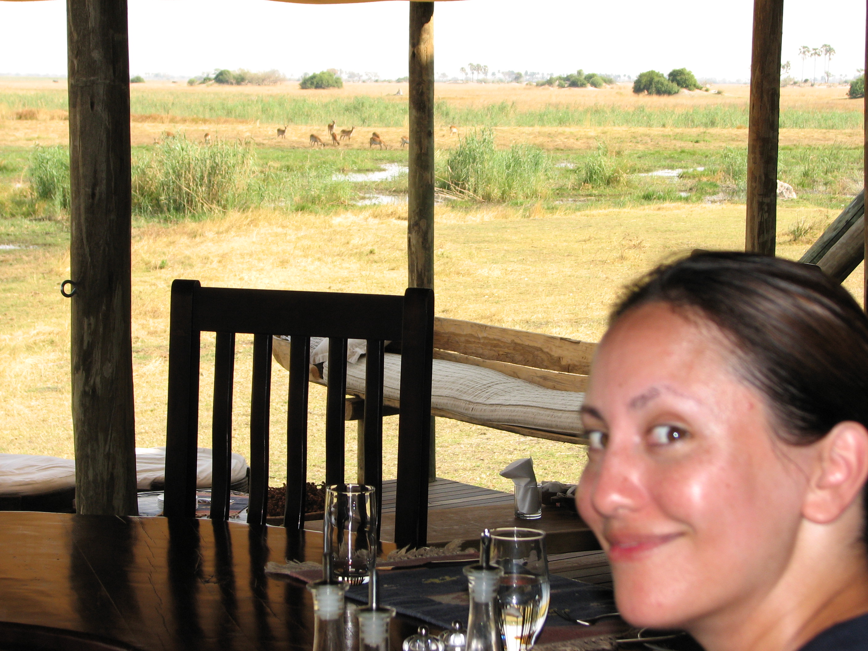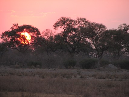 Back at the camp, we got cleaned up, and then went to the main area for dinner. We had drinks while we got to know some of the people. Mike and Larry from San Diego, for example, had just come from Xigera and Chitabe, the next two camps we were going to, and had started at Victoria Falls, where we are going after leaving Botswana, in fact, almost our whole trip is the reverse of theirs. Dinner was at a large table right near the Selinda spillway, and we had to speak over the frogs, the insects, and the roaring hippos. After dinner, we sat around the campfire for a bit, then went back to finally end the day. Even if we had to go back after today, our safari experience would be a success.