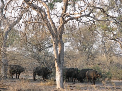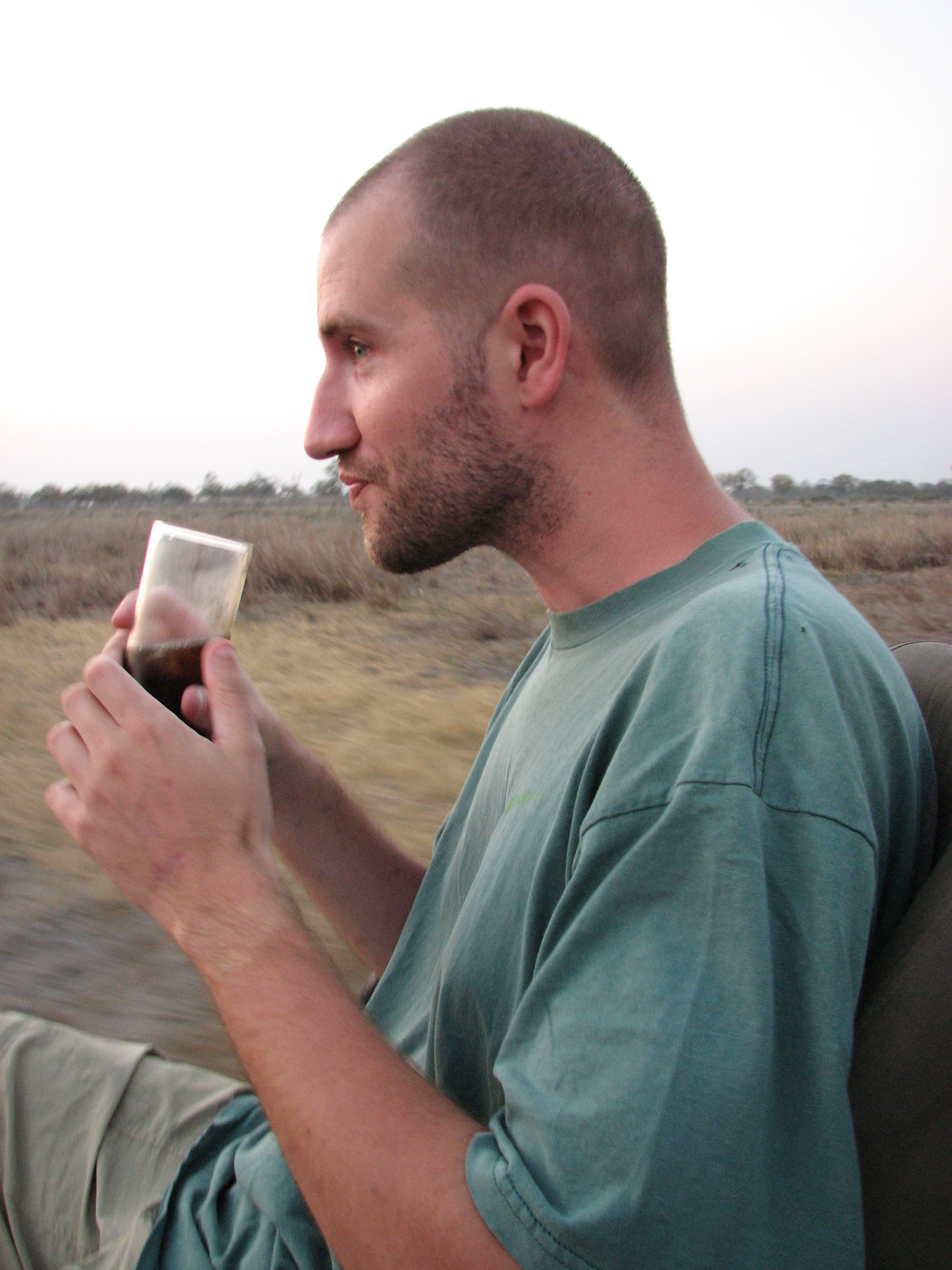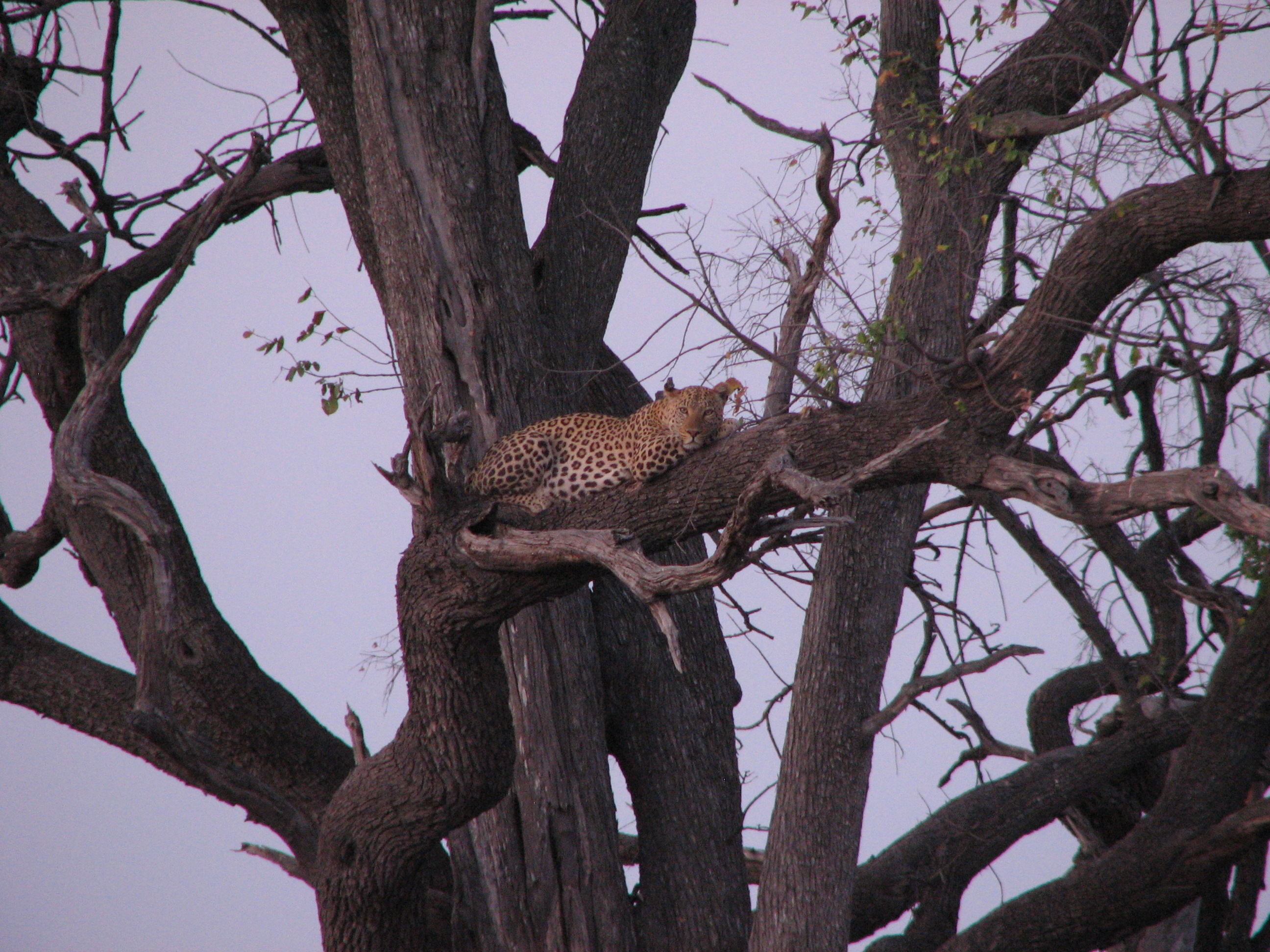 BB told us that the dagha boys are prone to "misbehave" all the time, charging things for no good reason, but they left us alone. While driving around, Justin spotted a wildebeest from far away, to the surprise of BB. This definitely was beginner's luck. The wildebeest didn't appear to want us anywhere near it, even when we were very far away. We stopped to have our "sundowner", which is the traditional drink around sunset to stretch the legs and enjoy the day. BB was in the middle of pouring our drinks when he heard someone had spotted a leopard in a tree. Earlier in the drive BB had mentioned he saw about one leopard a month, so this was a big deal. BB stopped pouring the sundowners mid-drink, and we were on our way. Justin's was already poured, so he had to balance his drink and his camera while BB sped over to the site. We saw the leopard, but it was skittish, so we had to park far away. It then walked off, and climbed into a tree. We circled around to where it went, parked even farther away than before, and tried to get a decent photo. It was now after sunset, and so all of the shots were coming out blurry. Justin ended up resting the camera on the edge of the trunk and basically wedging it in place so that it wouldn't shake, and managed to get one decent shot. It was rapidly getting dark, and we could barely see the leopard any more, so we took off back towards the camp. On the way back, we saw a large group of elephants right near the road. It had really cooled down since the sun had gone down, and we wished we had brought our jackets on the drive.